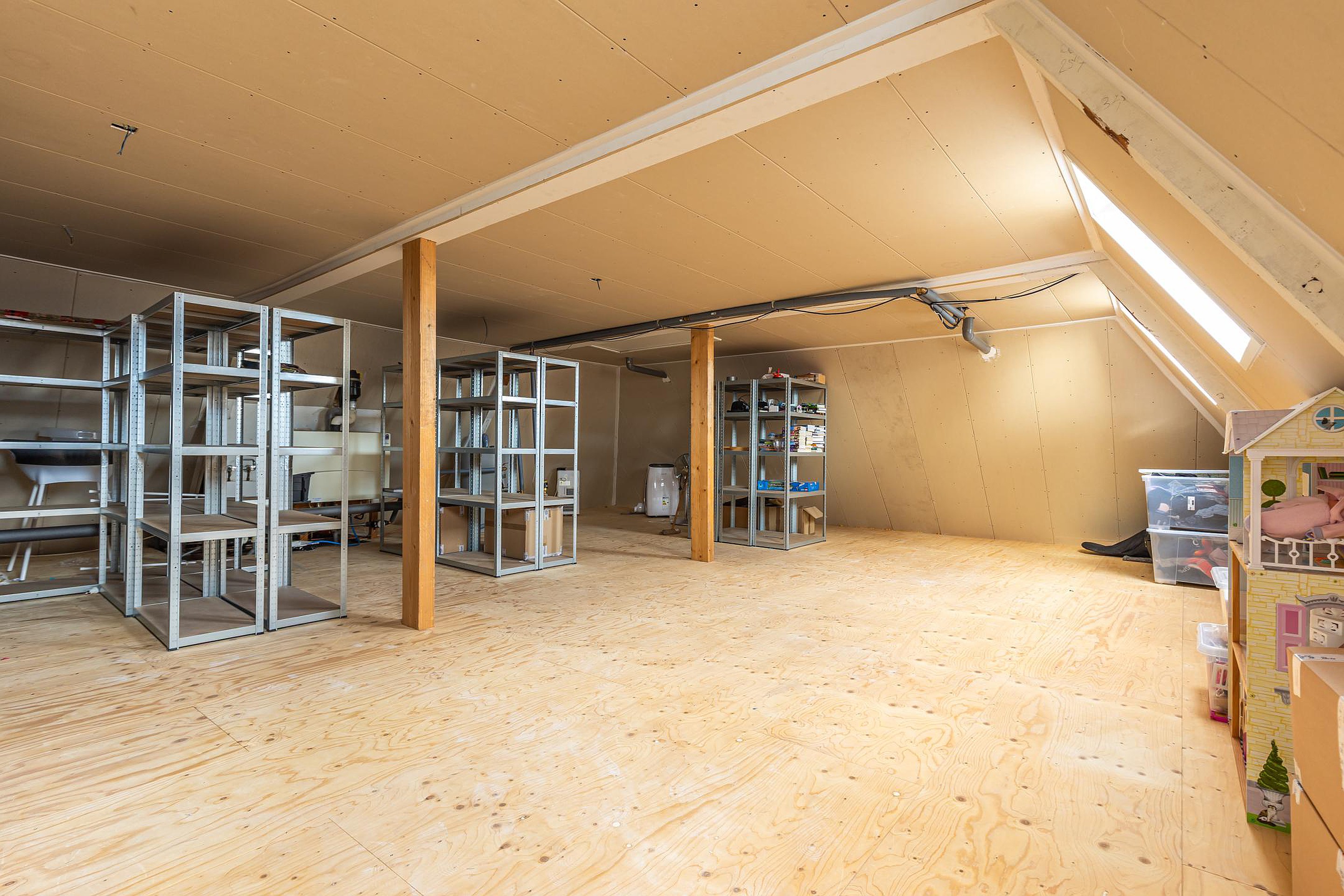 De vaste trap leidt naar de indrukwekkende zolderverdieping. De prachtige houten balkconstructie geeft deze verdieping direct sfeer. De voorzolder biedt volop ruimte voor opbergen, een werkplek of hobbyruimte.