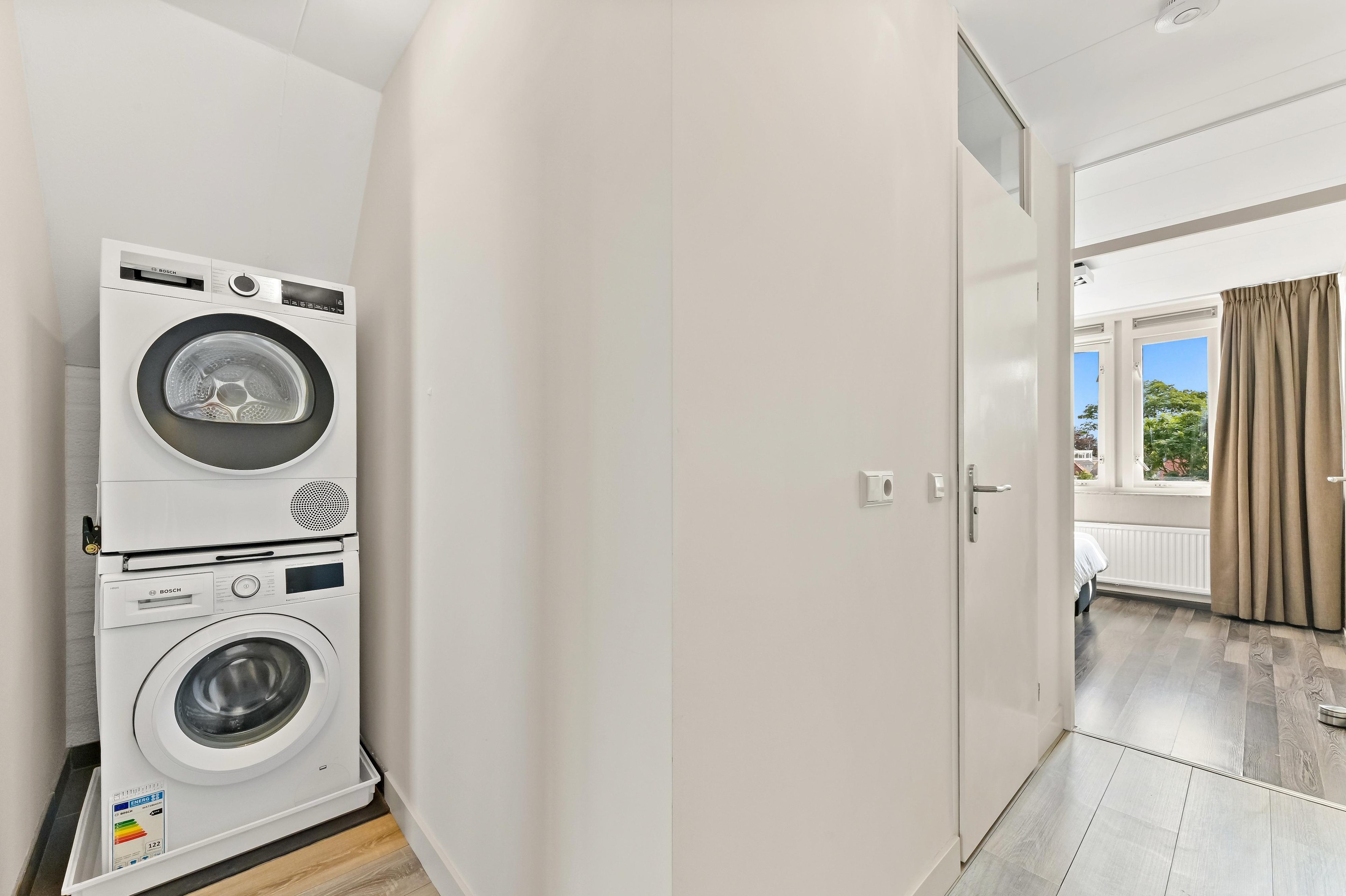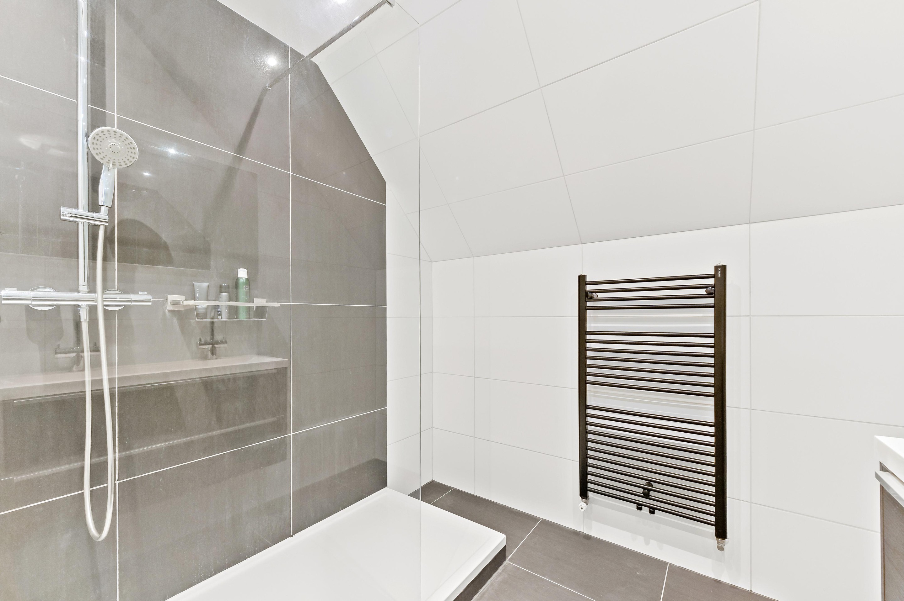 Overloop met opstelplaats voor de wasmachine/droger en vaste kast met opstelplaats voor de CV combiketel (Remeha, 2020). Aan de achterzijde zijn twee slaapkamers gesitueerd welke zijn voorzien van een nette laminaatvloer. Deze kamers zijn perfect te gebruiken als bijvoorbeeld kinderkamer, logeerkamer of als thuiskantoor. De geheel betegelde badkamer in het midden van de woning is voorzien van inbouwspots, een grote inloopdouche, dubbele wastafel en designradiator. Aan de voorzijde is een grote slaapkamer met ingebouwde kastenwand te vinden. Deze kamer wordt nu gebruikt als hoofdslaapkamer.