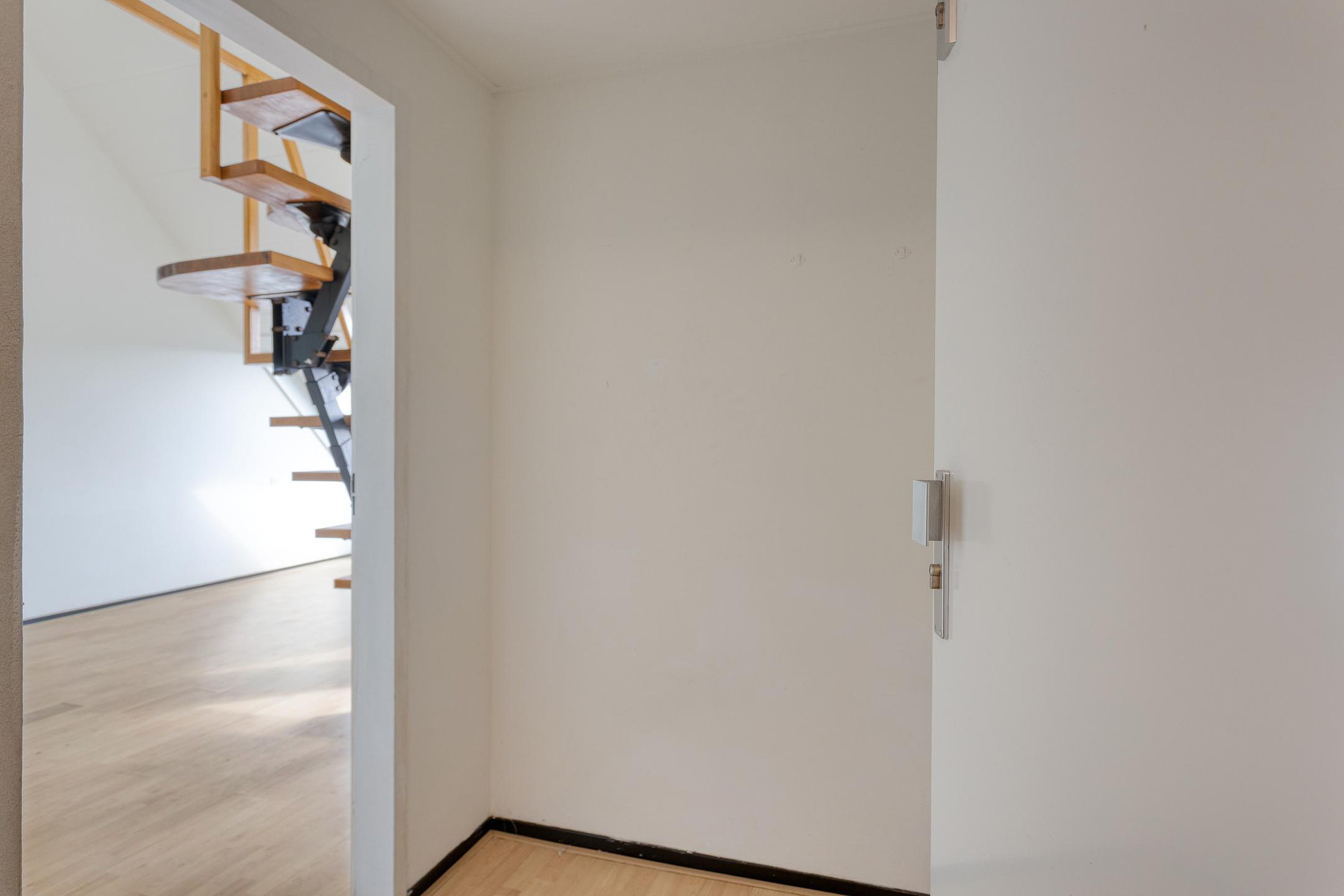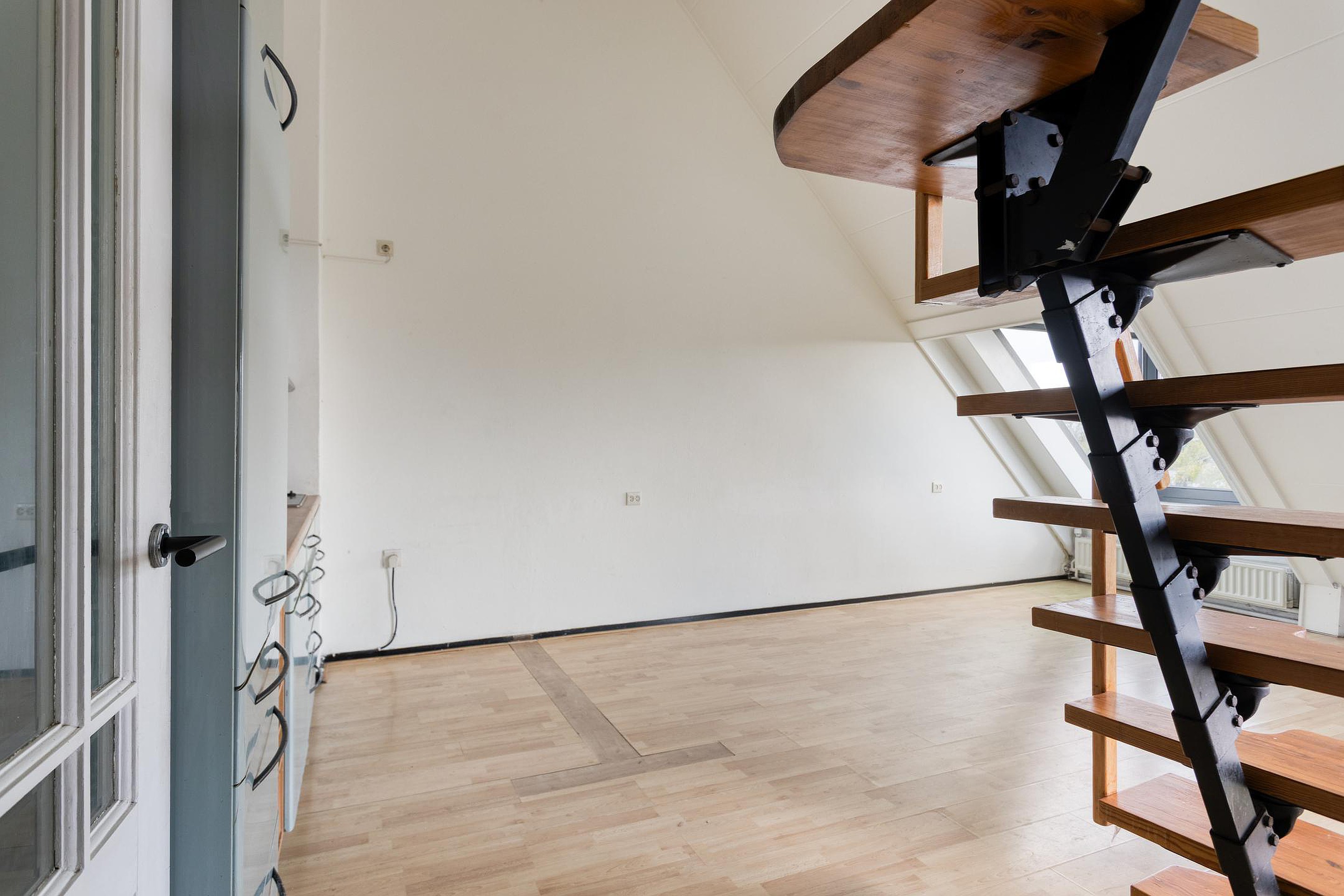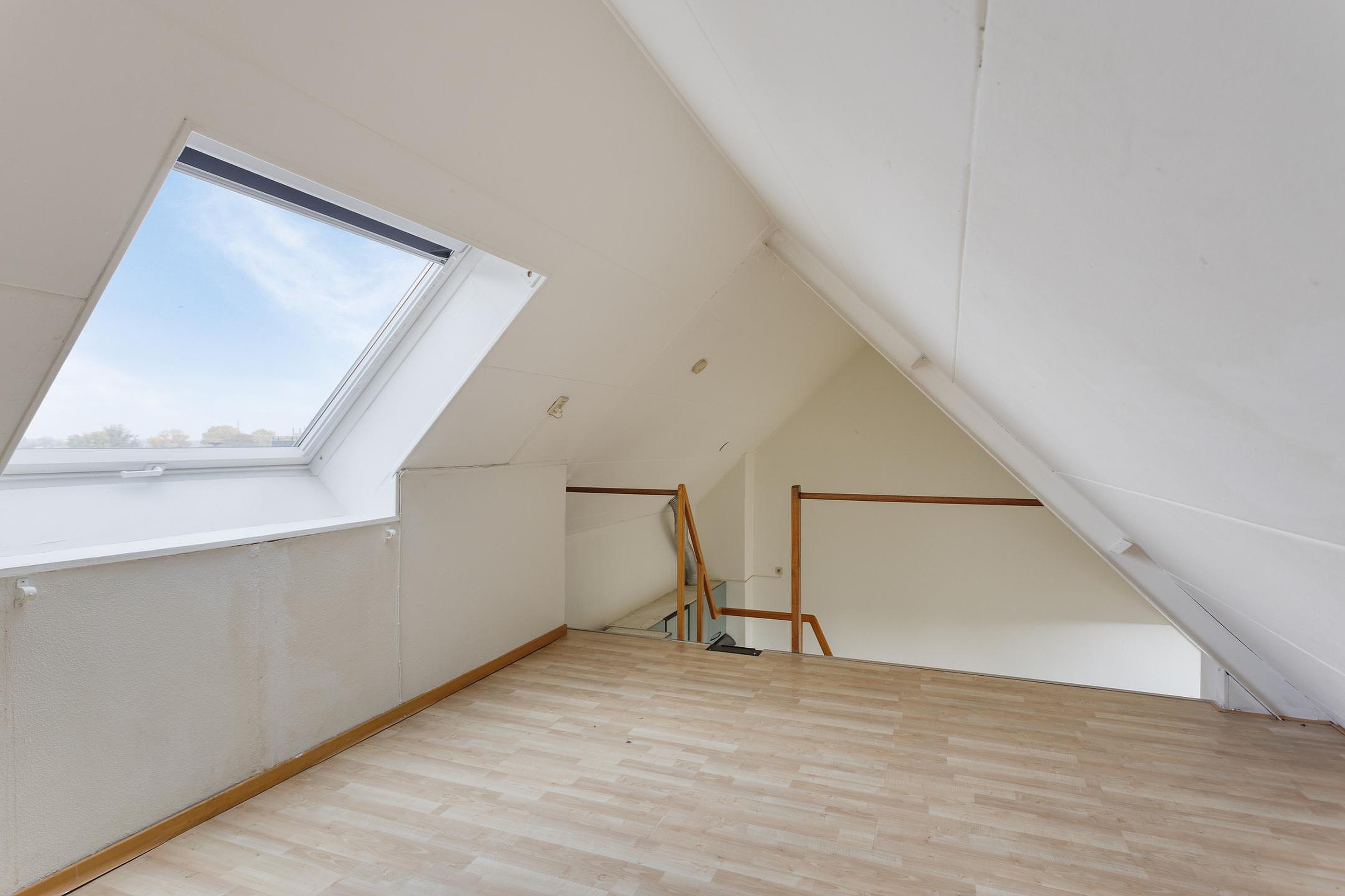 In de woonkamer/keuken bevindt zich een trap naar de entresol/slaapkamer (ca. 6,5m2), welke voorzien is van een laminaatvloer en een Velux dakraam met isolerende beglazing en een screen voor verduistering.