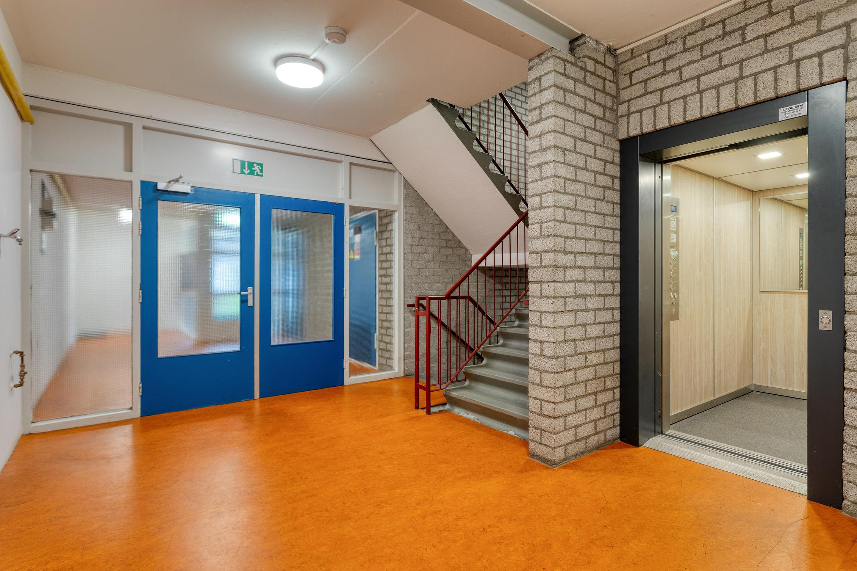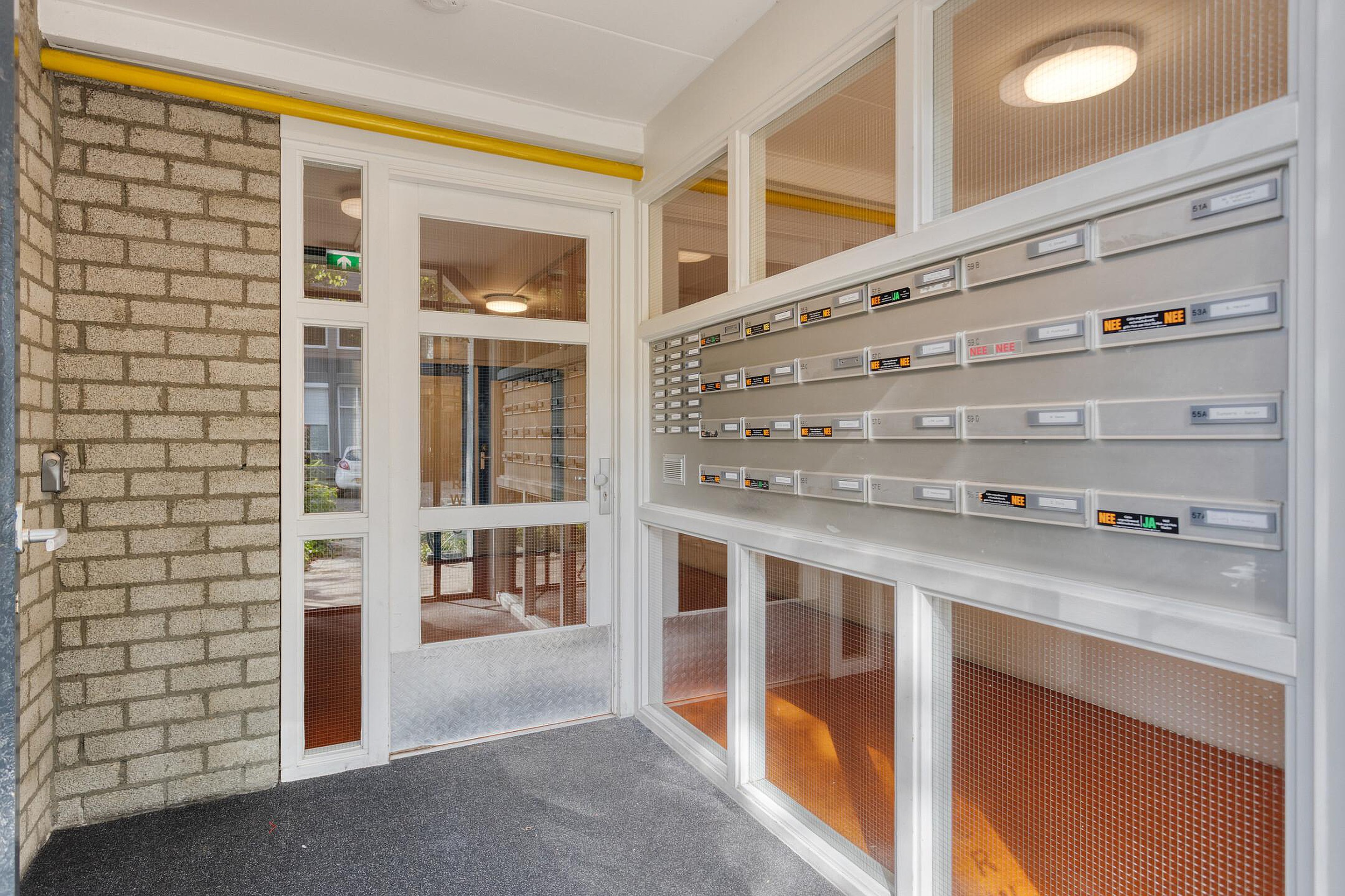 Representatieve ontvangsthal met brievenbussen unit, bellentableau met video-intercom en toegang tot de lift en het trappenhuis.
