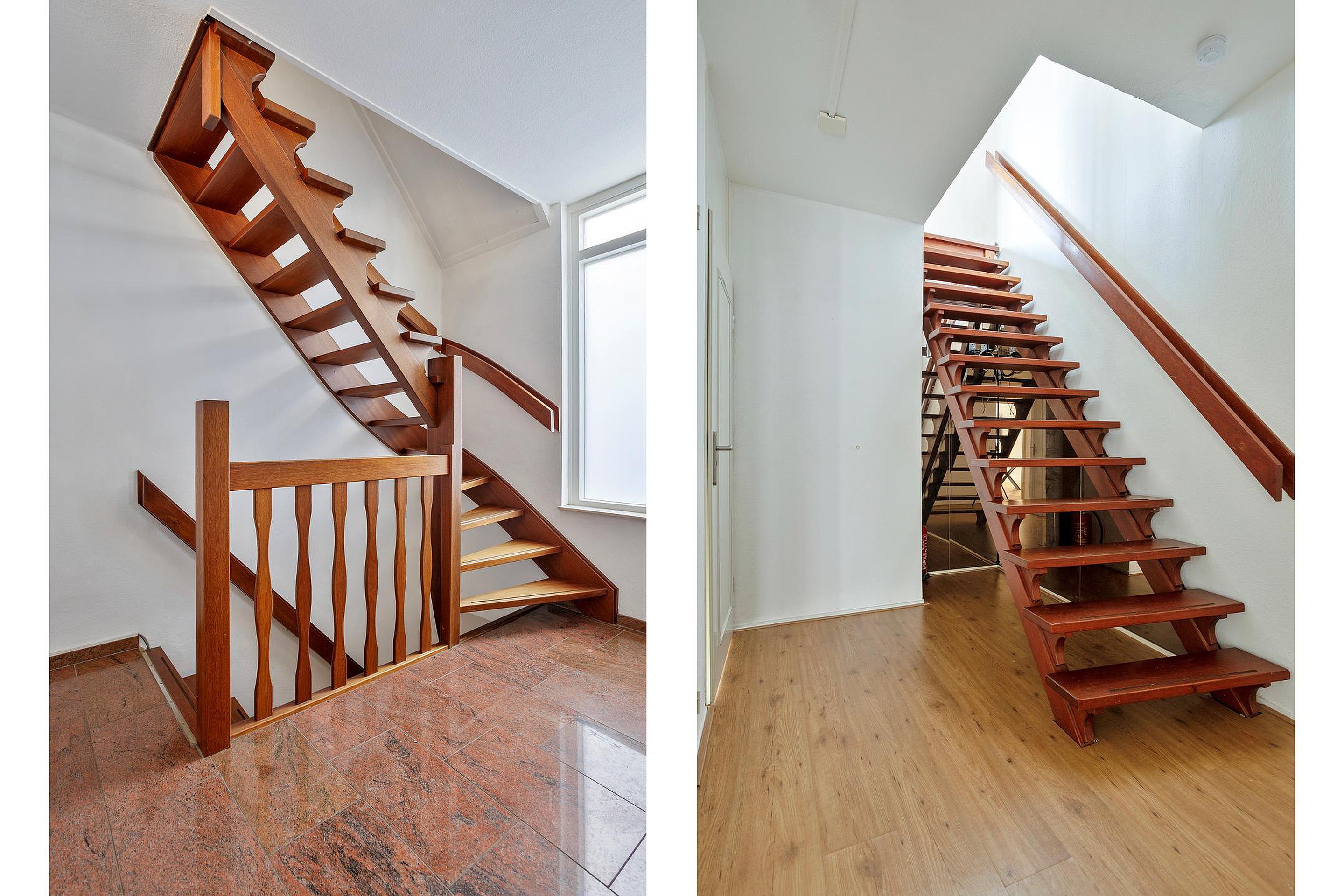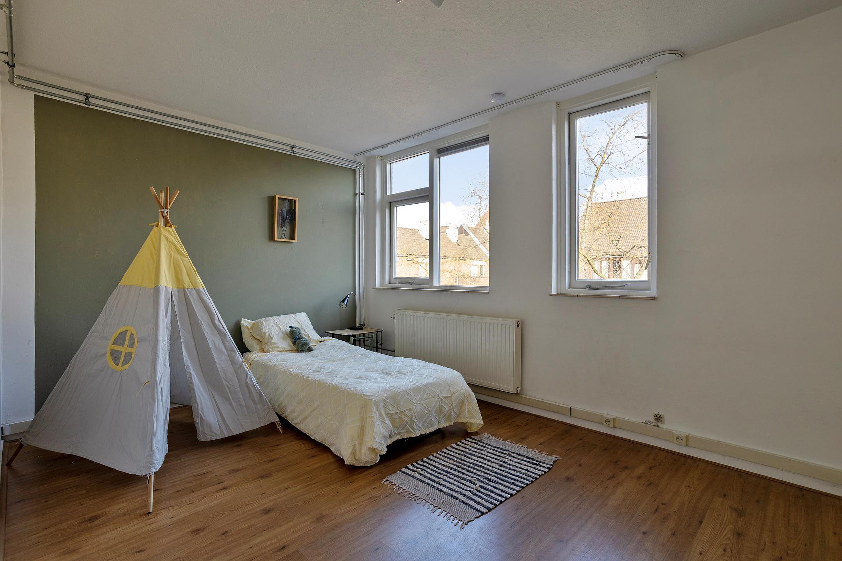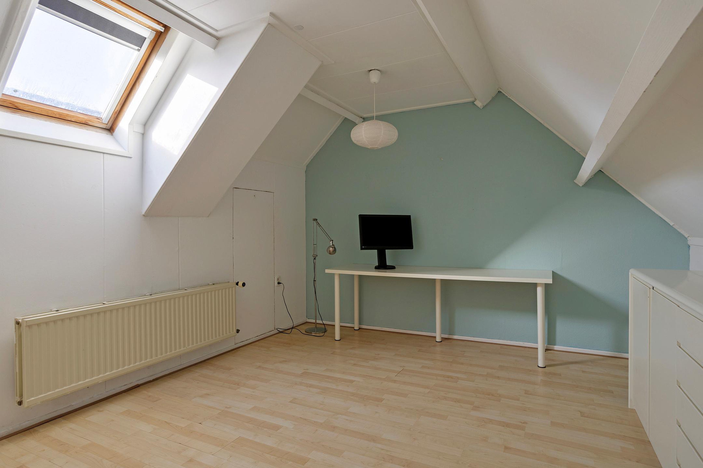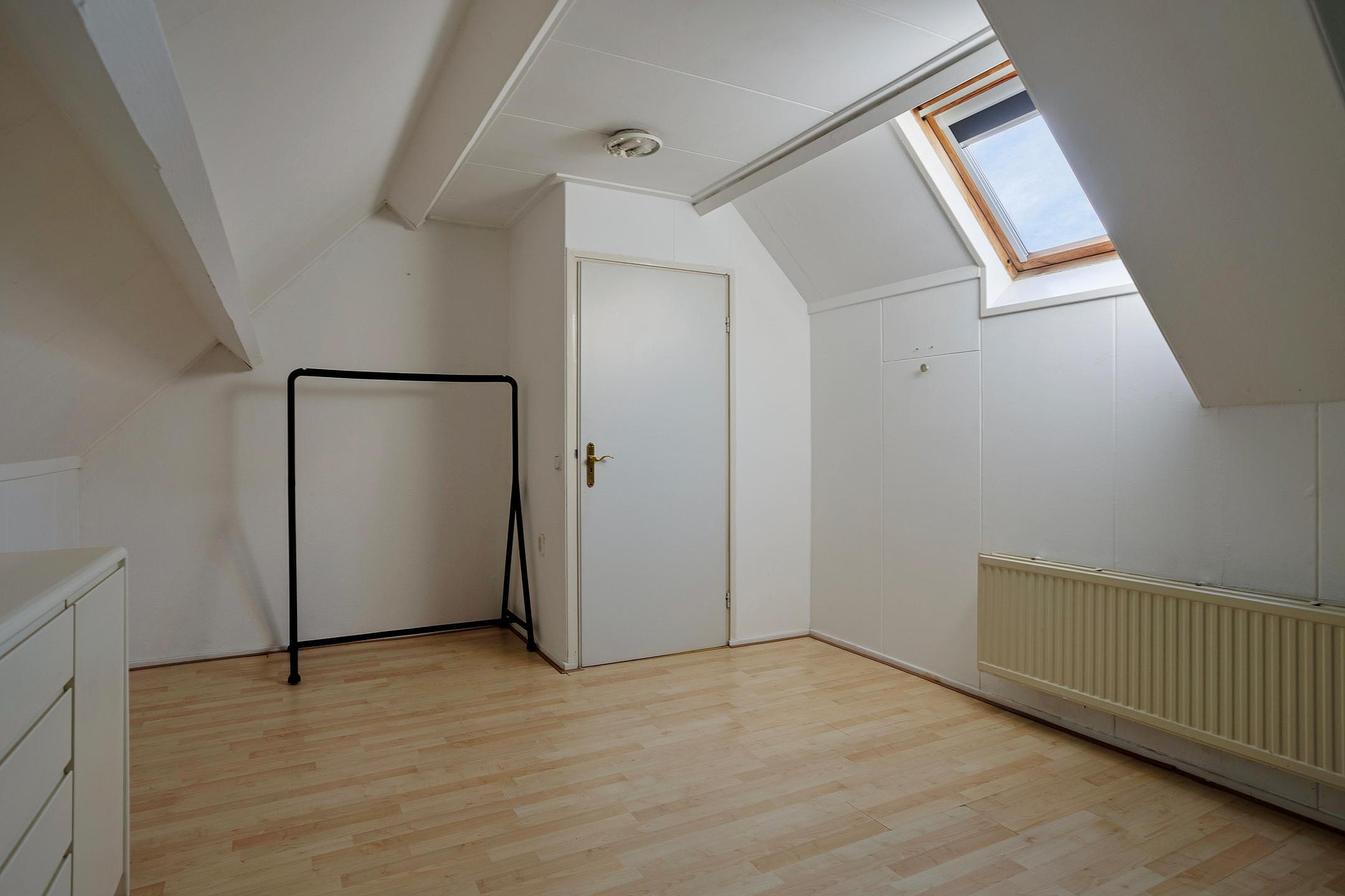 Via een vaste trap vanuit de entree/hal is de vierde verdieping bereikbaar. Op deze verdieping bevindt zich de derde slaapkamer (16 m2). Deze kamer is voorzien van een Velux dakraam, wat zorgt voor een prettige lichtinval, en is afgewerkt met een laminaatvloer. De ruimte leent zich uitstekend als extra slaapkamer, werkruimte of hobbykamer en maakt het appartement bijzonder geschikt voor uiteenlopende woonwensen.