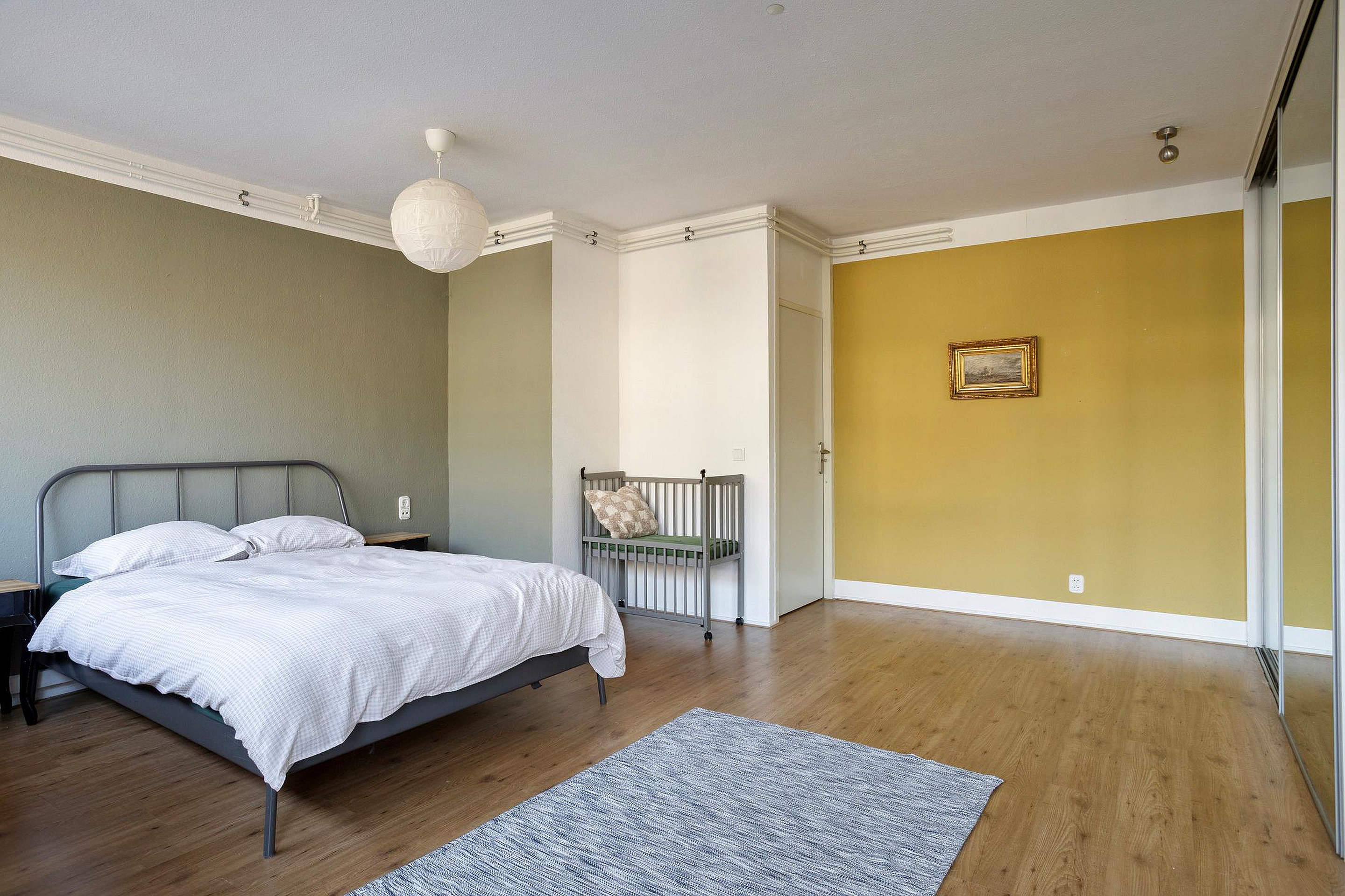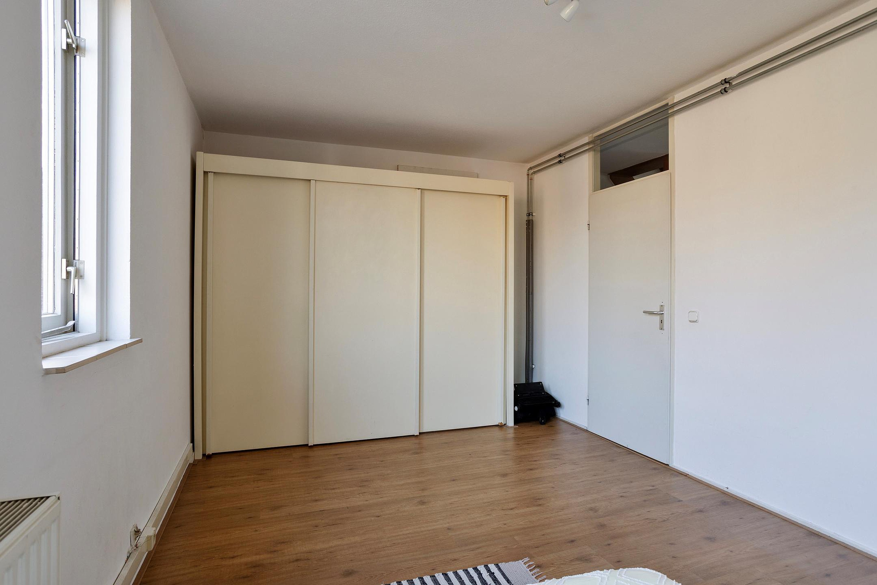 De eerste slaapkamer (16 m2) is gelegen aan de achterzijde van het appartement en kenmerkt zich door een prettige lichtinval dankzij de grote raampartijen. De ruimte is afgewerkt met een mooie laminaatvloer en biedt voldoende plaats voor een tweepersoonsbed en aanvullende kastruimte.