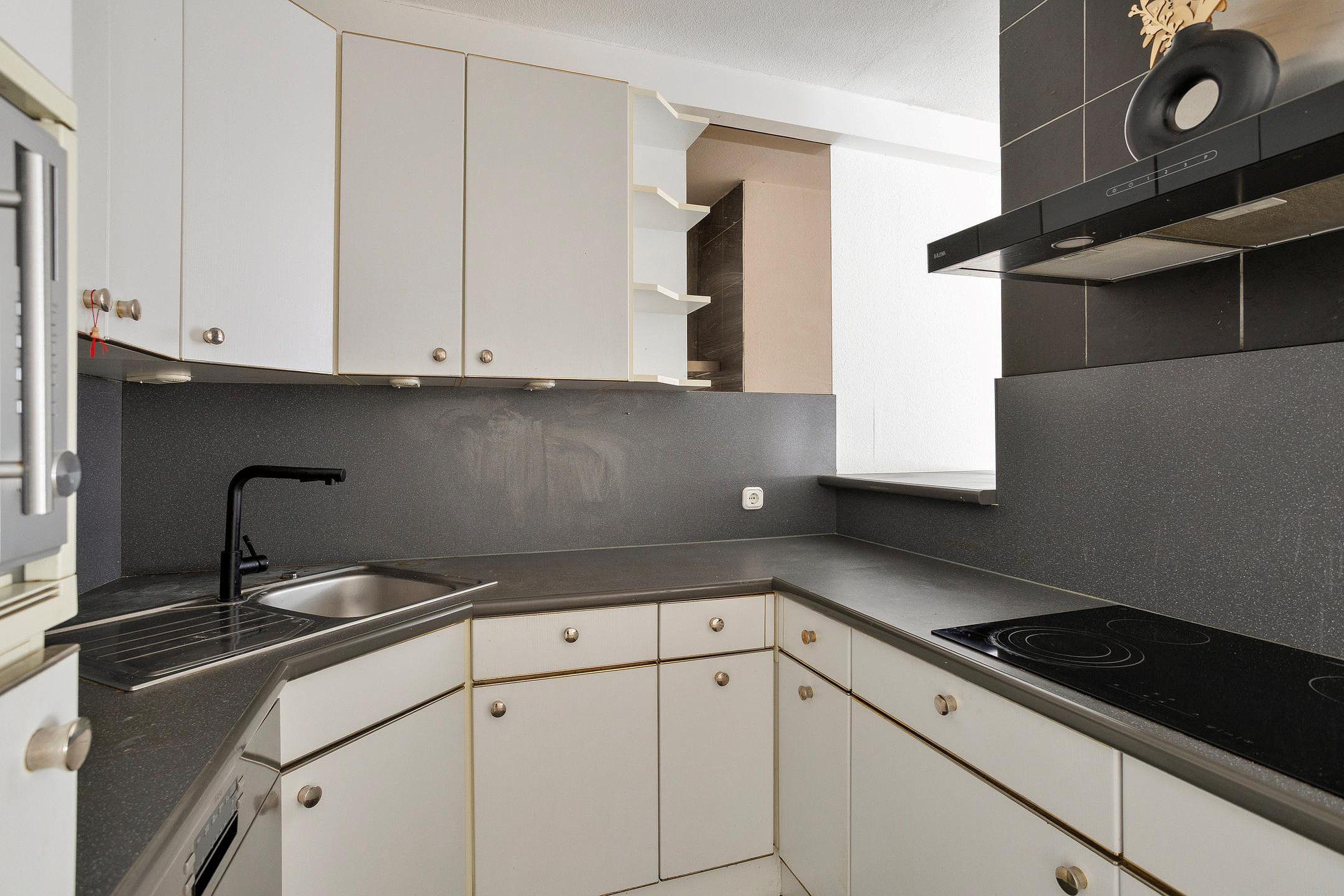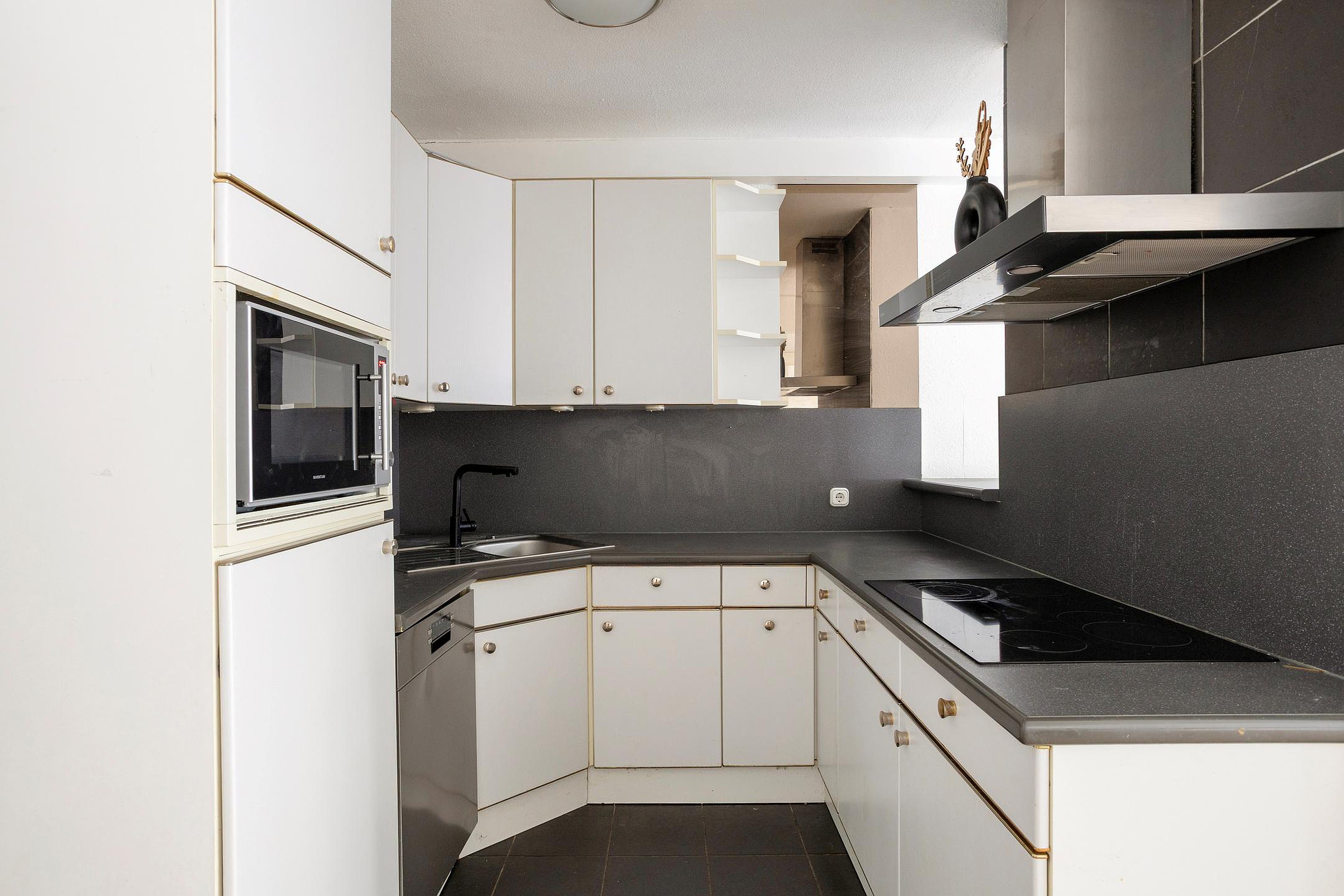 De semi-open keuken is uitgevoerd in een U-opstelling met een kunststof werkblad en beschikt over voldoende bergruimte. De keuken is voorzien van diverse (inbouw)apparatuur, waaronder een 4-pits inductiekookplaat met afzuigkap, koelkast met vriesvak, vaatwasser, combi-oven en een spoelbak.