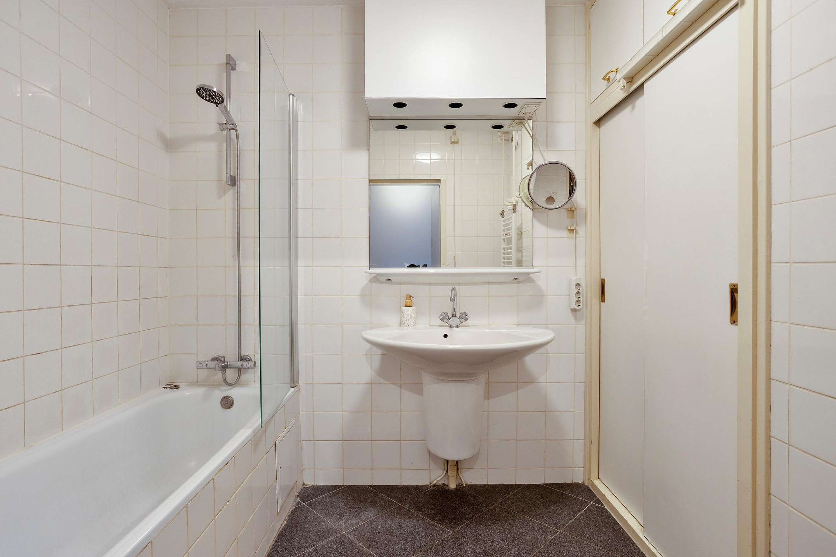 De volledig betegelde badkamer (5 m2) is functioneel ingericht en voorzien van een ligbad, vaste wastafel en een ruime inbouwkast.