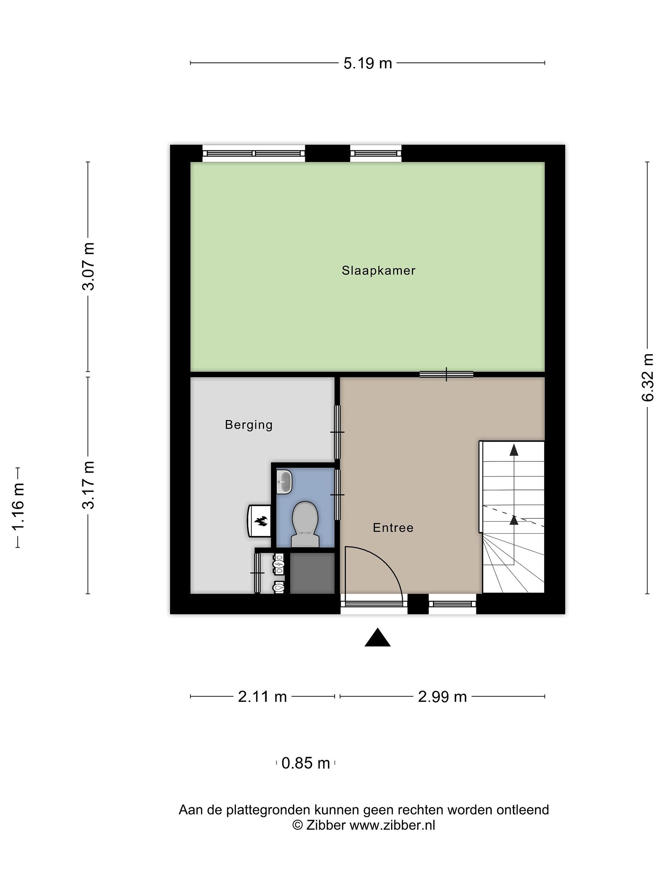 Via de entree/hal (10 m2) betreedt u het appartement. De hal biedt toegang tot een royale slaapkamer, een separaat toilet met fonteintje en een ruime inpandige berging (5 m2). In deze berging bevinden zich de meterkast, de aansluitingen voor de wasmachine en de opstelling van de cv-ketel.