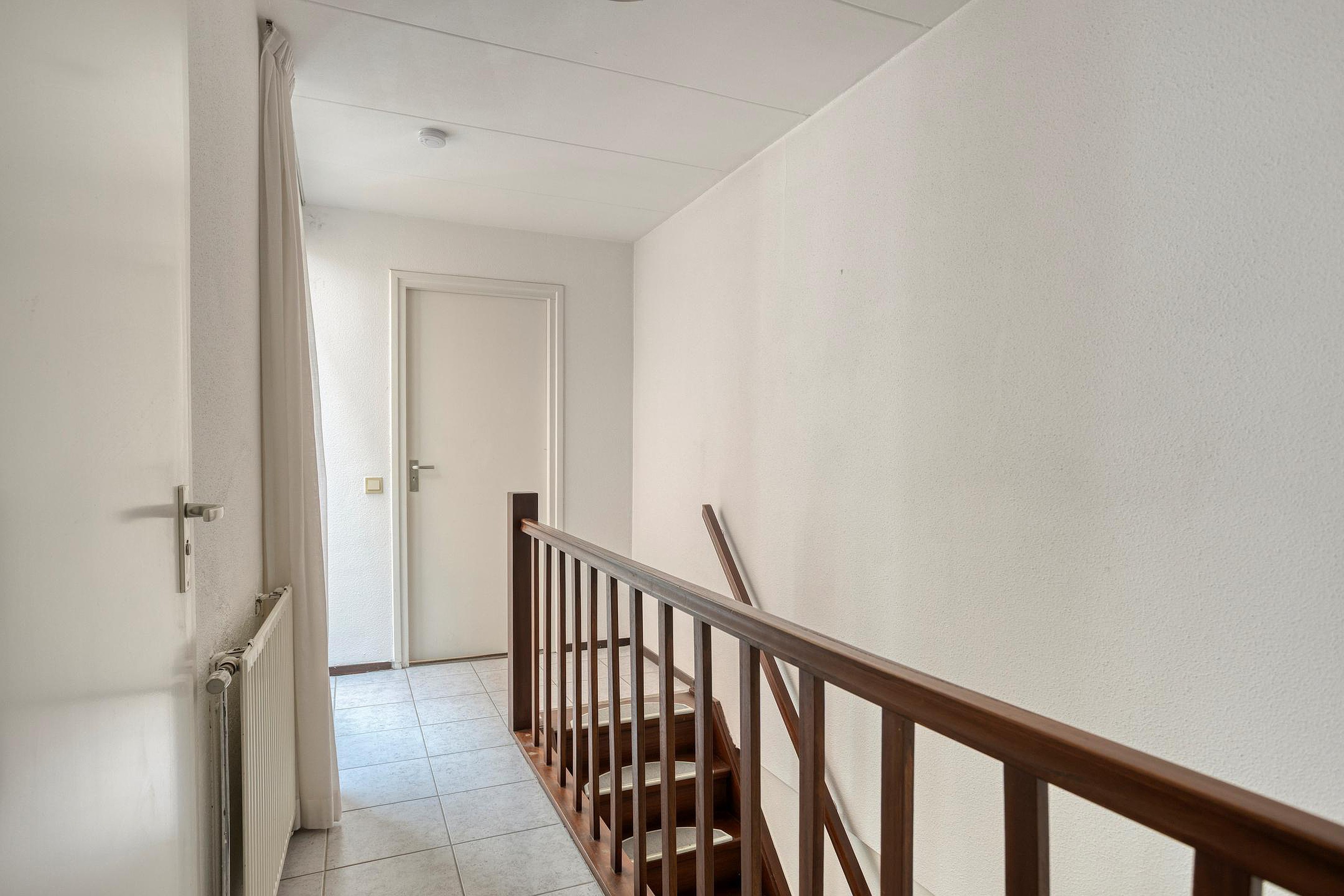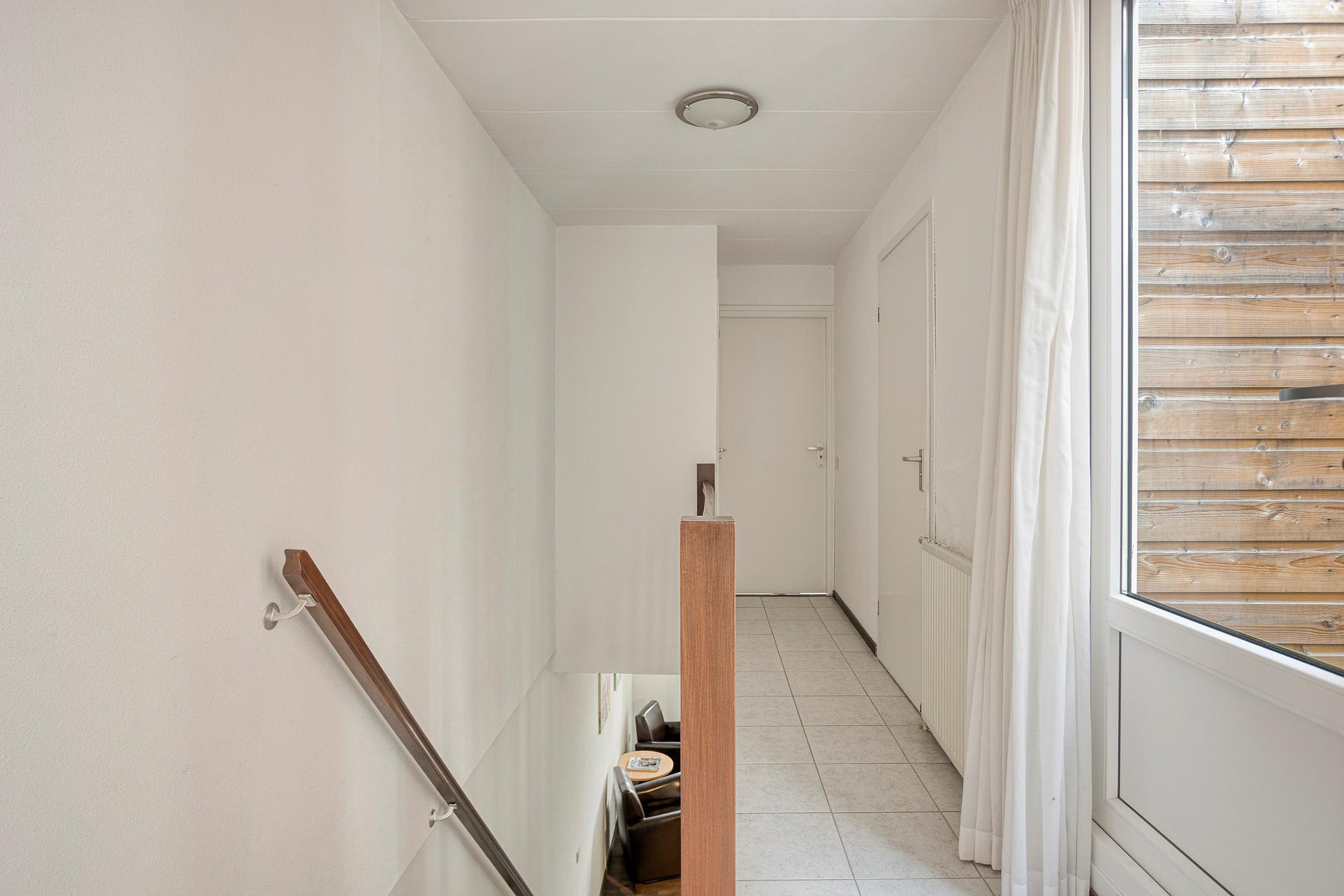 Overloop (8m2) met toegang naar twee slaapkamers, badkamer, kleine patio en een berging met c.v. installatie en mechanische ventilatie.