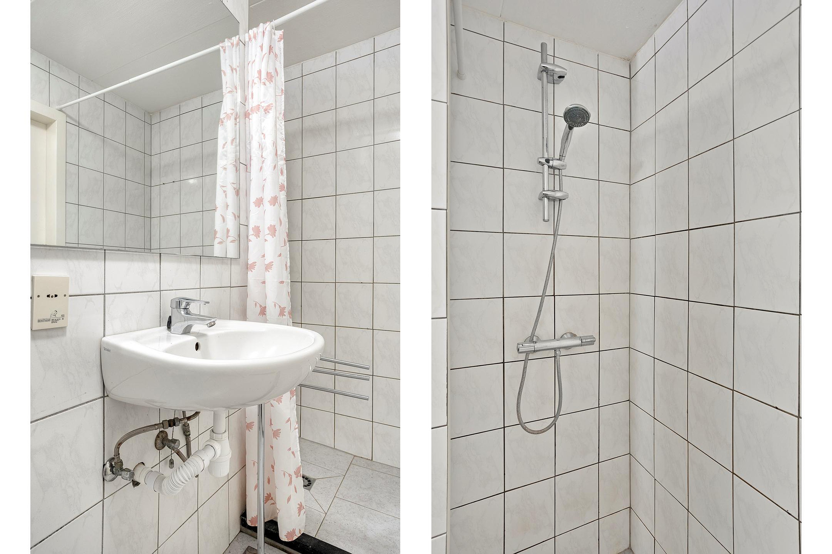 De badkamer (5m2) is eenvoudig maar functioneel, helemaal betegeld en voorzien van een staand toilet, een vaste wastafel, een inloopdouche en de aansluiting voor de wasmachine.