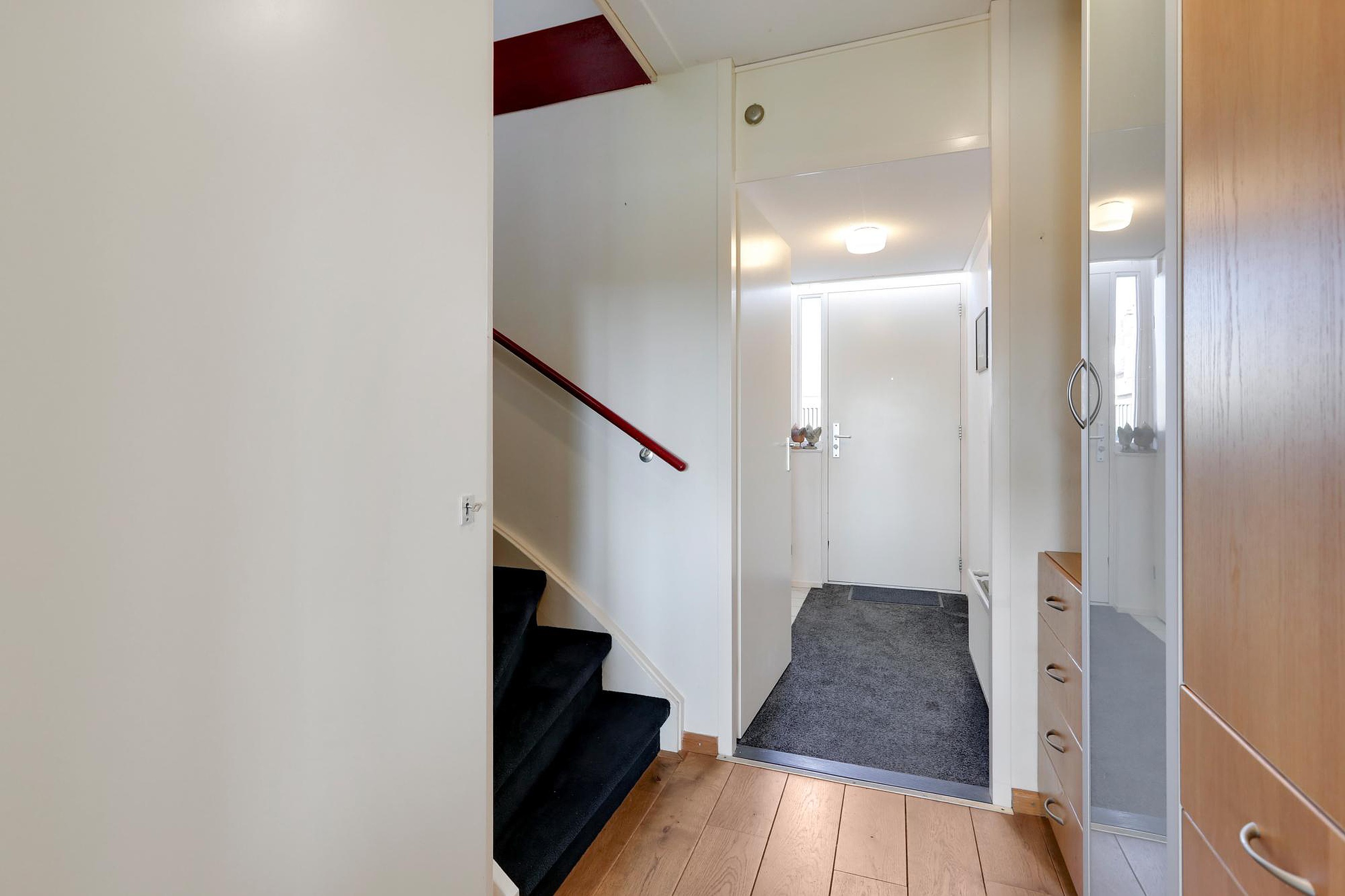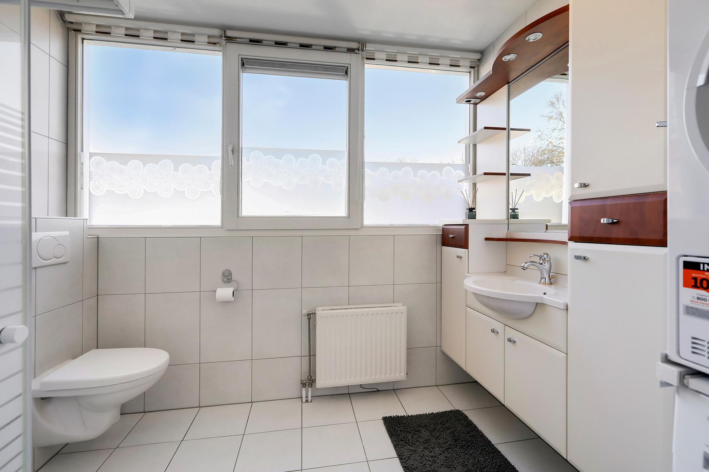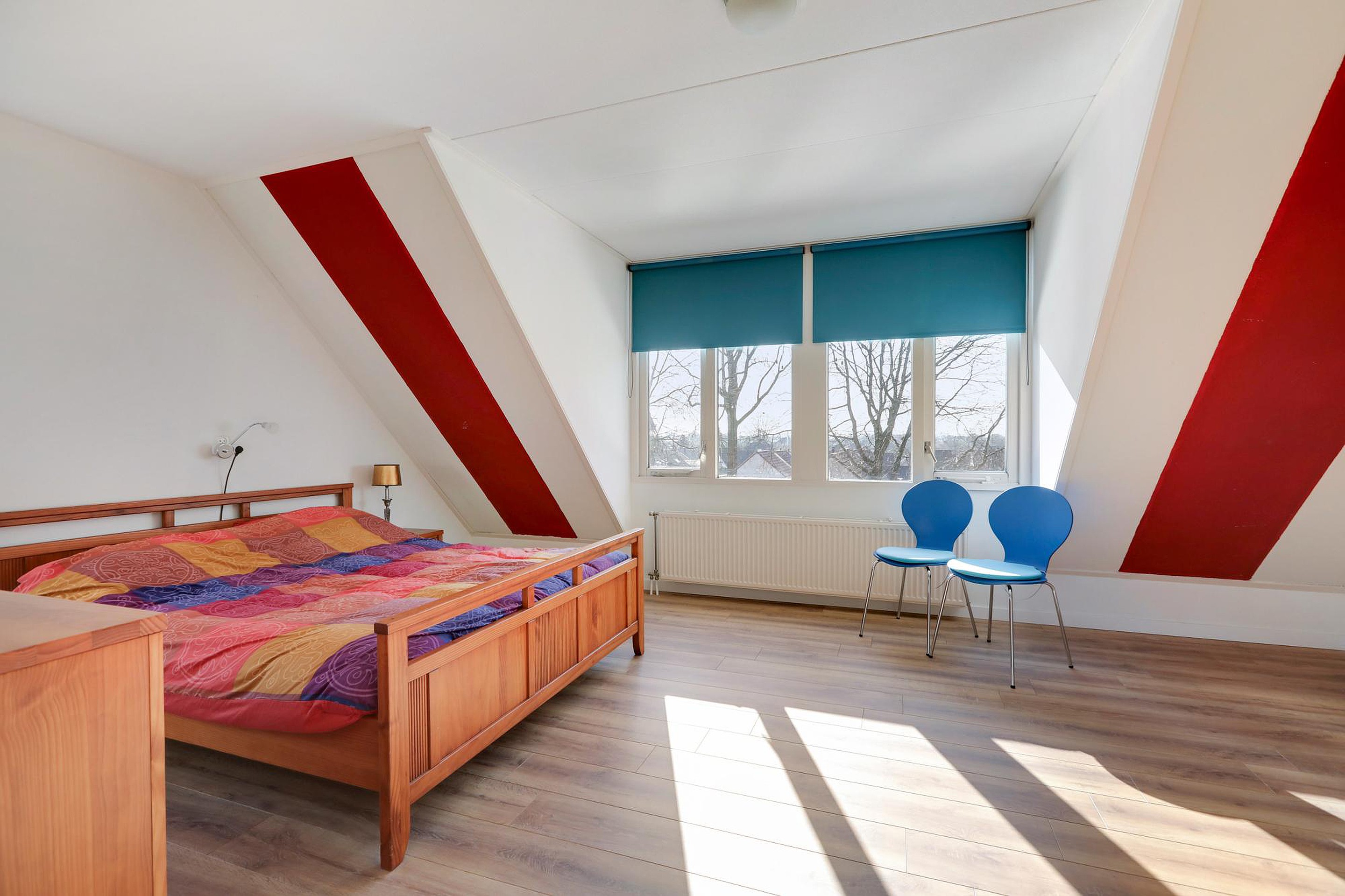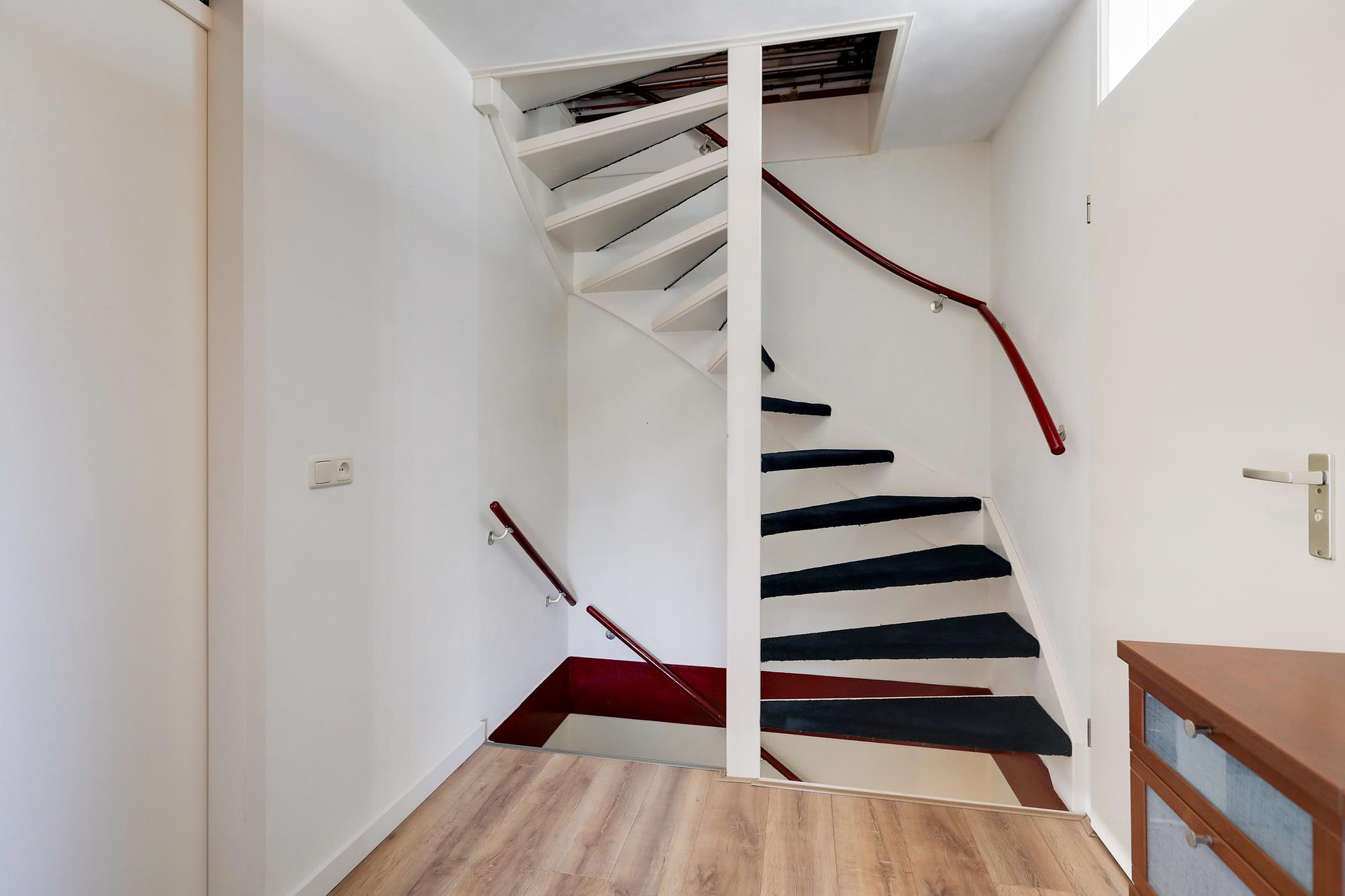 In de kleine tussenhal bevinden zich het toilet en de meterkast terwijl via een vaste trap de eerste verdieping wordt bereikt. De badkamer, voorzien van een dakkapel beschikt over een douchecabine, wastafelmeubel, toilet en aansluitingen voor witgoed. De maisonnette heeft twee slaapkamers, de grote hoofdslaapkamer aan de achterzijde, van 19 m2, met een dakkapel, radiator en laminaatvloer biedt voldoende ruimte. De tweede slaapkamer aan de voorzijde is 10 m2 eveneens met laminaatvloer en radiator.