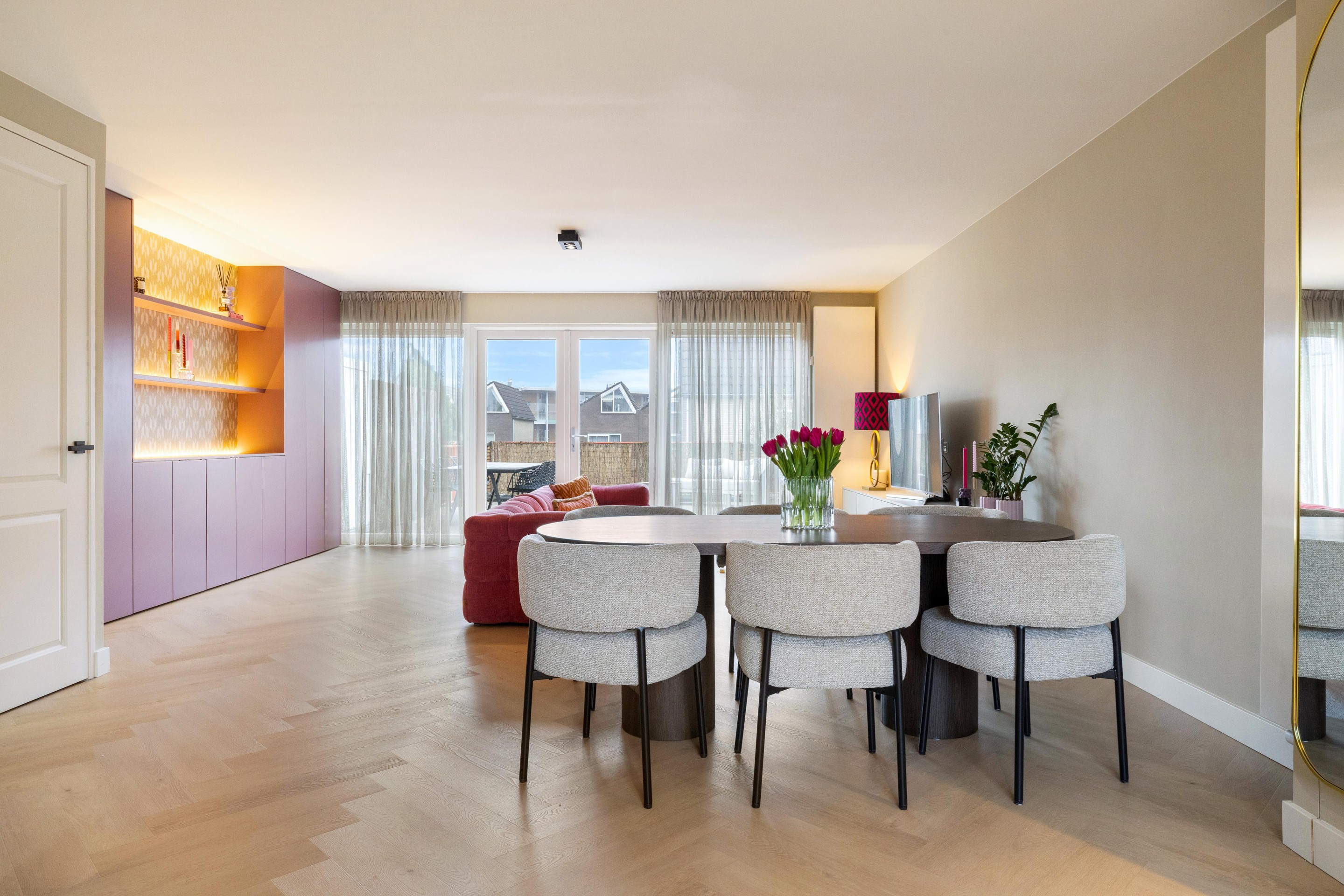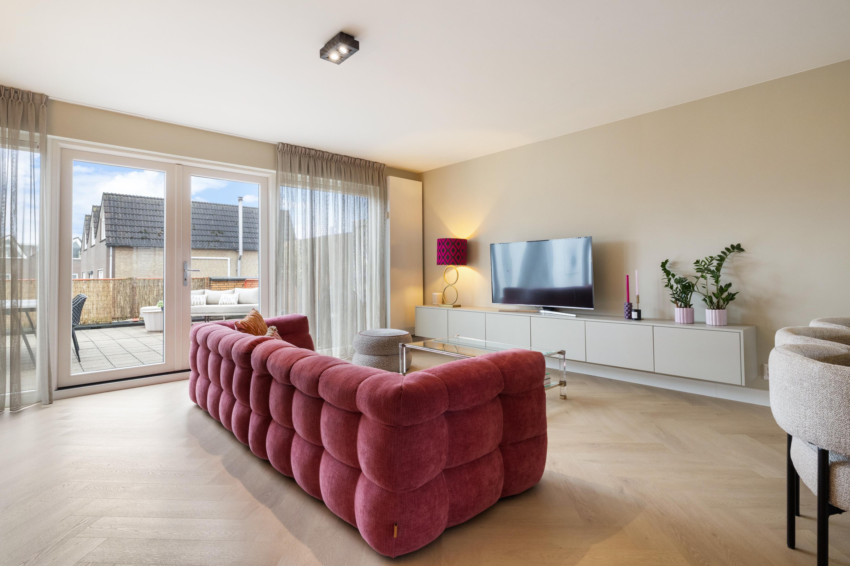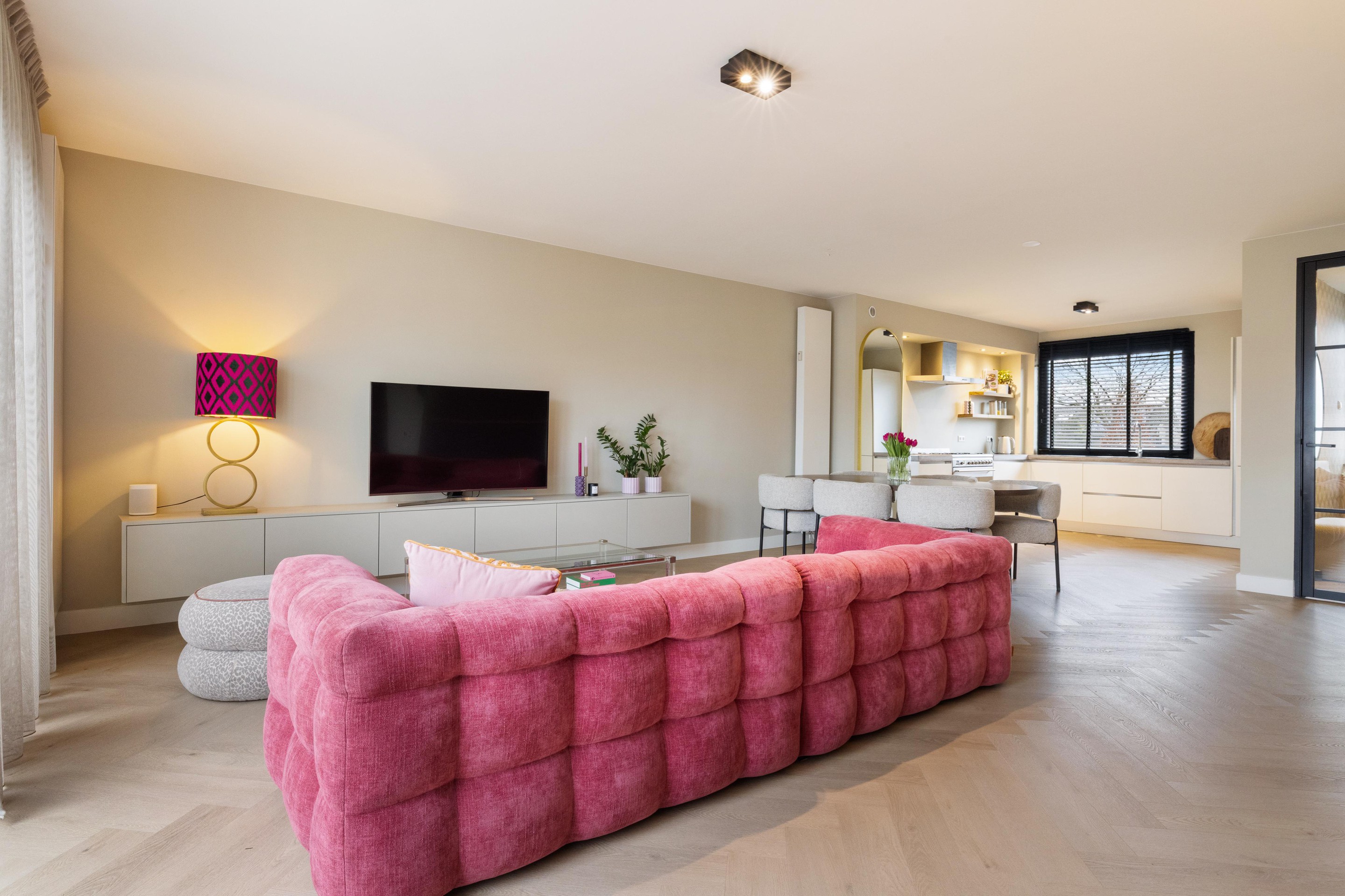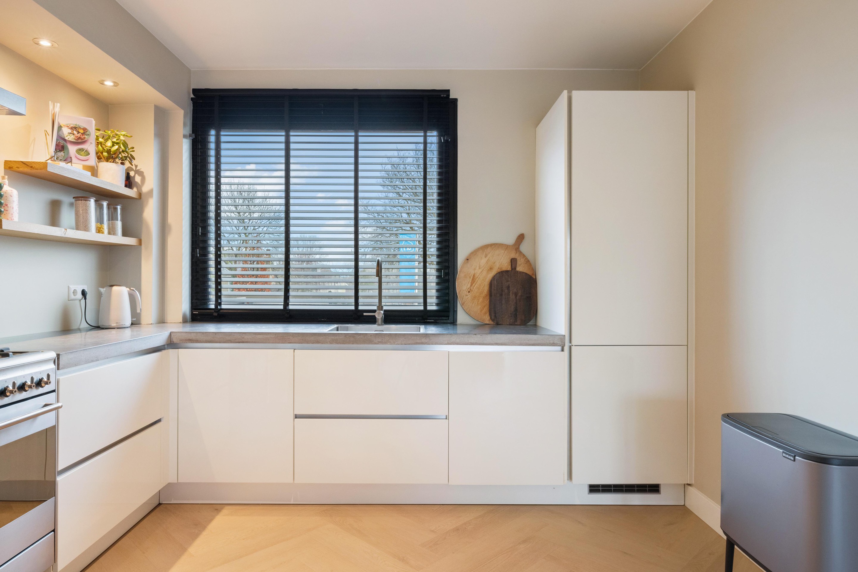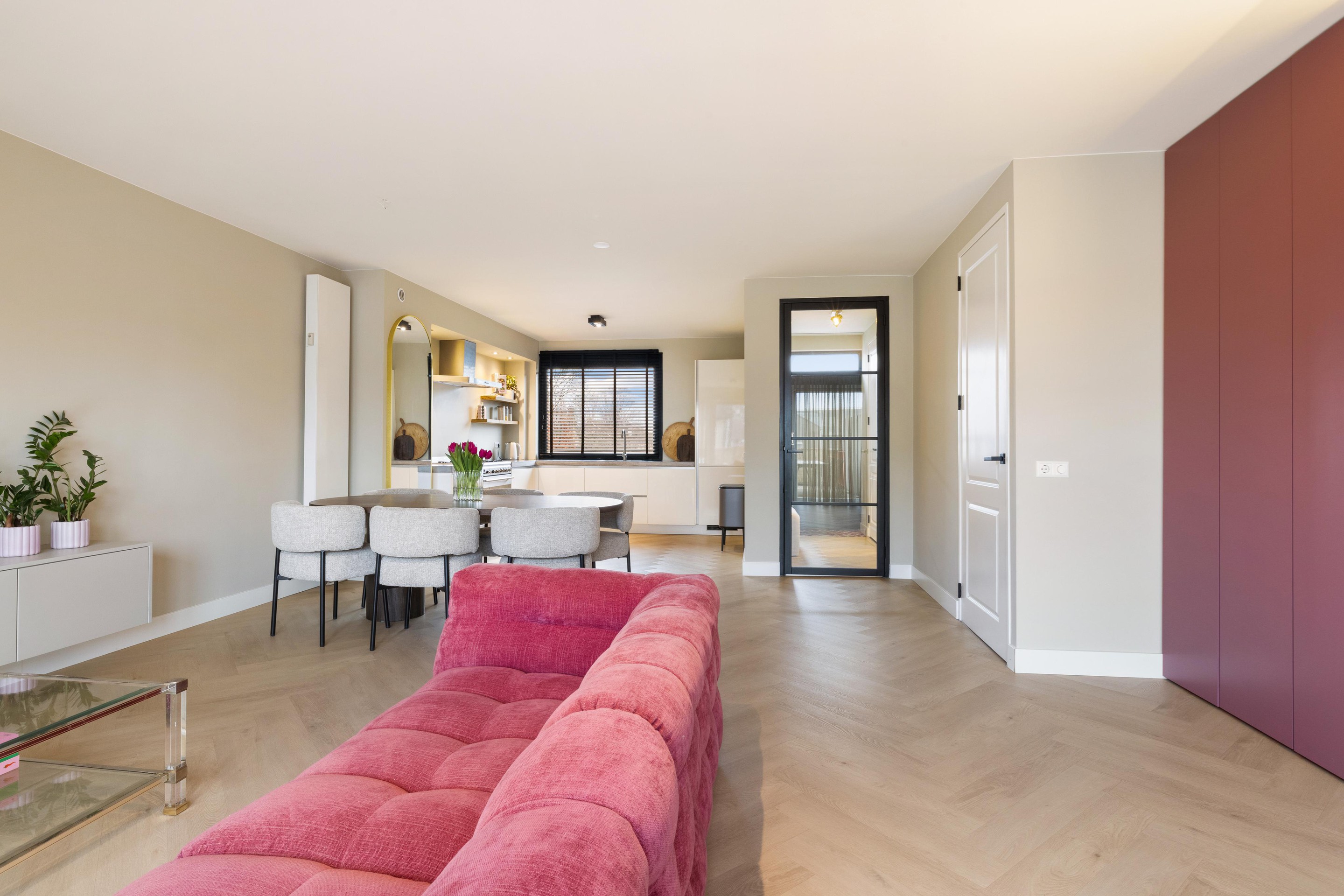 De woonkamer is royaal opgezet en sfeervol afgewerkt met een stijlvolle visgraat PVC-vloer, wat direct zorgt voor een warme en moderne uitstraling. Aan de voorzijde bevindt zich de moderne keuken, welke is voorzien van alle gewenste inbouwapparatuur, waaronder een 6-pits Smeg gasfornuis, vaatwasser, koelkast en vriezer. Vanuit de woonkamer heeft u toegang tot het tweede, zeer ruime terras van ca. 45 m2, gelegen op het zuidoosten, een heerlijke plek om van de zon te genieten.