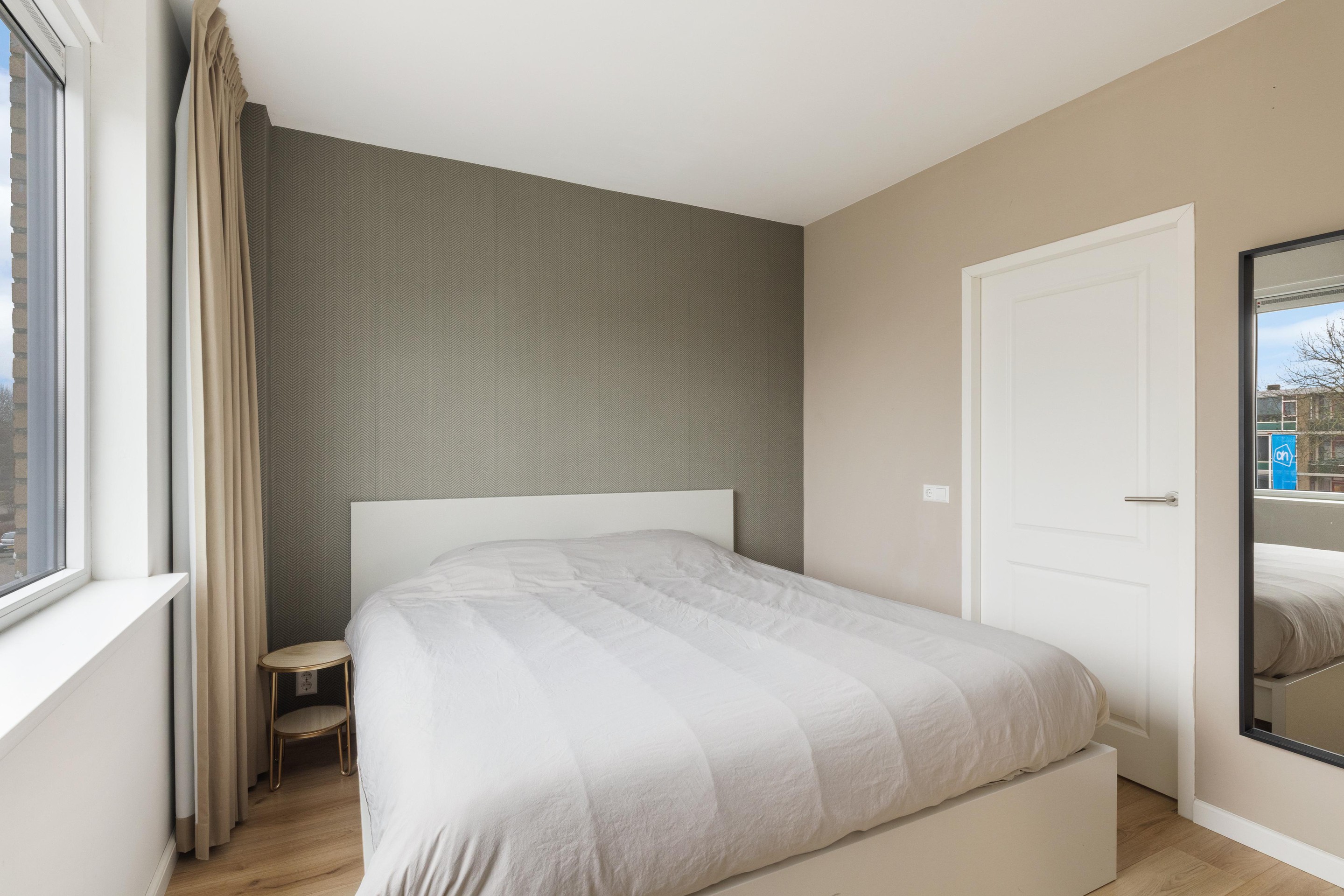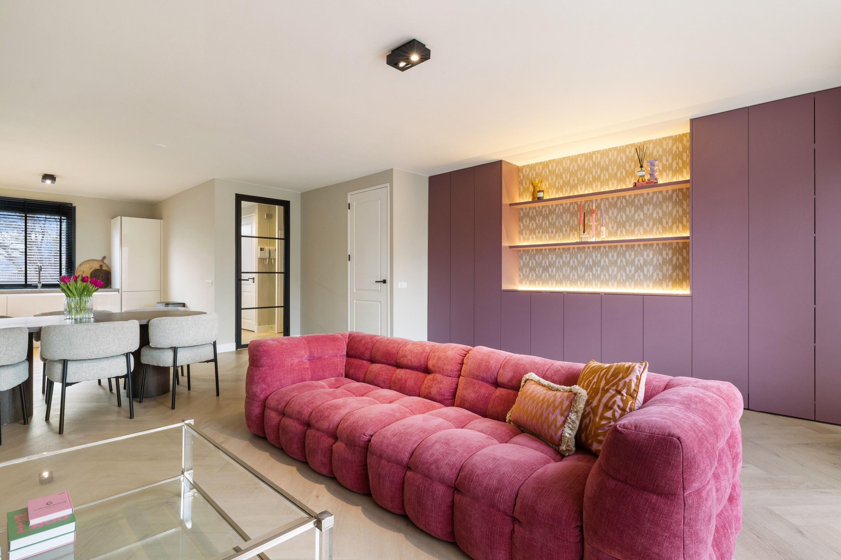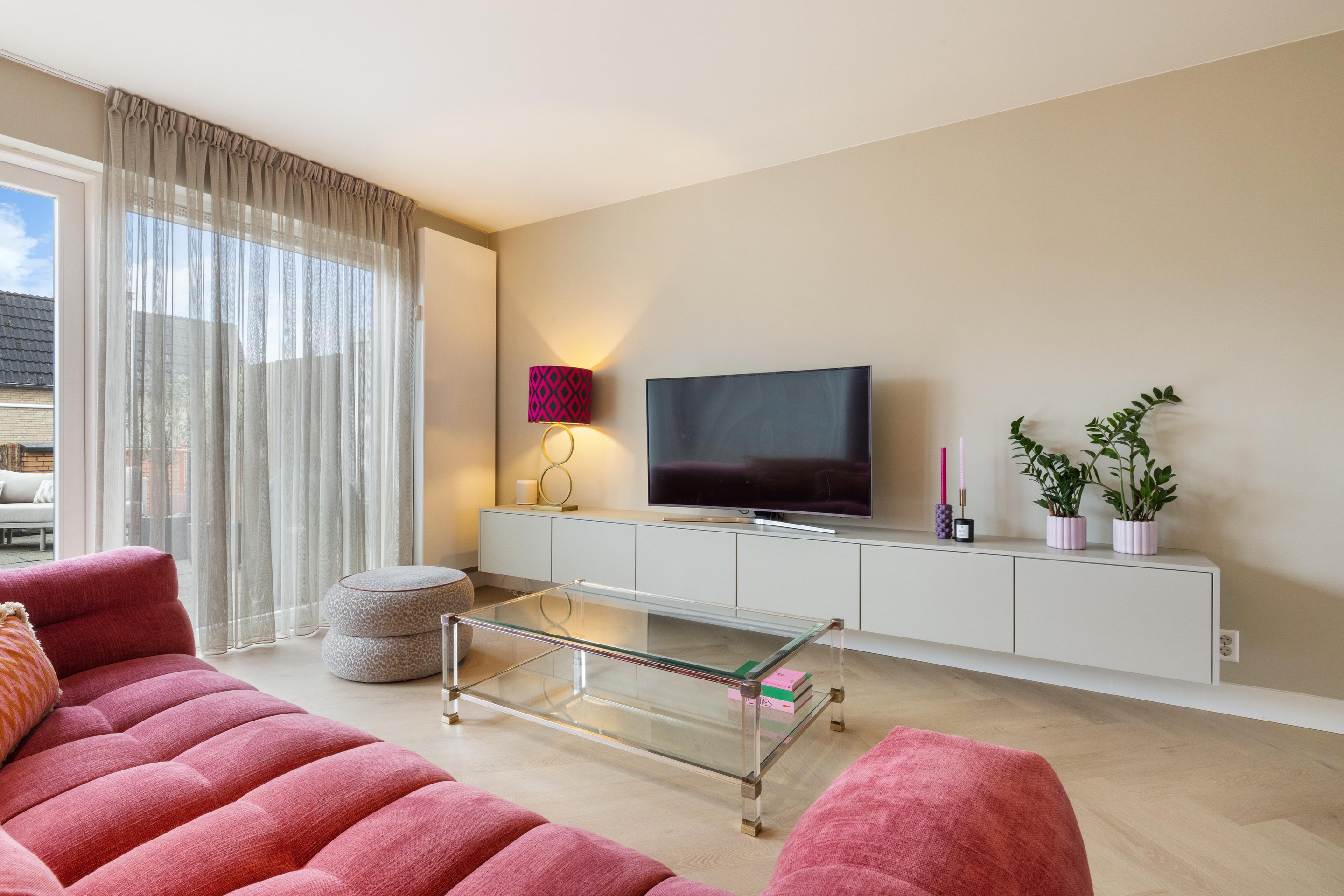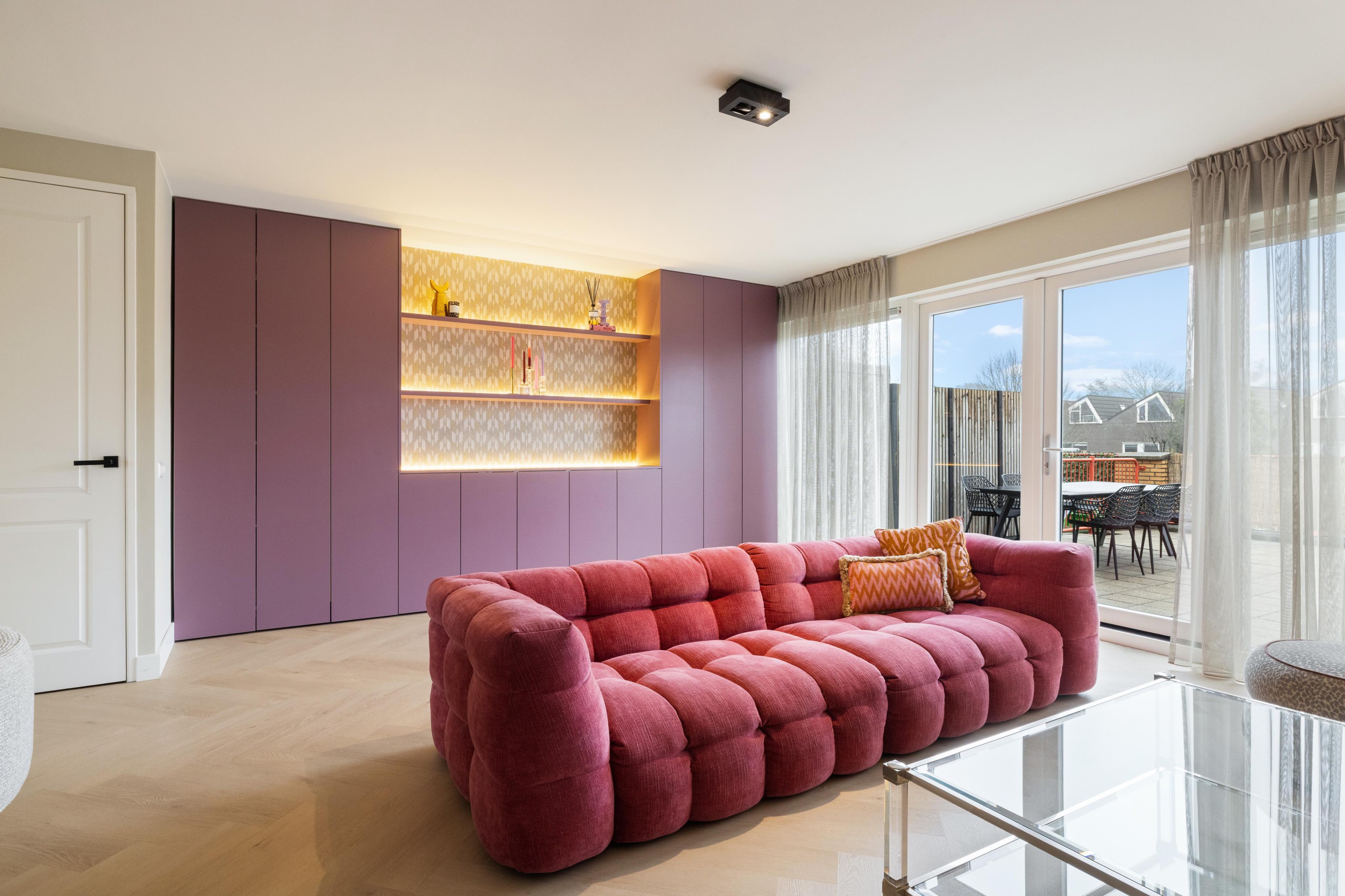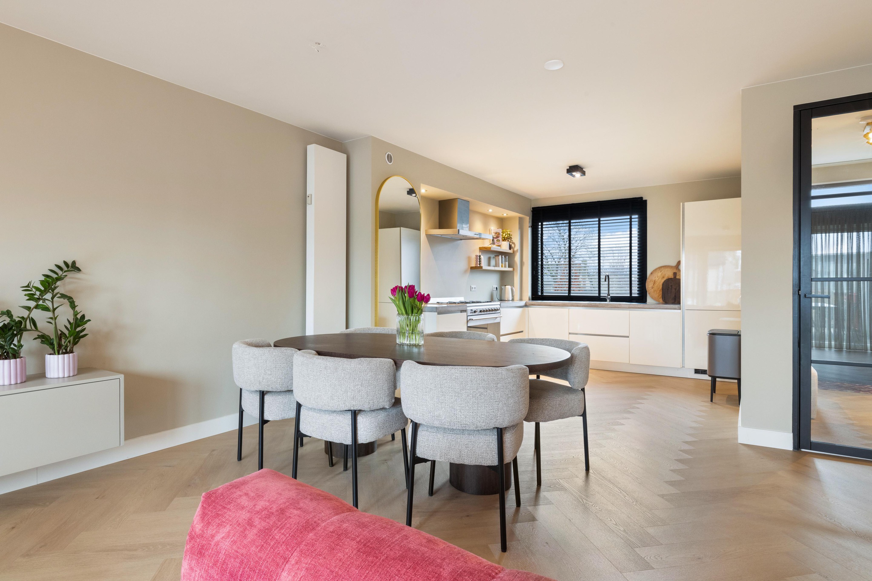 De woonkamer is royaal opgezet en sfeervol afgewerkt met een stijlvolle visgraat PVC-vloer, wat direct zorgt voor een warme en moderne uitstraling. Aan de voorzijde bevindt zich de moderne keuken, welke is voorzien van alle gewenste inbouwapparatuur, waaronder een 6-pits Smeg gasfornuis, vaatwasser, koelkast en vriezer. Vanuit de woonkamer heeft u toegang tot het tweede, zeer ruime terras van ca. 45 m2, gelegen op het zuidoosten, een heerlijke plek om van de zon te genieten.