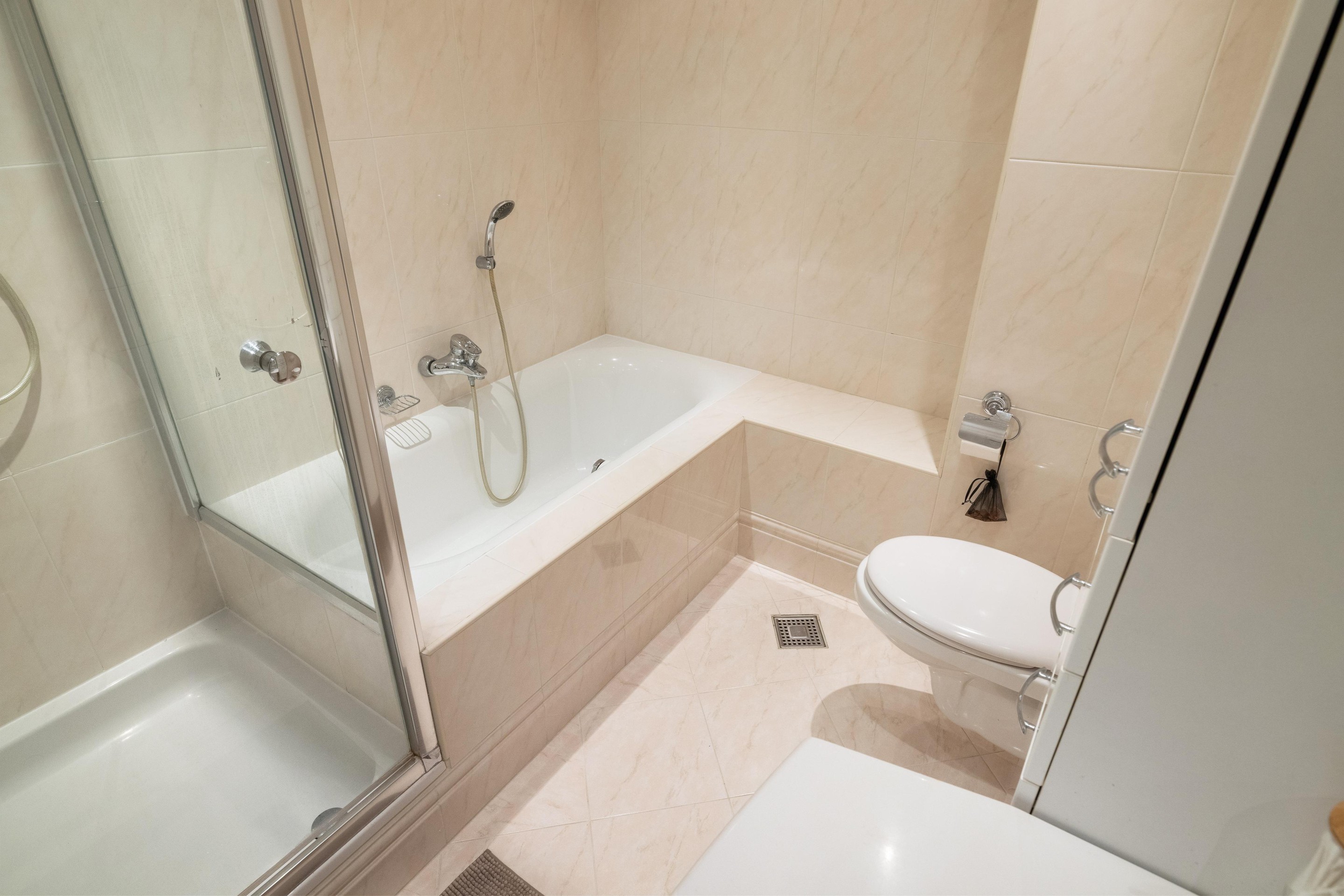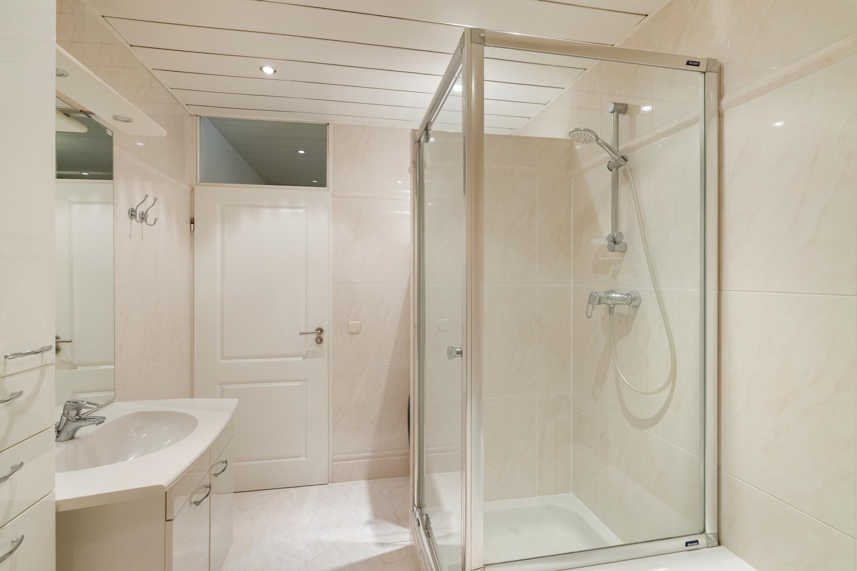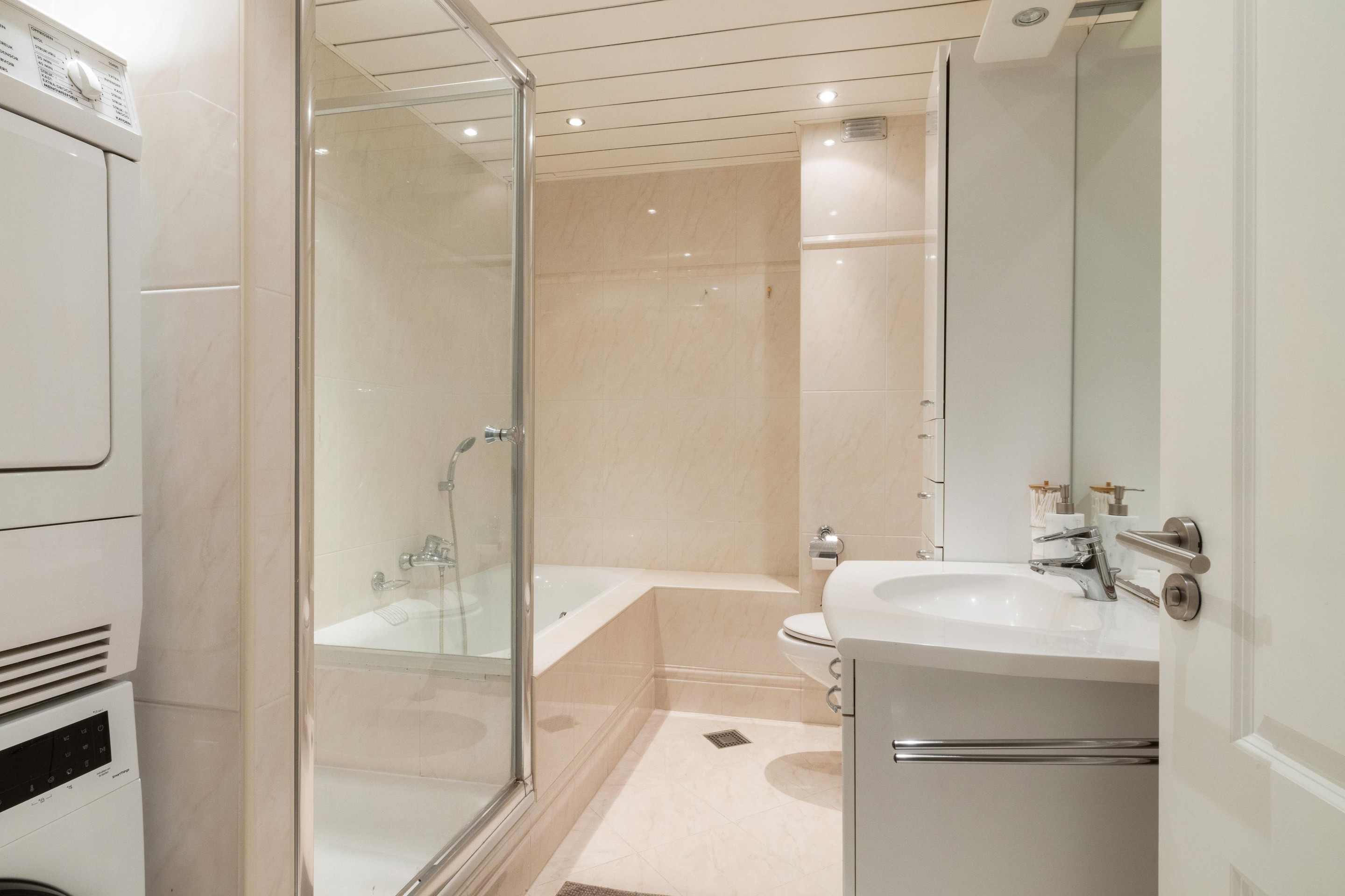 De verzorgde badkamer is compleet uitgevoerd en voorzien van een ligbad, douche, toilet, wastafel en de opstelplaats voor wasmachine en droger.