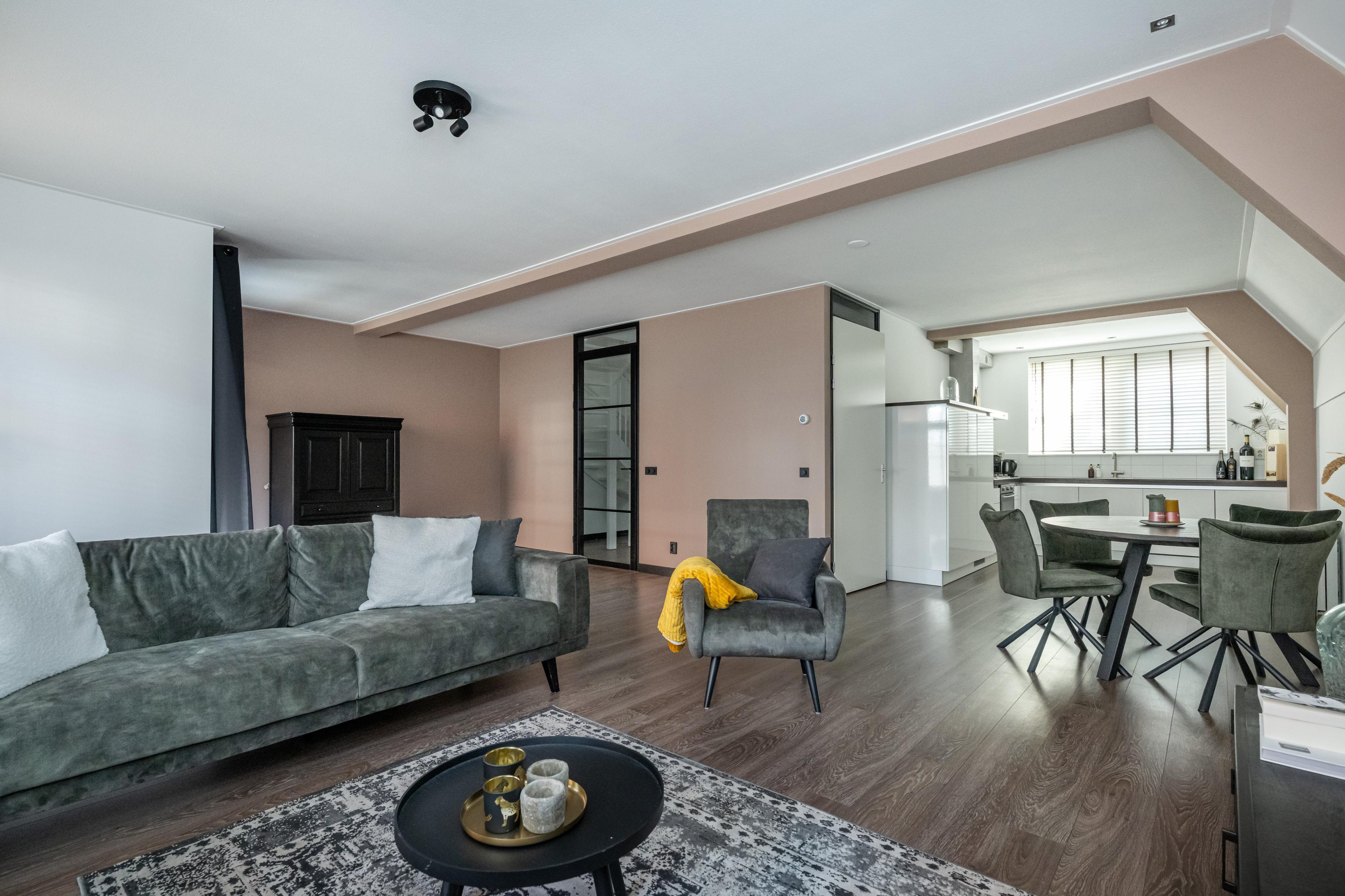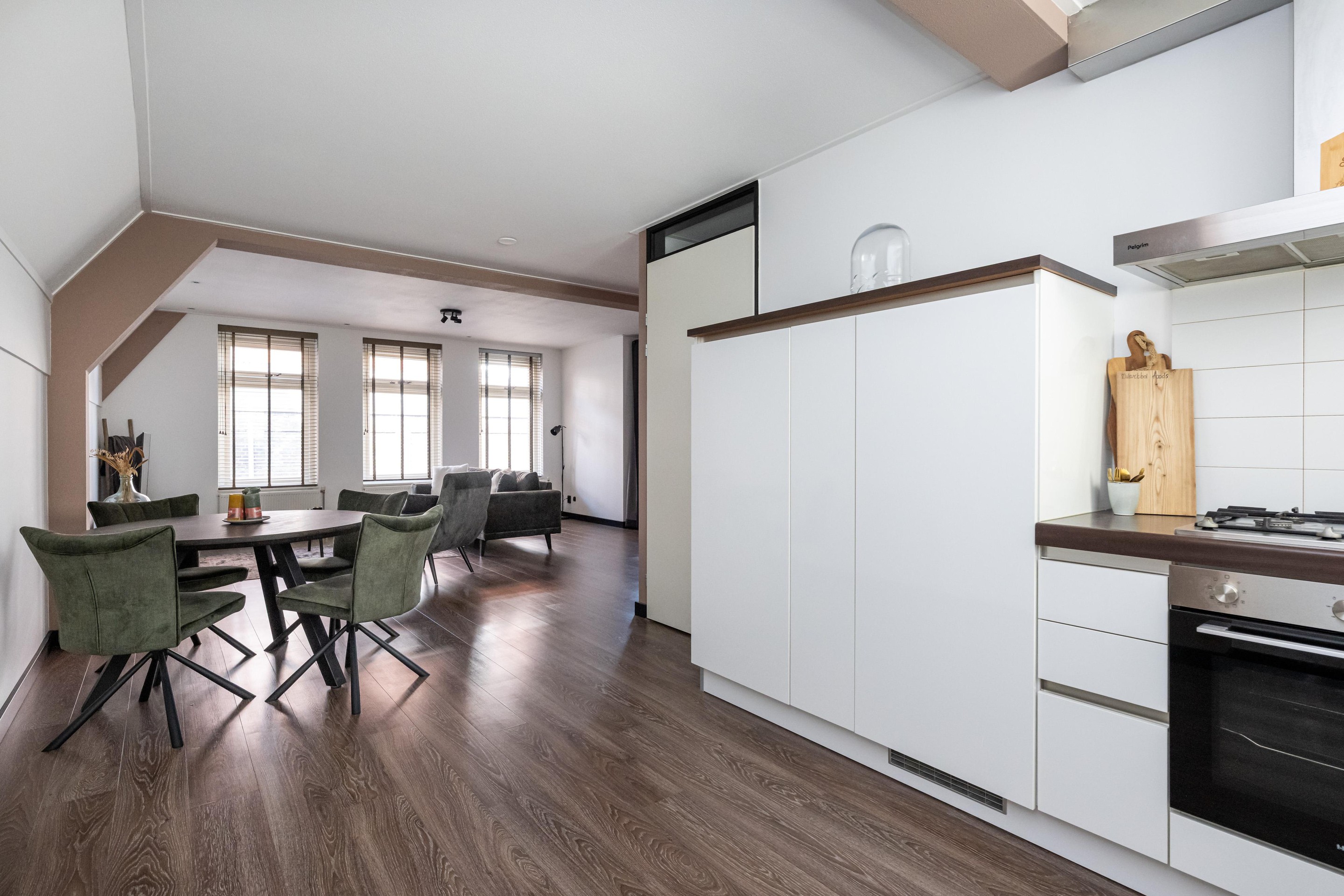 De moderne, open hoogglans witte keuken is voorzien van greeploze soft-close kastjes en uitgerust met diverse inbouwapparatuur: een koelkast, oven, vaatwasser en een 4-pits gasfornuis met afzuigkap. De keuken is stijlvol afgewerkt en verlicht met inbouwspotjes, wat zorgt voor een luxe uitstraling. Direct naast de keuken bevindt zich een ruime bijkeuken met witgoedaansluitingen, ideaal voor extra opbergruimte of het plaatsen van uw wasmachine en droger.