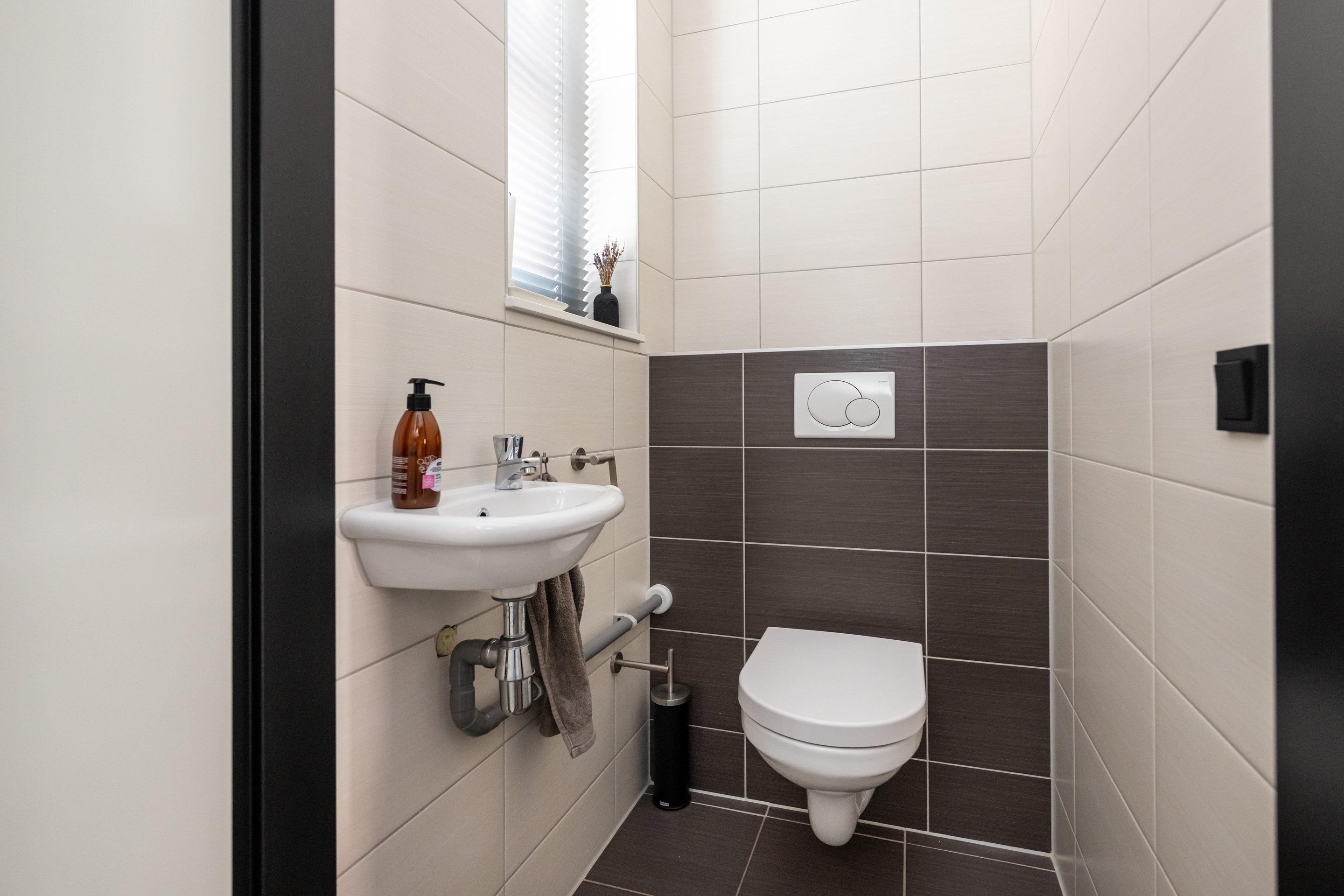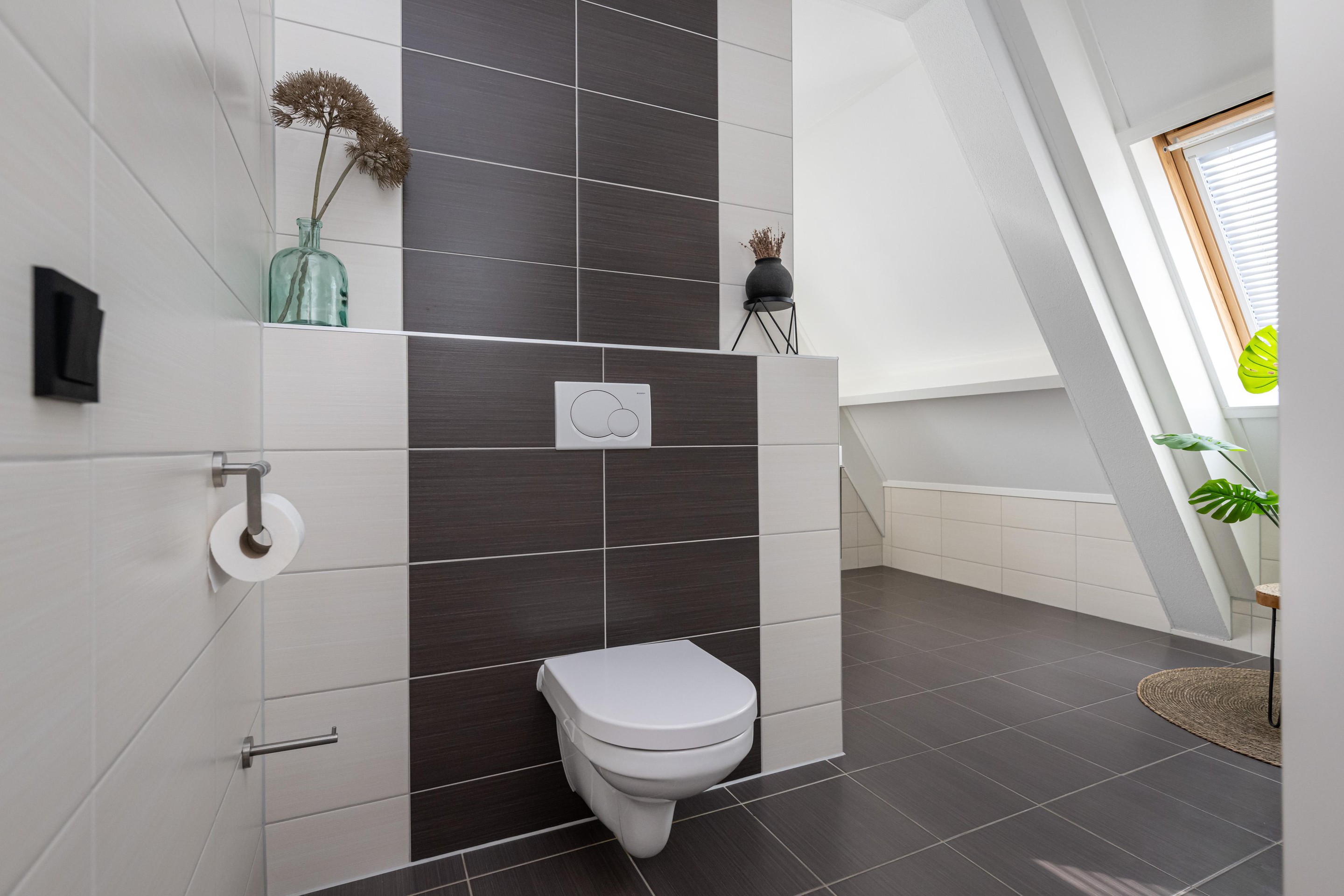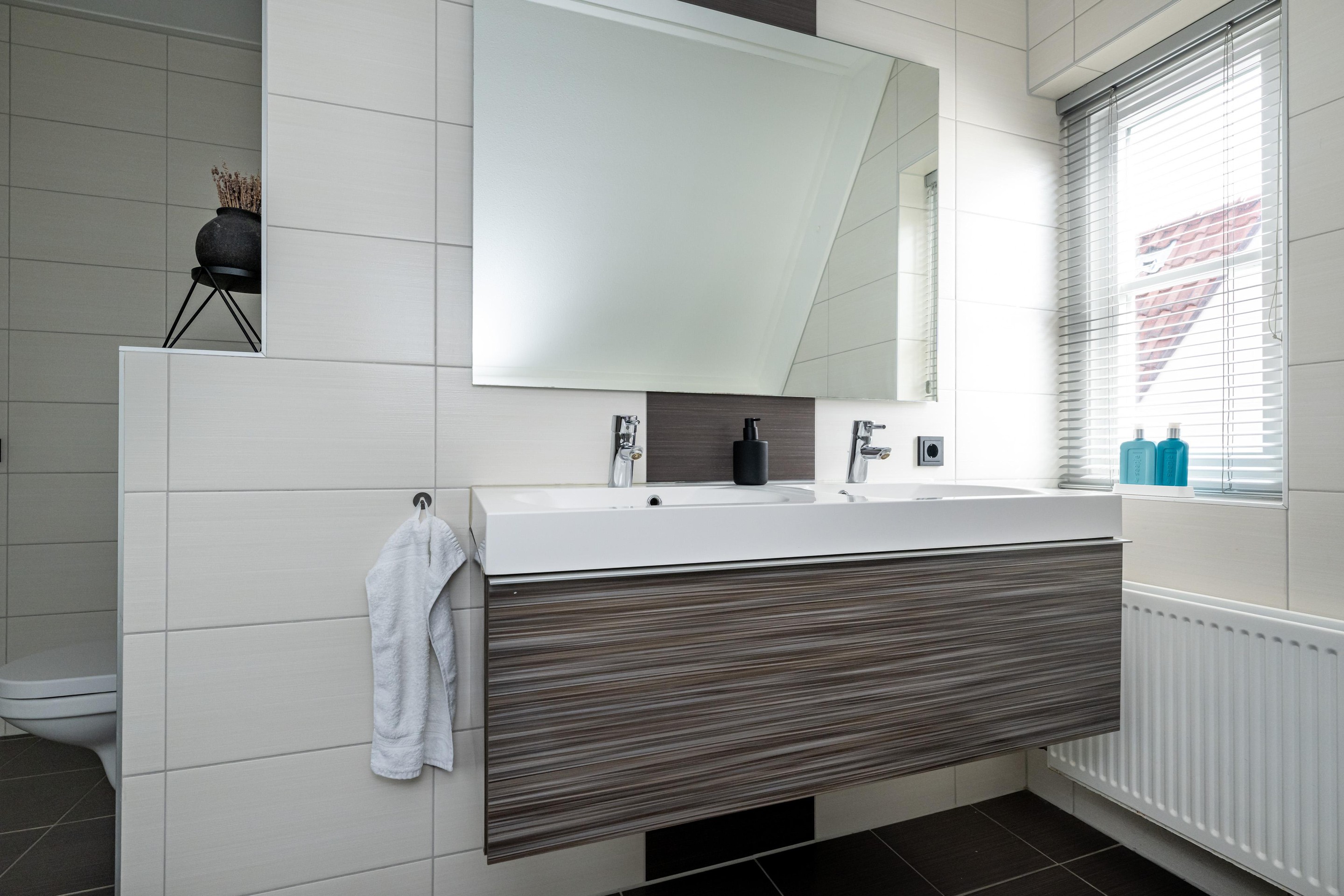 In de entreehal leidt een vaste trapopgang naar de bovenverdieping. Hier treft u twee slaapkamers, een luxe badkamer en een berging. De hoofdslaapkamer is royaal van formaat, voorzien van een vaste kastenwand, inbouwspotjes en een Velux dakraam dat zorgt voor veel daglicht. De tweede slaapkamer is compacter, maar eveneens licht en voorzien van een Velux dakraam. De badkamer is een echte eyecatcher: strak afgewerkt, ruim en speels ingedeeld. U beschikt hier over een hangend toilet, een dubbel wastafelmeubel en een riante inloopdouche. Aan de overzijde van de overloop vindt u nog een praktische berging.