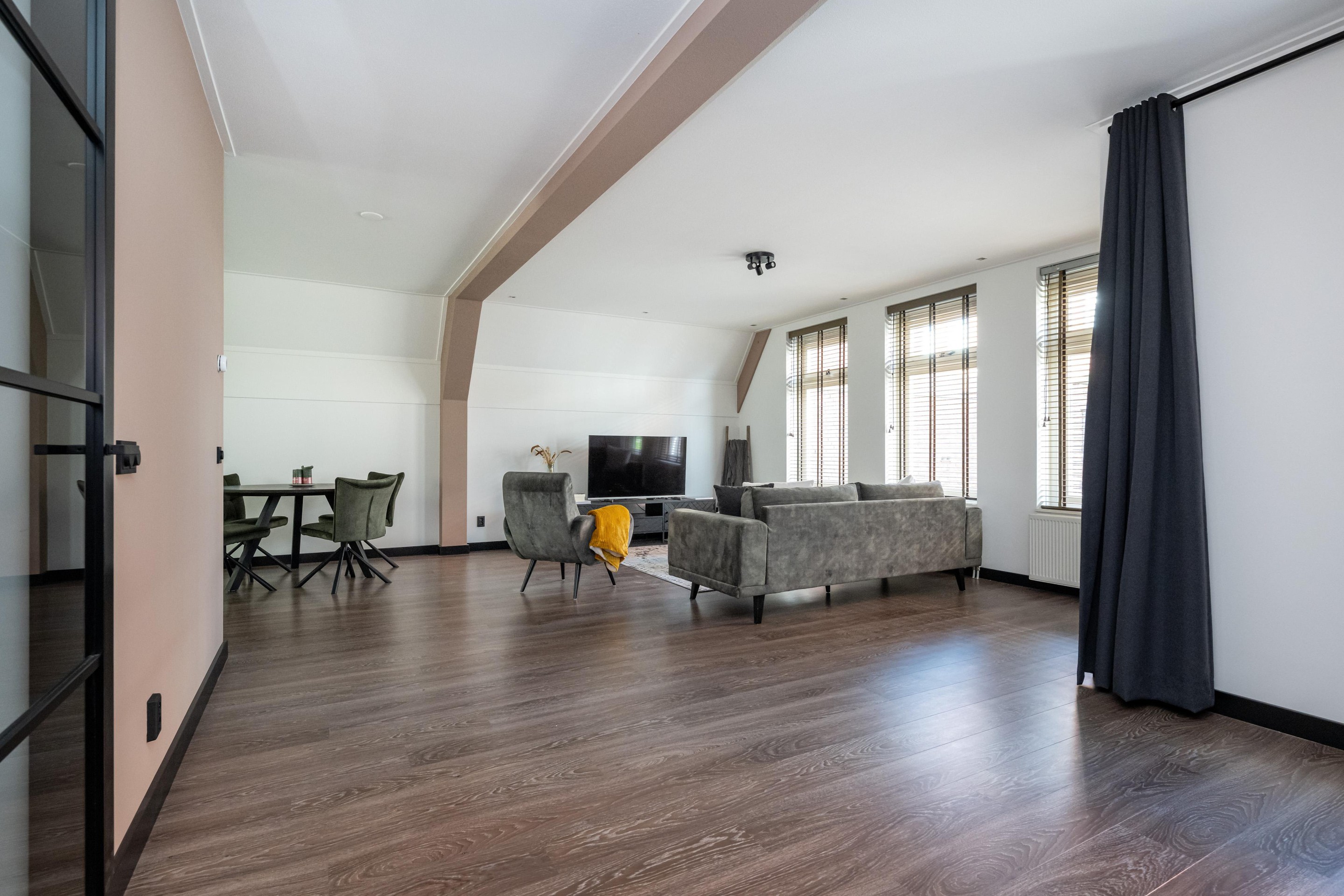 Laminaatvloer, radiatoren en toegang tot balkon.