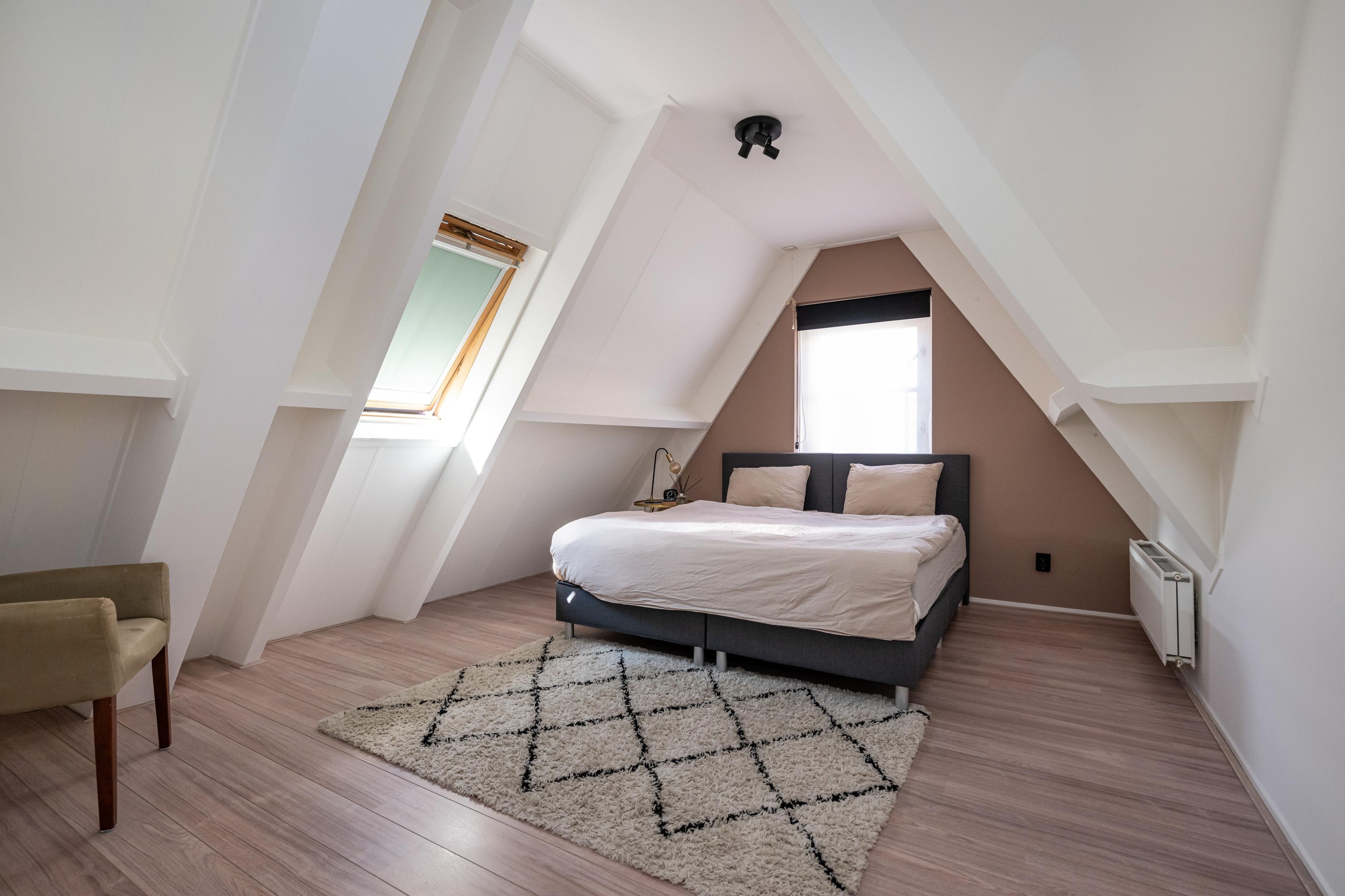 Laminaatvloer, radiator, spots in plafond, Velux dakraam en vaste kastenwand.