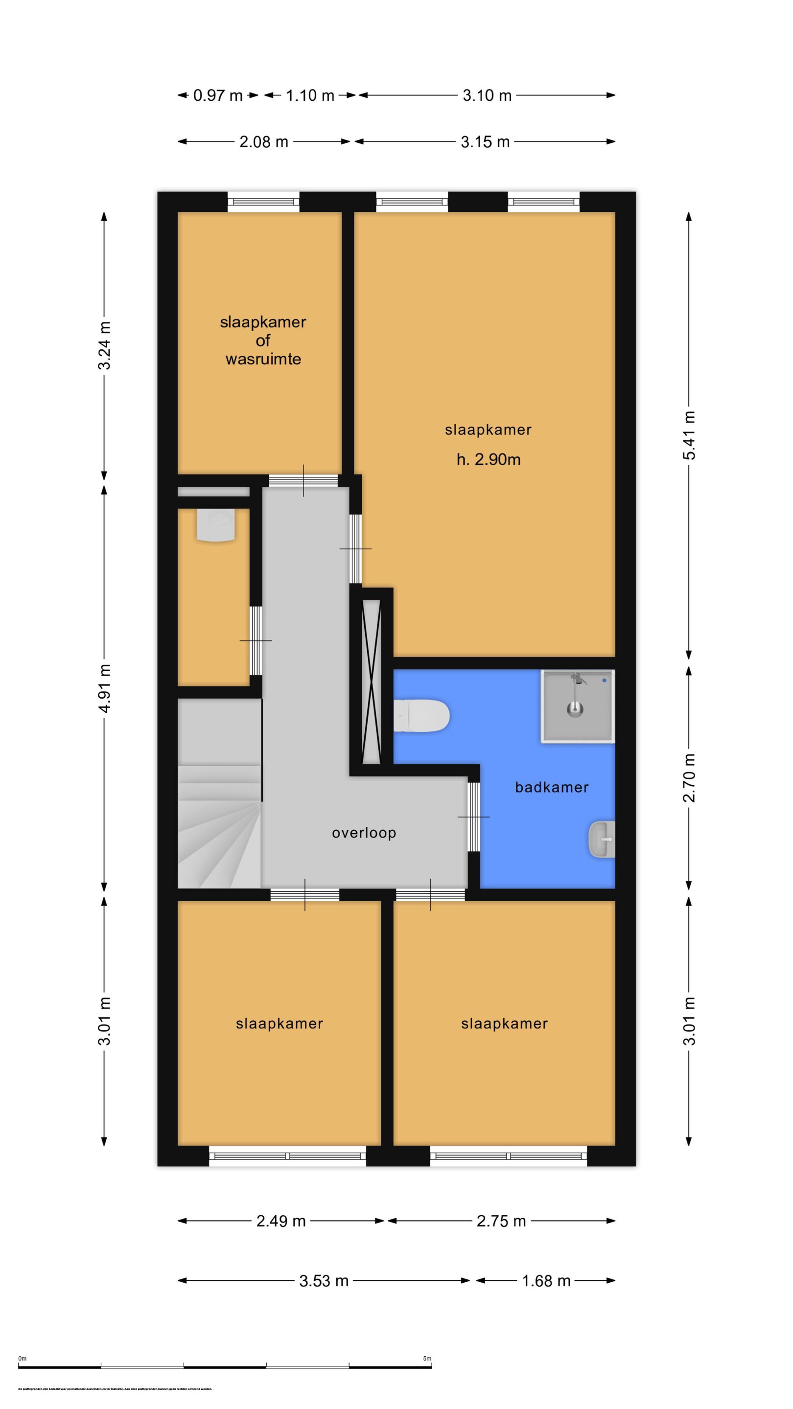Overloop met kastruimte: drie slaapkamers (11,5 | 10,5 | 6 m2) en luxe badkamer (ca. 2,7 × 2,2 m) met inloopdouche, wastafelmeubel en zwevend toilet.
