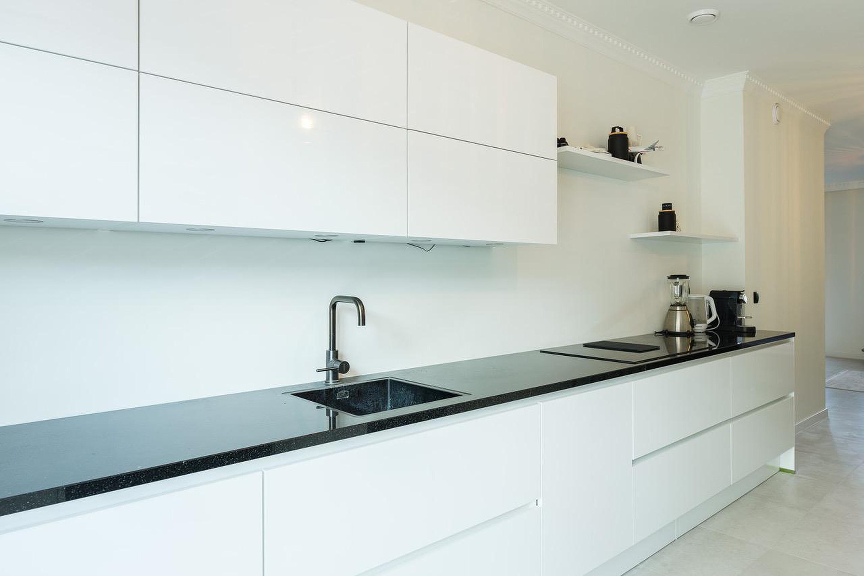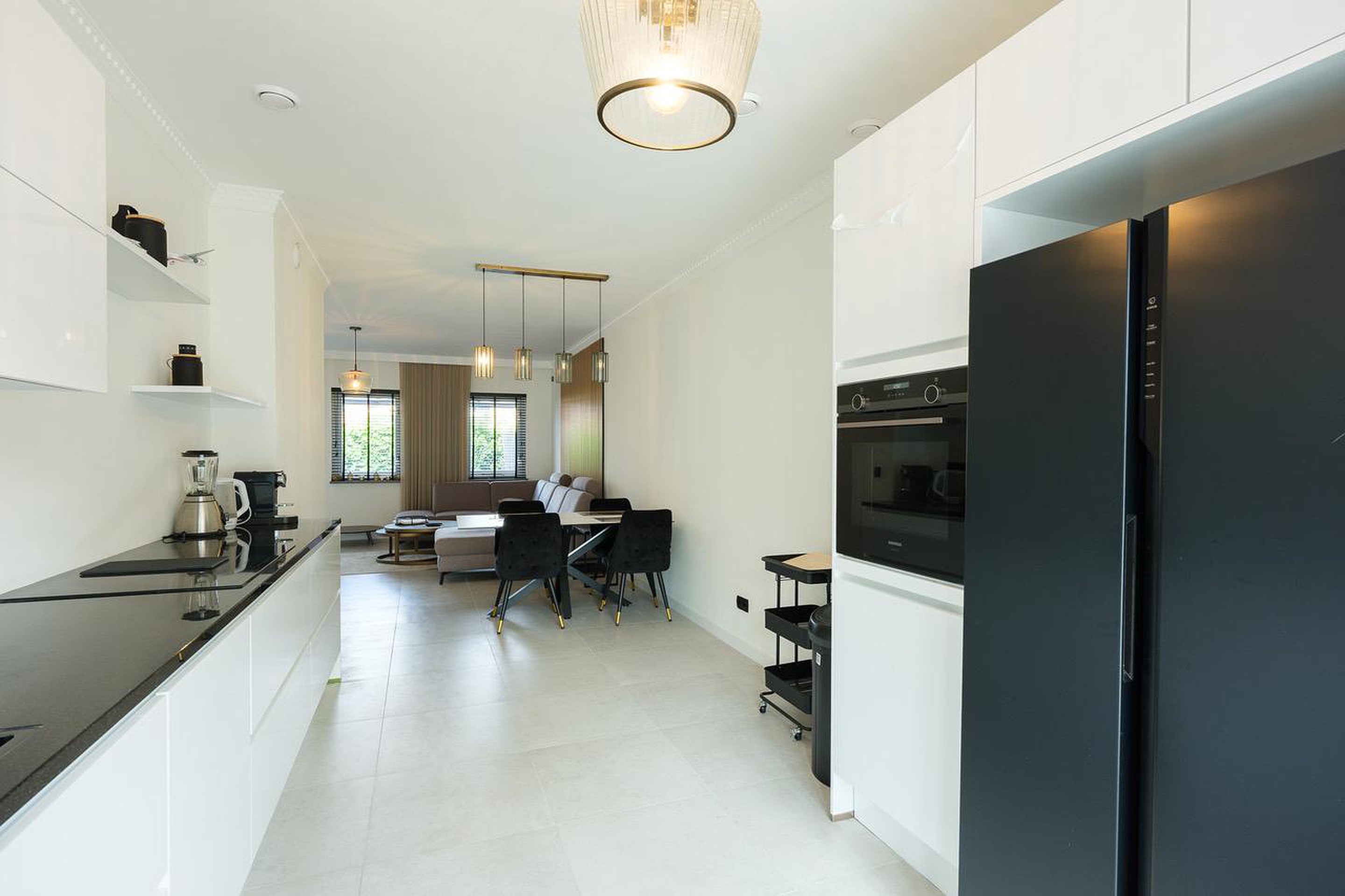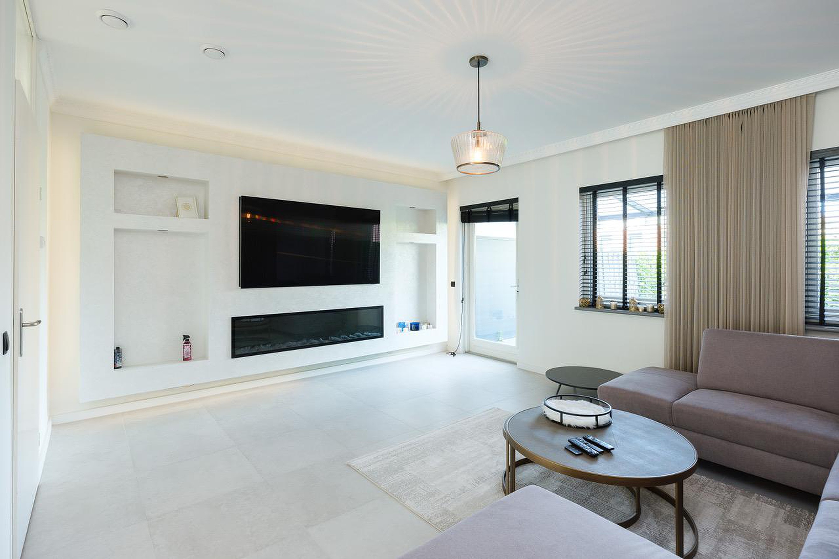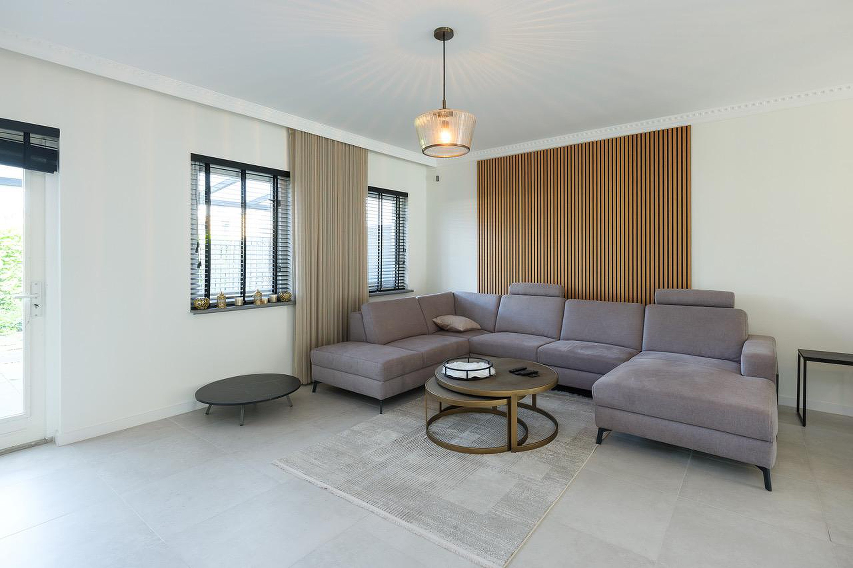 Afgesloten entree: hal met garderobe en toilet. Open keuken (11m2) in moderne opstelling met inbouwapparatuur, doorlopend naar de ruime living/tuinkamer (35m2) met grote raampartijen en toegang tot de overkapte veranda/dakterras.