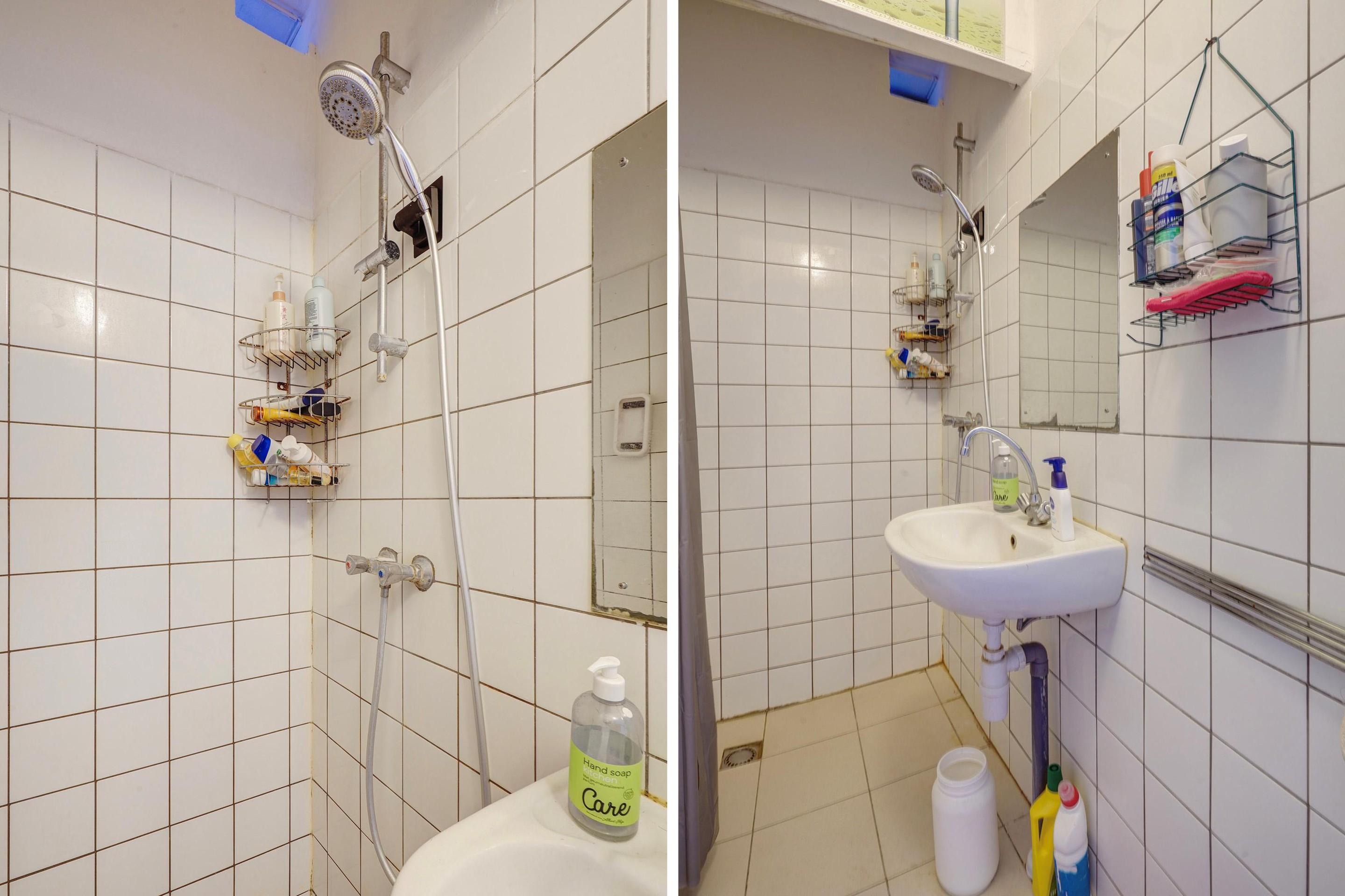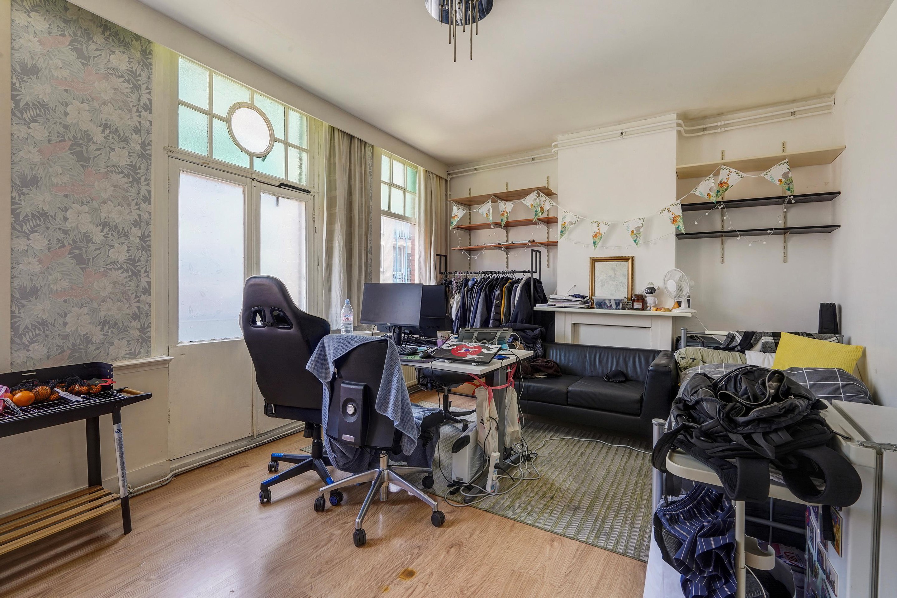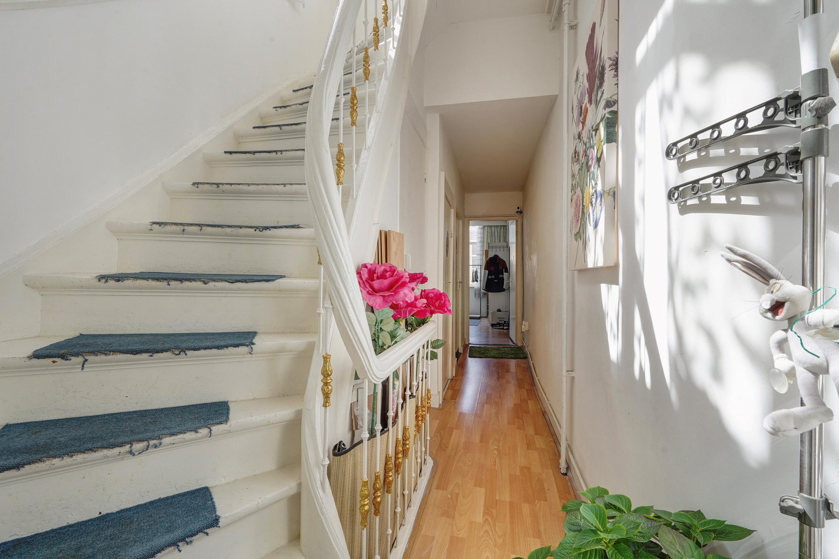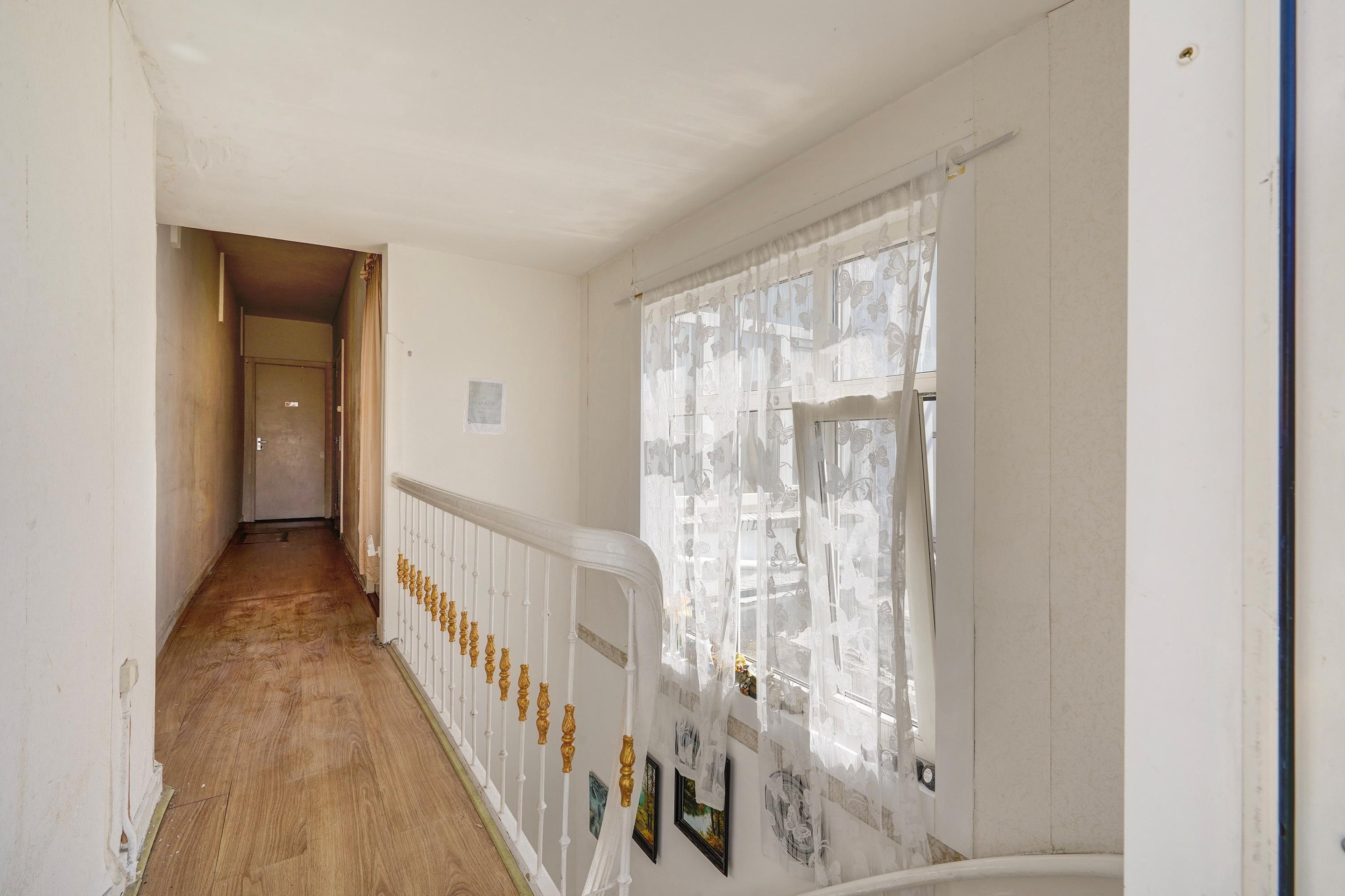 Op de eerste verdieping van deze woning vind je een ruime slaapkamer aan de voorzijde, ideaal als master bedroom. De woonkamer is centraal gelegen en biedt royale leefruimte met ingebouwde kasten aan weerszijden voor extra opbergruimte. Aan de achterzijde bevindt zich een tweede, rustige slaapkamer, naast een functionele keuken met een aangrenzende doucheruimte en een apart toilet. Een lange overloop verbindt alle kamers met elkaar en leidt naar de trap naar de tweede verdieping.