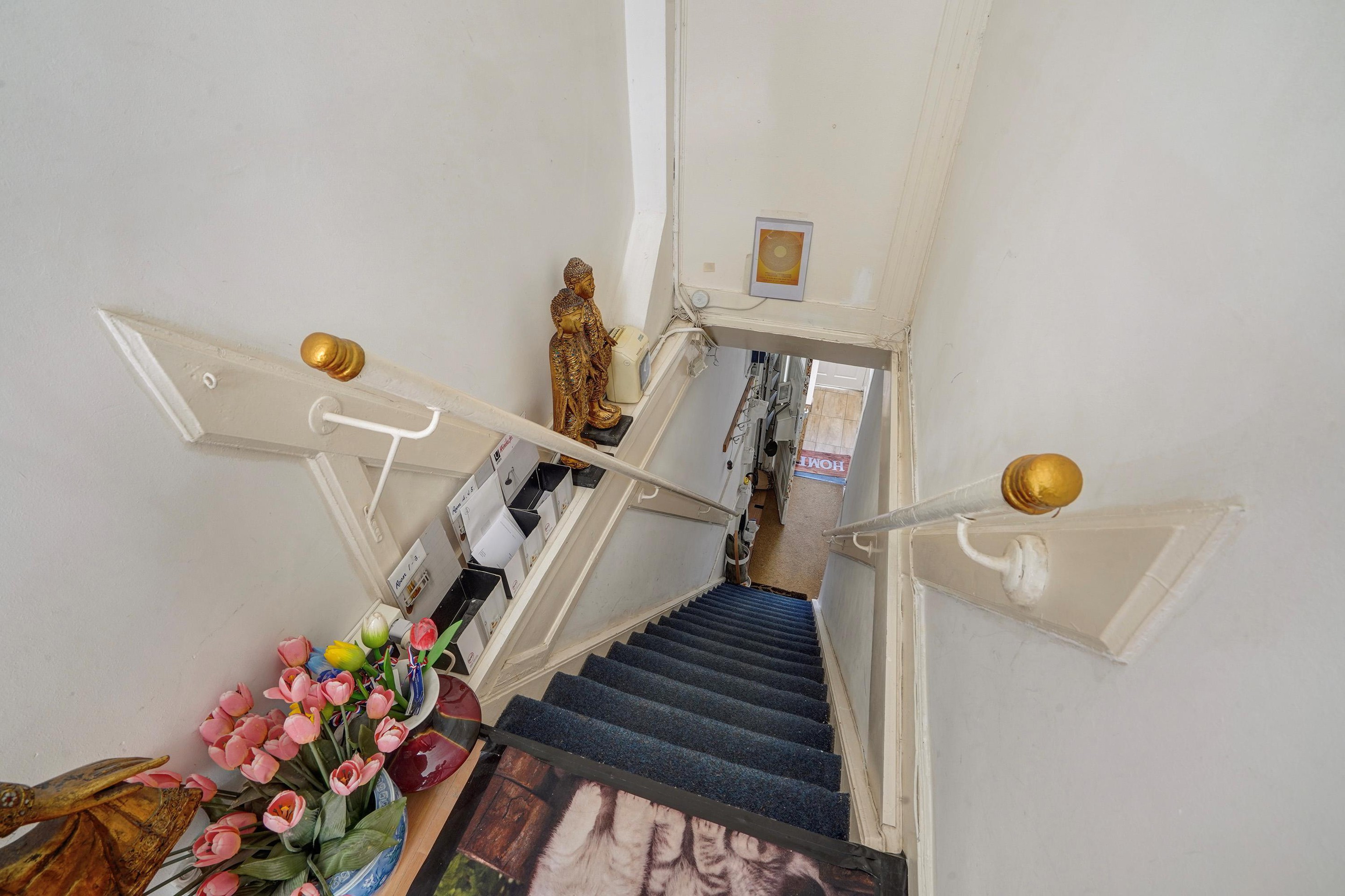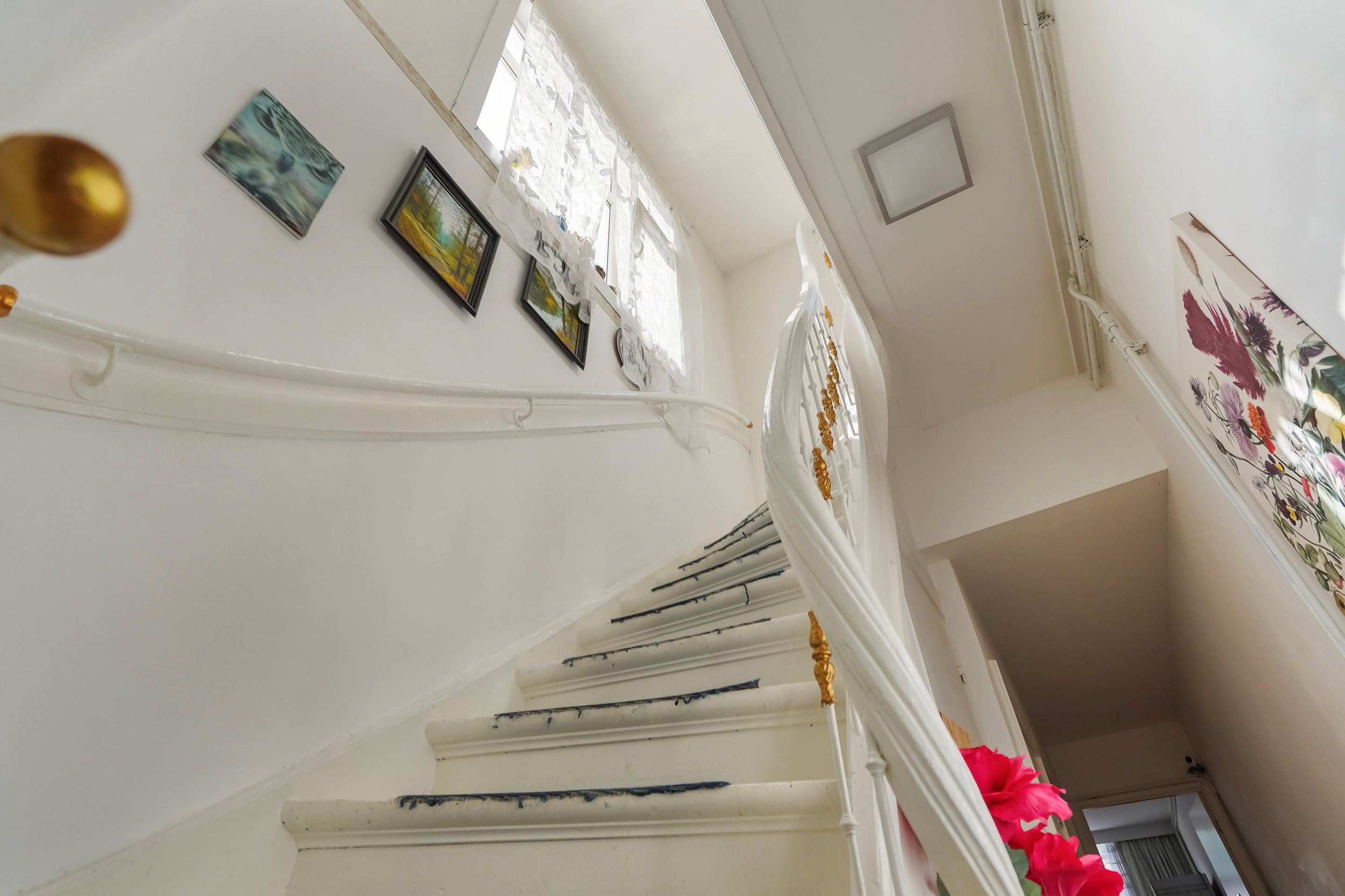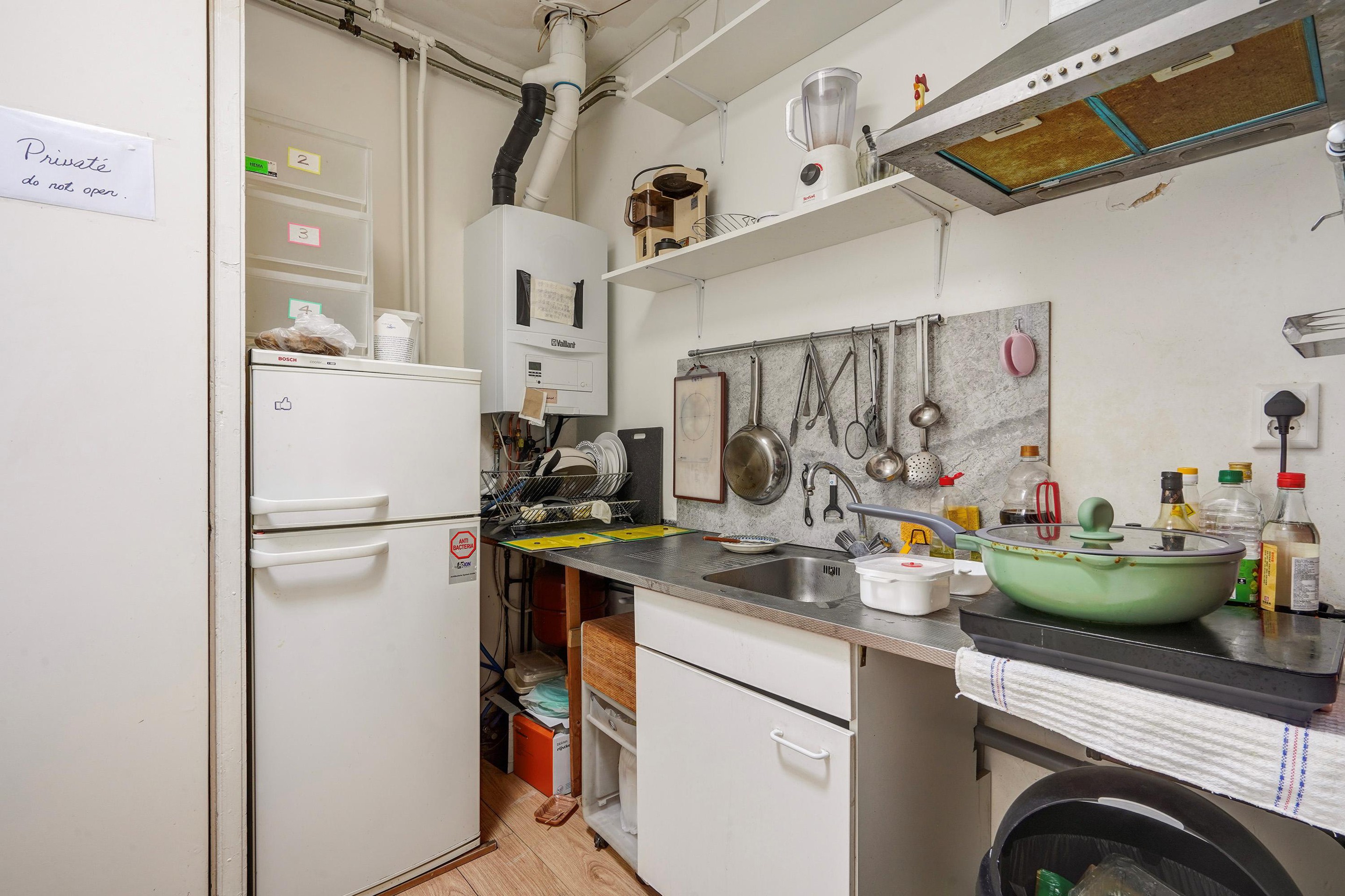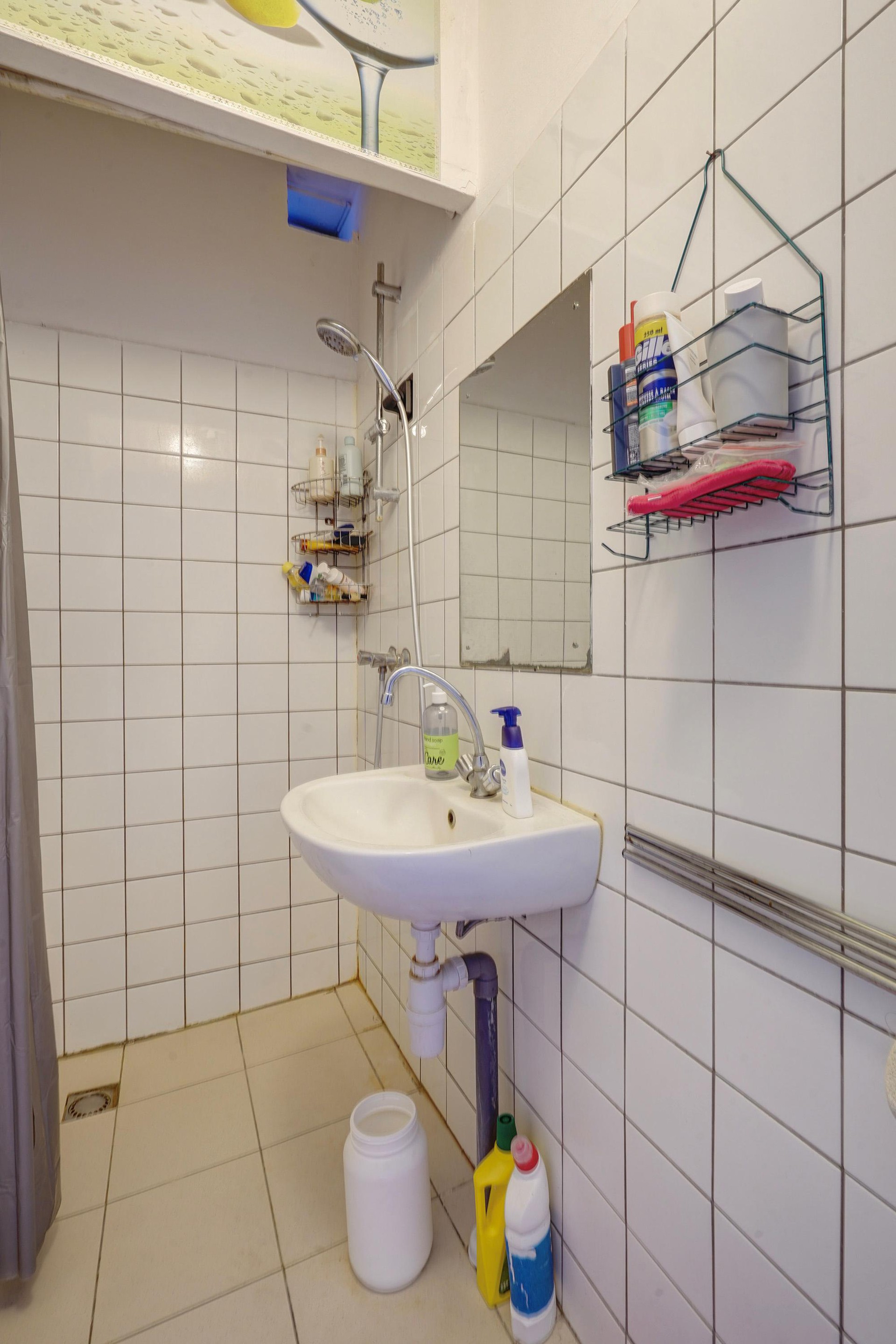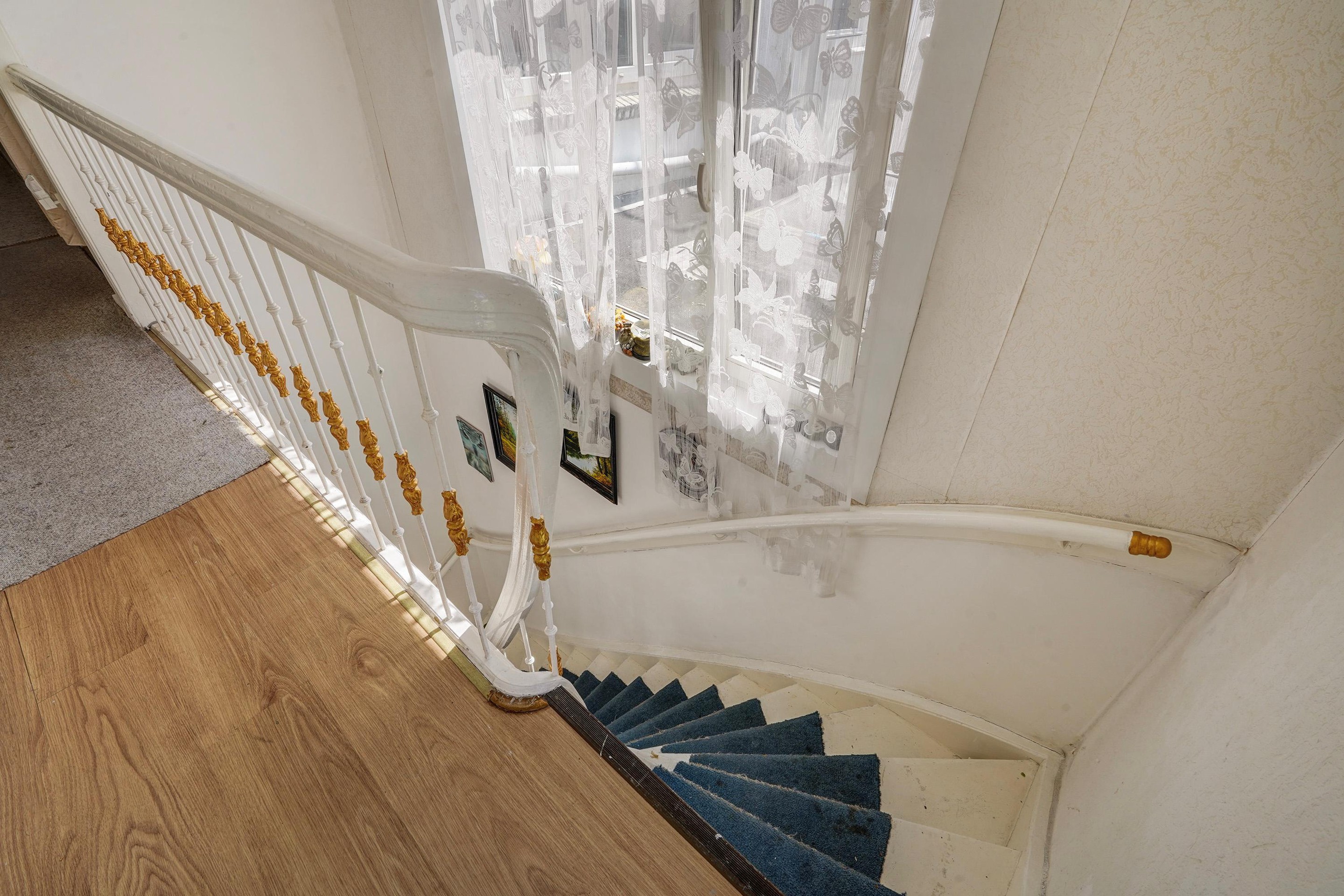 Op de eerste verdieping van deze woning vind je een ruime slaapkamer aan de voorzijde, ideaal als master bedroom. De woonkamer is centraal gelegen en biedt royale leefruimte met ingebouwde kasten aan weerszijden voor extra opbergruimte. Aan de achterzijde bevindt zich een tweede, rustige slaapkamer, naast een functionele keuken met een aangrenzende doucheruimte en een apart toilet. Een lange overloop verbindt alle kamers met elkaar en leidt naar de trap naar de tweede verdieping.
