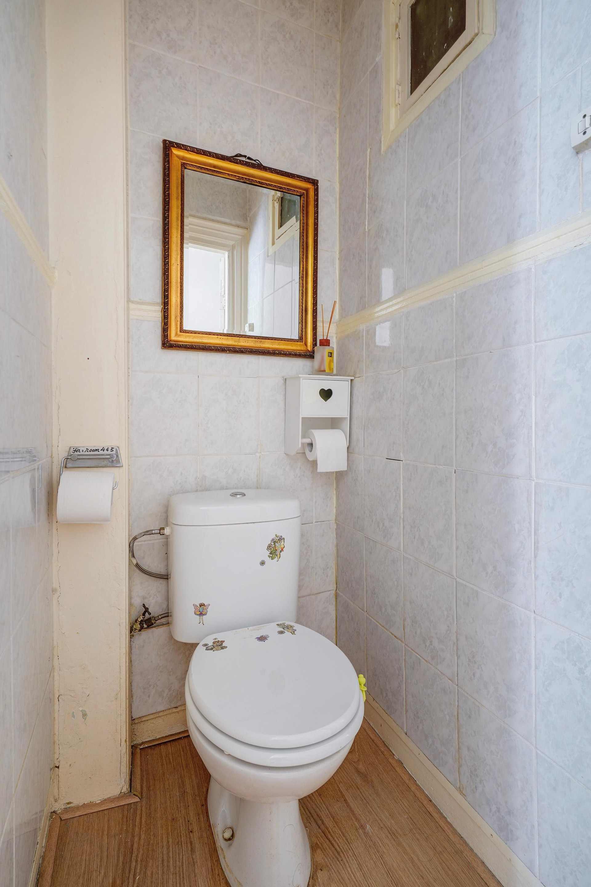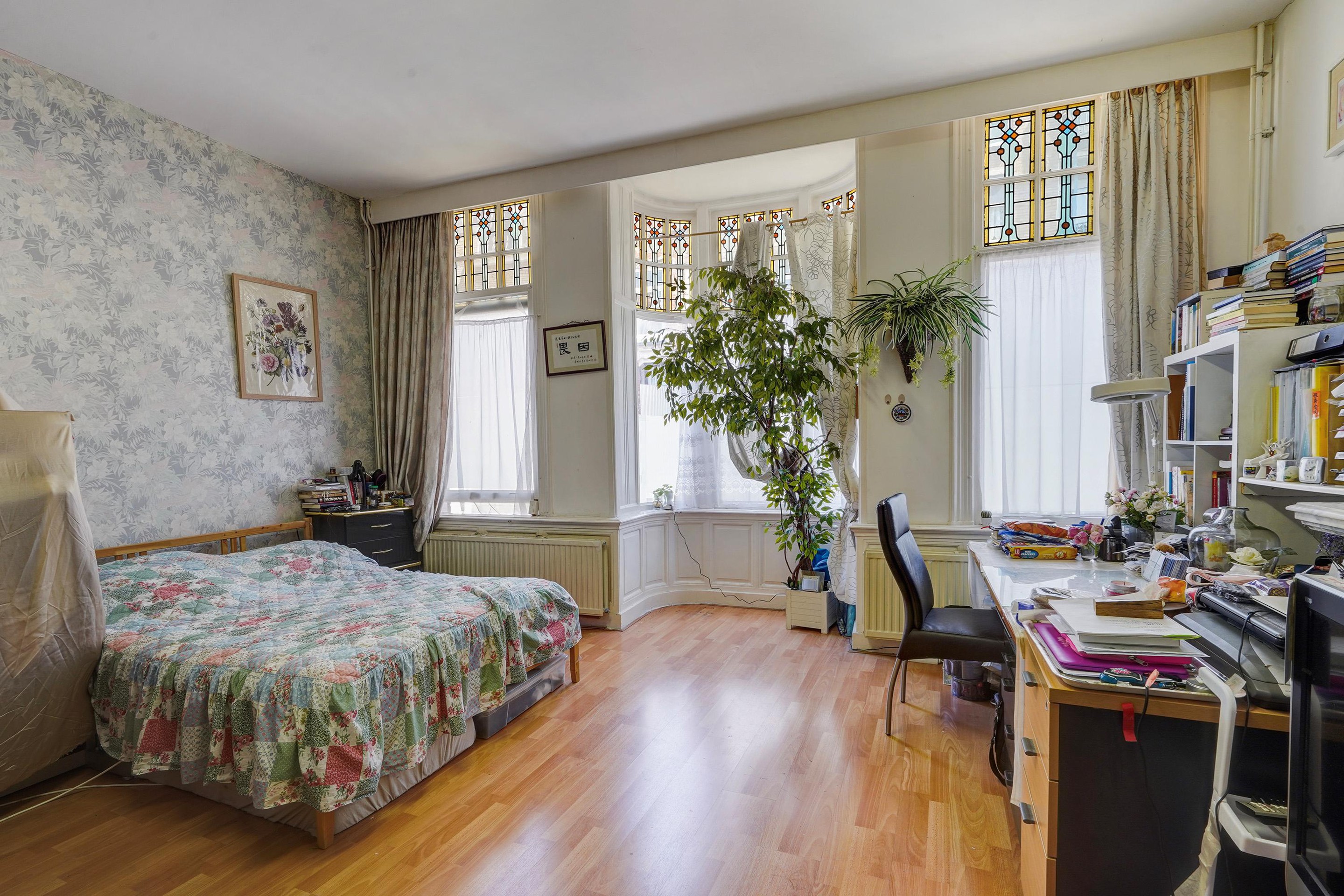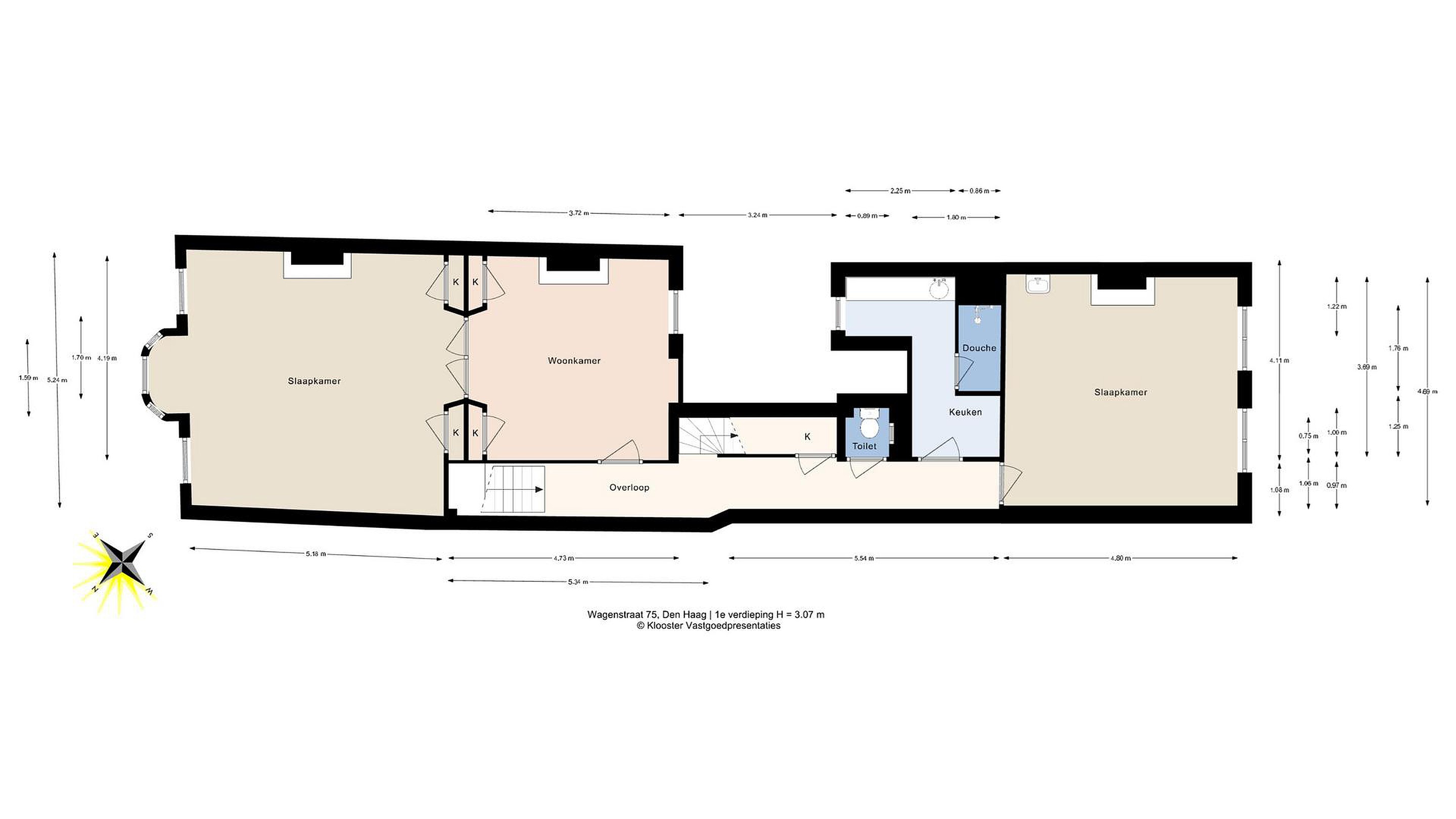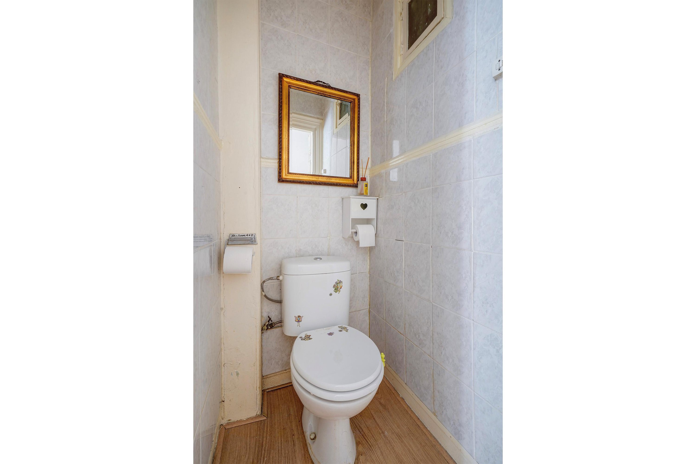 Op de eerste verdieping van deze woning vind je een ruime slaapkamer aan de voorzijde, ideaal als master bedroom. De woonkamer is centraal gelegen en biedt royale leefruimte met ingebouwde kasten aan weerszijden voor extra opbergruimte. Aan de achterzijde bevindt zich een tweede, rustige slaapkamer, naast een functionele keuken met een aangrenzende doucheruimte en een apart toilet. Een lange overloop verbindt alle kamers met elkaar en leidt naar de trap naar de tweede verdieping.