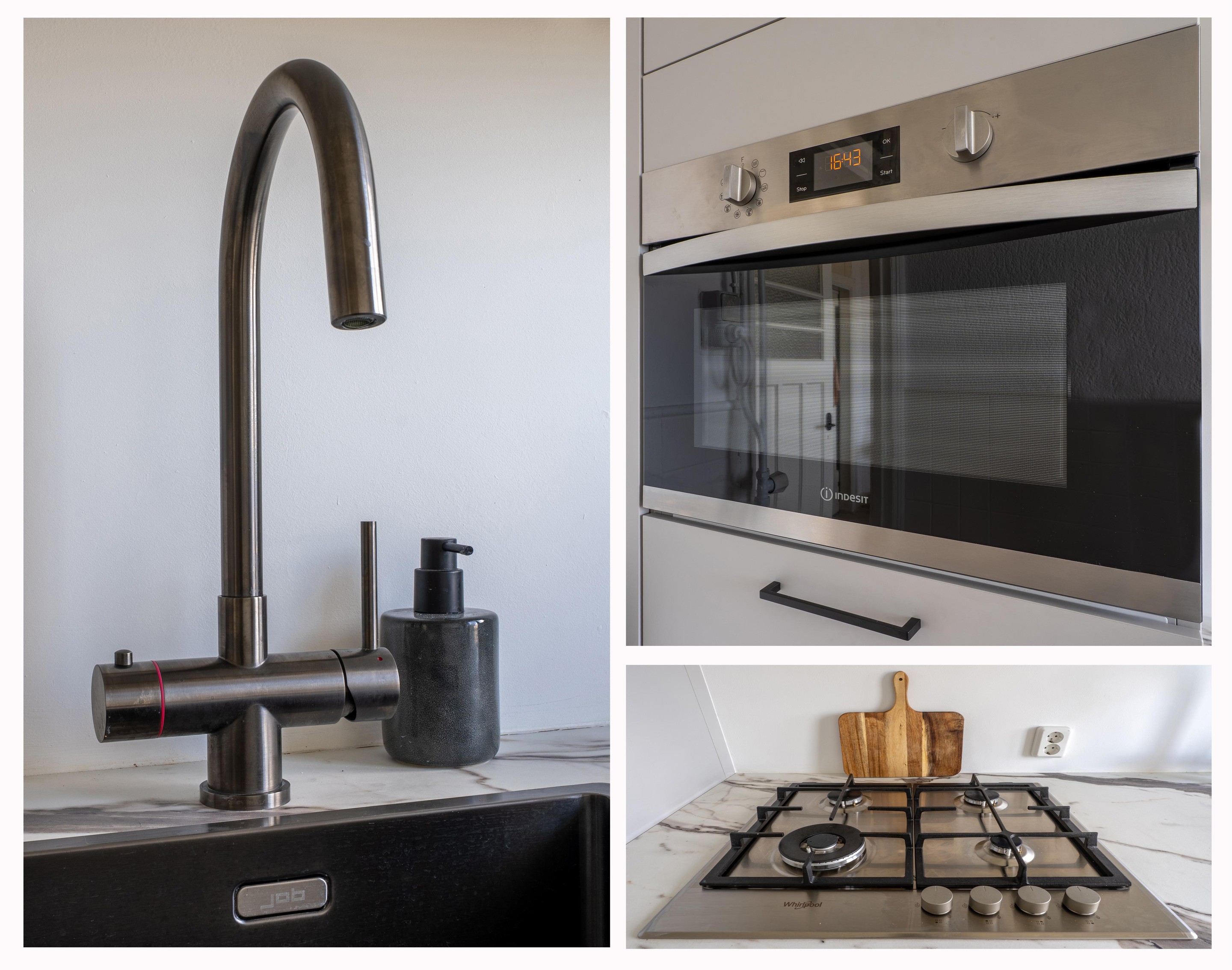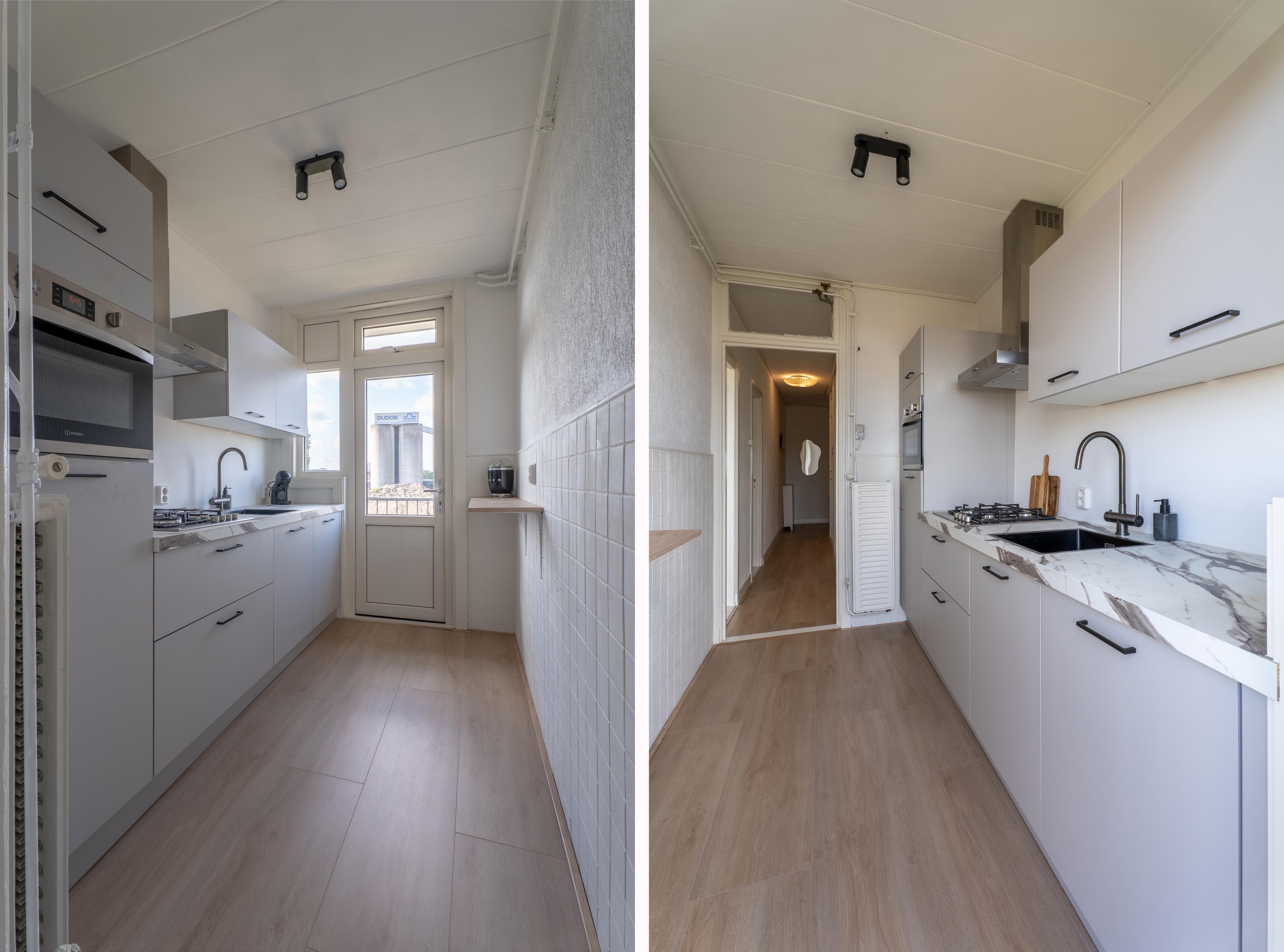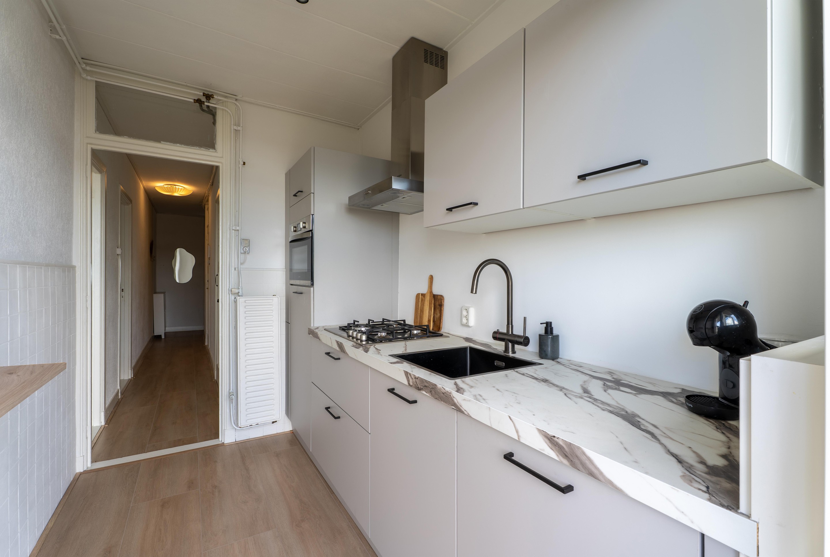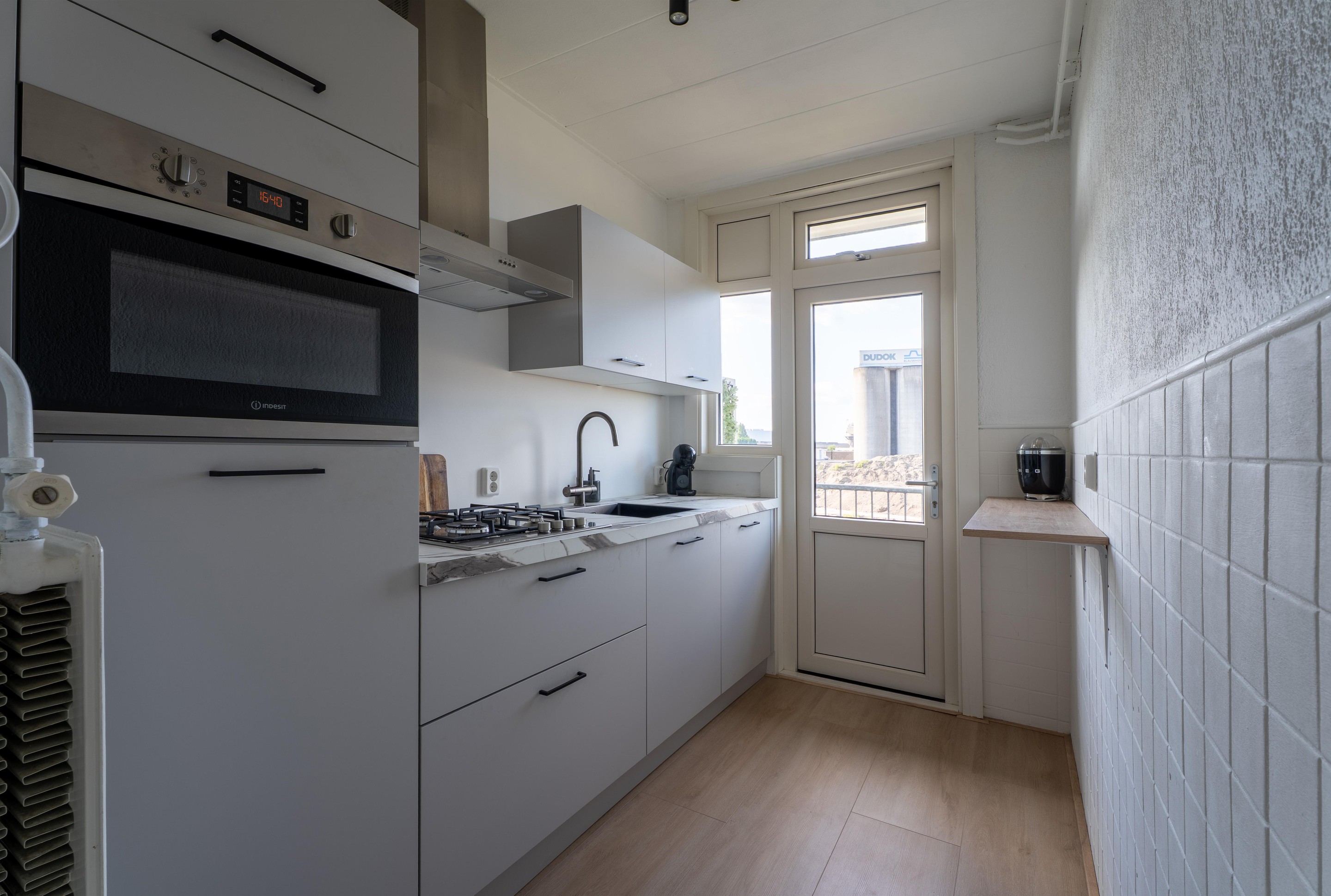 De moderne keuken (2023) is voorzien van diverse apparatuur zoals een 4 pits gasfornuis met afzuigkap, een combi oven, een koelkast, een vaatwasser en een kokend waterkraan. Ook via de keuken heb heb je toegang tot het balkon.