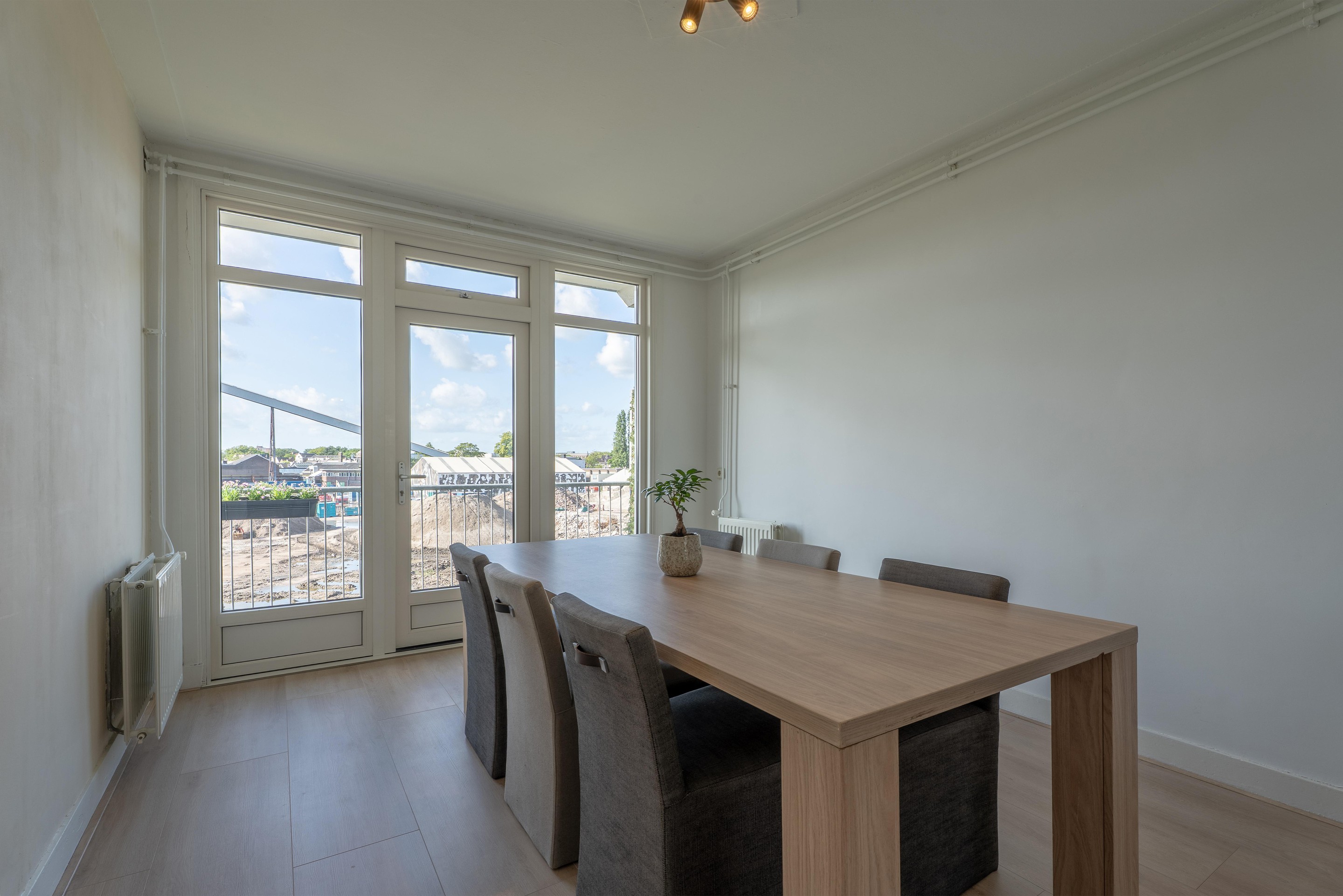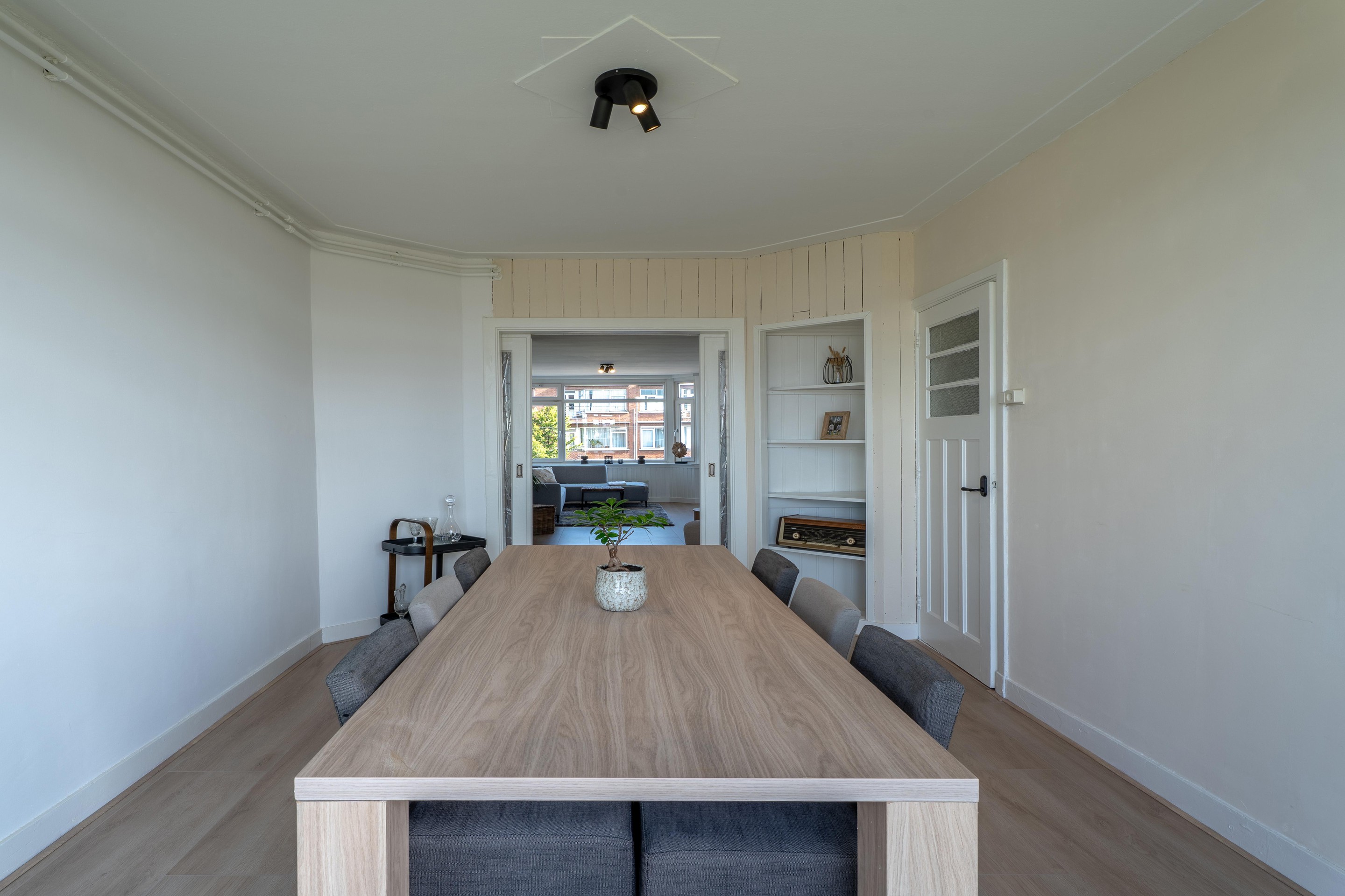 Aan de achterzijde bereik je via de originele paneeldeuren de eetkamer, welke ook gebruikt kan worden als slaapkamer. Via deze kamer heb je toegang tot het zonnige balkon waar je heerlijk kunt genieten van het buitenleven.
