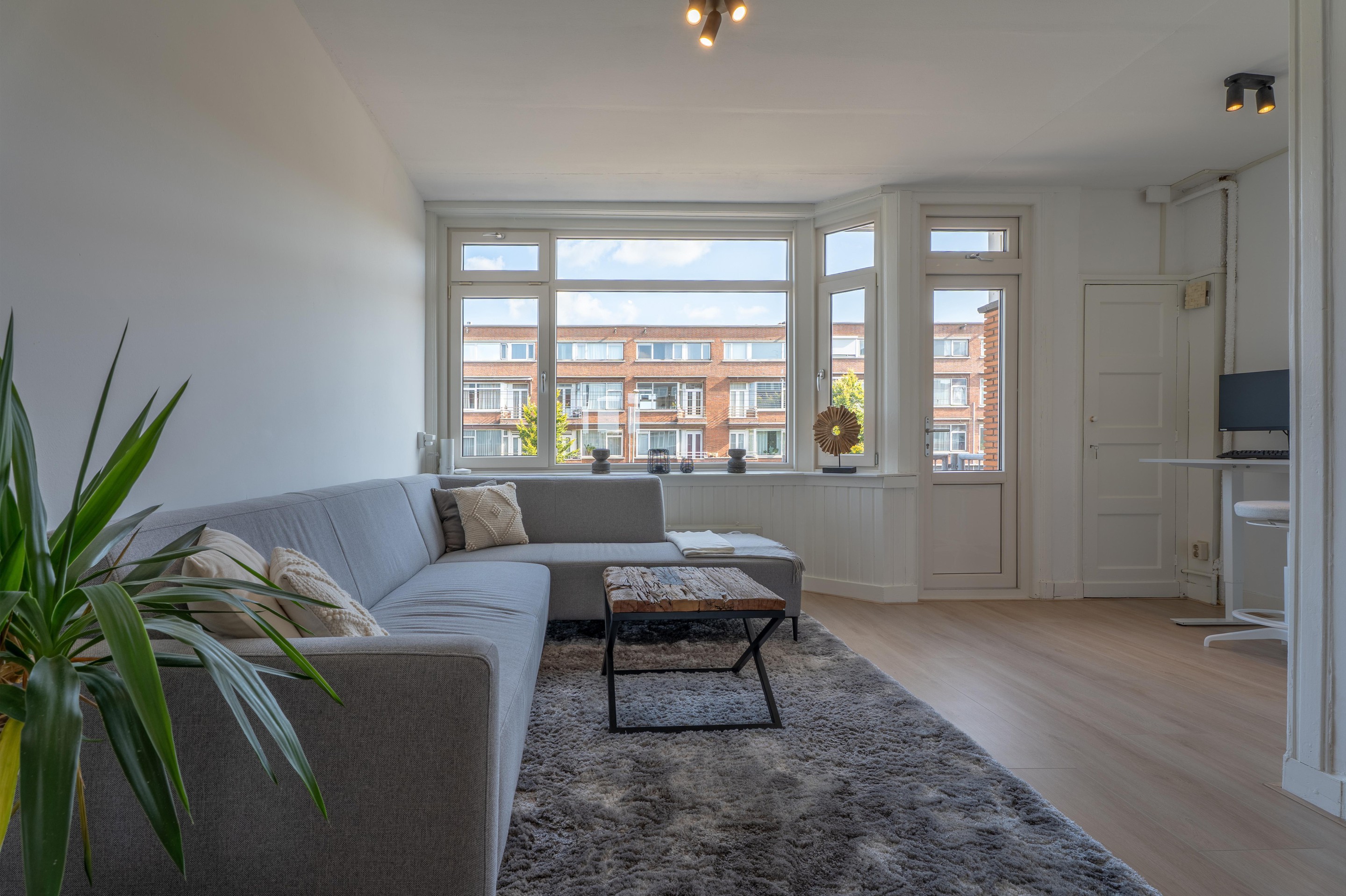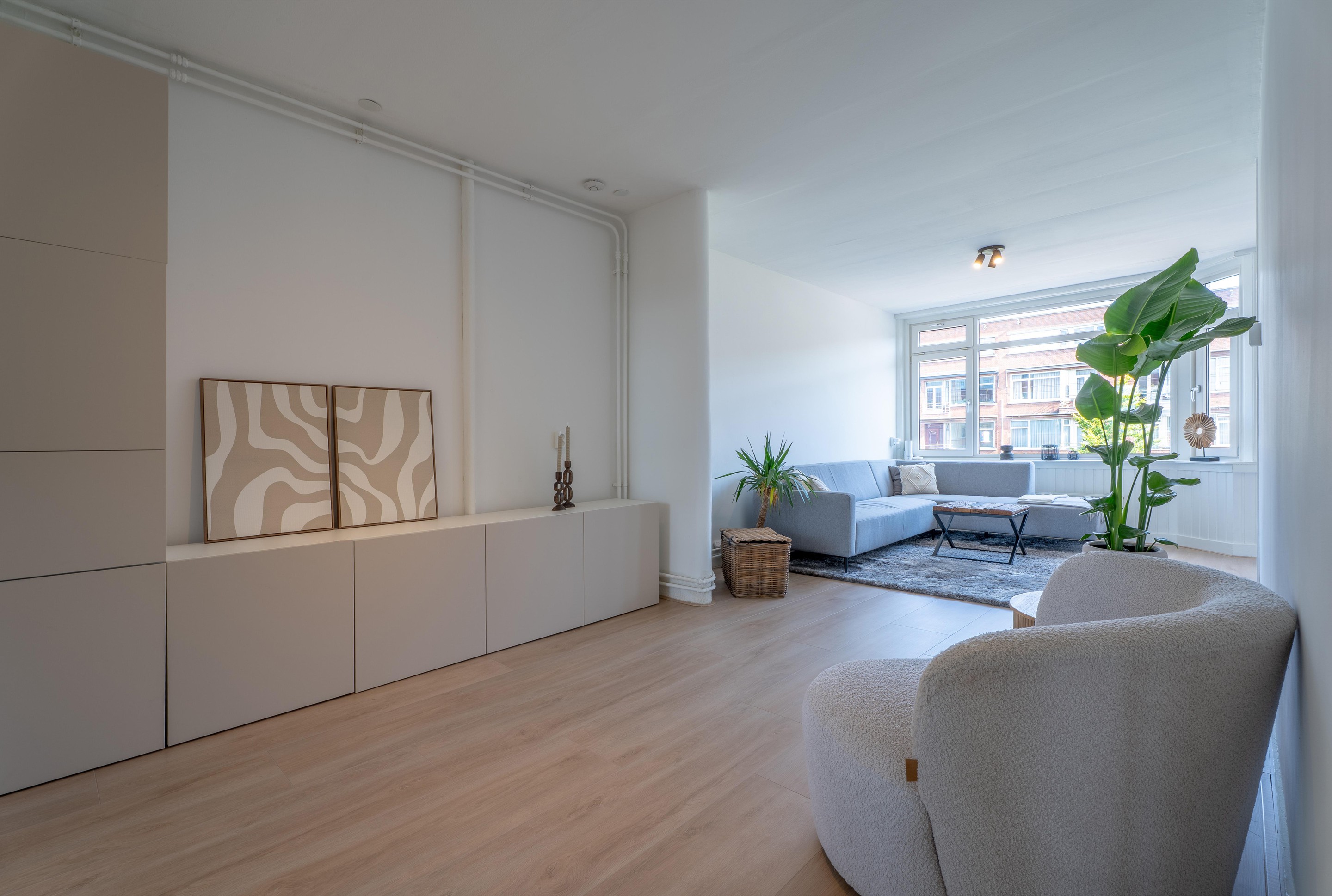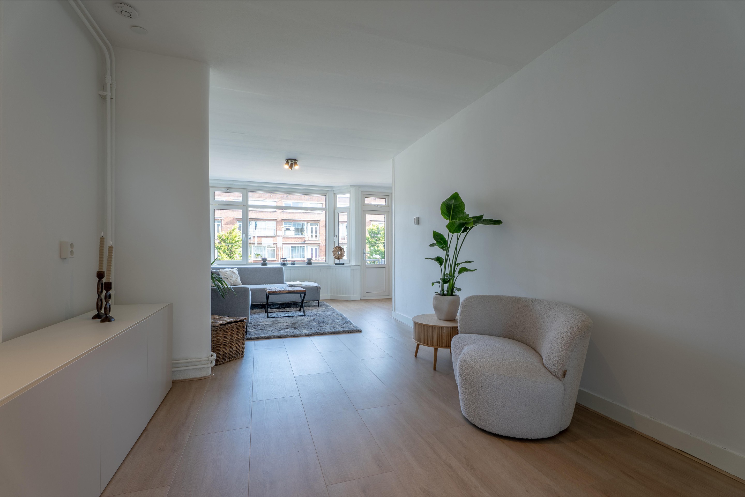 De woonkamer is verrassend ruim en licht met een hoog plafond en grote raampartijen. De vloer is voorzien van een lichte laminaat vloer (2025) en de wanden zijn voorzien van stucwerk. Via de woonkamer bereik je een klein balkon met een levendig zicht op de Rotterdamsedijk.