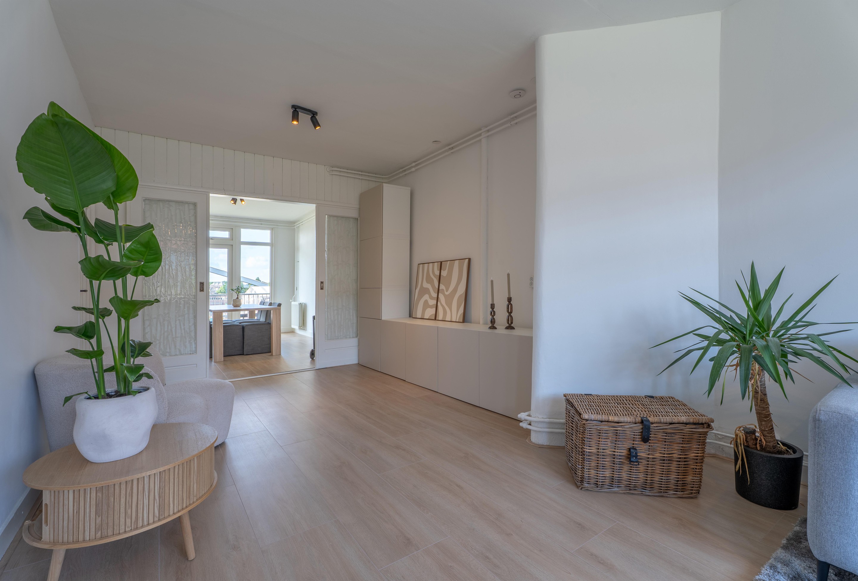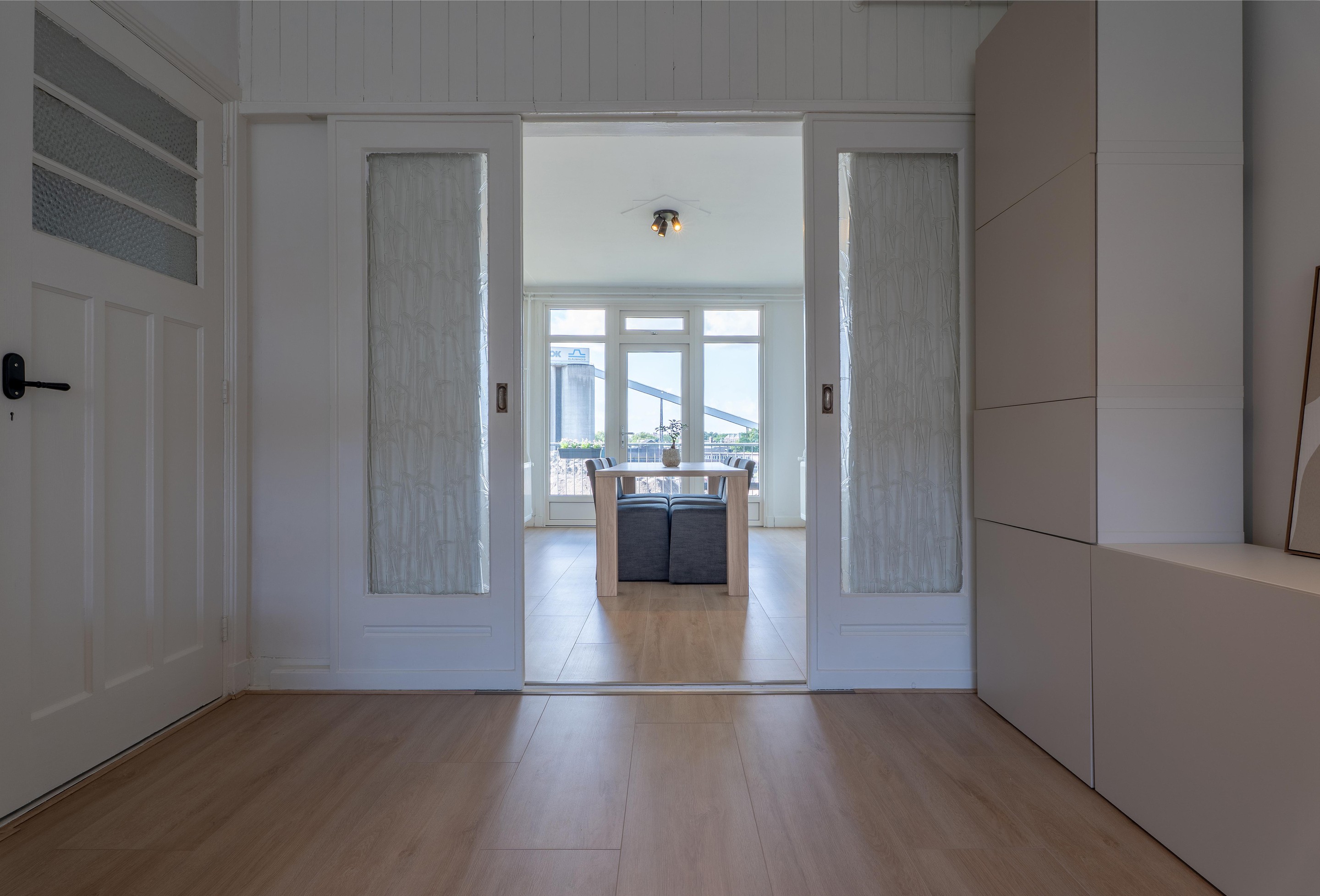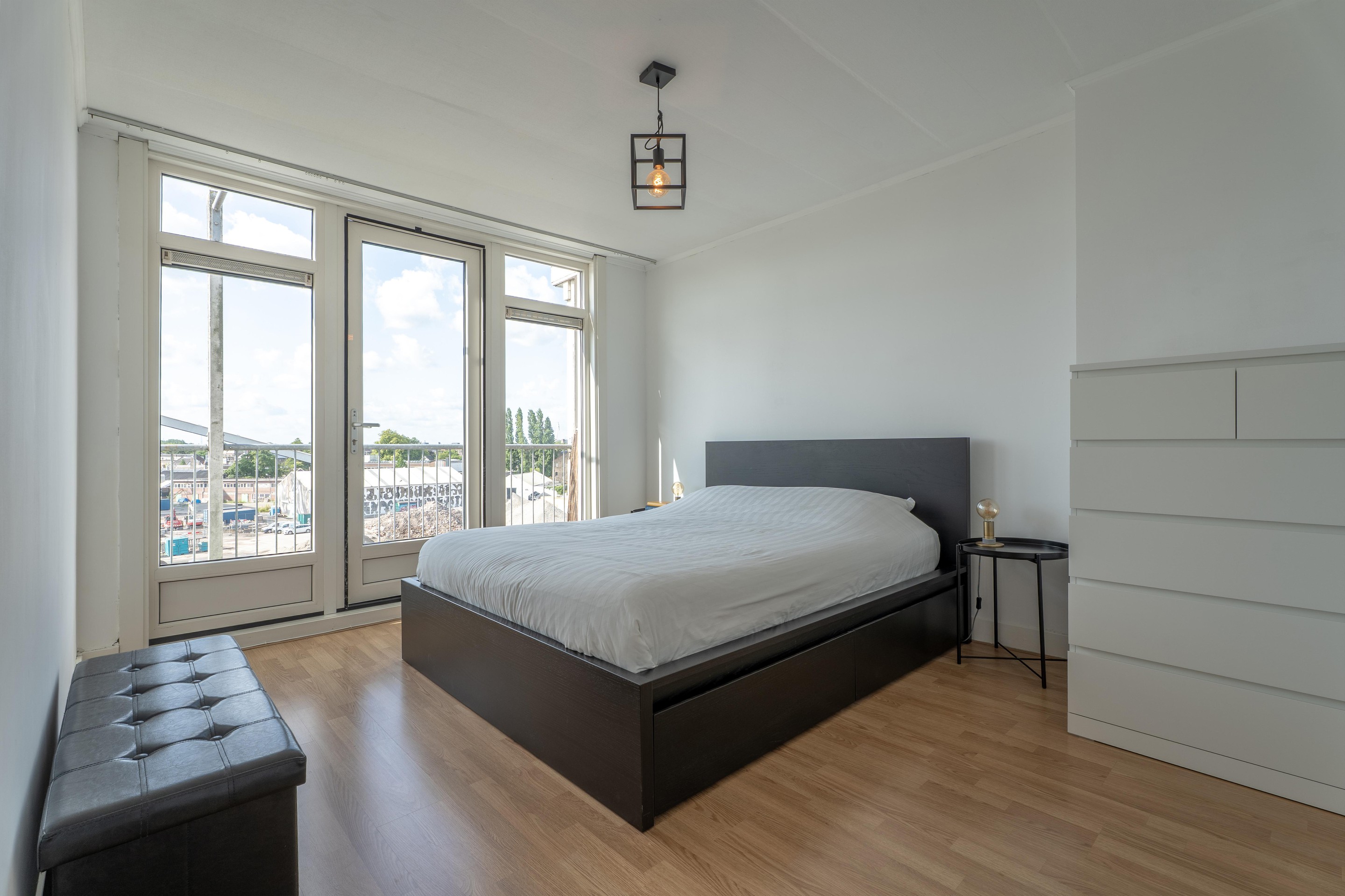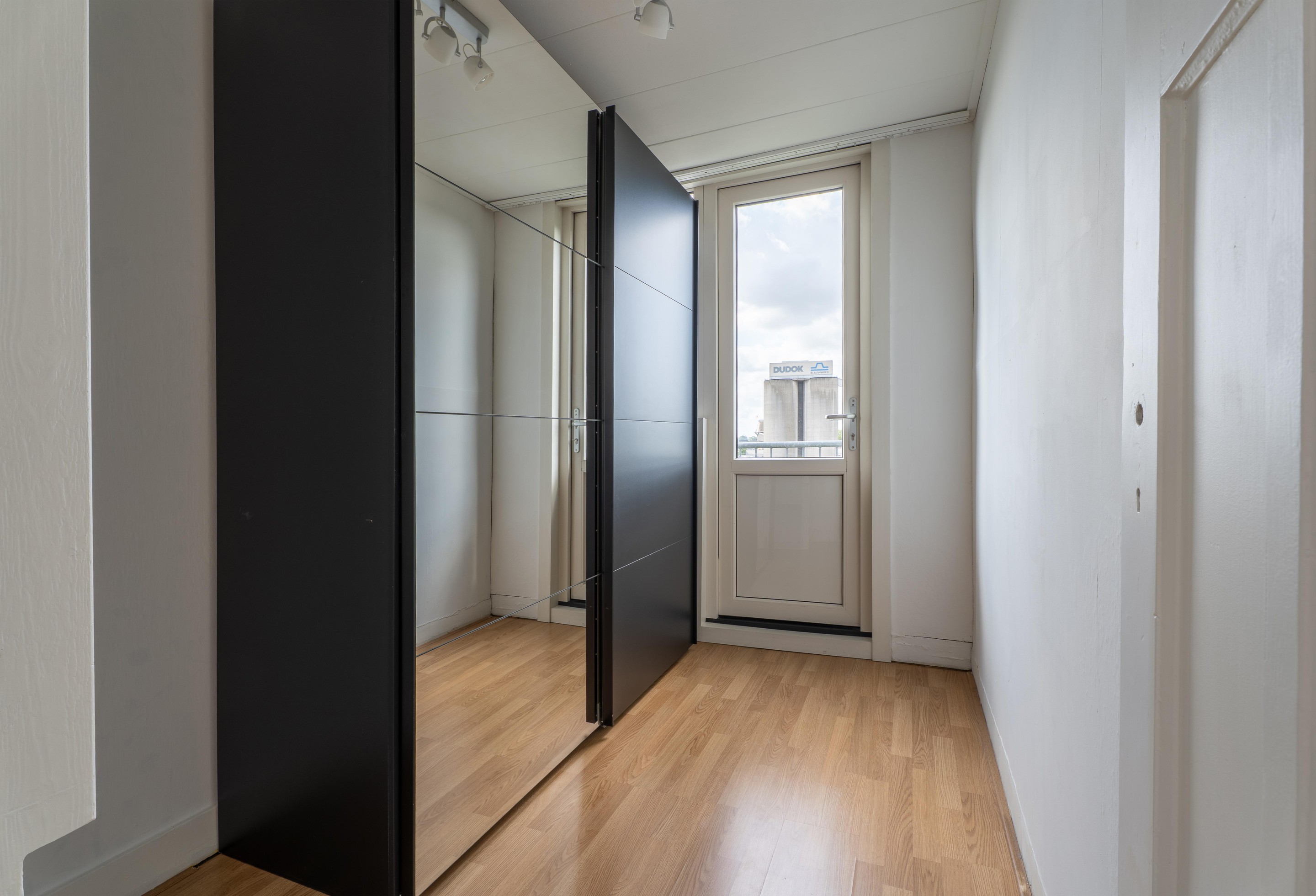 De woonkamer is verrassend ruim en licht met een hoog plafond en grote raampartijen. De vloer is voorzien van een lichte laminaat vloer (2025) en de wanden zijn voorzien van stucwerk. Via de woonkamer bereik je een klein balkon met een levendig zicht op de Rotterdamsedijk.