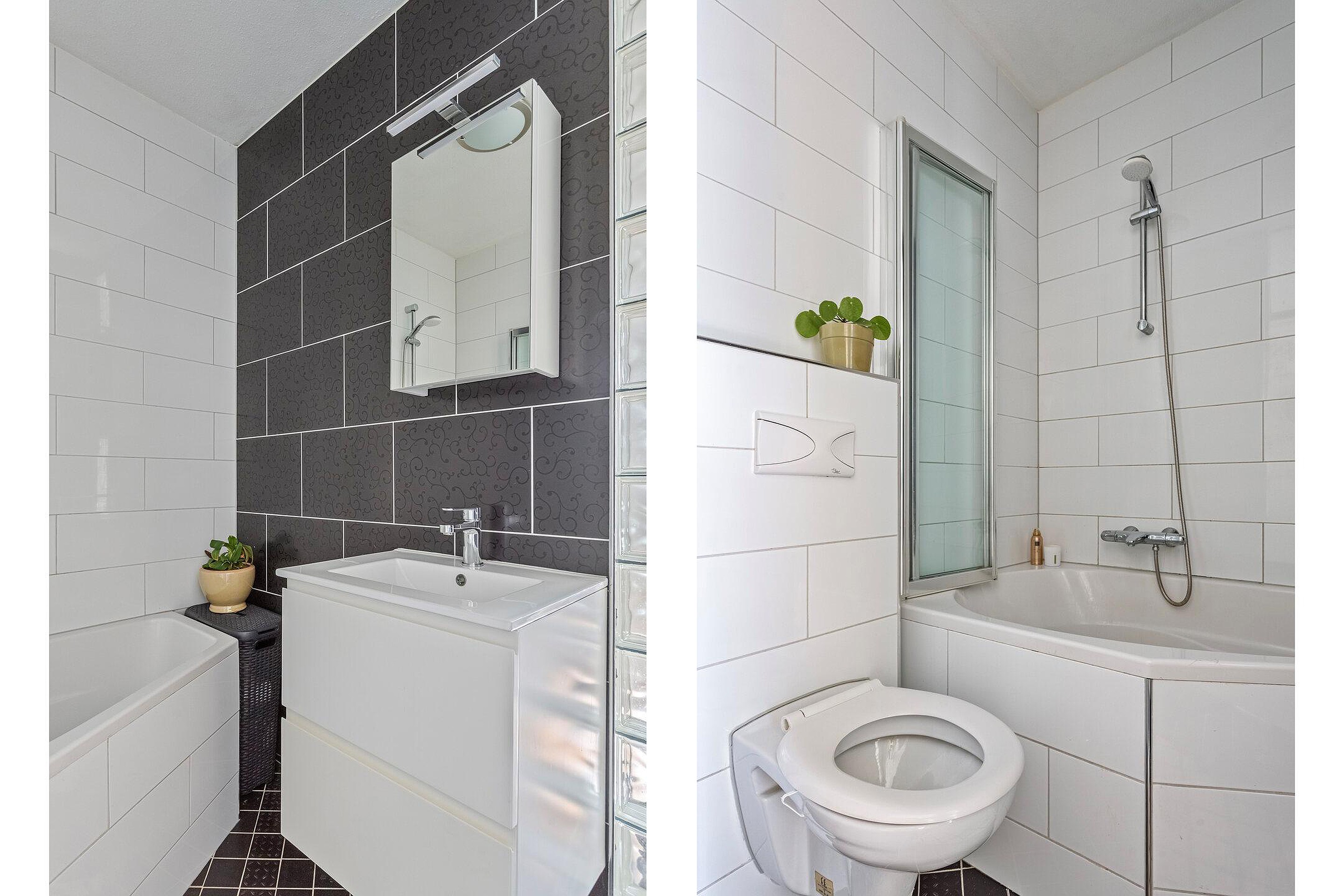 Overloop met toegang tot twee slaapkamers en de badkamer, uitgevoerd met een ligbad-/douchecombinatie, tweede toilet, wastafelmeubel en radiator.