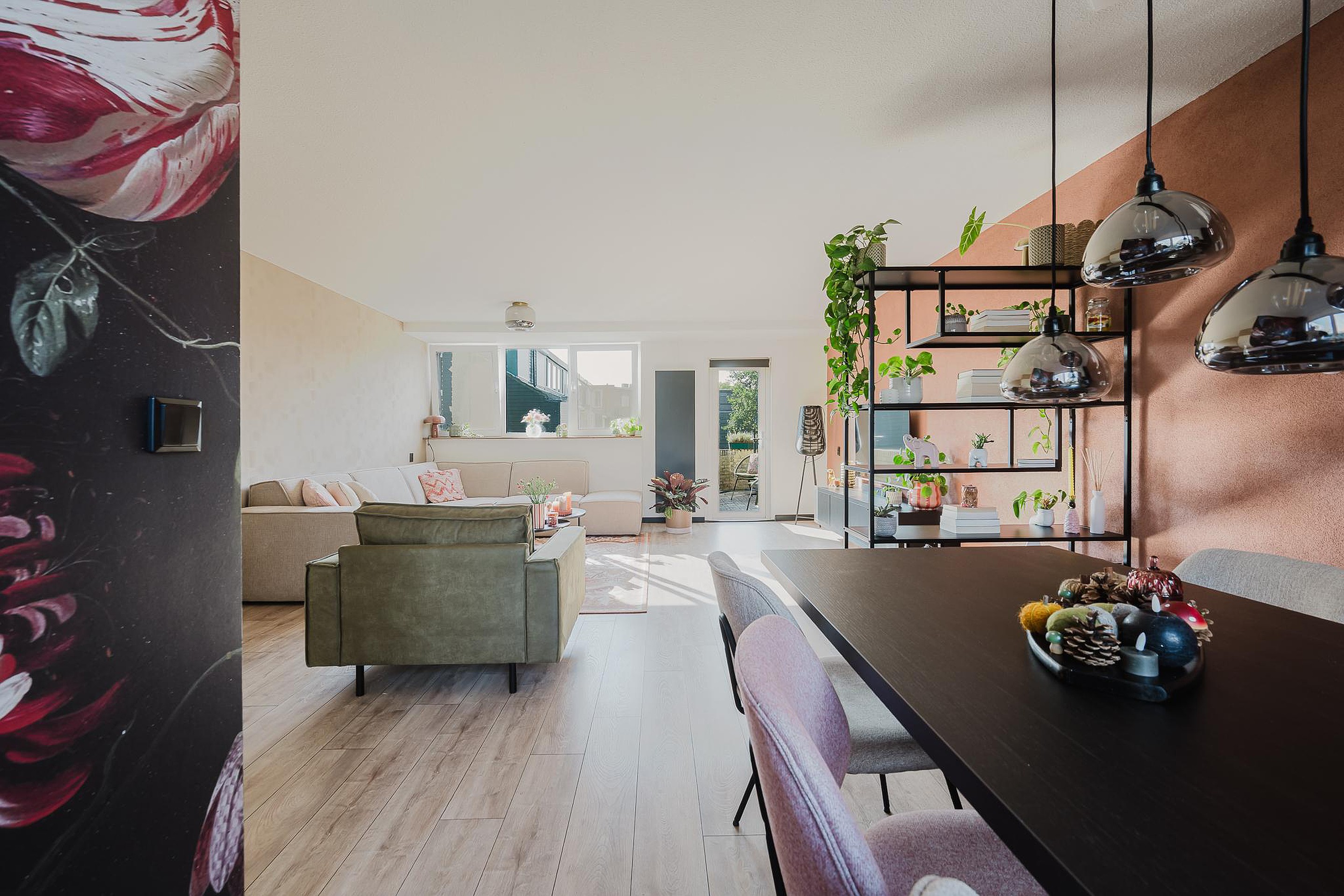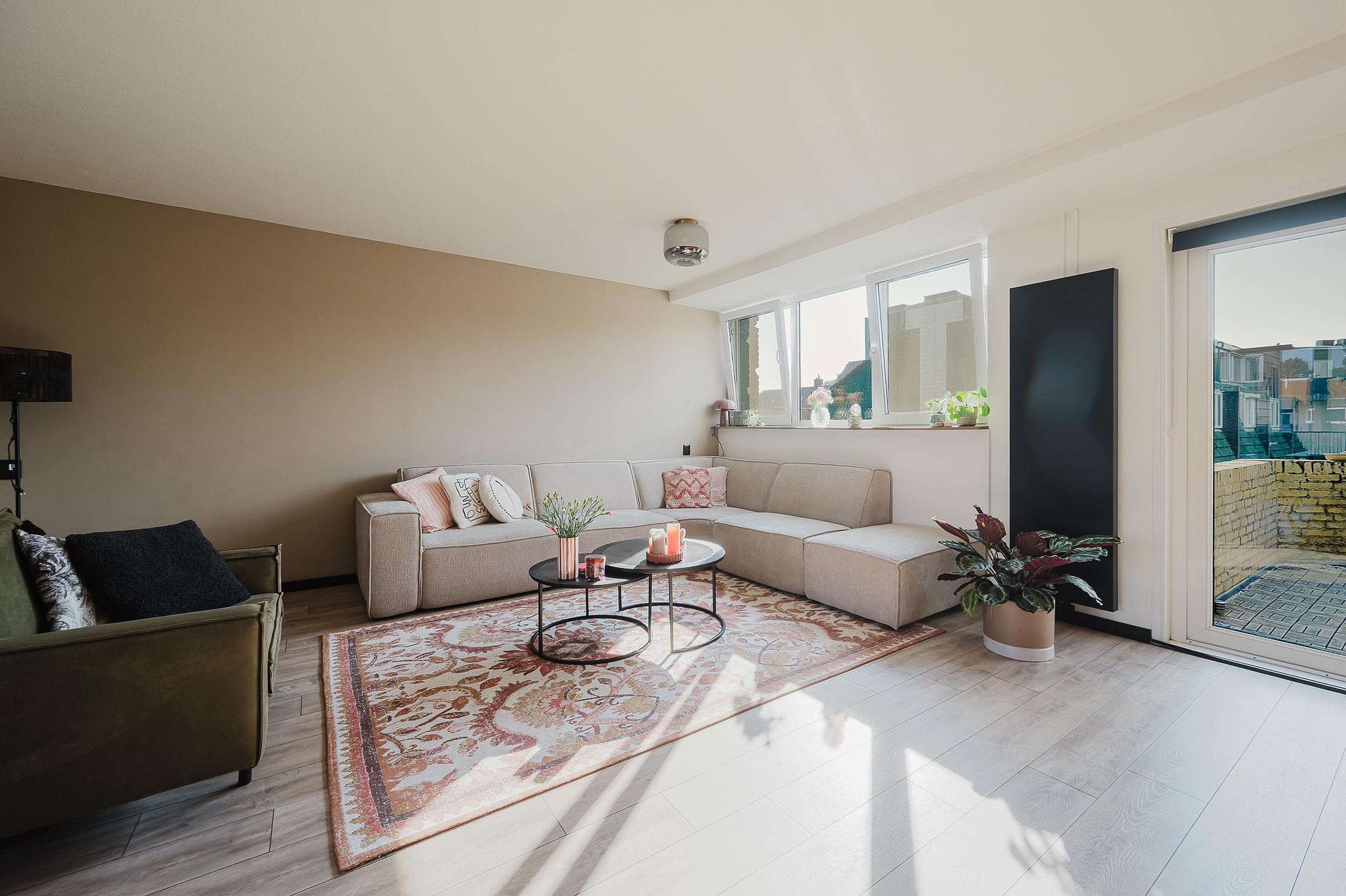 De doorzonwoonkamer bevindt zich aan de achterzijde en is ruim en licht dankzij de grote raampartijen. Vanuit de woonkamer stap je zo het zonnige balkon op, waar je de hele dag door kunt genieten.