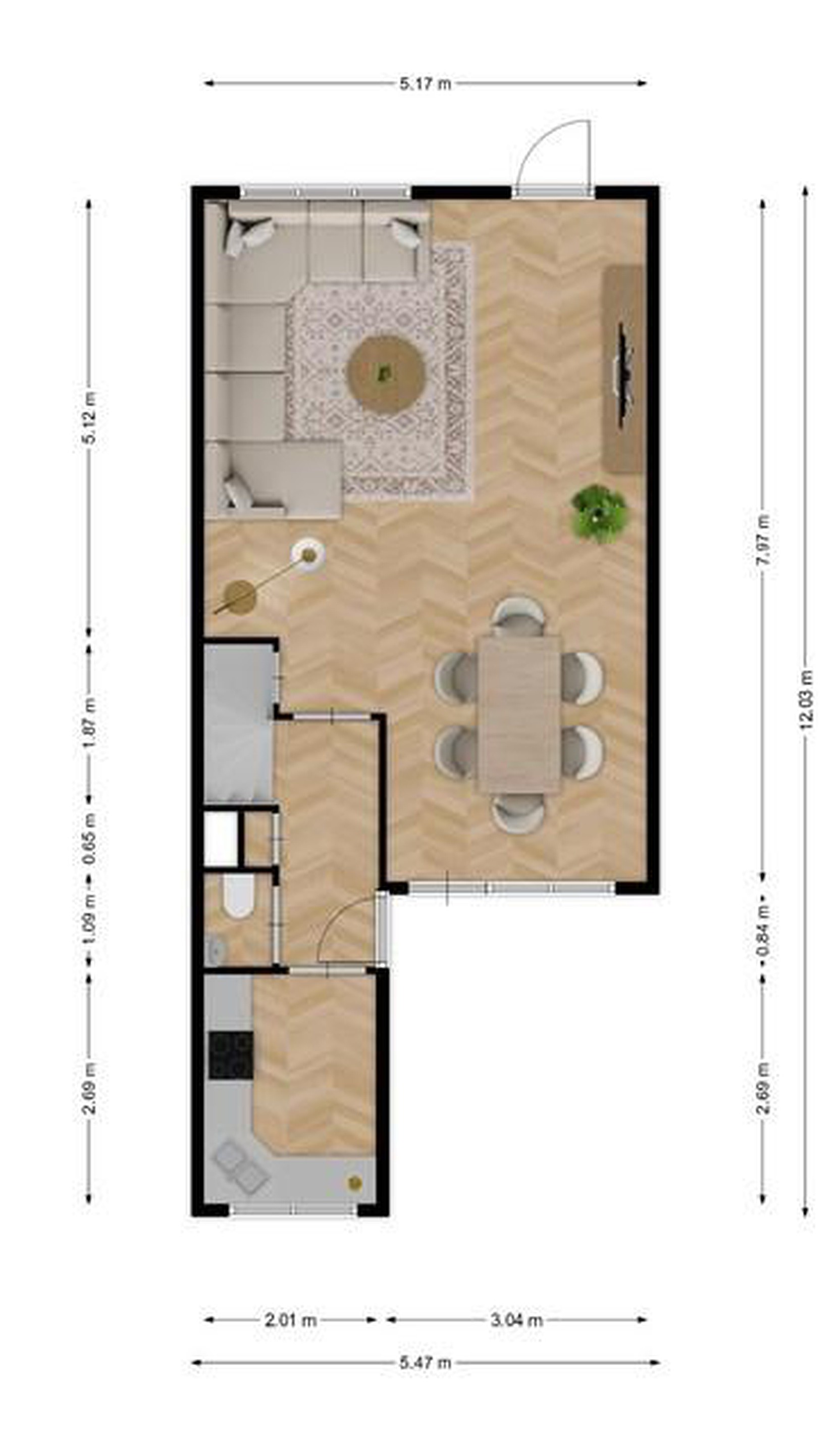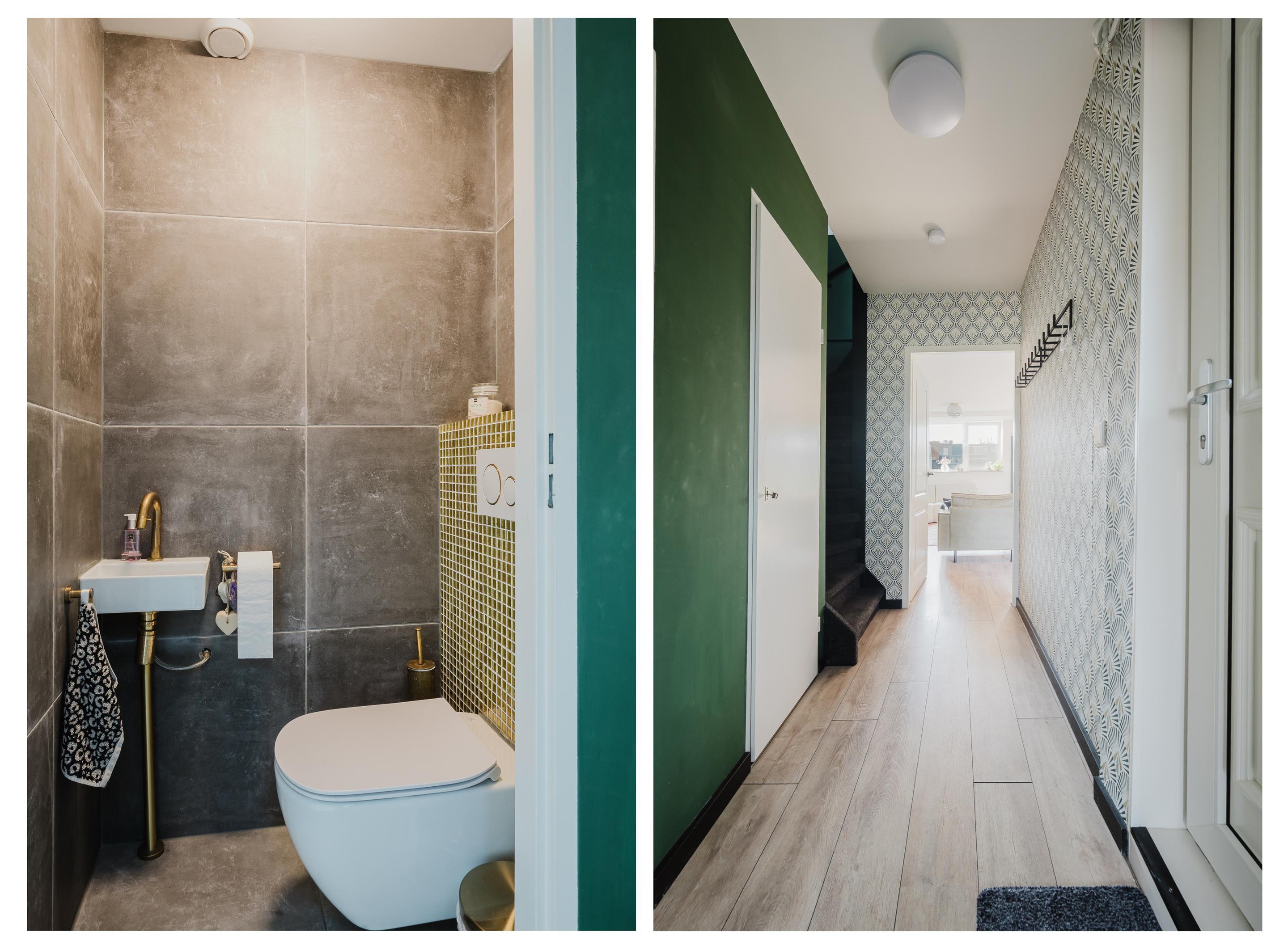 De hal biedt toegang tot de moderne keuken aan de voorzijde, uitgevoerd in 2023 en voorzien van alle gemakken: een inductiekookplaat, combimagnetron, vaatwasser en koel-vriescombinatie. In de hal vind je verder een trapkast, de meterkast en een modern toilet (2022) met automatische verlichting.