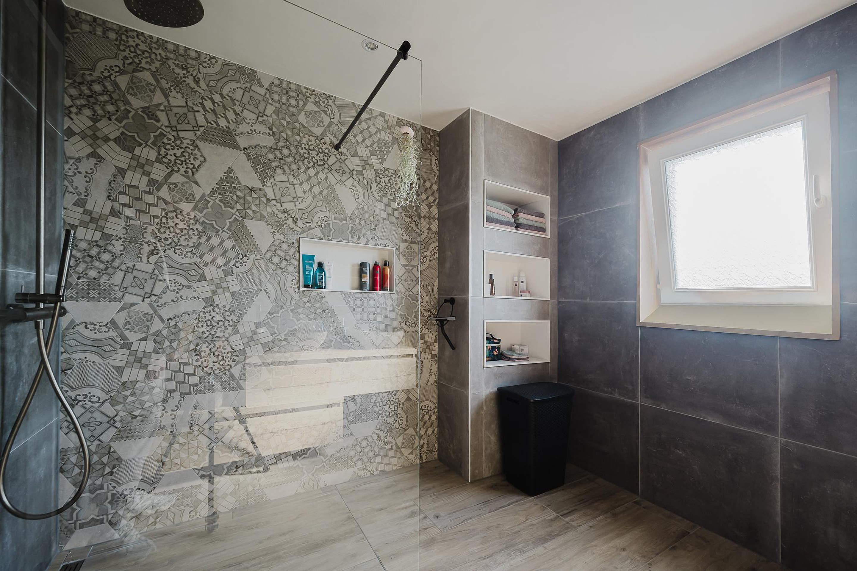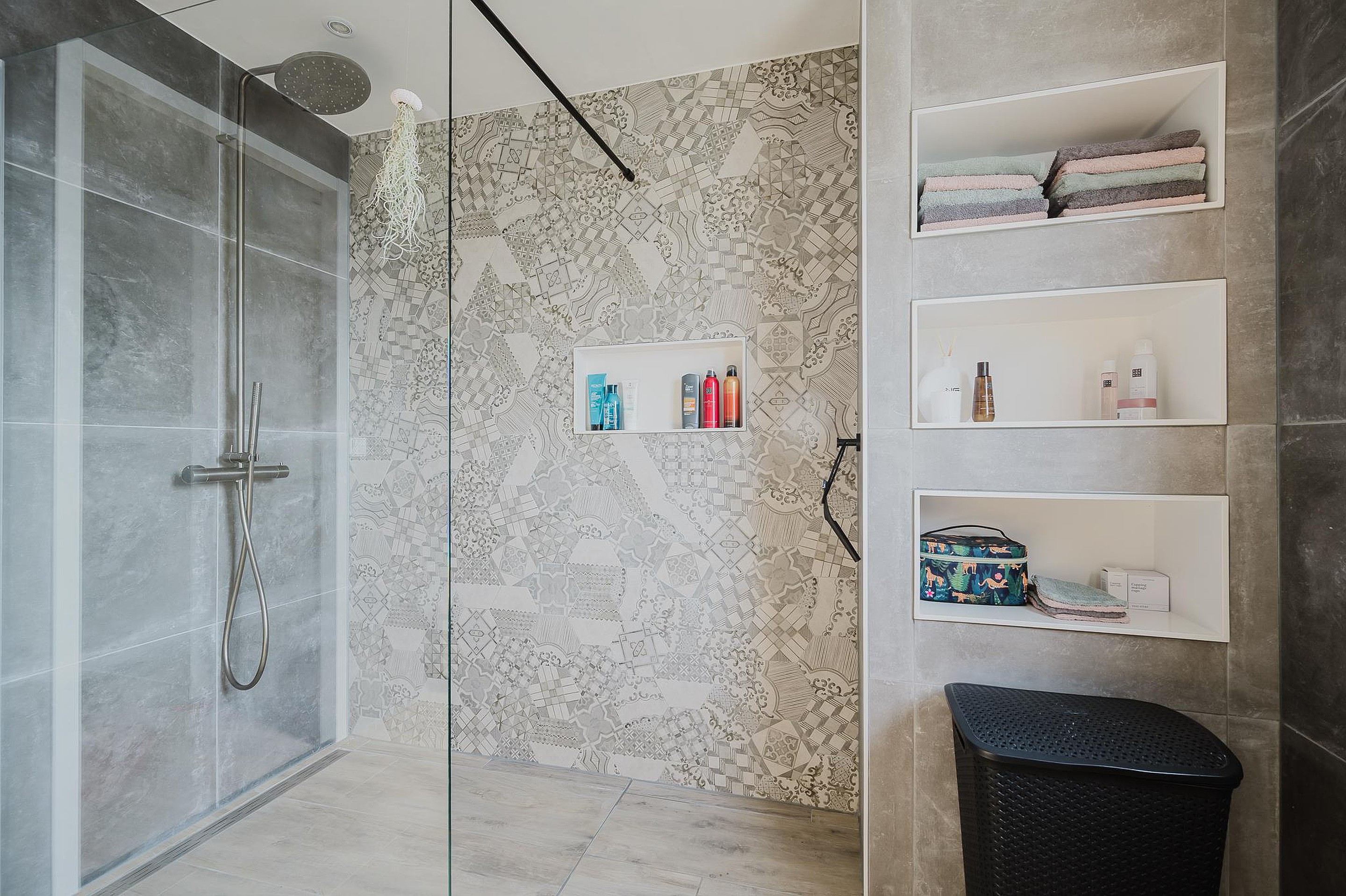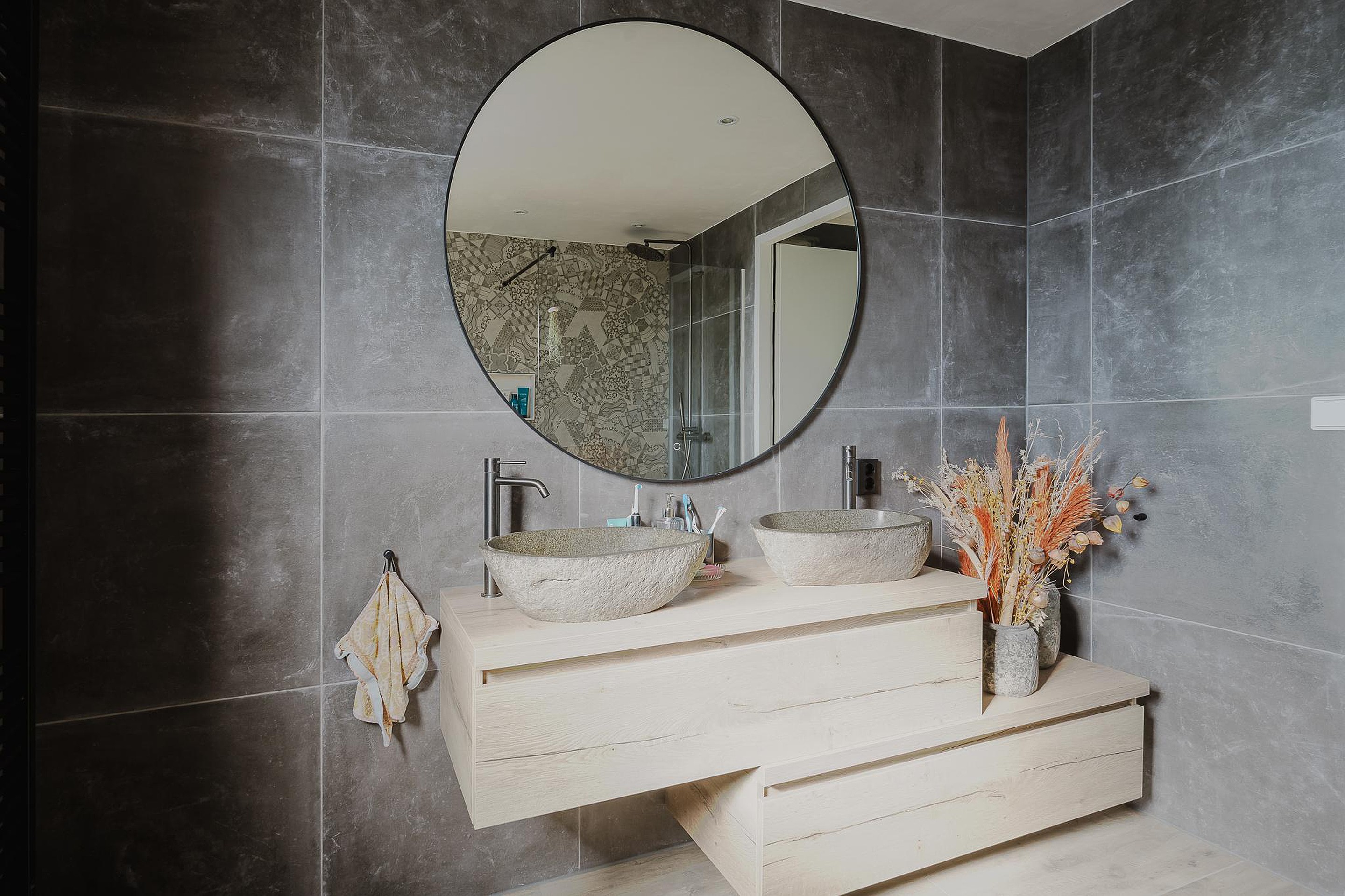 De ontzettend ruime badkamer (2022) is modern en strak afgewerkt, met een dubbele wastafel met meubel, een grote inloopdouche en inbouwspots in het plafond.