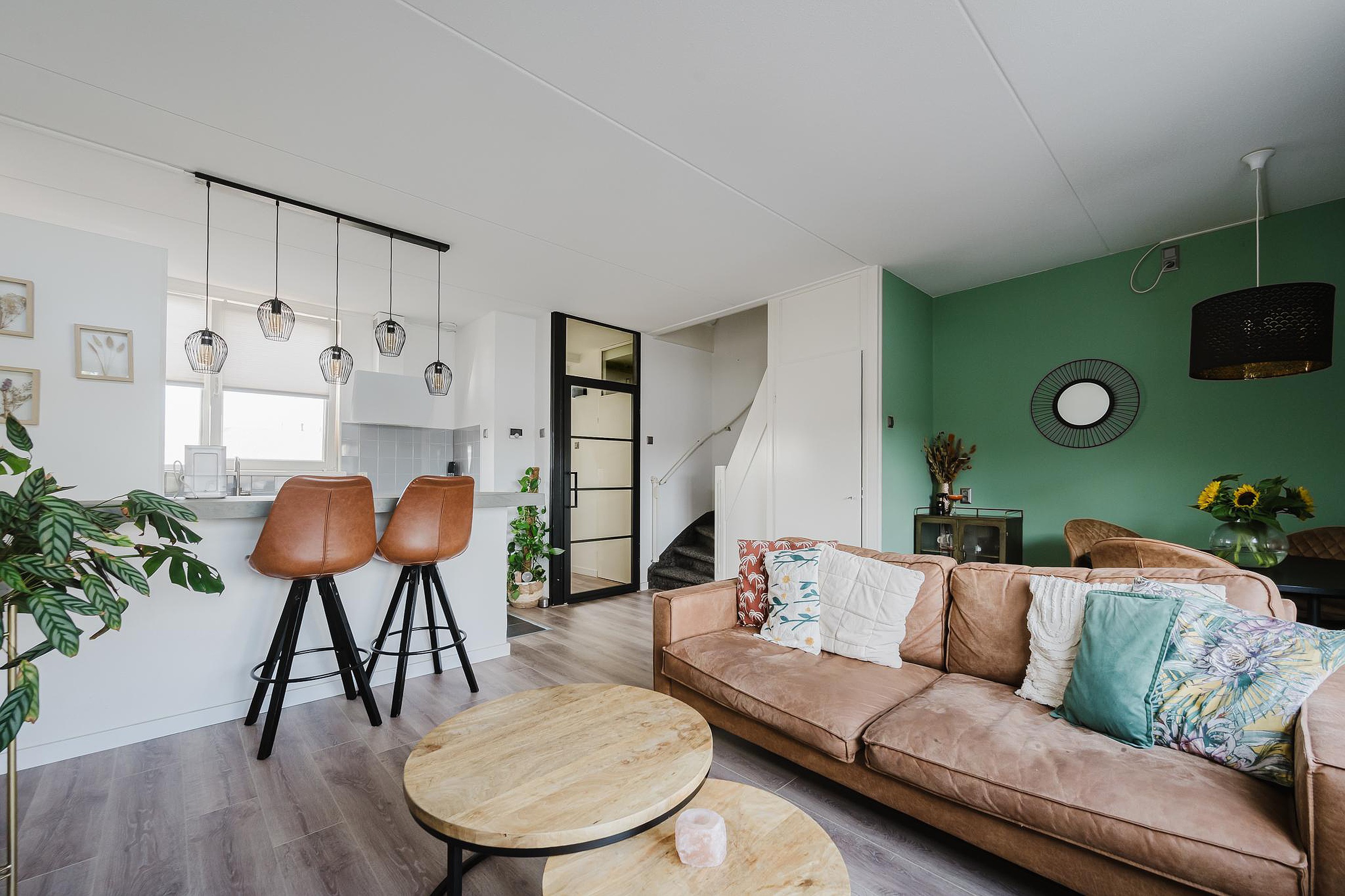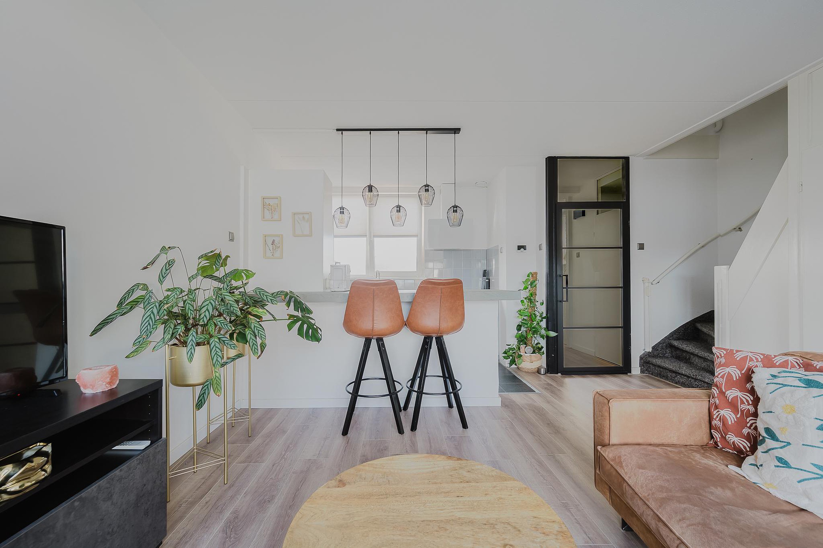 De gezellige en lichte woonkamer is voorzien van een nieuwe binnendeur, een laminaatvloer en een strakke wandafwerking.