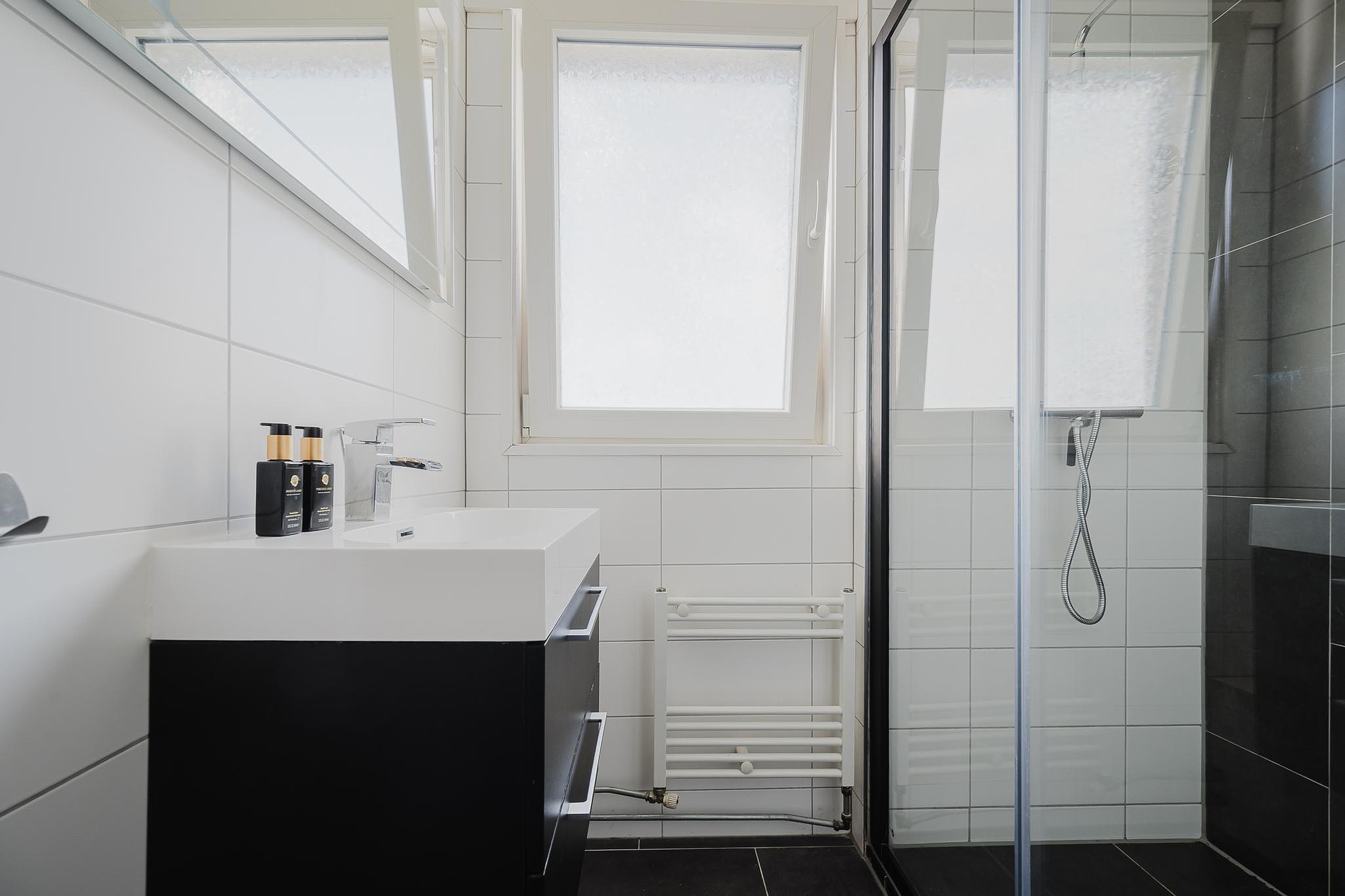 De badkamer is in 2022 deels gerenoveerd en is voorzien van een ruime inloopdouche, een wastafel- met meubel en een spiegel met verlichting.