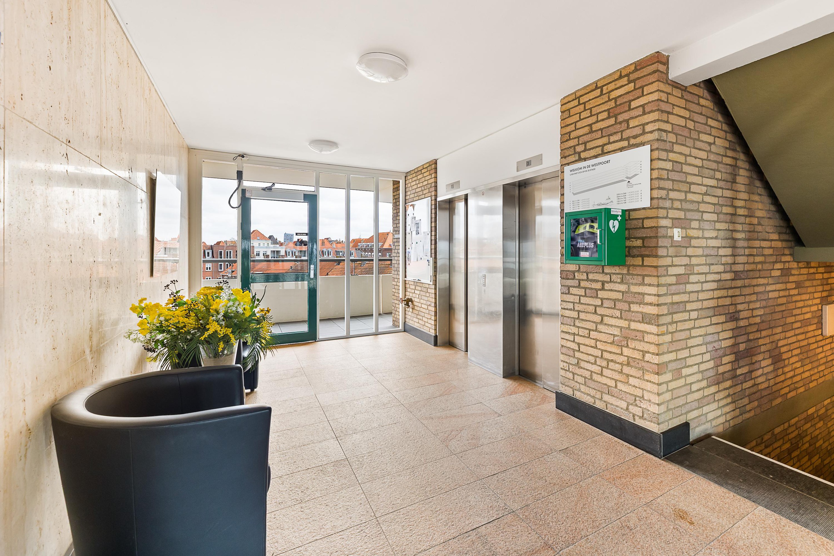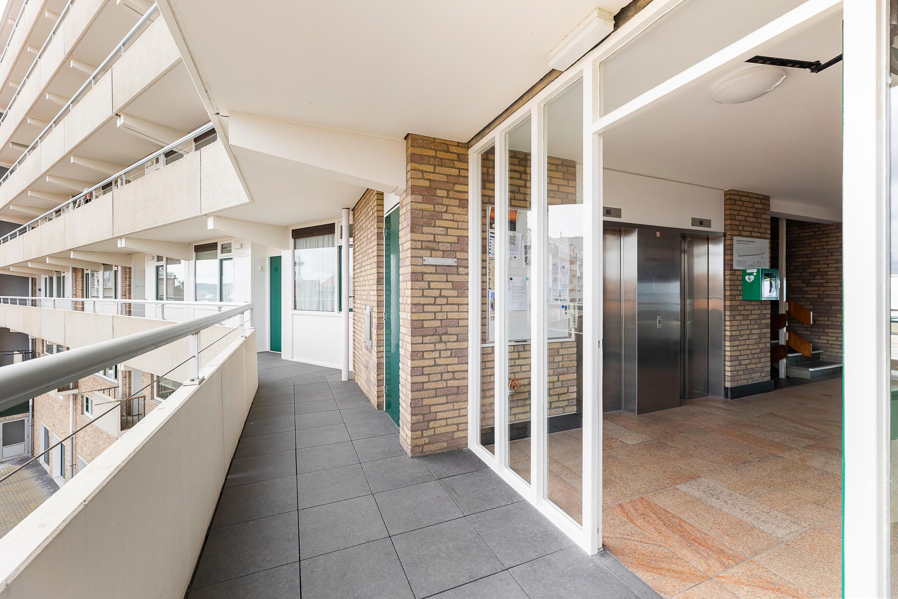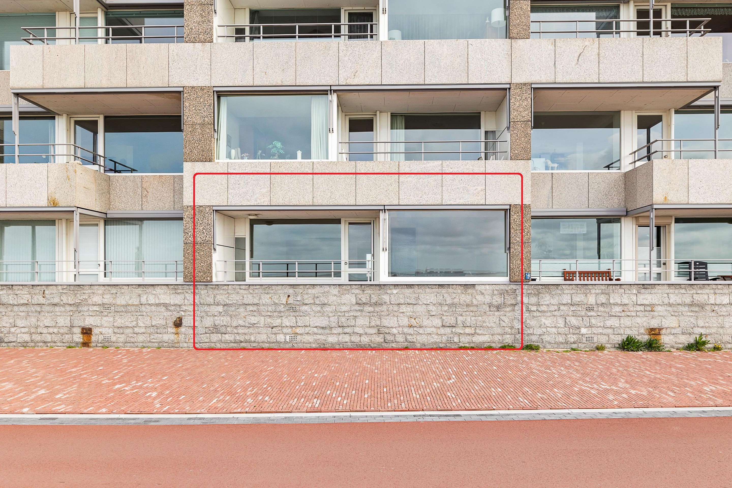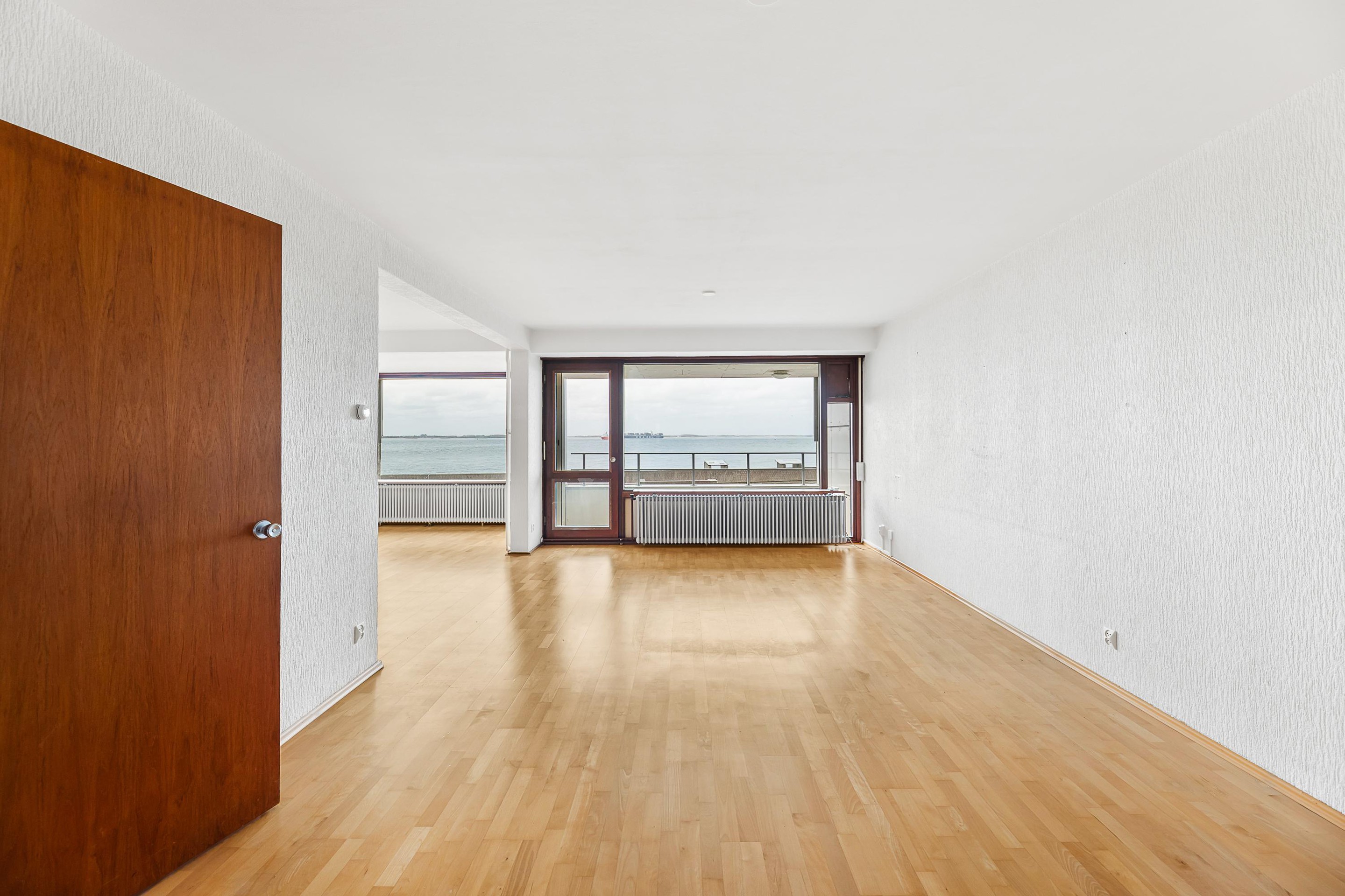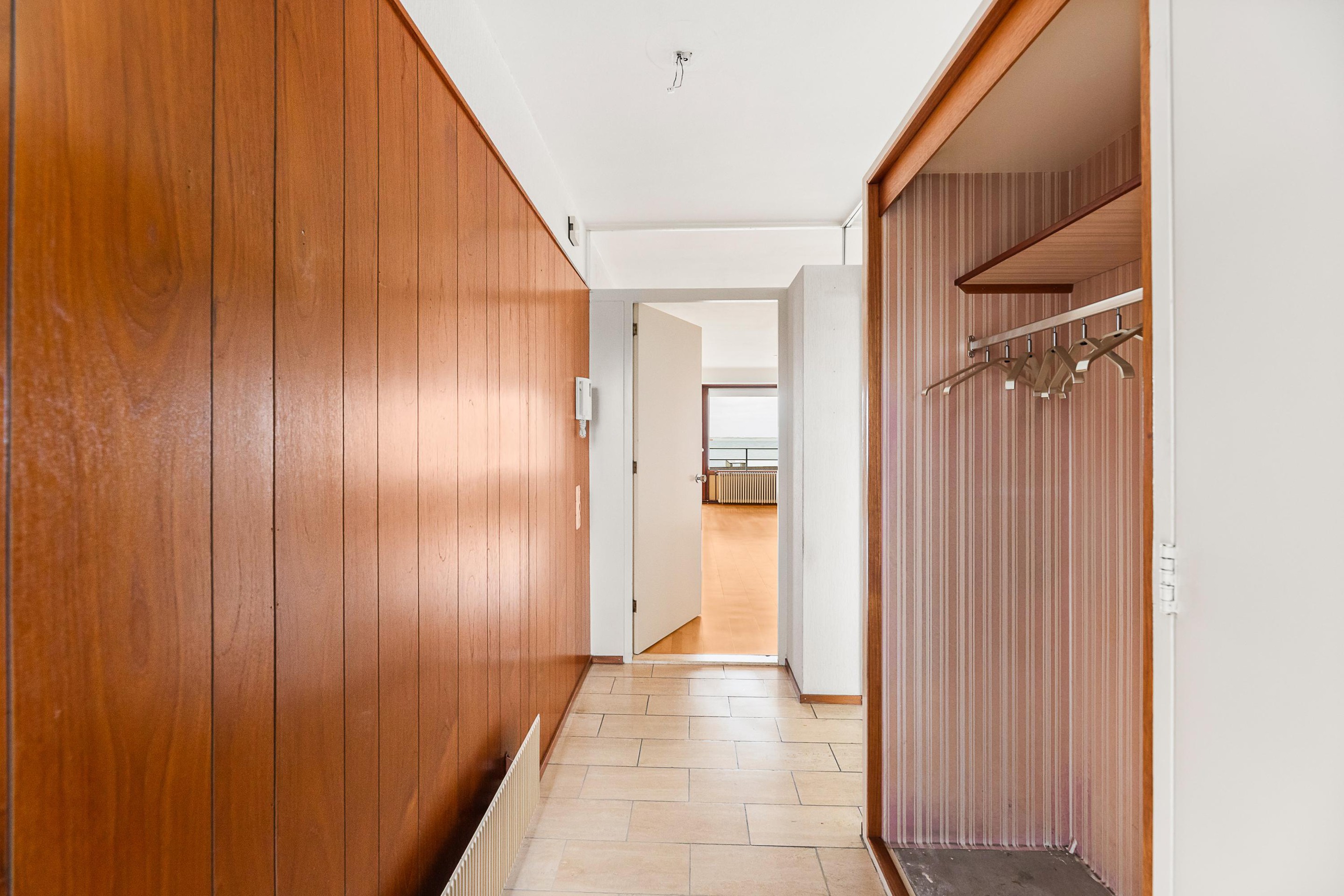 Entree van het appartement, hal met de kast met opstelling van de c.v.-combiketel. Dit appartement is voorzien van een royale woonkamer. Het magnifieke uitzicht vanuit de woonkamer reikt tot aan de Zeeuws Vlaamse kust. Er is een prettig overdekt balkon. De keuken is eenvoudig uitgevoerd. De tweede hal biedt ruimte aan een slaap- of werkkamer aan de koele achterzijde en het toilet.