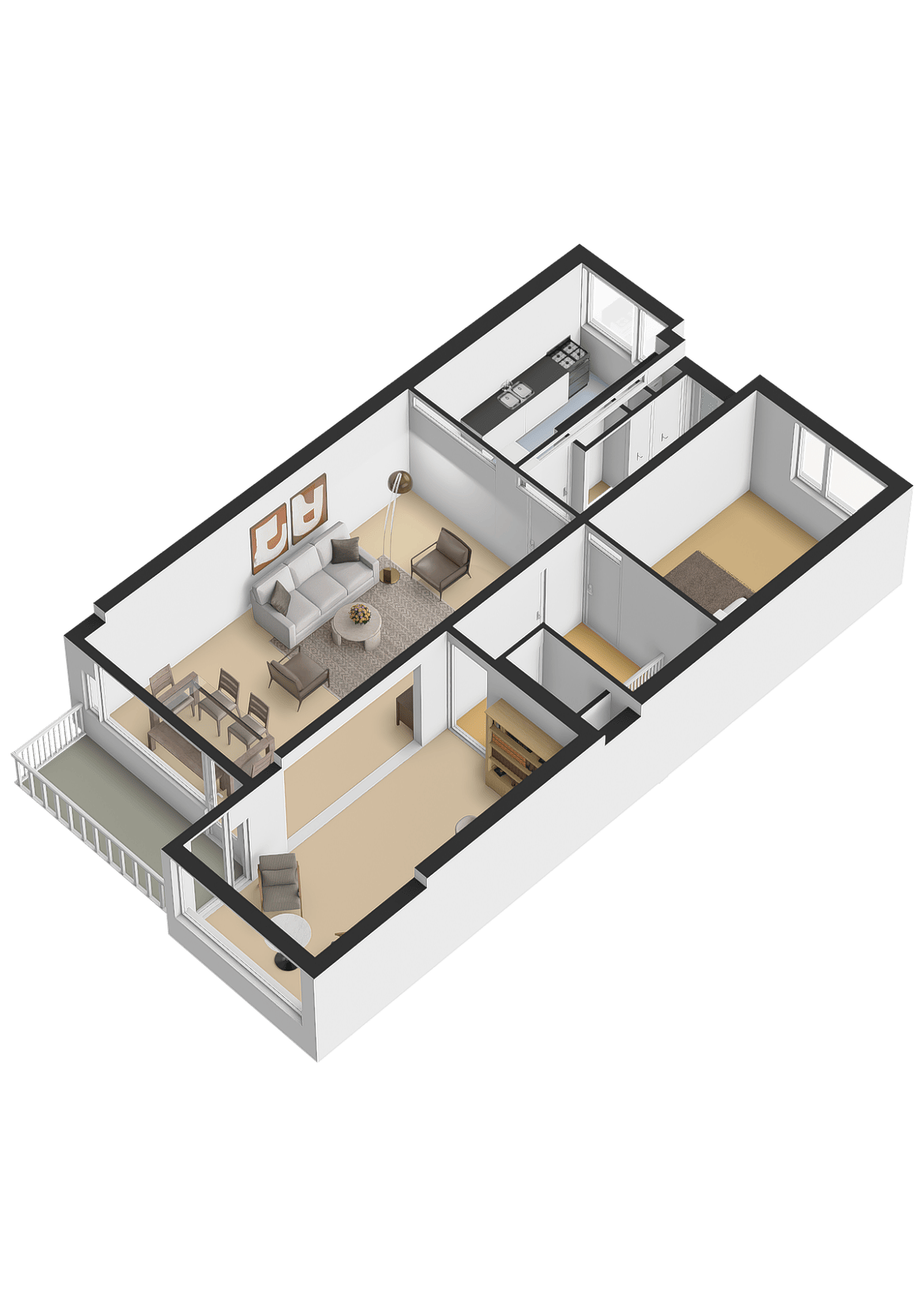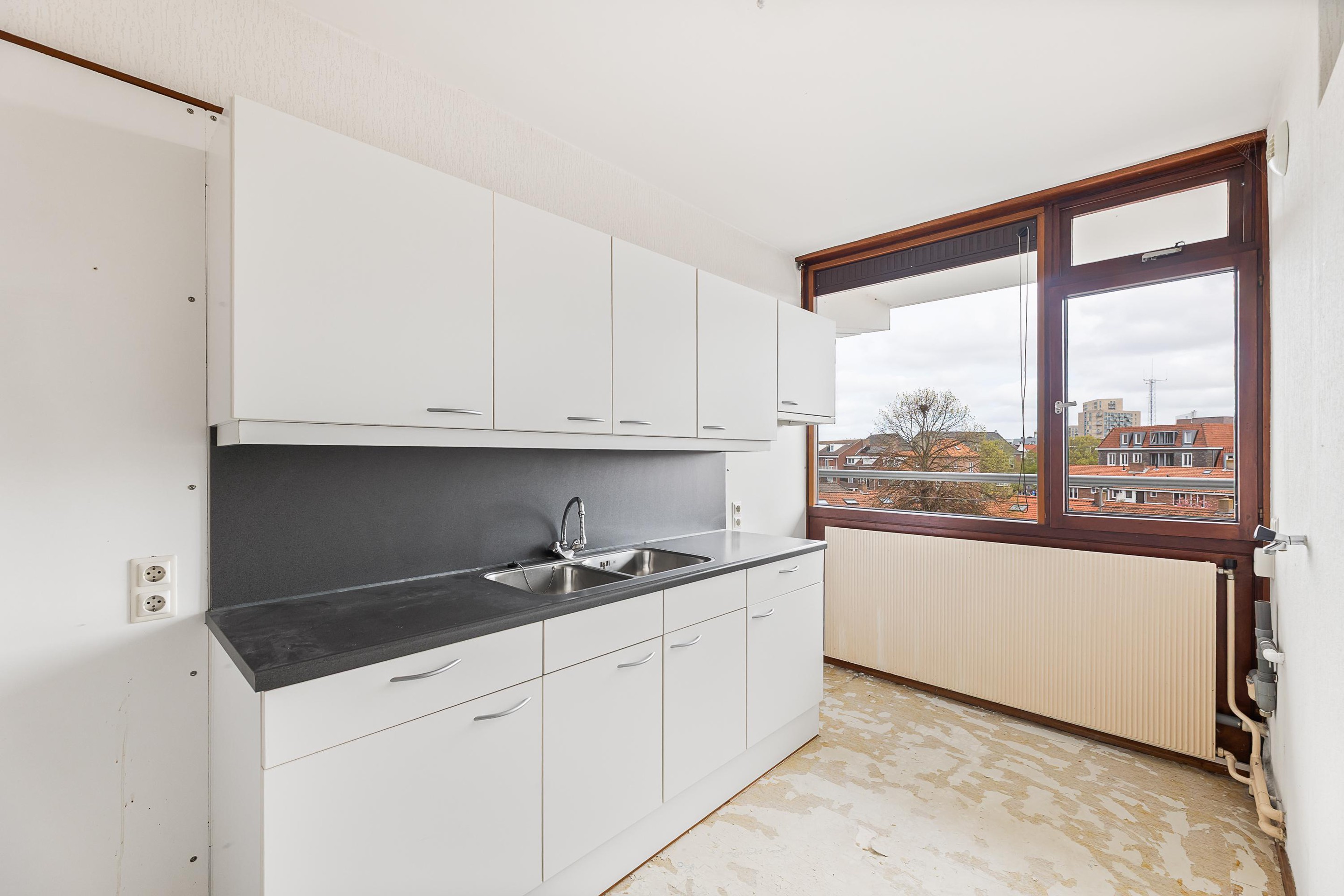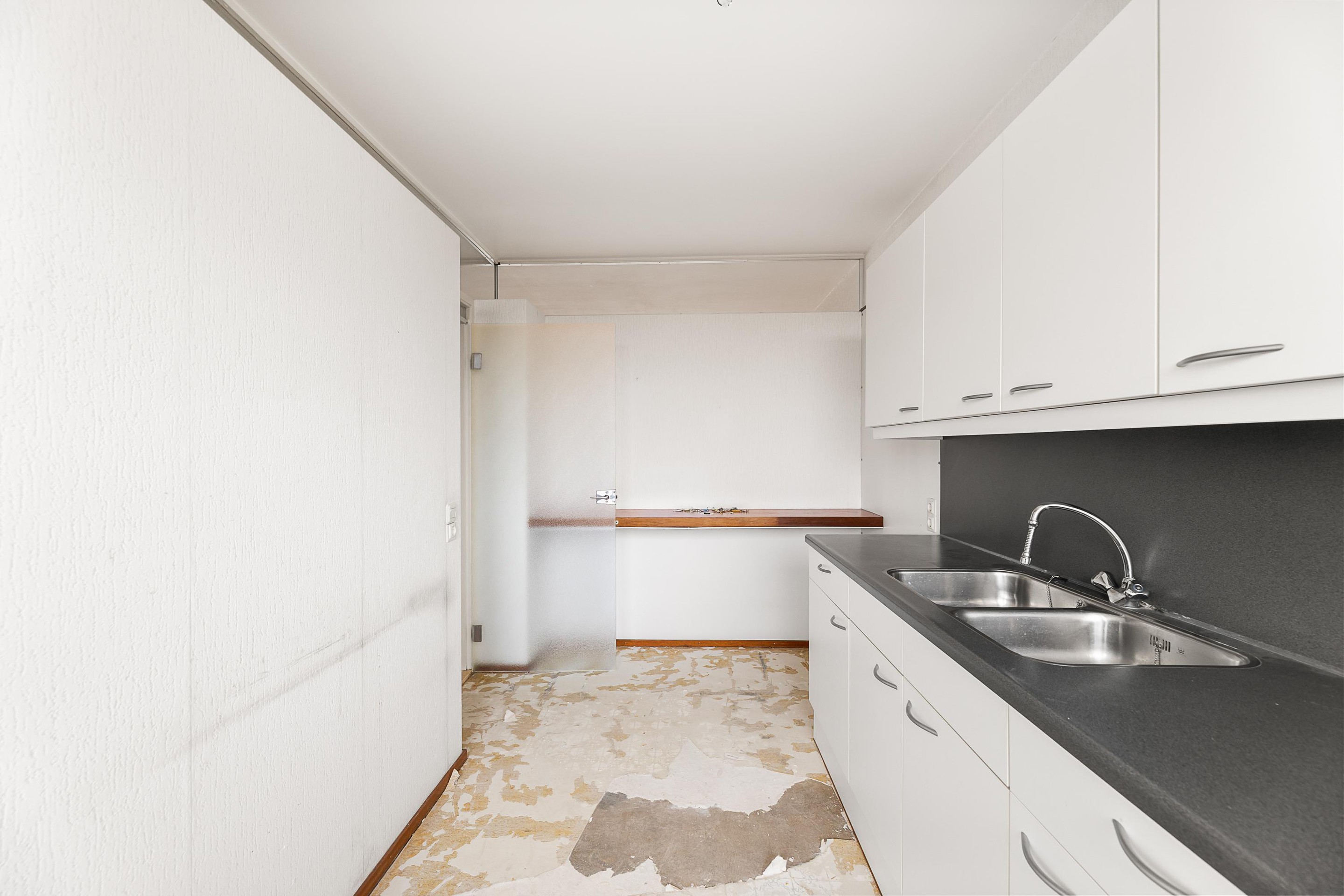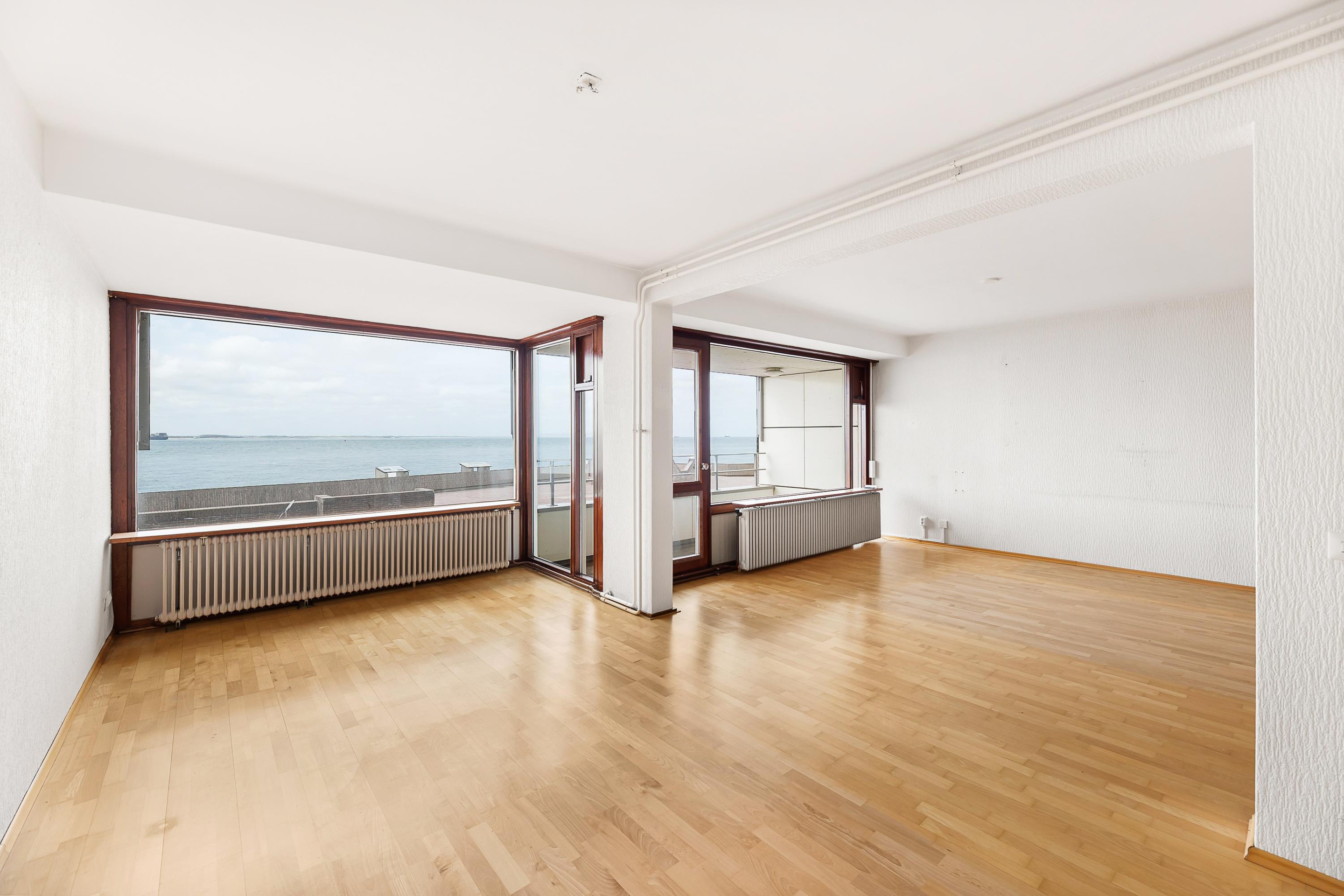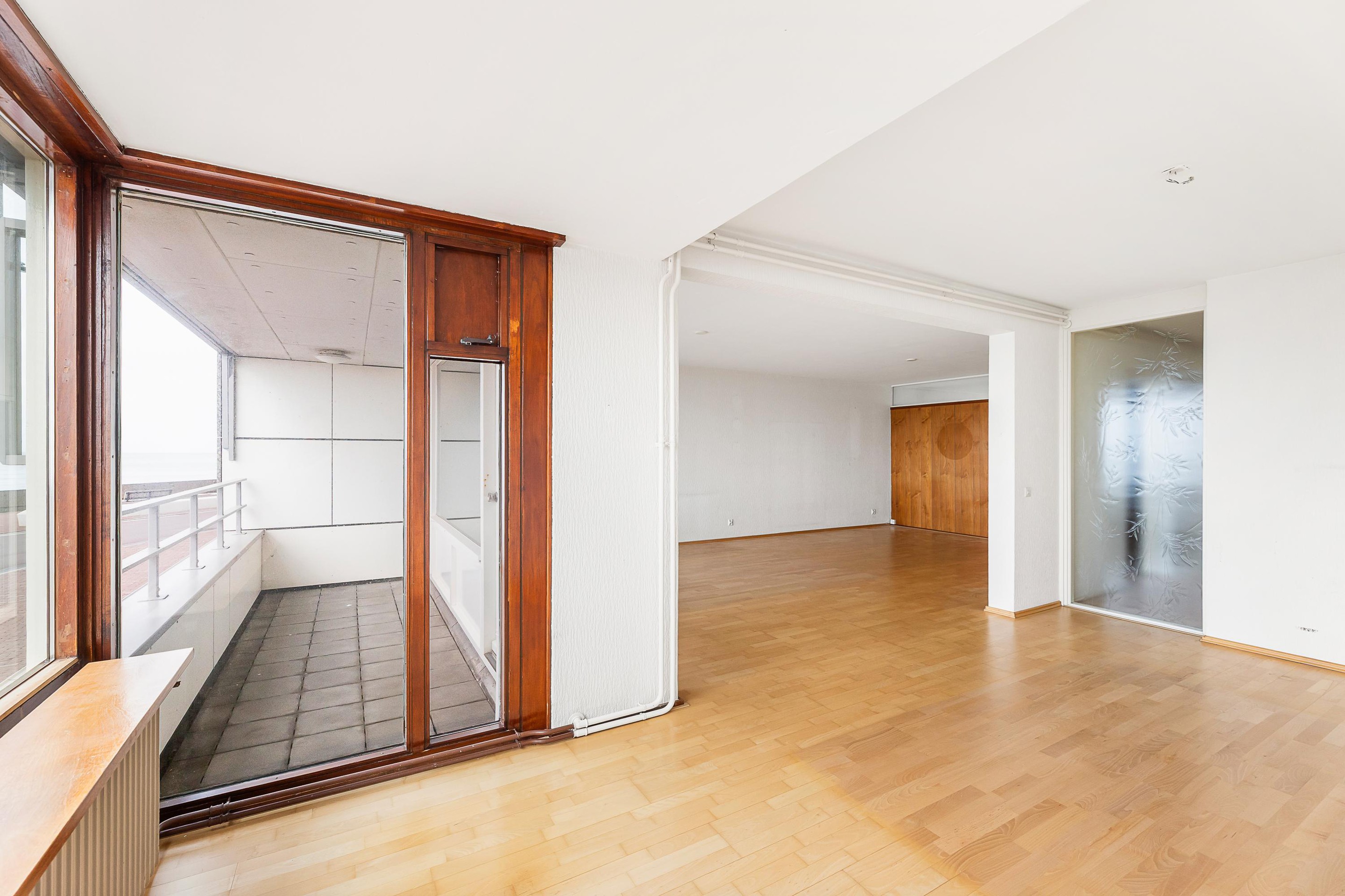 Entree van het appartement, hal met de kast met opstelling van de c.v.-combiketel. Dit appartement is voorzien van een royale woonkamer. Het magnifieke uitzicht vanuit de woonkamer reikt tot aan de Zeeuws Vlaamse kust. Er is een prettig overdekt balkon. De keuken is eenvoudig uitgevoerd. De tweede hal biedt ruimte aan een slaap- of werkkamer aan de koele achterzijde en het toilet.