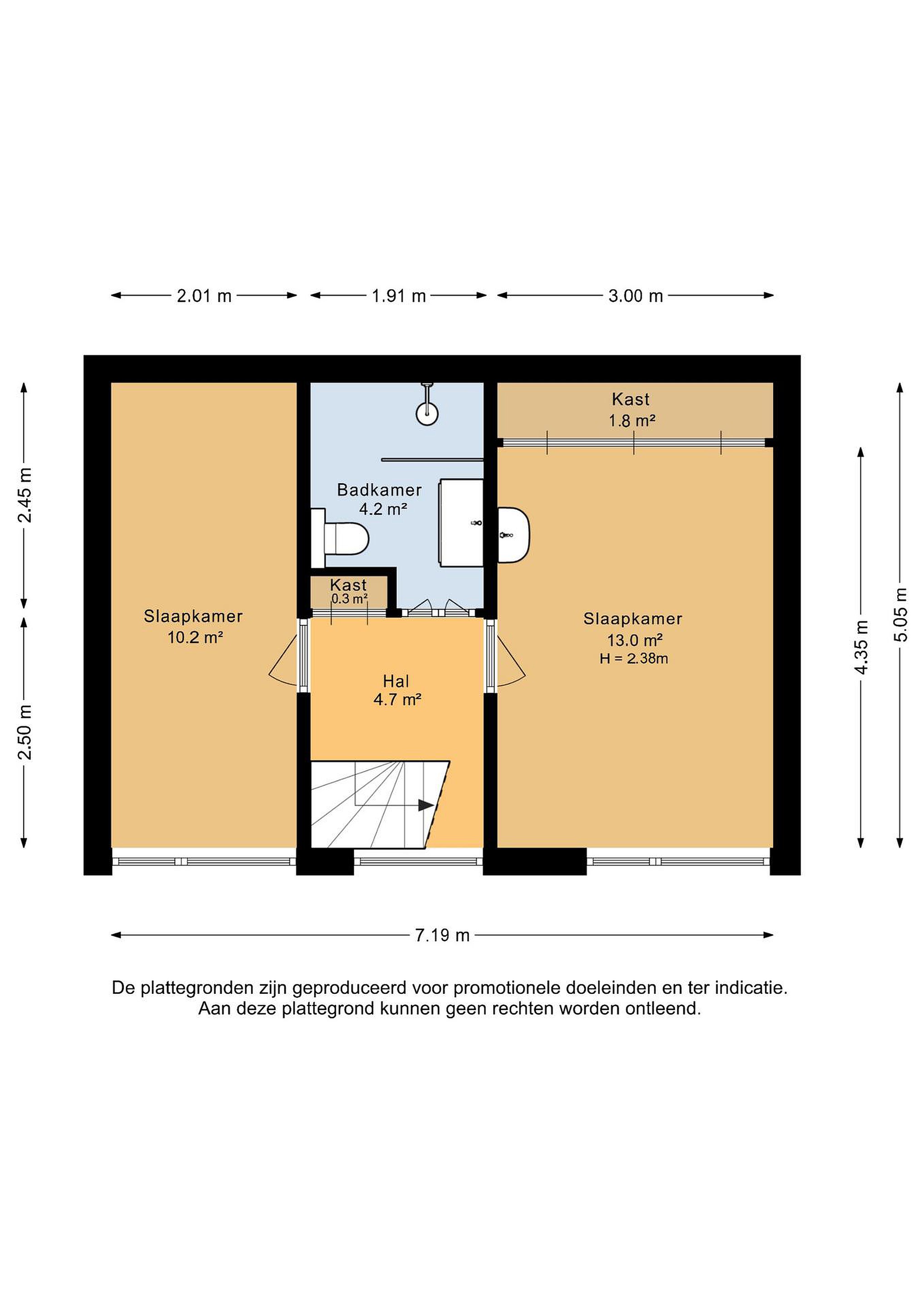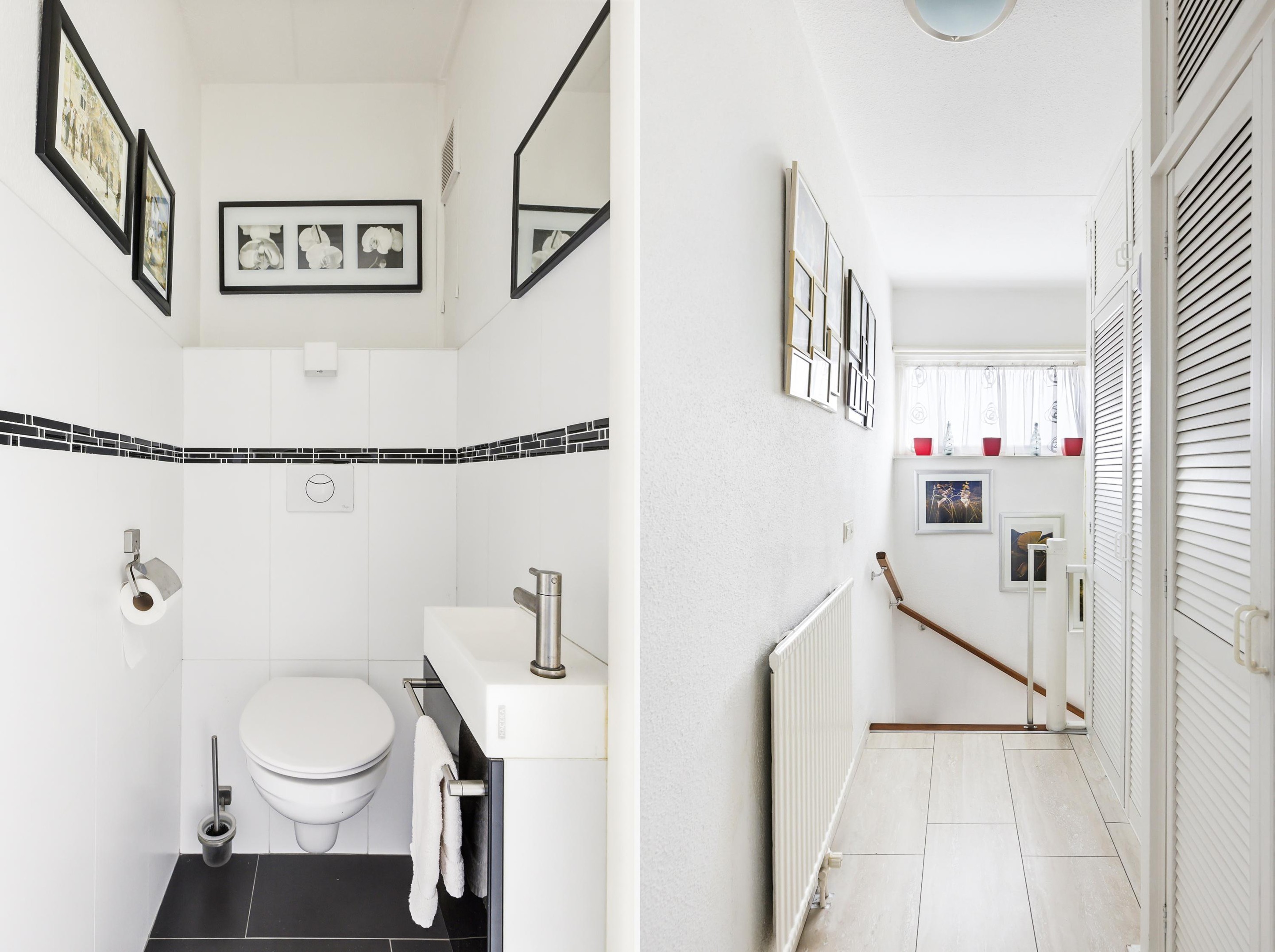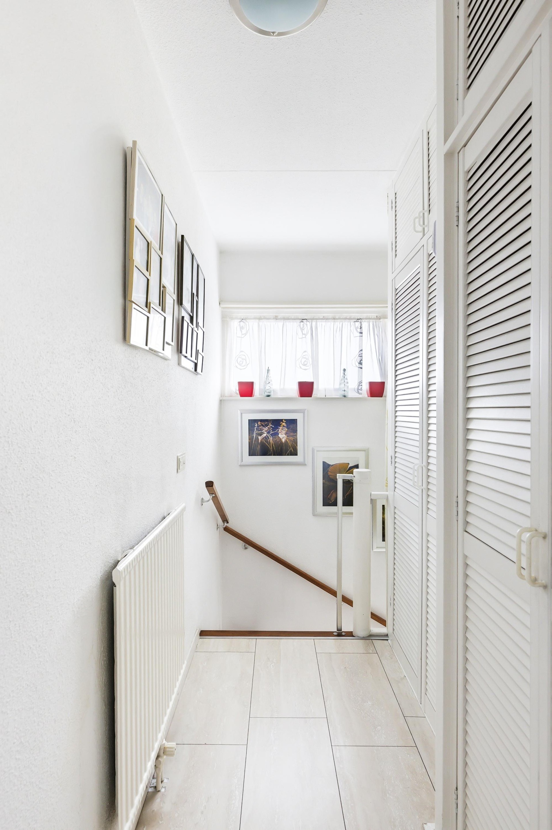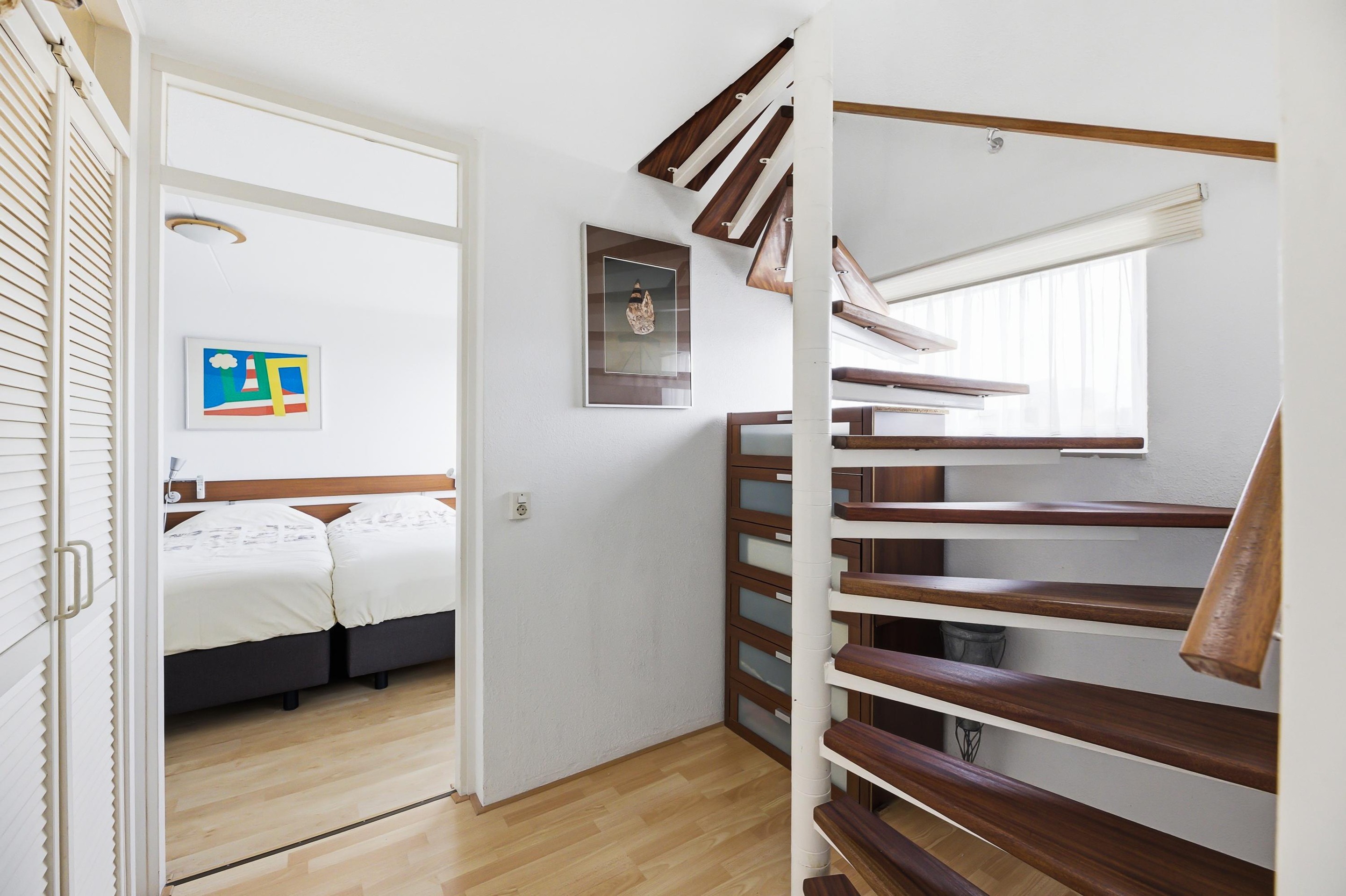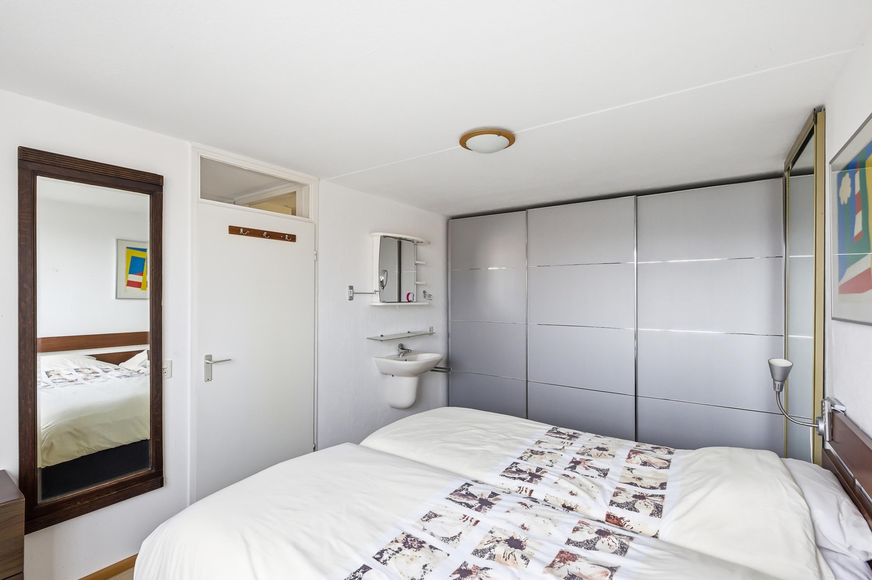 Vanuit de woonkamer heeft u toegang tot de hal met trap naar een verdieping lager. Er zijn twee fijne slaapkamers. Eén van de slaapkamers is voorzien van een vaste schuifdeurkast. De badkamer is uitgevoerd met een inloopdouche, wastafel in meubel en toilet.