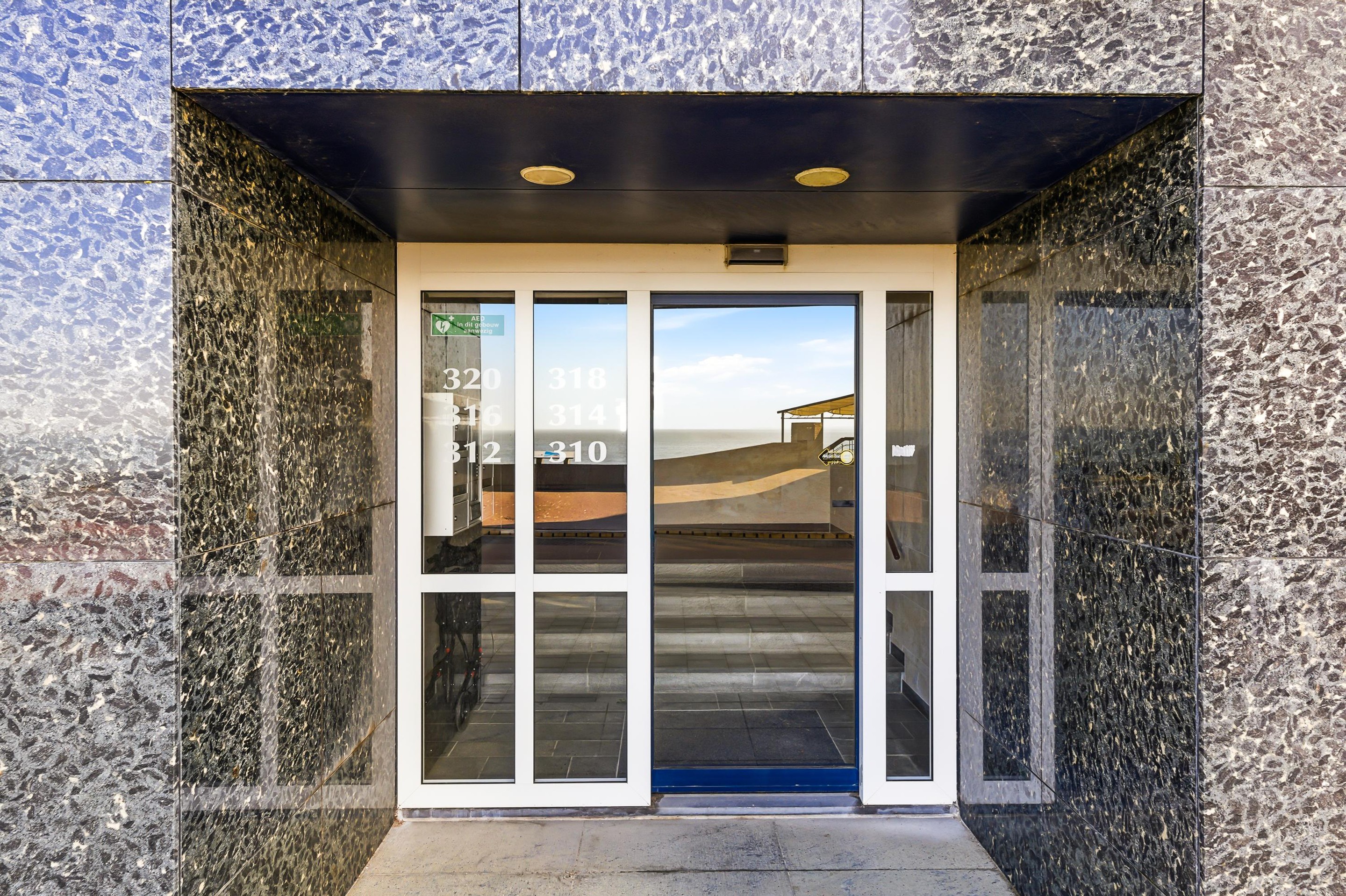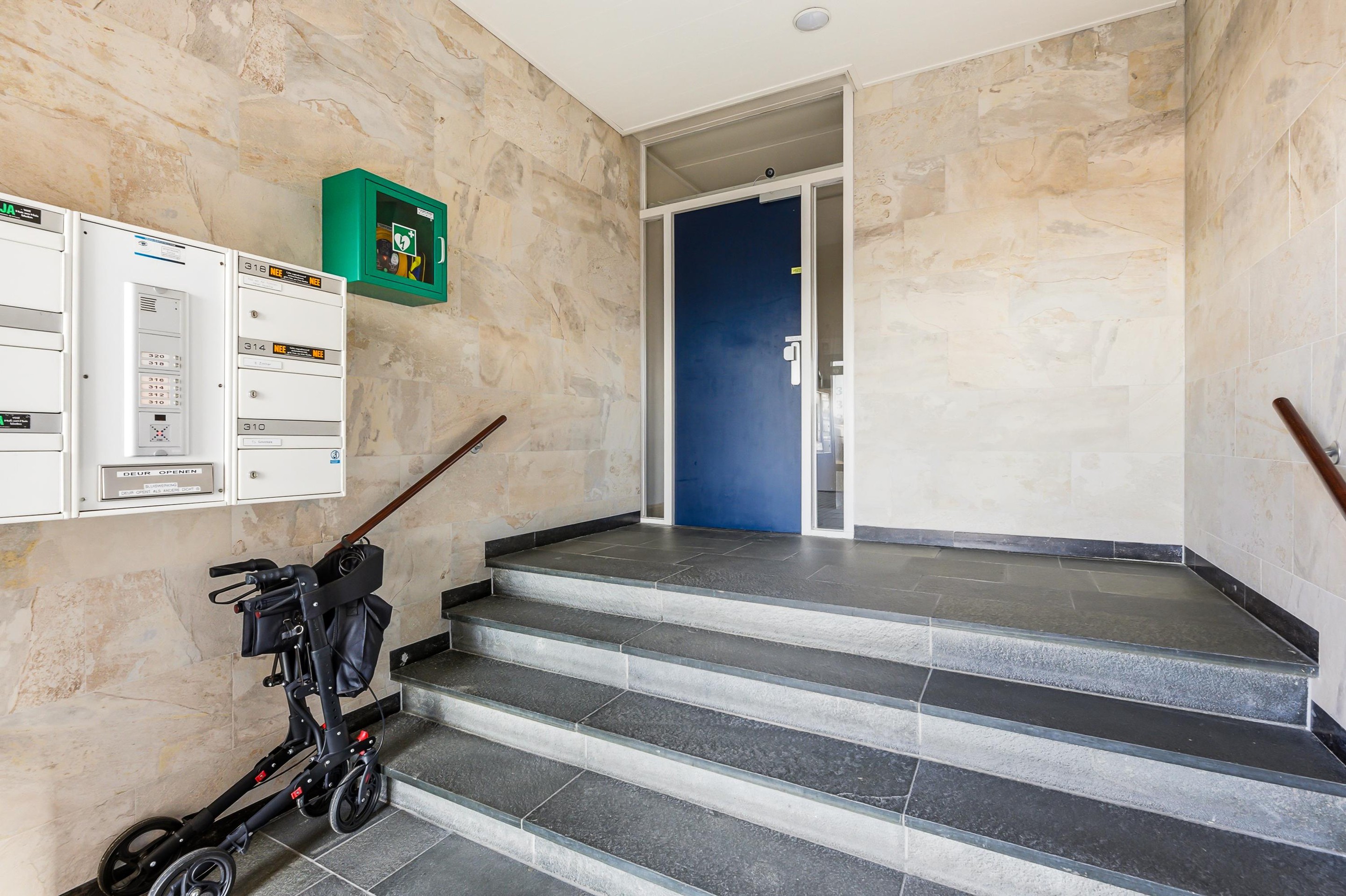 Algemene afgesloten entree met de intercominstallatie en postbussen met toegang tot de lift en het trappenhuis.