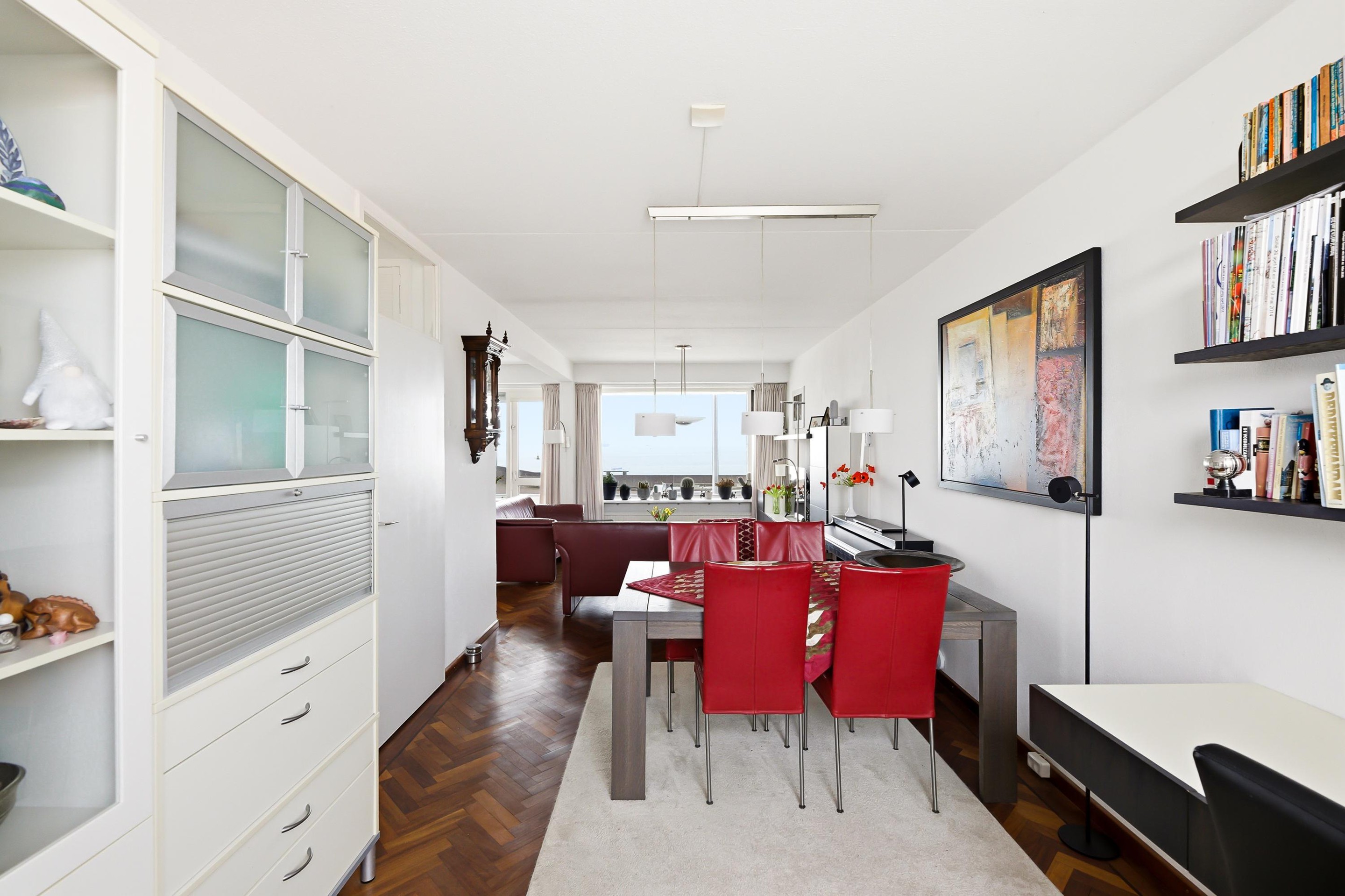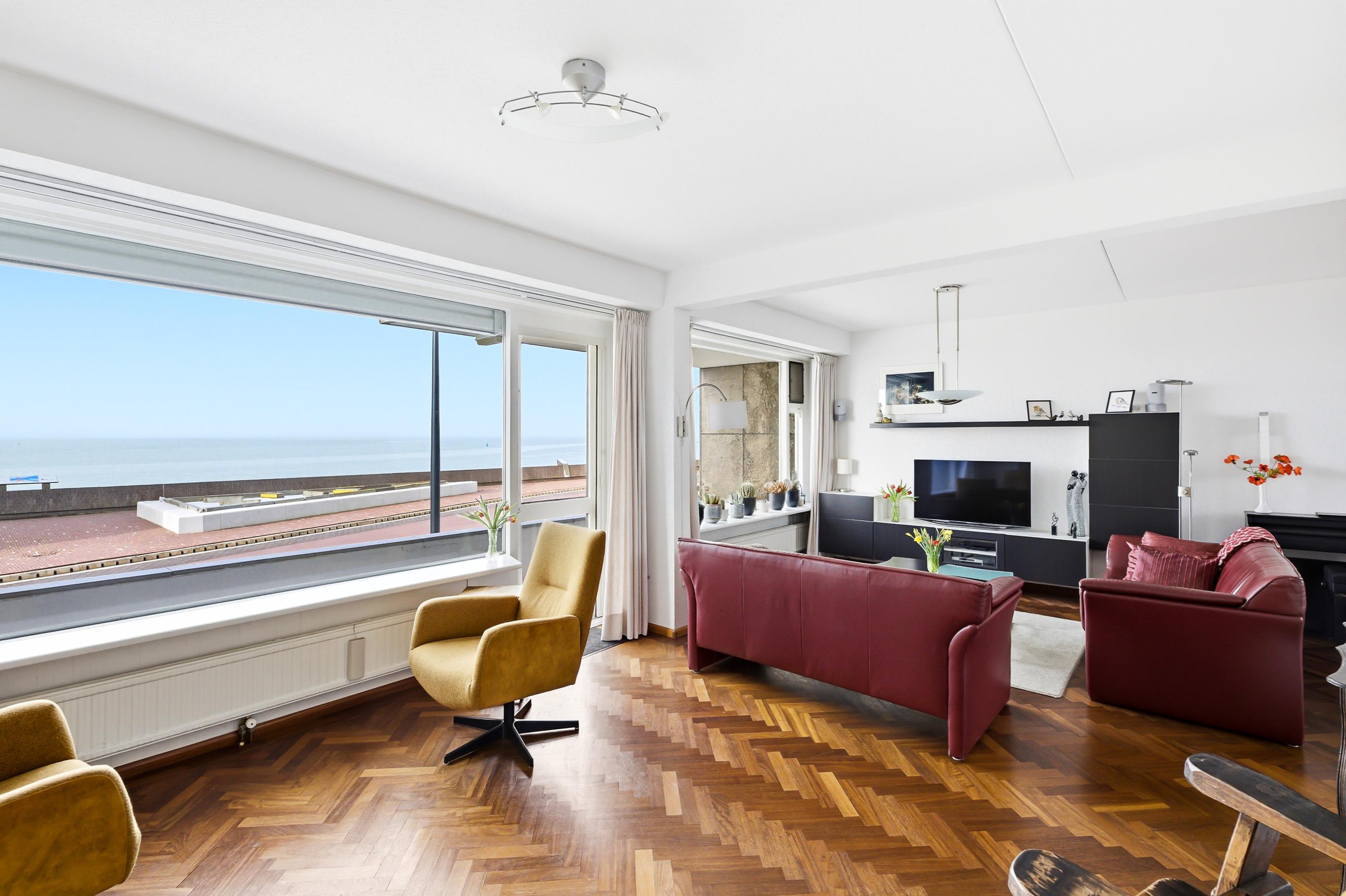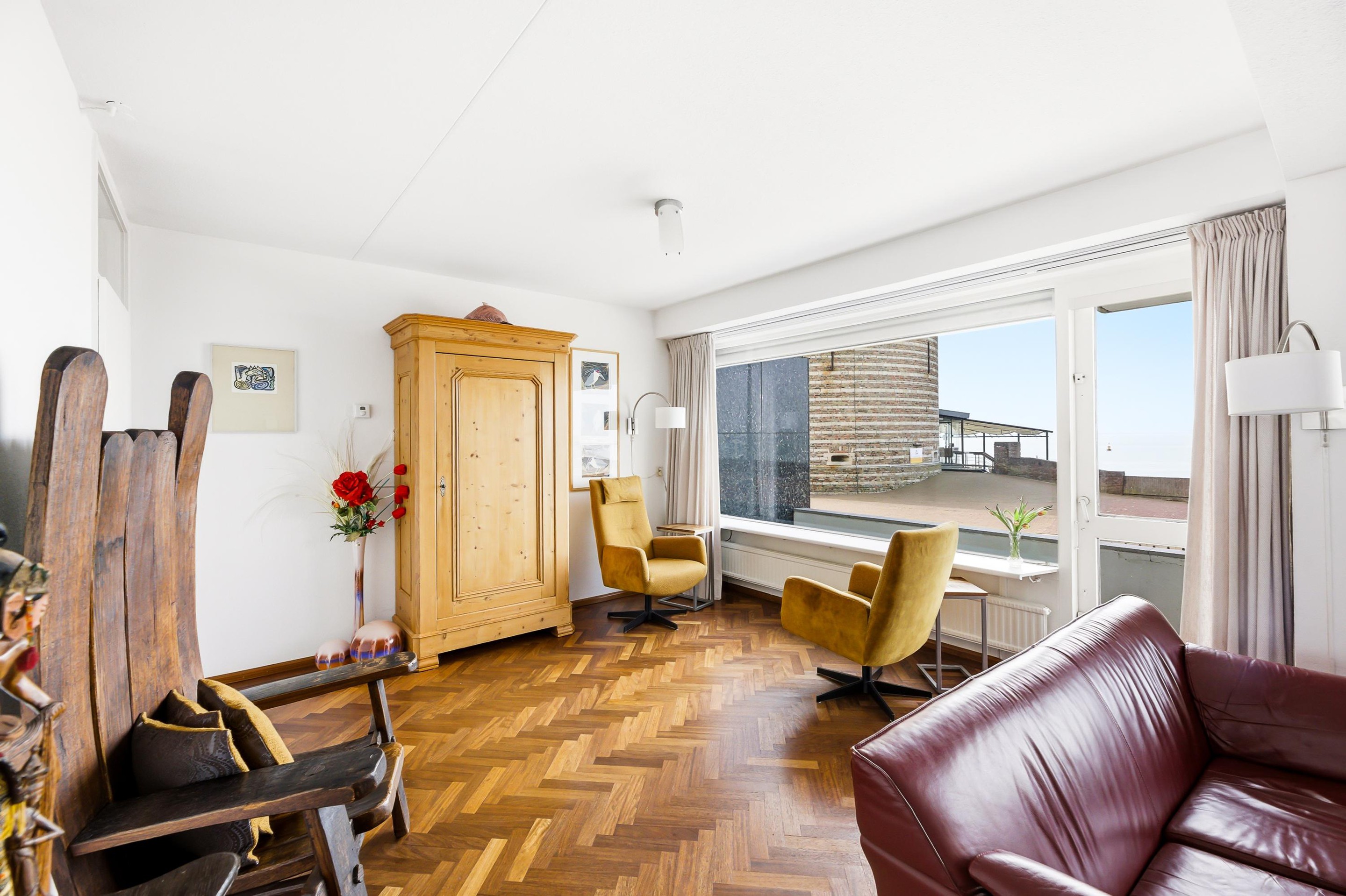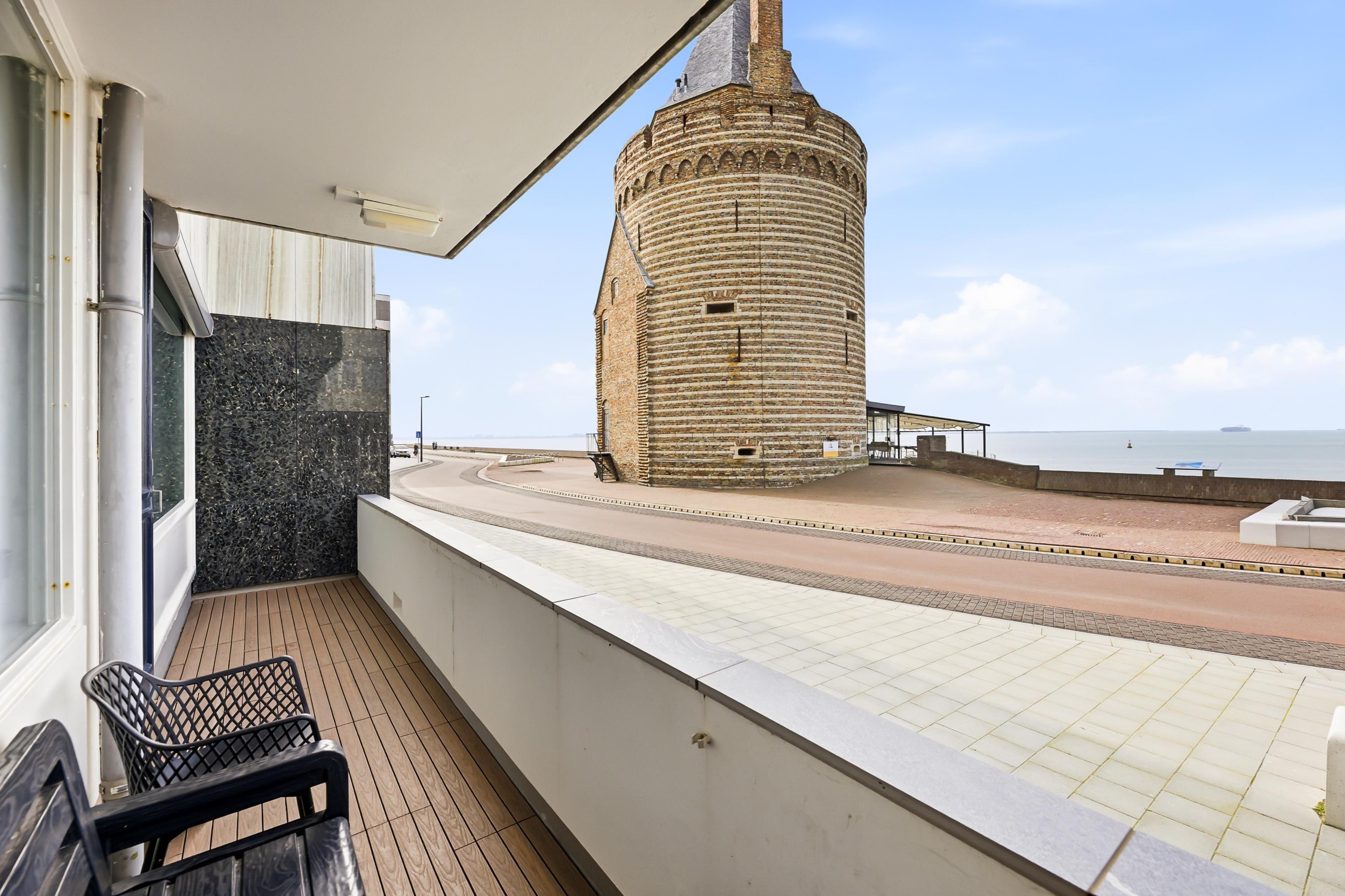 Entree, hal, toilet en toegang tot de keuken. De keuken, voorzien van een inductie kookplaat, is netjes maar gedateerd uitgevoerd. De woonkamer is zeer royaal en licht en heeft een fantastisch uitzicht op de Westerschelde en toegang tot het heerlijk zonnige balkon (9 m2).