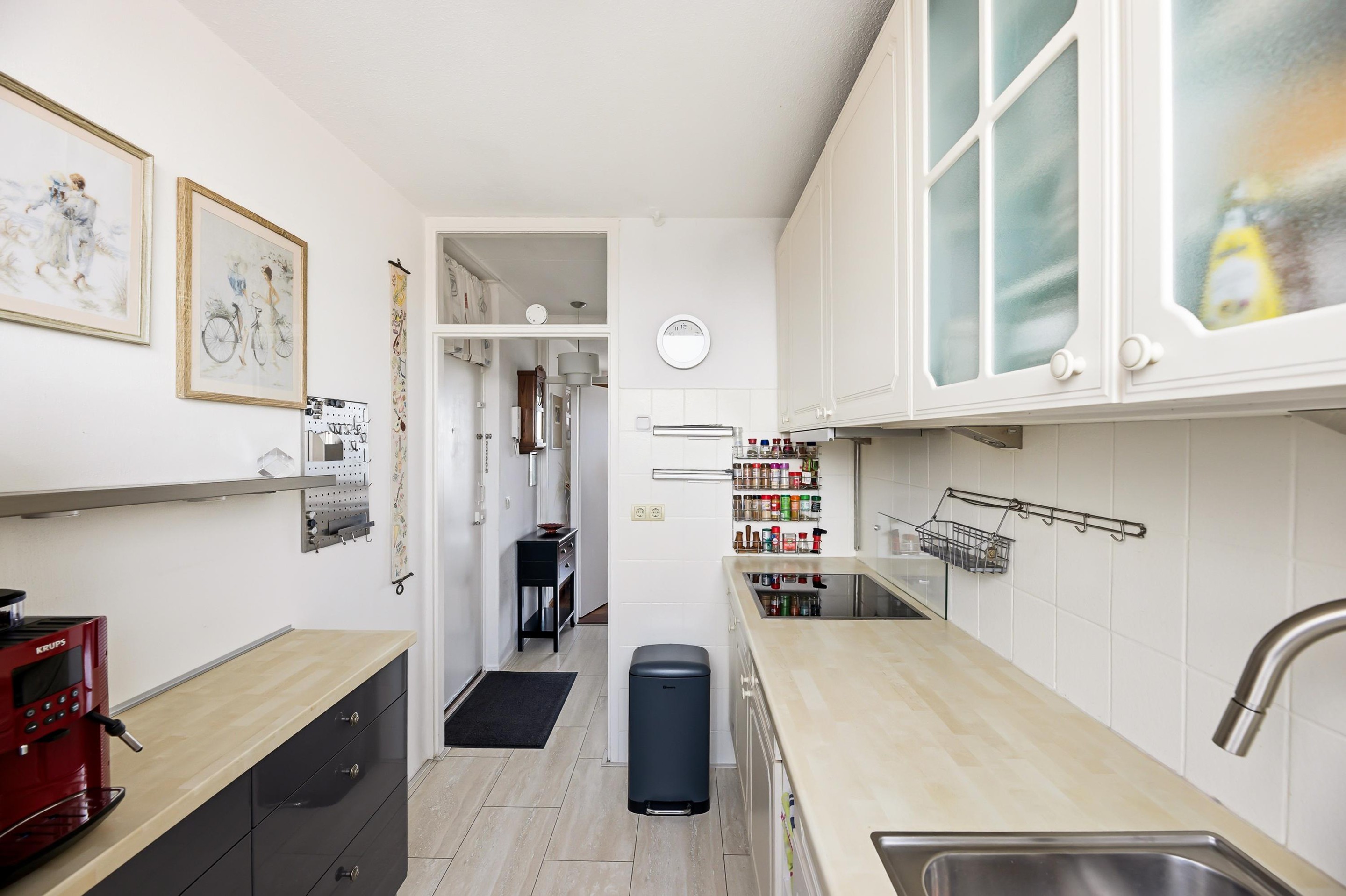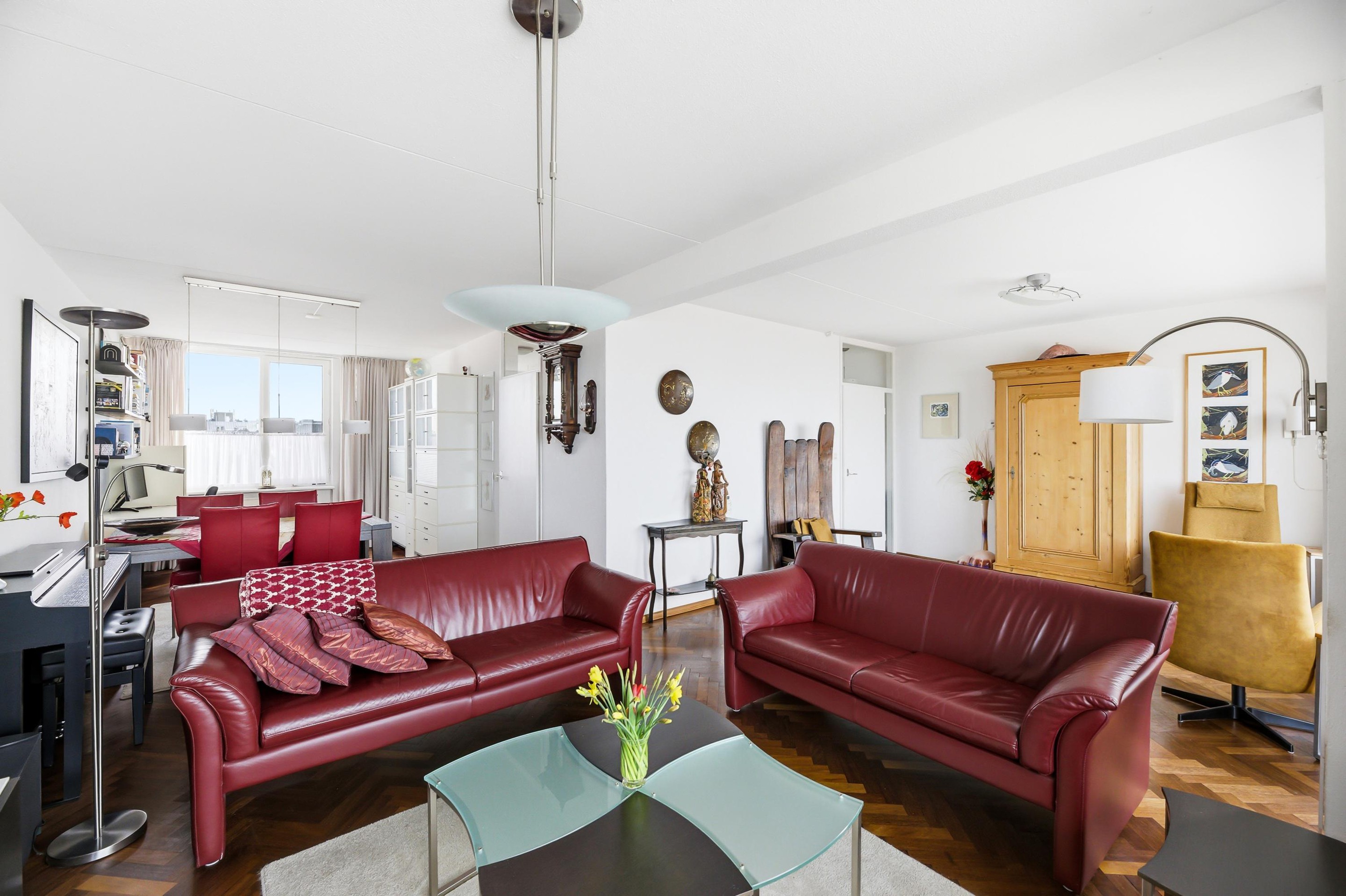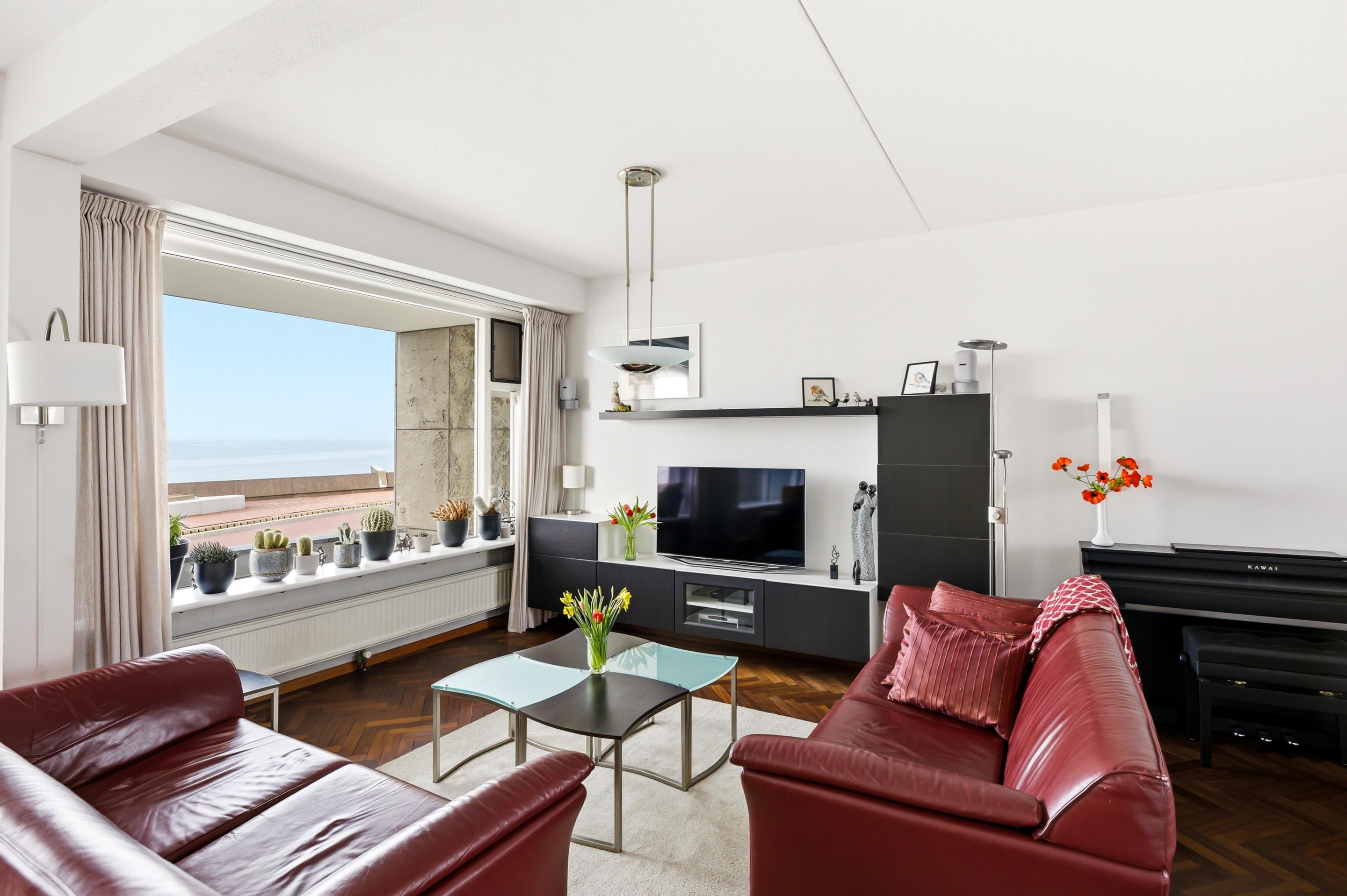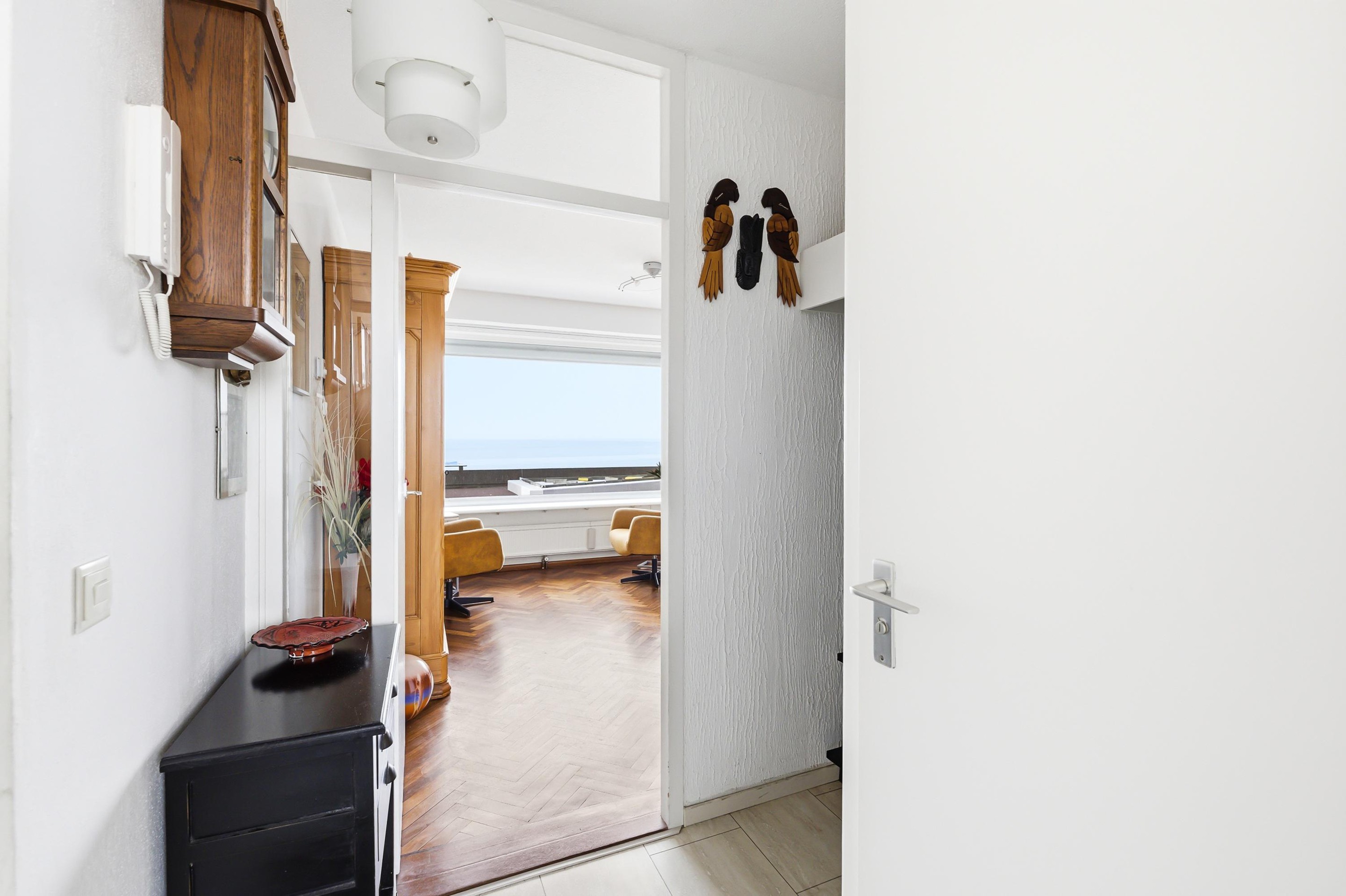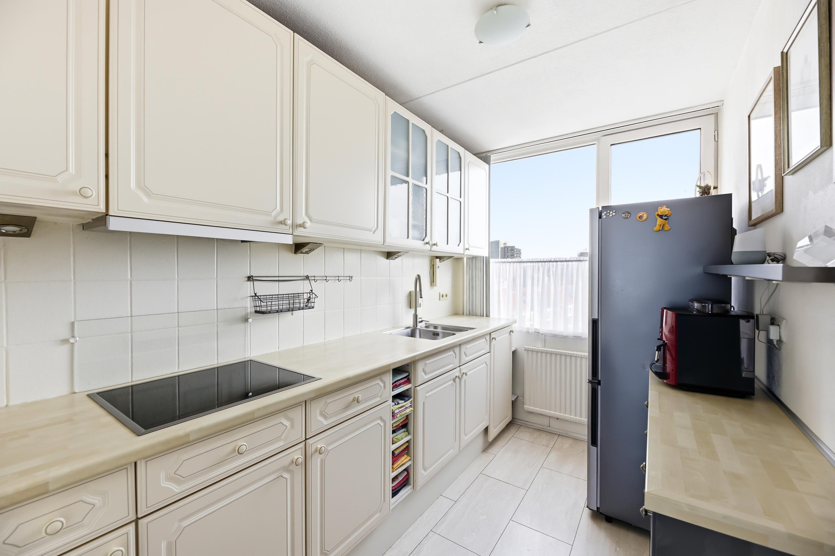 Entree, hal, toilet en toegang tot de keuken. De keuken, voorzien van een inductie kookplaat, is netjes maar gedateerd uitgevoerd. De woonkamer is zeer royaal en licht en heeft een fantastisch uitzicht op de Westerschelde en toegang tot het heerlijk zonnige balkon (9 m2).