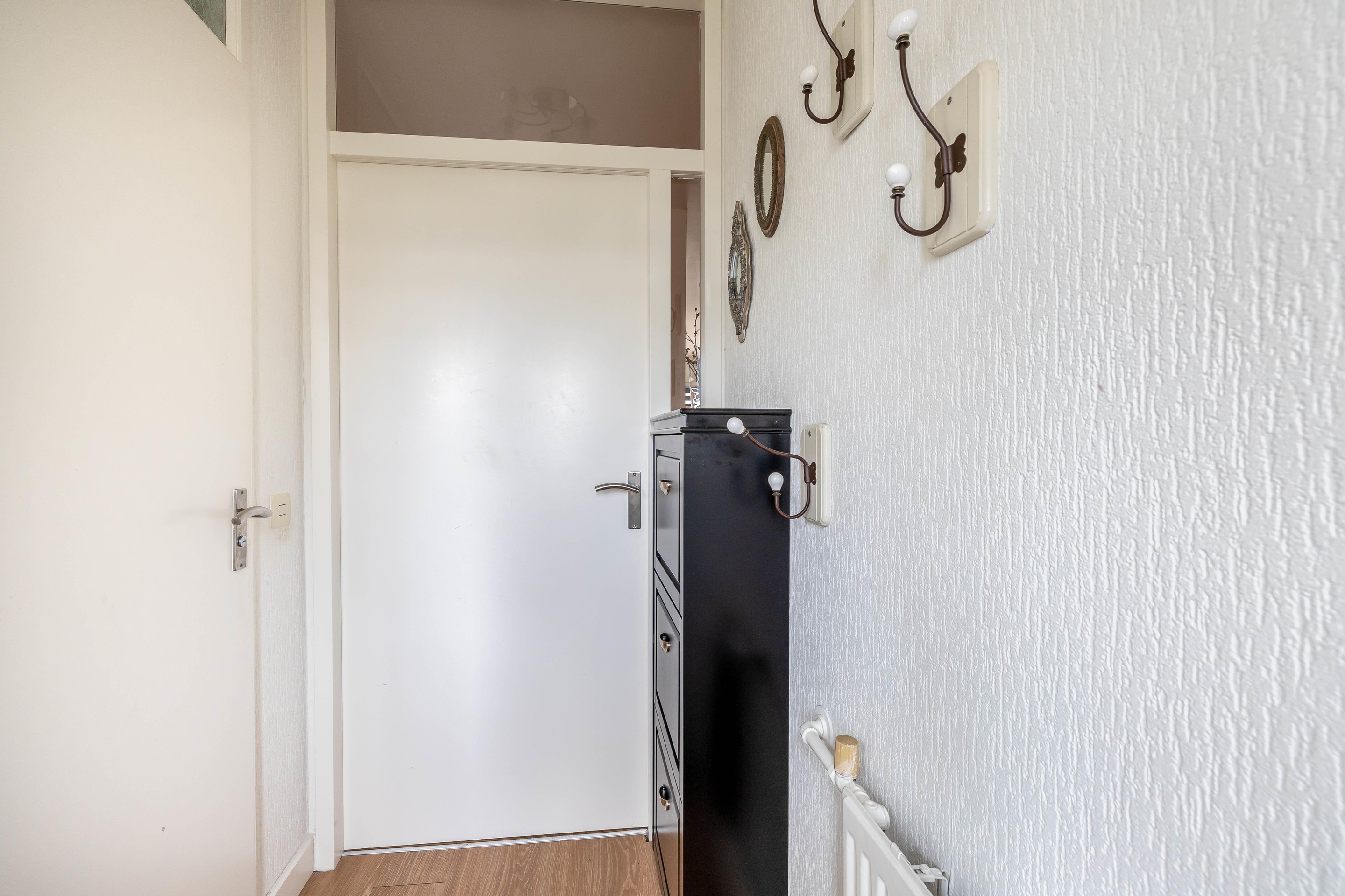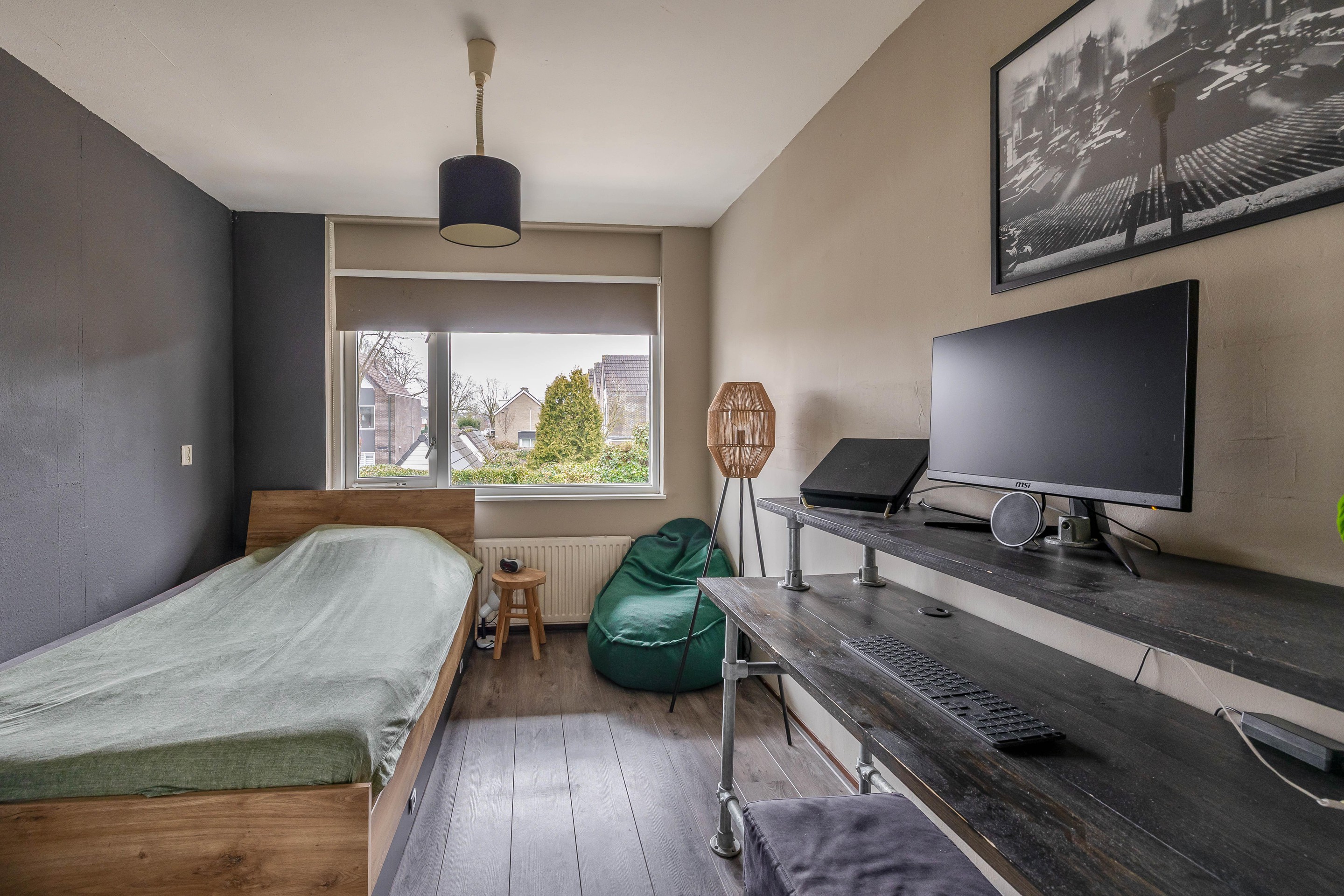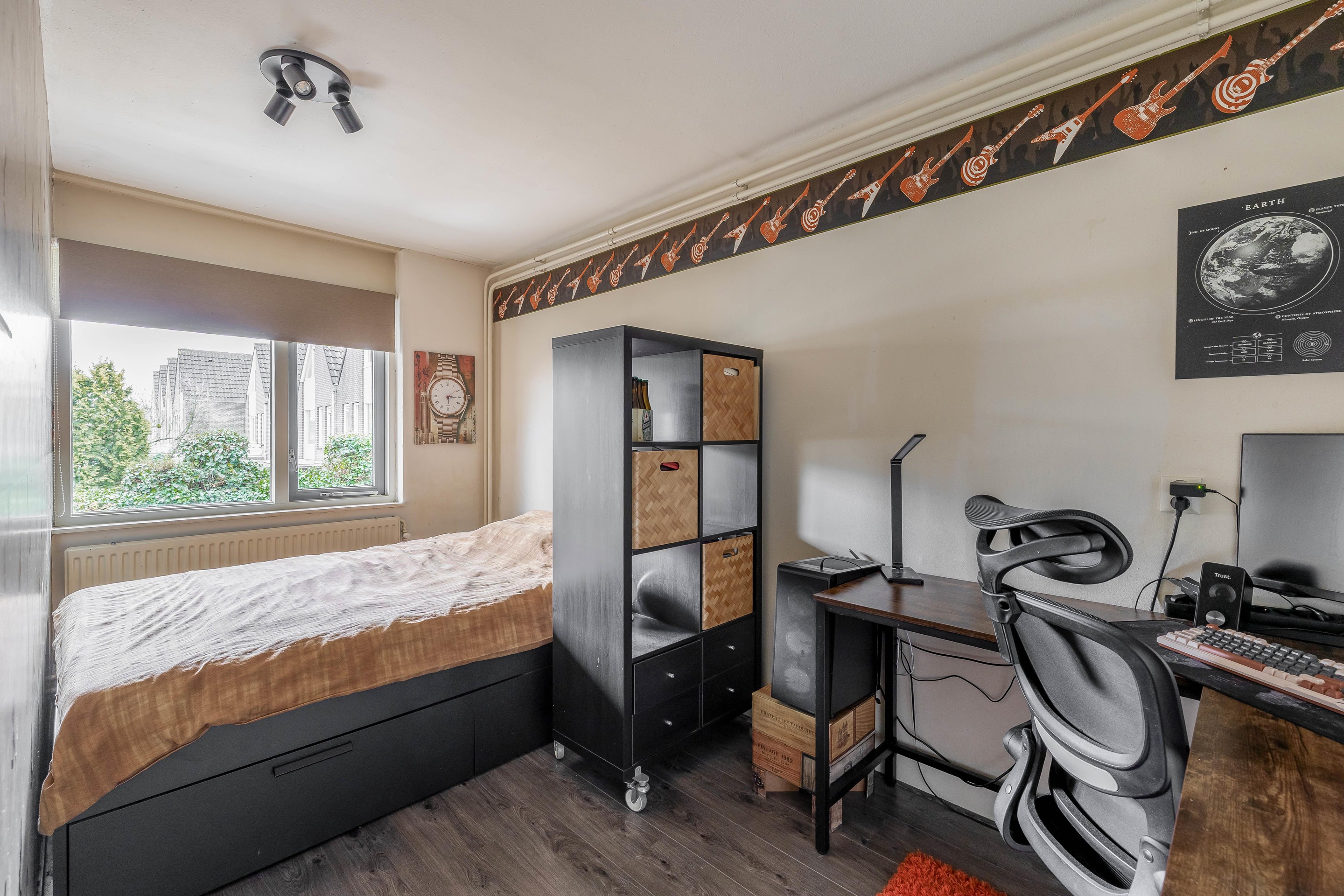Op de eerste verdieping biedt de overloop toegang tot drie volwaardige slaapkamers. De hoofdslaapkamer aan de voorzijde is met bijna 14 m2 zeer riant te noemen en biedt volop ruimte voor een kastenwand en een groot tweepersoonsbed. Aan de achterzijde bevinden zich de tweede en derde slaapkamer (respectievelijk 274 x 332 en 210 x 423 cm groot), beide voorzien van een nette laminaatvloer en gestuukte wanden. Op de overloop is extra bergruimte gecreëerd en bevindt zich de opstelling voor de cv-ketel uit 2020. De keurige badkamer is functioneel ingericht met een inloopdouche, wastafelmeubel, tweede toilet en mechanische ventilatie.