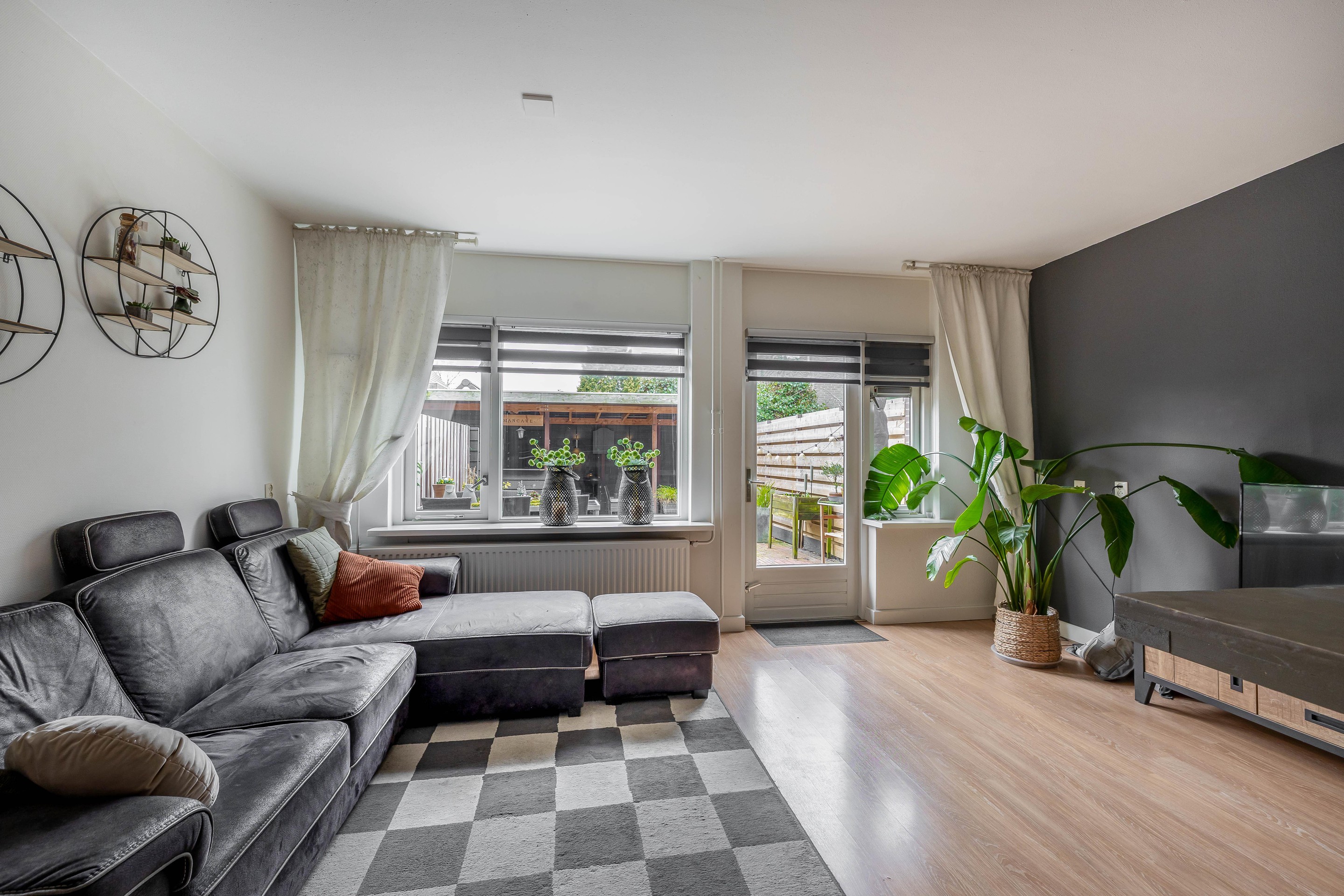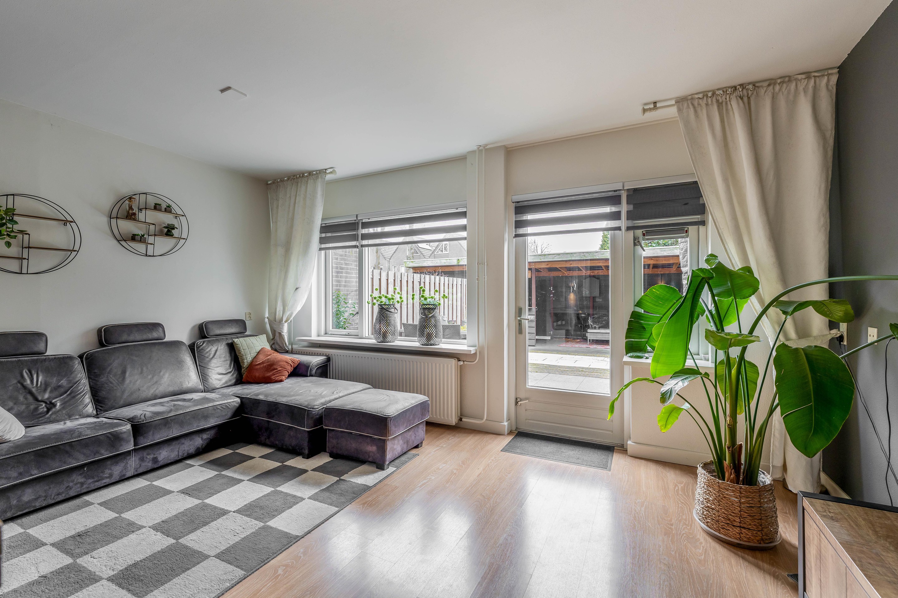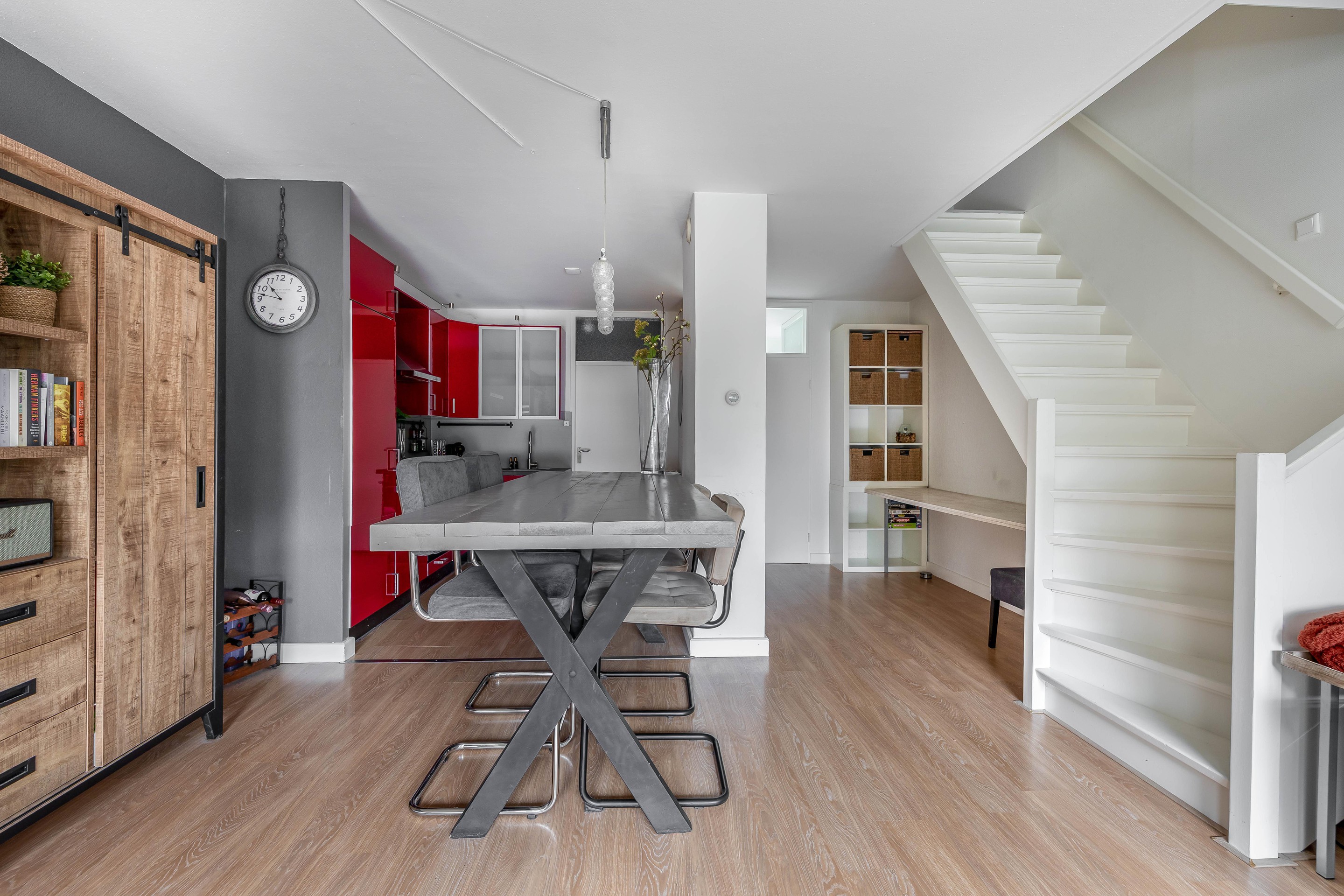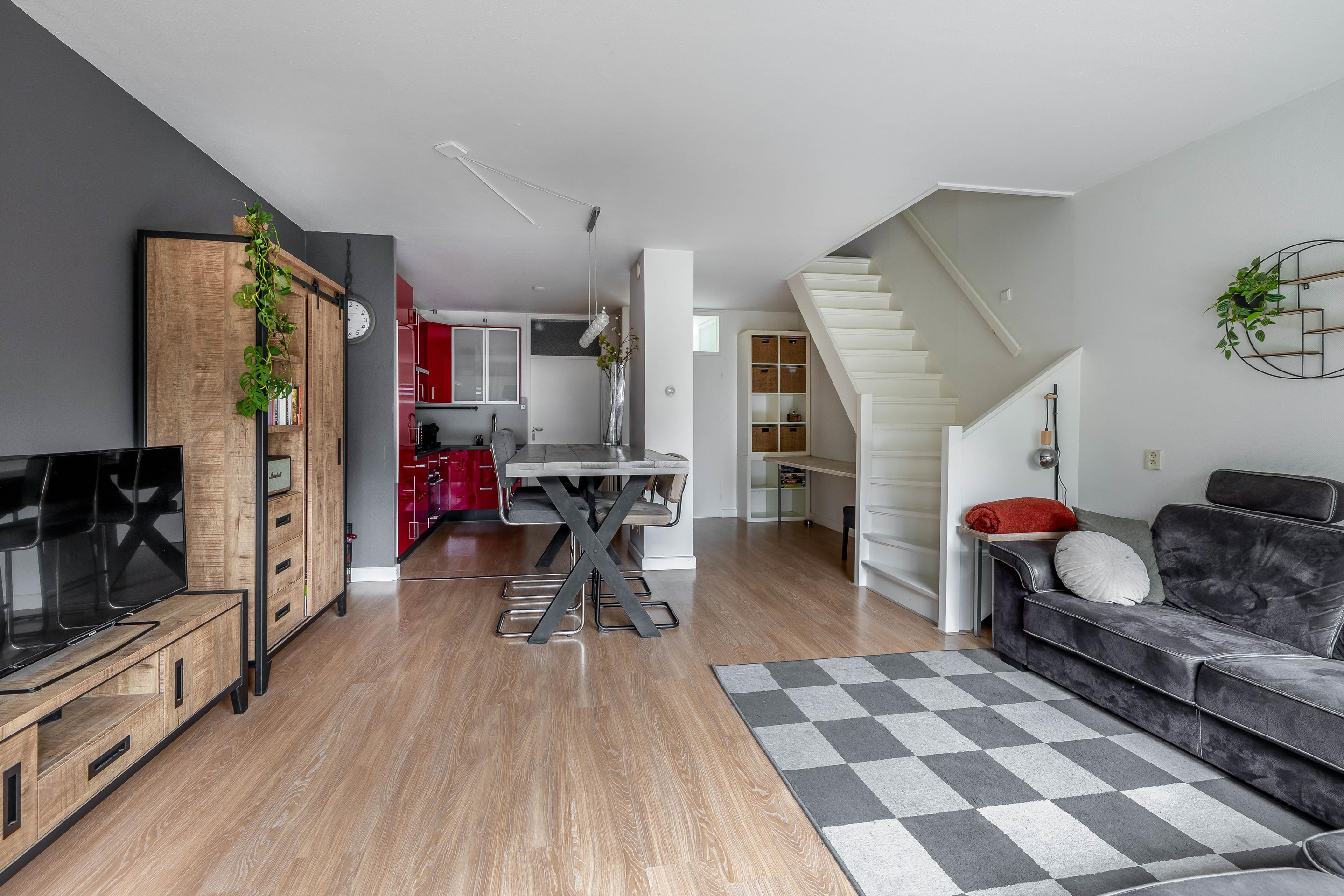 De woonkamer biedt voldoende plek voor een royale zithoek aan de tuinzijde en een grote eettafel voor gezellige etentjes. De wanden zijn gestuukt en de ruimte onder de trap is slim benut als werkplek, al leent deze hoek zich ook uitstekend voor een vaste kastenwand.