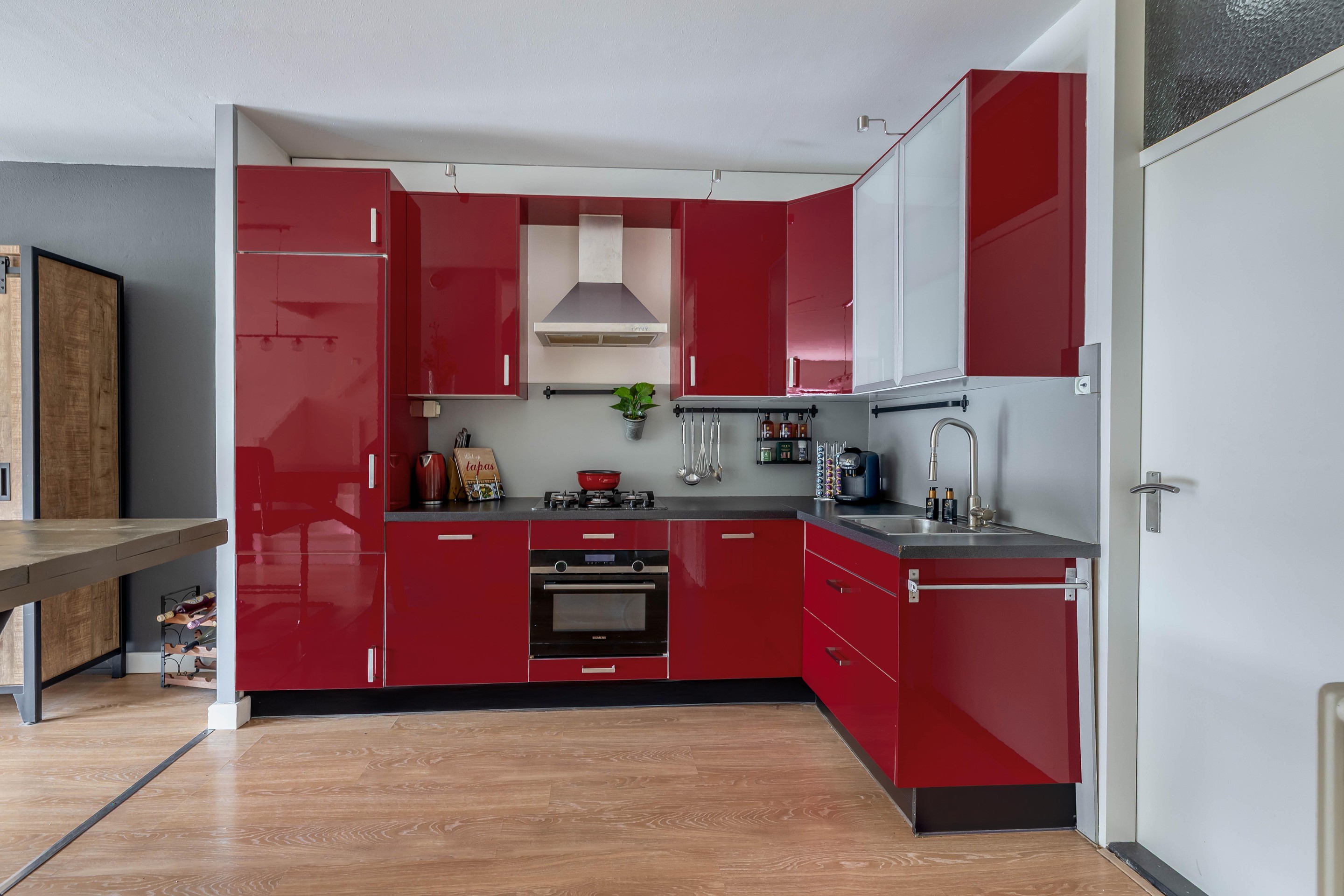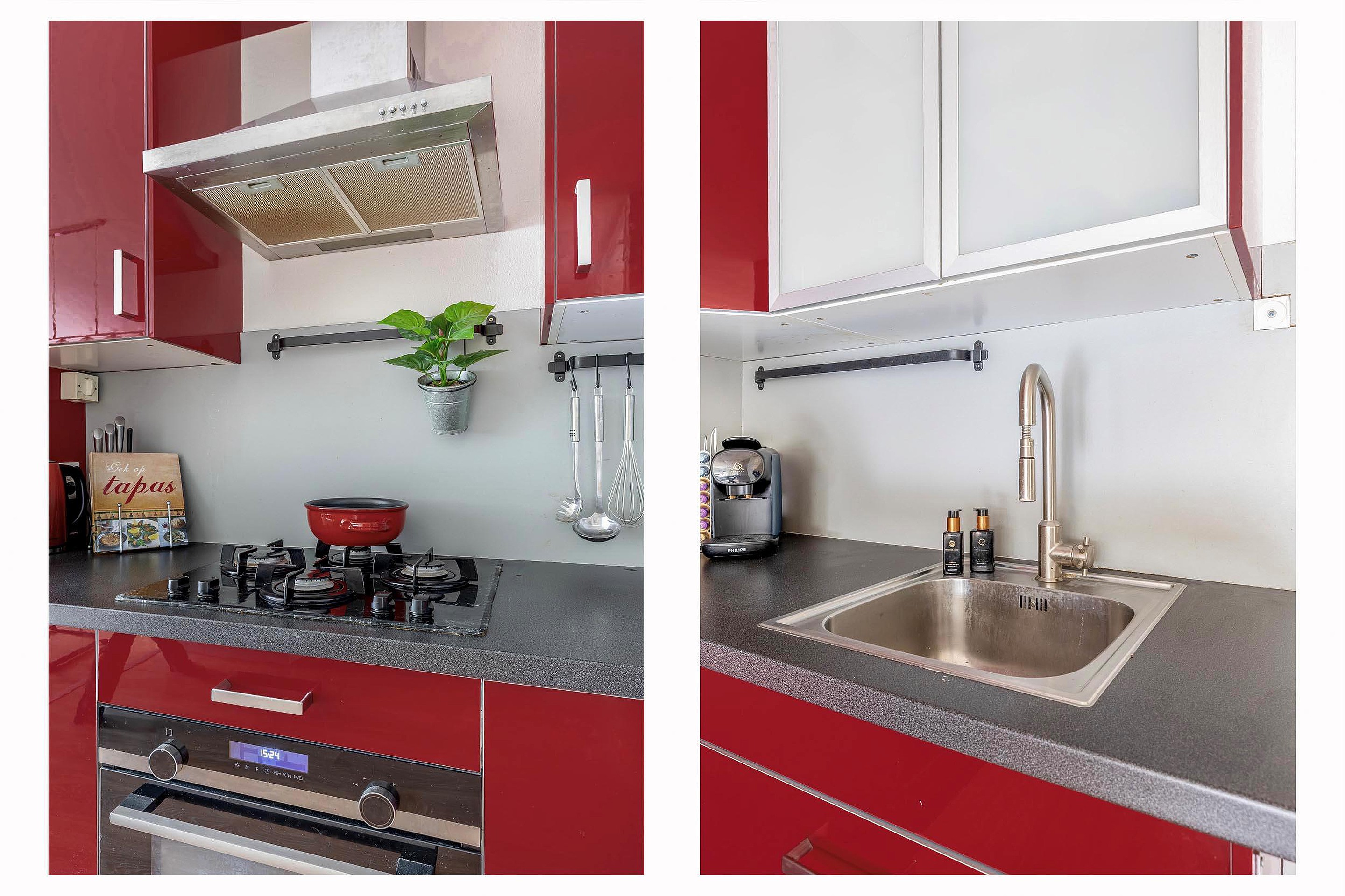 Bij binnenkomst in de hal tref je een moderne toiletruimte met hangend closet, de garderobe en de uitgebreide meterkast. De vloer loopt drempelloos door over de gehele begane grond naar de lichte woonkamer. Direct bij de entree van de woonkamer bevindt zich de toegang tot de inpandige berging, een ideale plek voor de wasapparatuur en extra voorraad. De open keuken in L-opstelling vormt het hart van de verdieping en staat in directe verbinding met het leefgedeelte. Hoewel de keuken niet geheel nieuw is, verkeert deze in uitstekende staat en is deze volledig uitgerust met een 5-pitsgaskookplaat, combimagnetron, koelkast en afzuigkap.