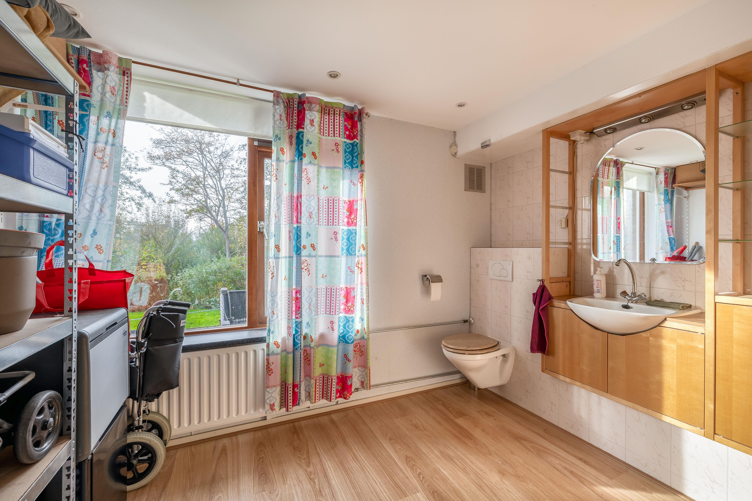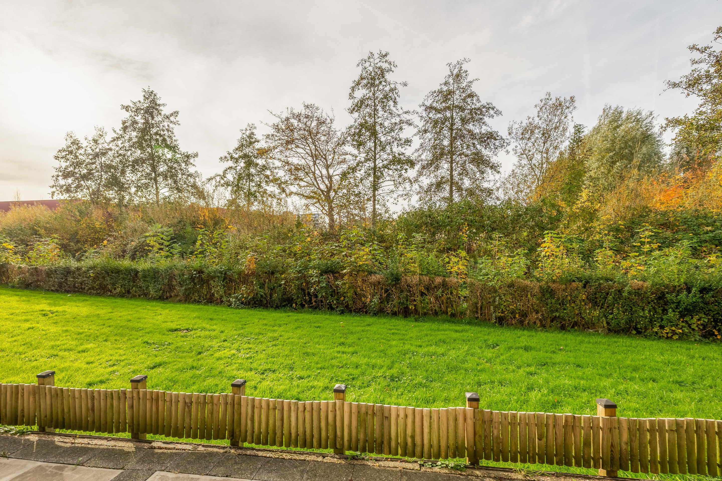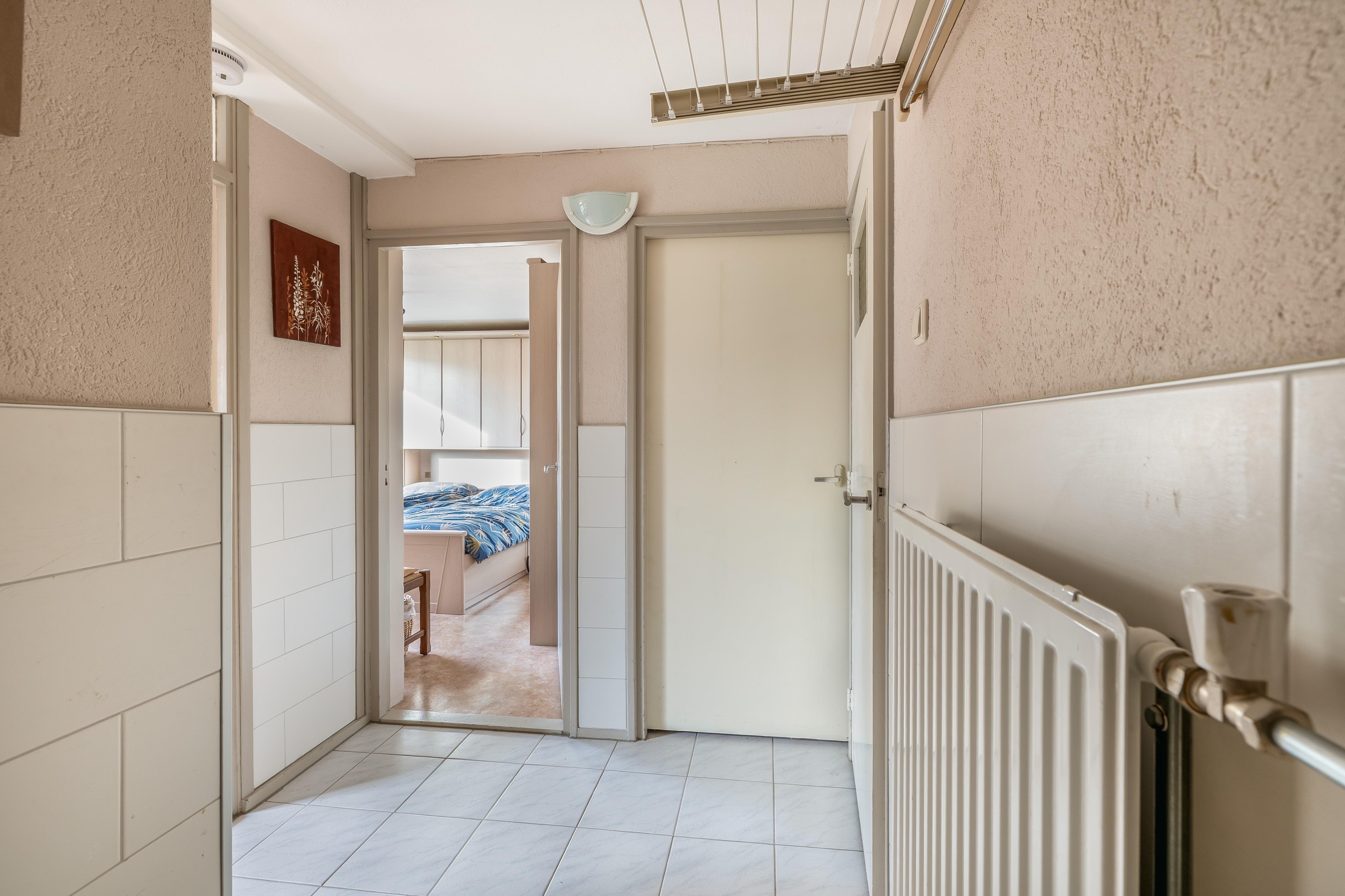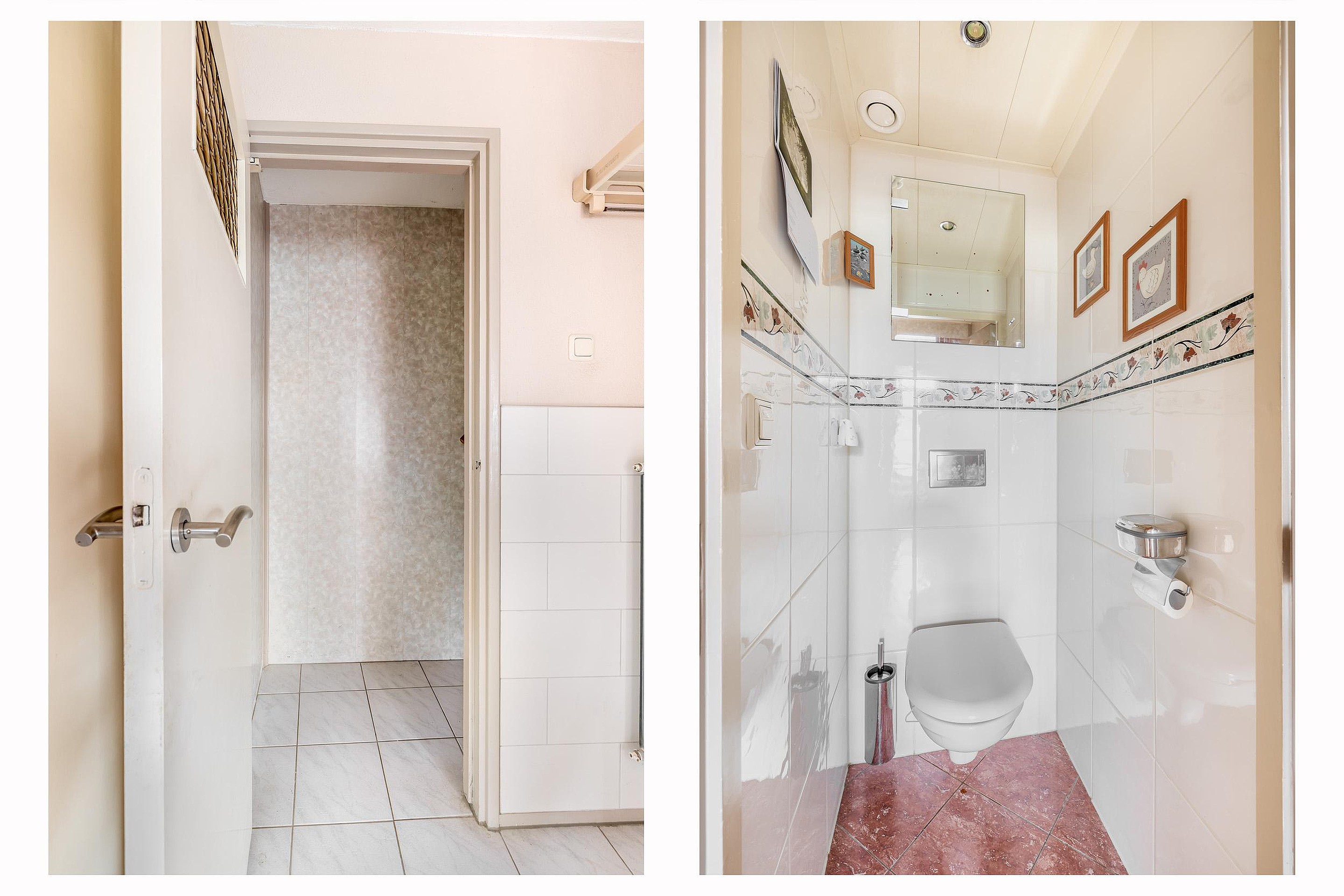 U komt binnen in de hal, waar zich de meterkast (voorzien van 6 groepen en 2 aardlekschakelaars) en de toiletruimte met een modern vrijhangend toilet bevinden. Vanuit deze centrale hal heeft u toegang tot alle vertrekken op deze woonlaag: de woonkamer, de dichte keuken, de badkamer en een slaapkamer. De lichte doorzonwoonkamer biedt voldoende ruimte voor zowel een gezellige zithoek als een eethoek. Dankzij de grote raampartijen aan weerszijden geniet u hier van een prettige lichtinval en een vrij uitzicht op het omliggende groen. Het plafond is strak afgewerkt, verlaagd en voorzien van inbouwspots.