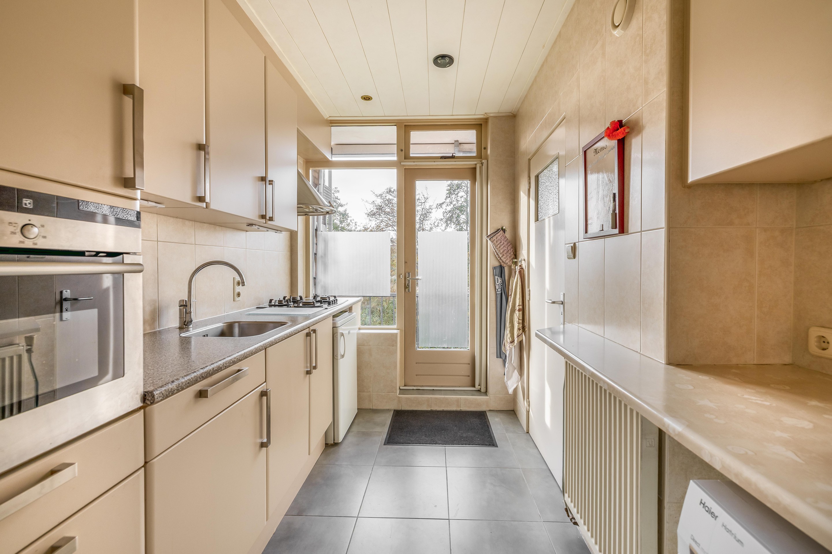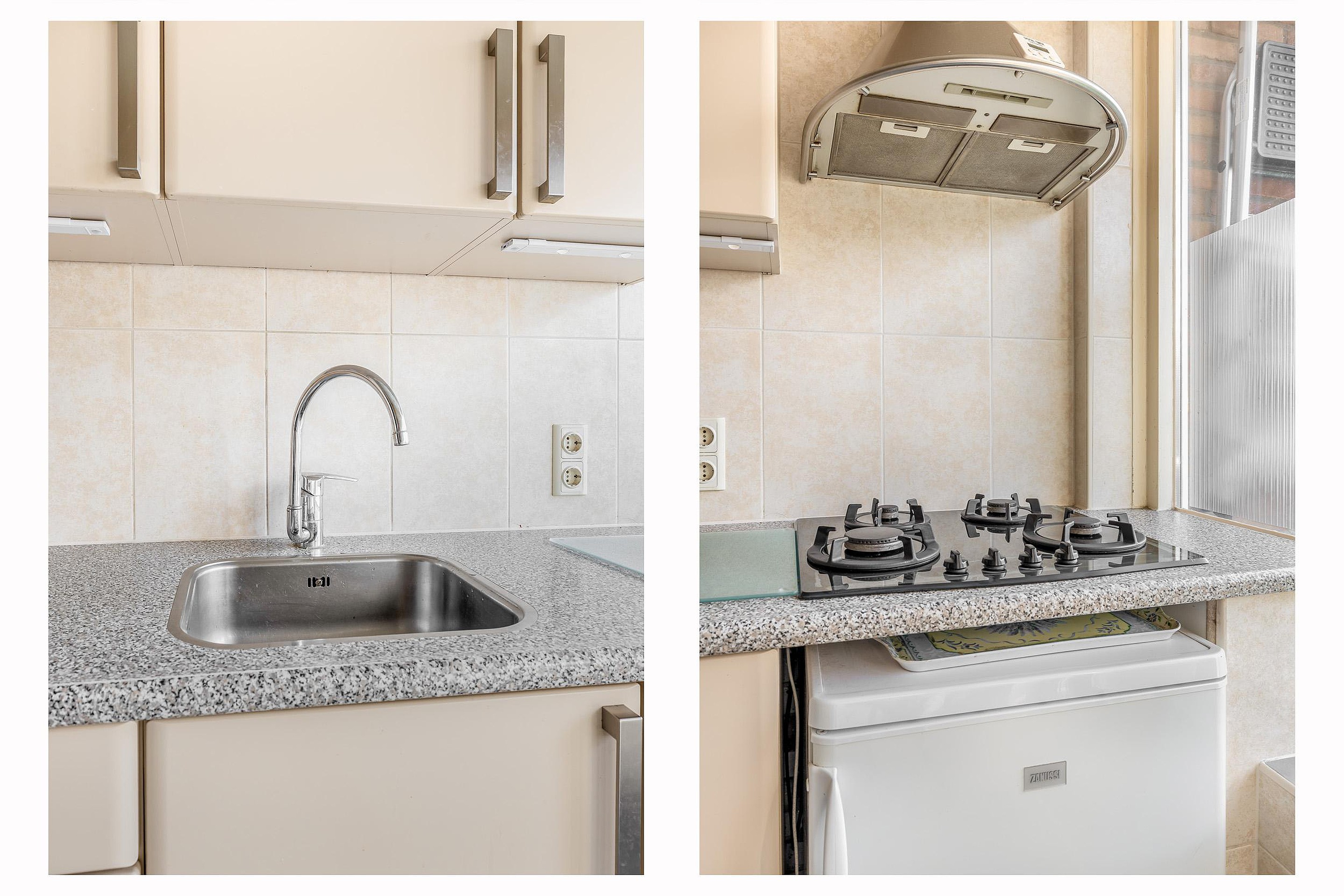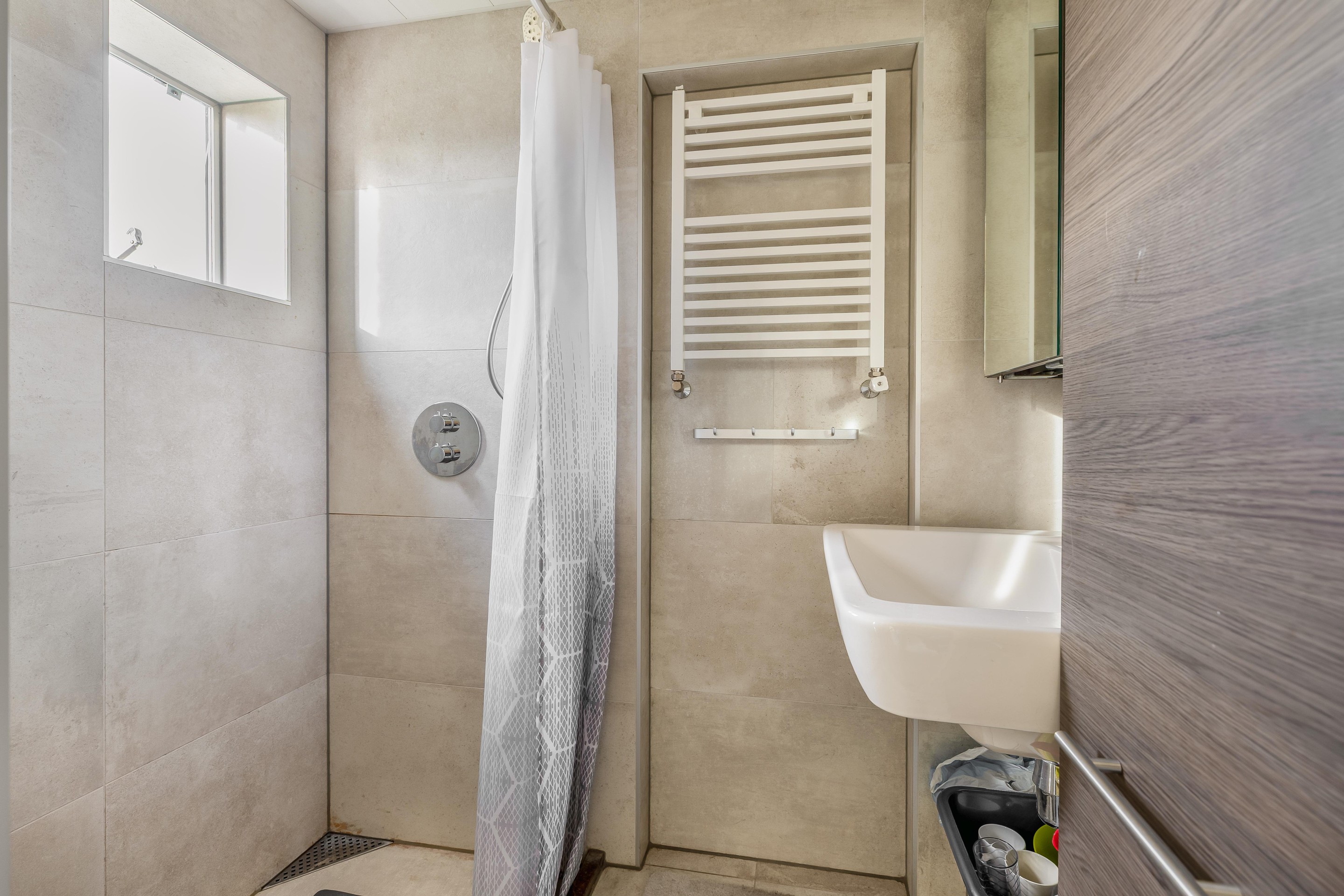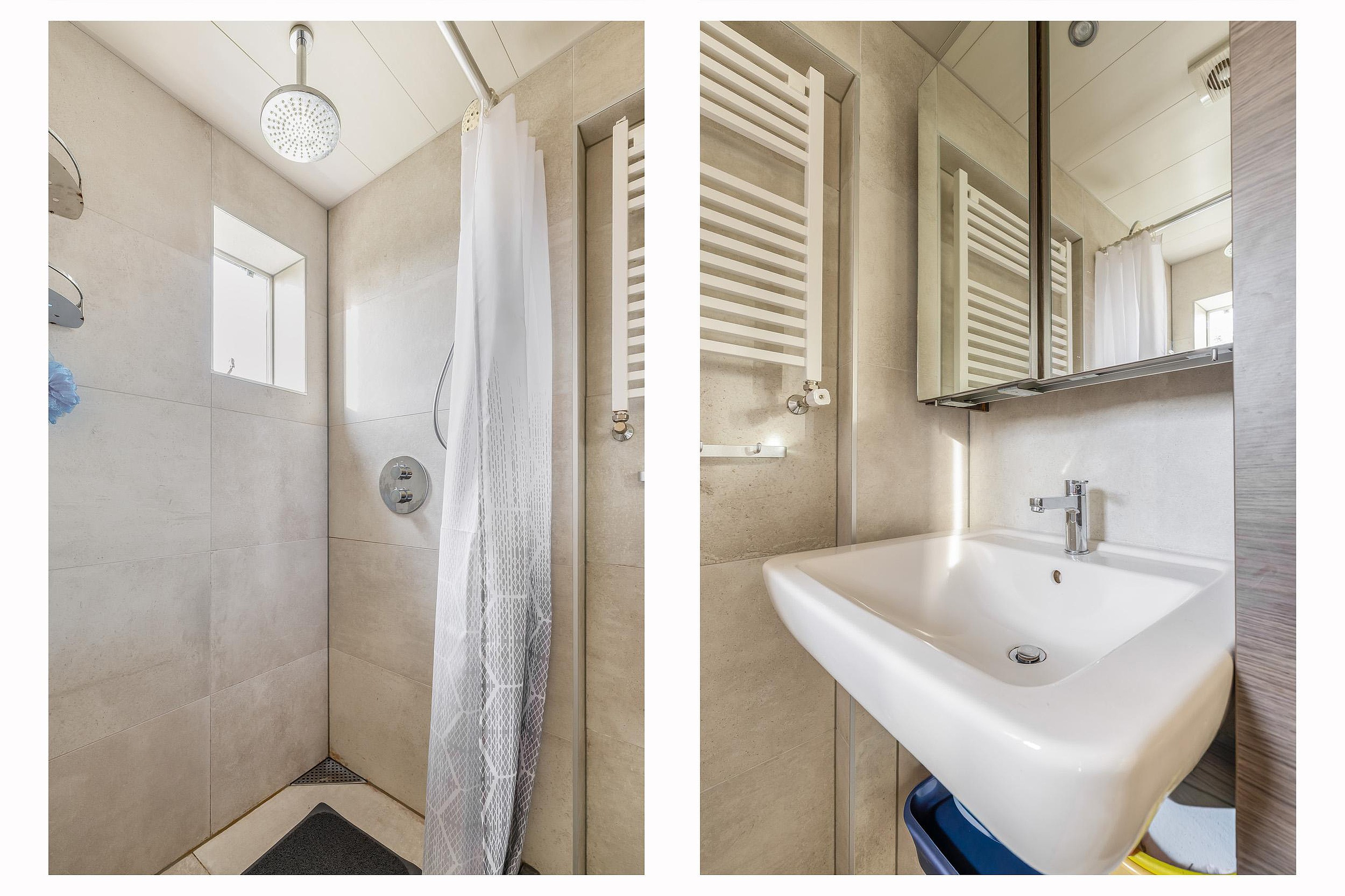 De nette, dichte keuken is uitgerust met diverse inbouwapparatuur, waaronder een kookplaat, afzuigkap en combimagnetron. Daarnaast is er ruimte voor een losse koelkast en vindt u hier de aansluiting voor de wasmachine. Een loopdeur geeft vanuit de keuken direct toegang tot de buitenruimte aan de achterzijde. De badkamer is volledig betegeld met grote tegels en efficiënt ingericht met een inloopdouche, een wastafelmeubel en een handdoekradiator.