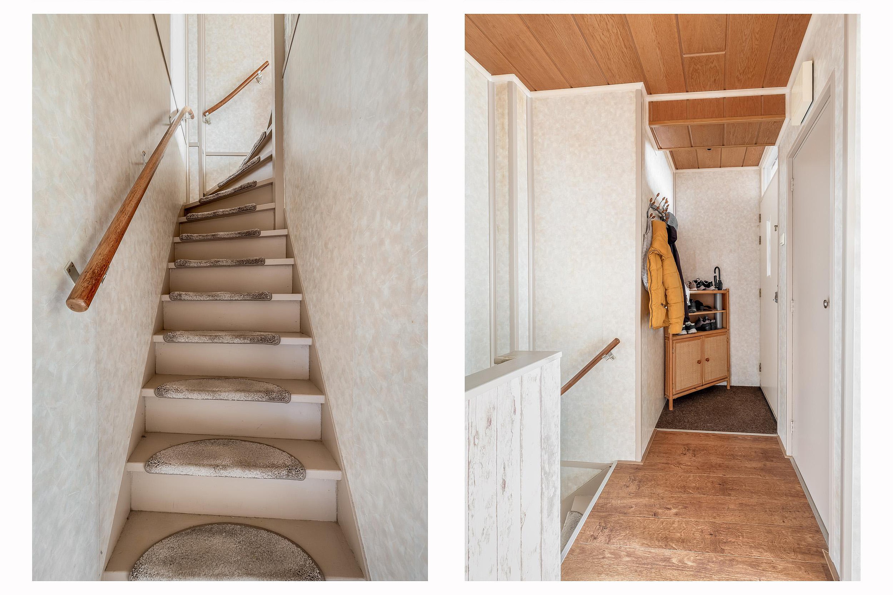Bij binnenkomst in de woning betreedt u de entree die overgaat in een centrale hal. Deze ruimte is zeer praktisch ingedeeld met een trapkast en een vaste kast waarin de aansluiting voor de droger is verwerkt. Vanuit de hal heeft u toegang tot de inpandige berging, een ideale plek voor het stallen van uw fietsen. De handige werkbank en de losse kasten in deze berging blijven achter, zodat u direct over extra werk- en opslagruimte beschikt.