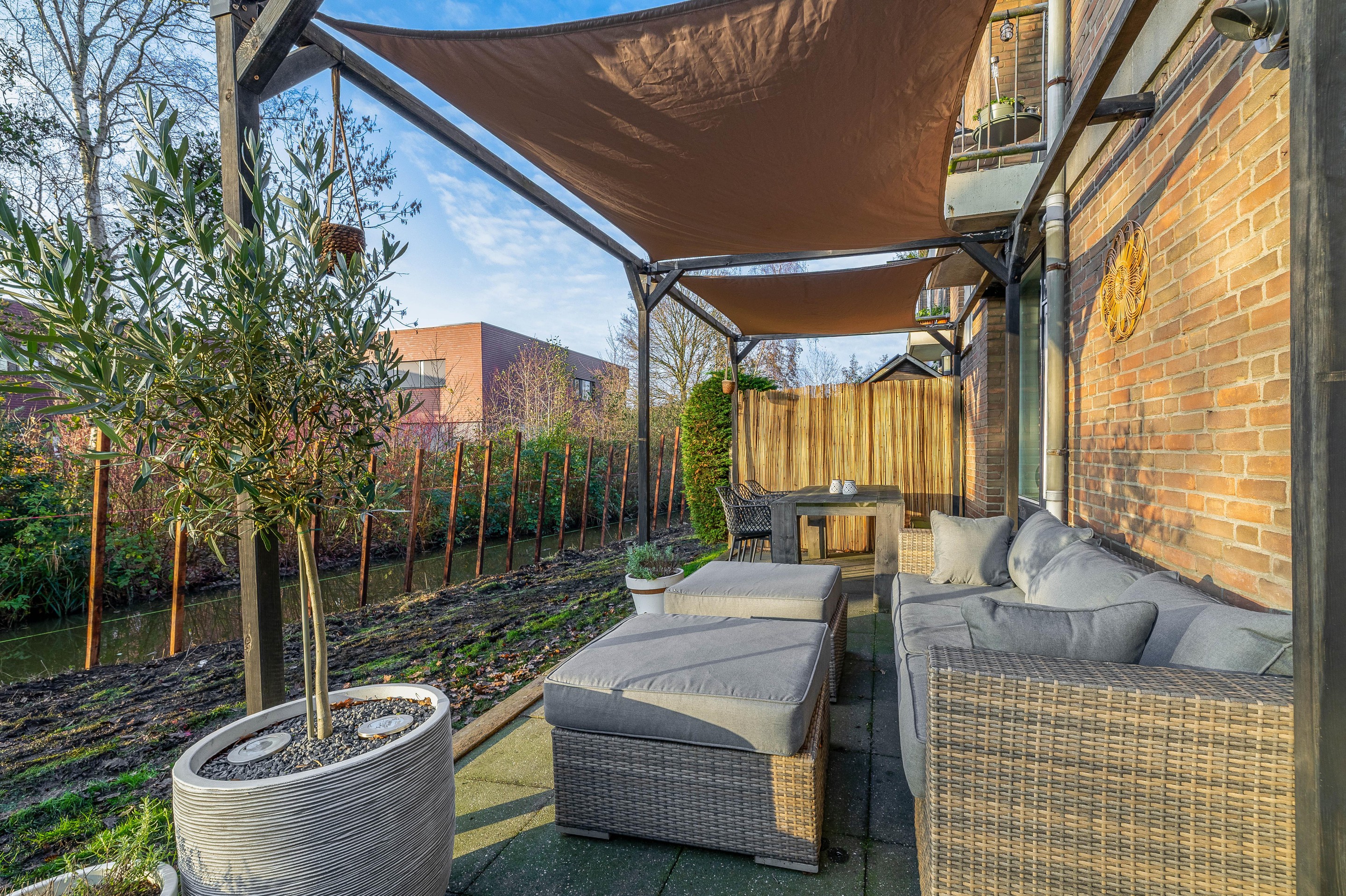 De achtertuin (westen) is een fijne plek voor middag- en avondzon en voorzien van een stijlvolle zwarte pergola met schaduwdoeken. De tuin grenst aan een gezamenlijke binnentuin, waardoor je vrij en groen uitkijkt.