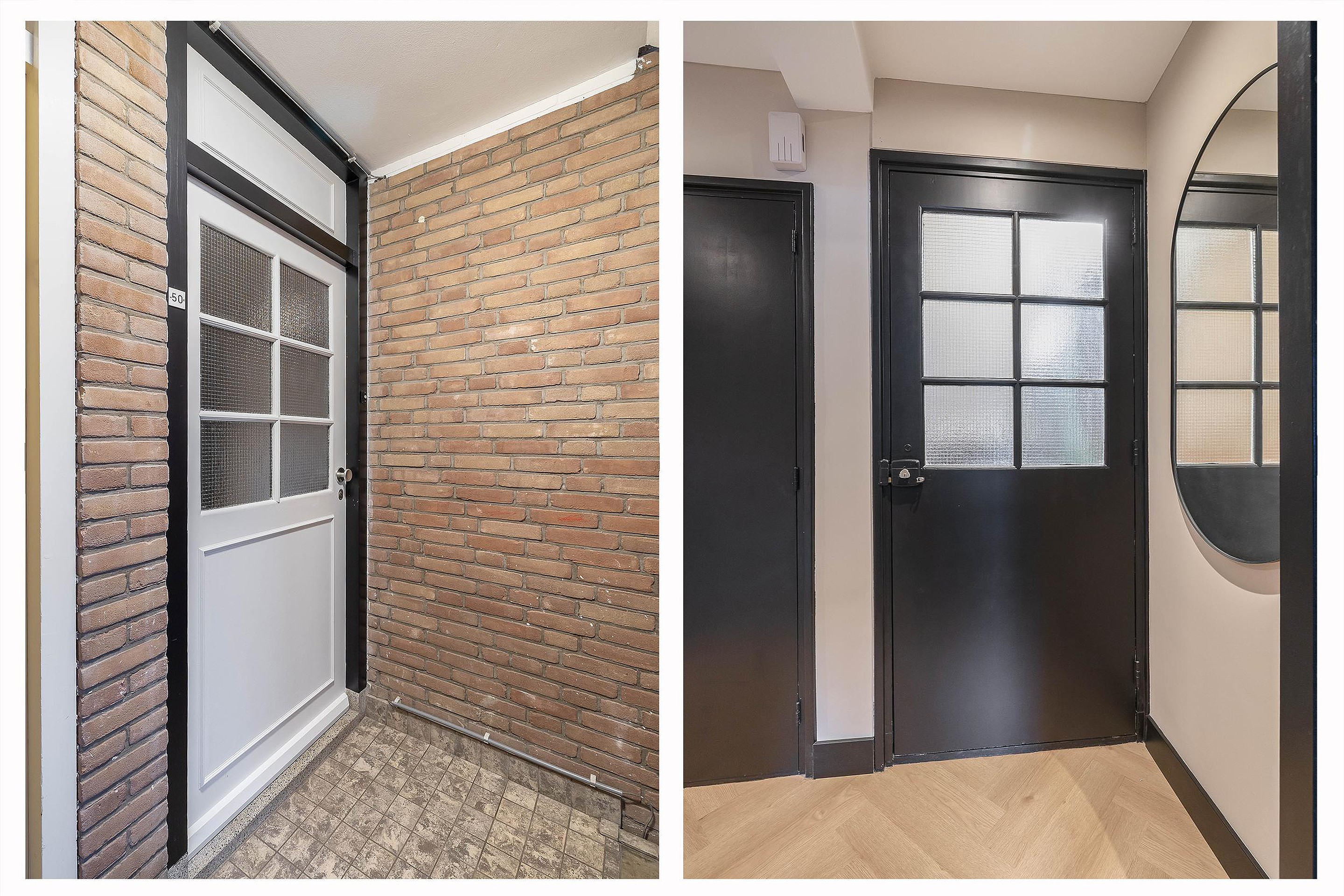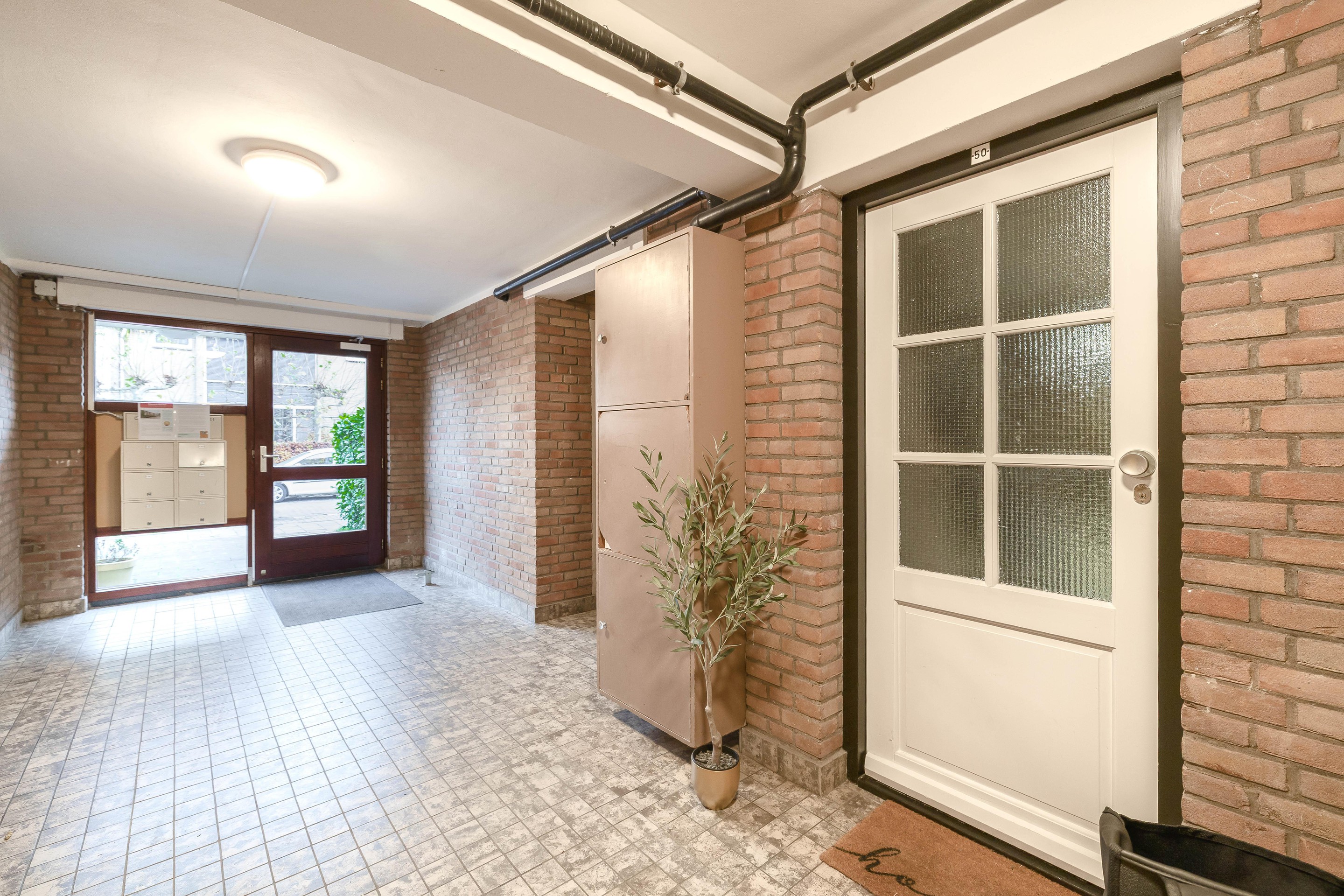 Afgesloten entree met intercom, brievenbussen en toegang tot het trappenhuis. Vanuit hier bereik je het appartement op zowel de begane grond als de eerste verdieping.