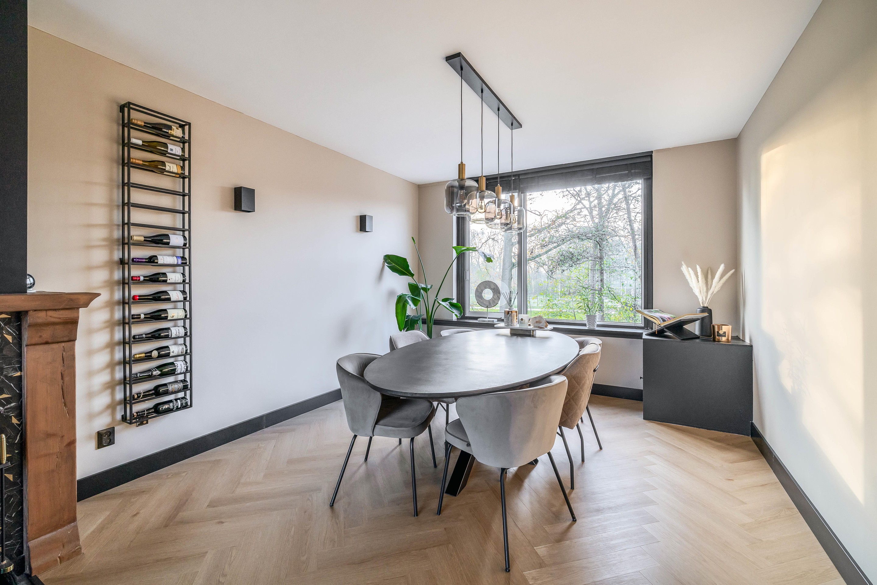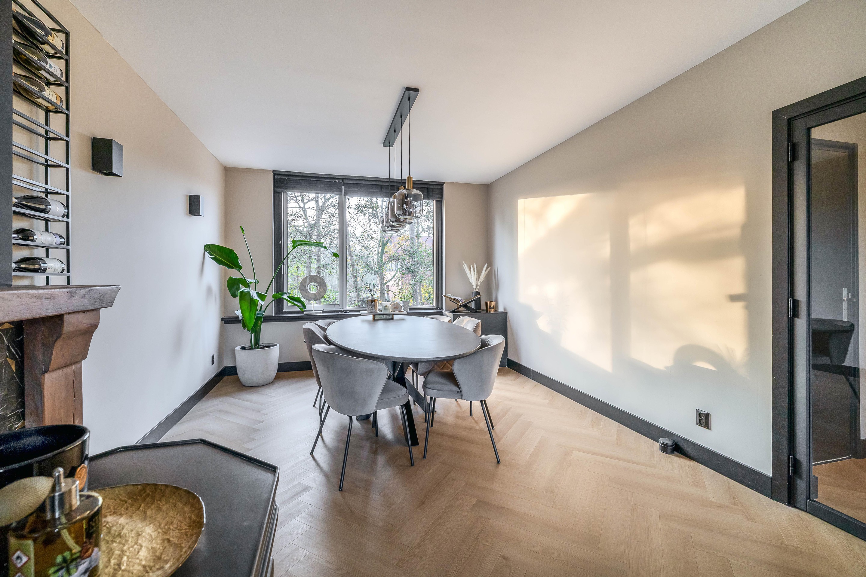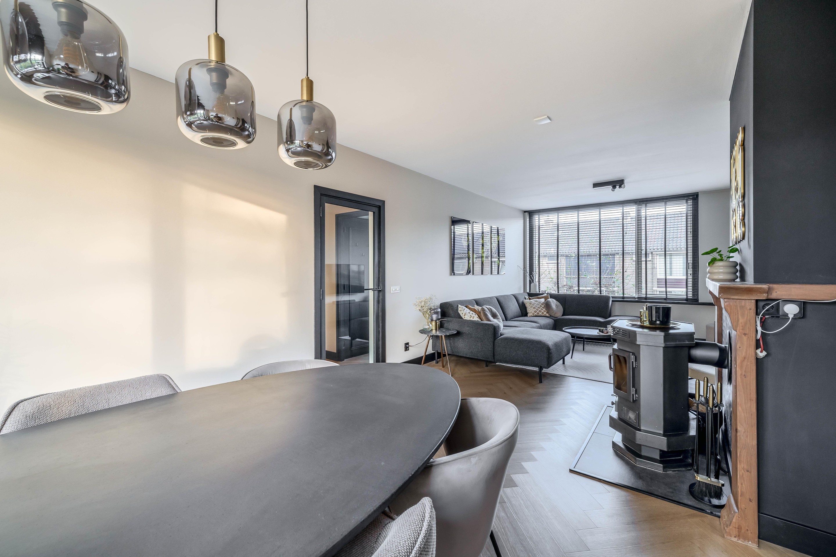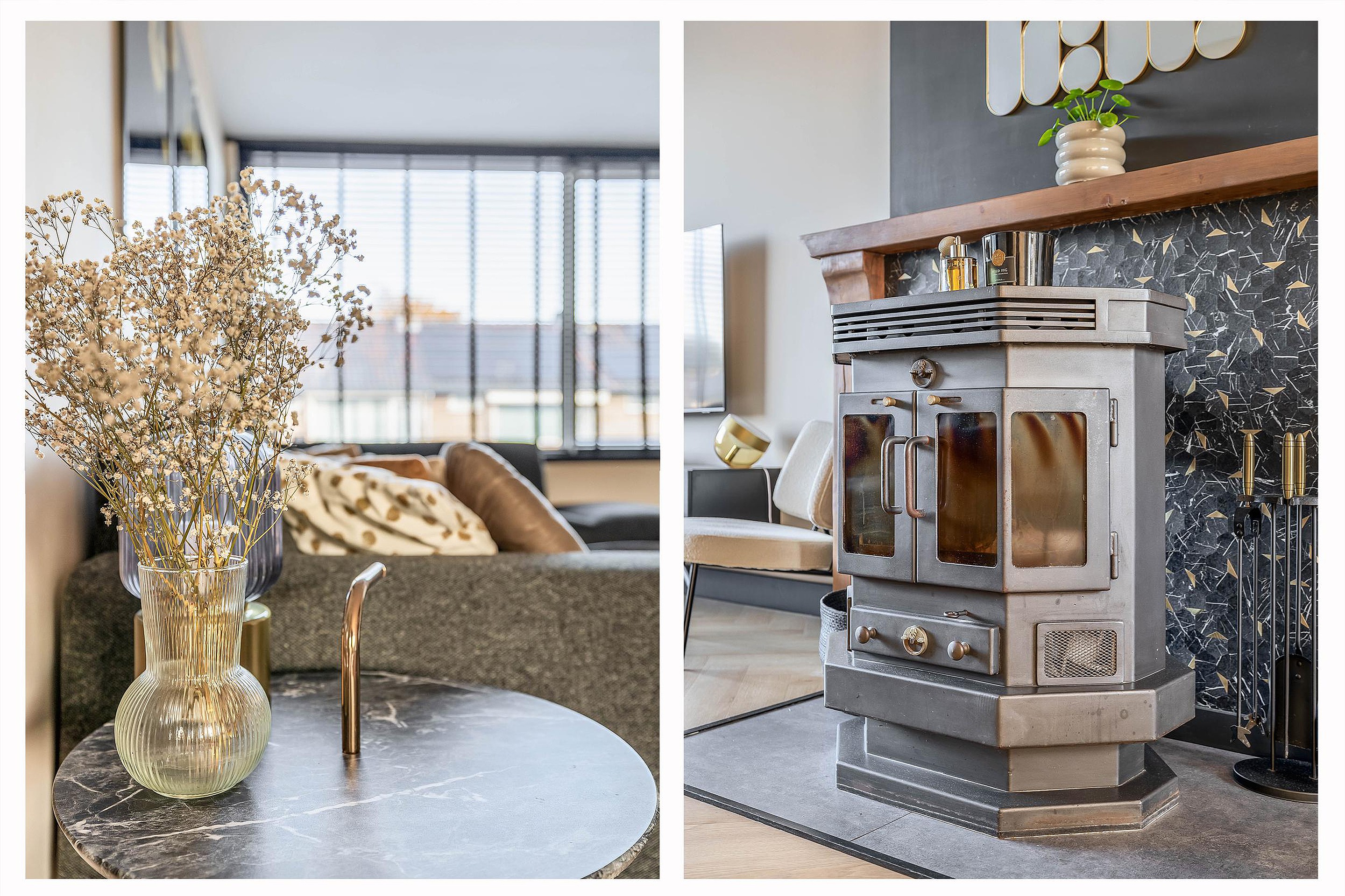 De woonkamer van circa 9 meter diep is licht en sfeervol, voorzien van een glazen deur met zwarte omlijsting en een gezellige houtkachel. De afwerking is hoogwaardig en de wand- en plafondverlichting blijft achter. Ook de zwevende tv-kast blijft aanwezig.