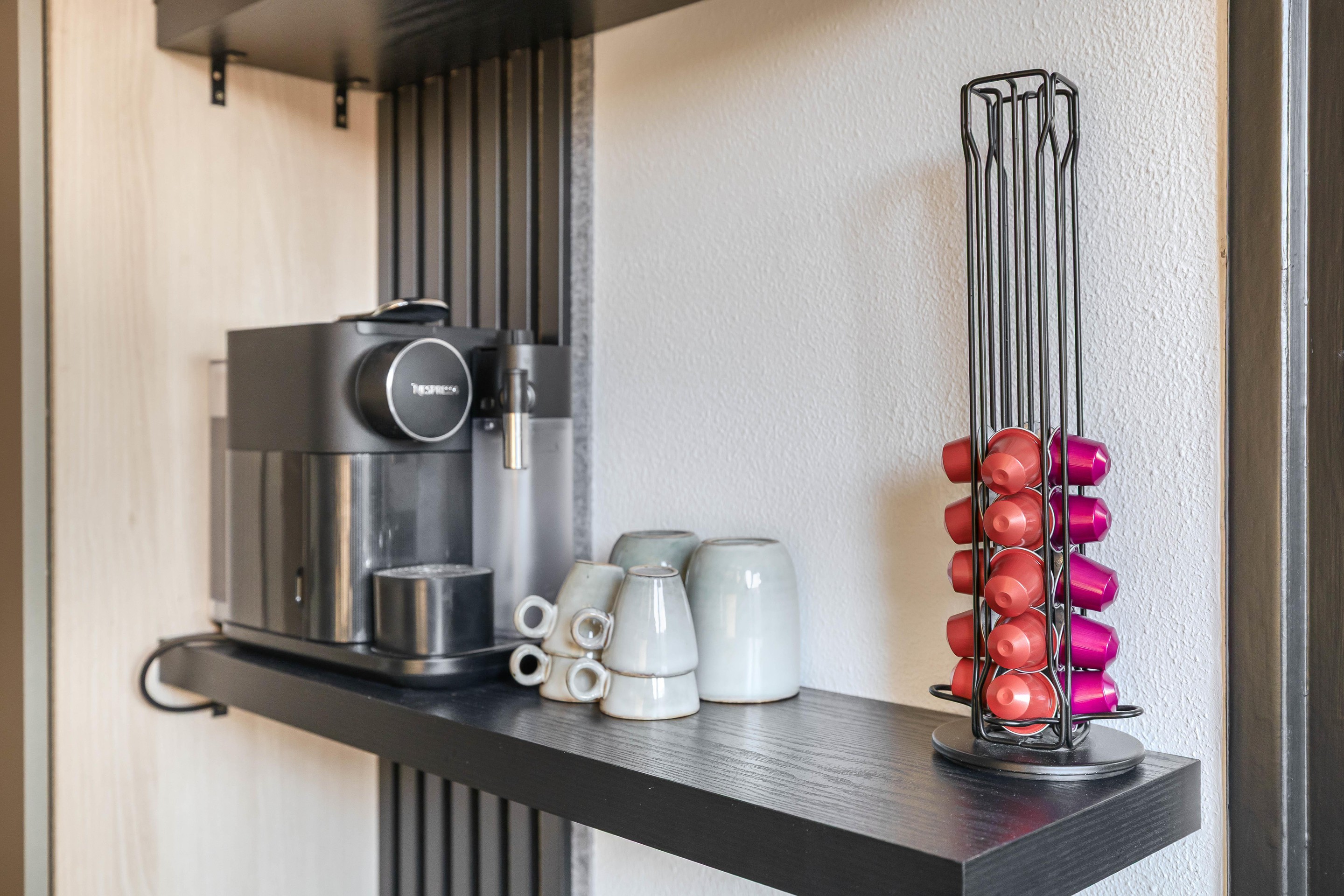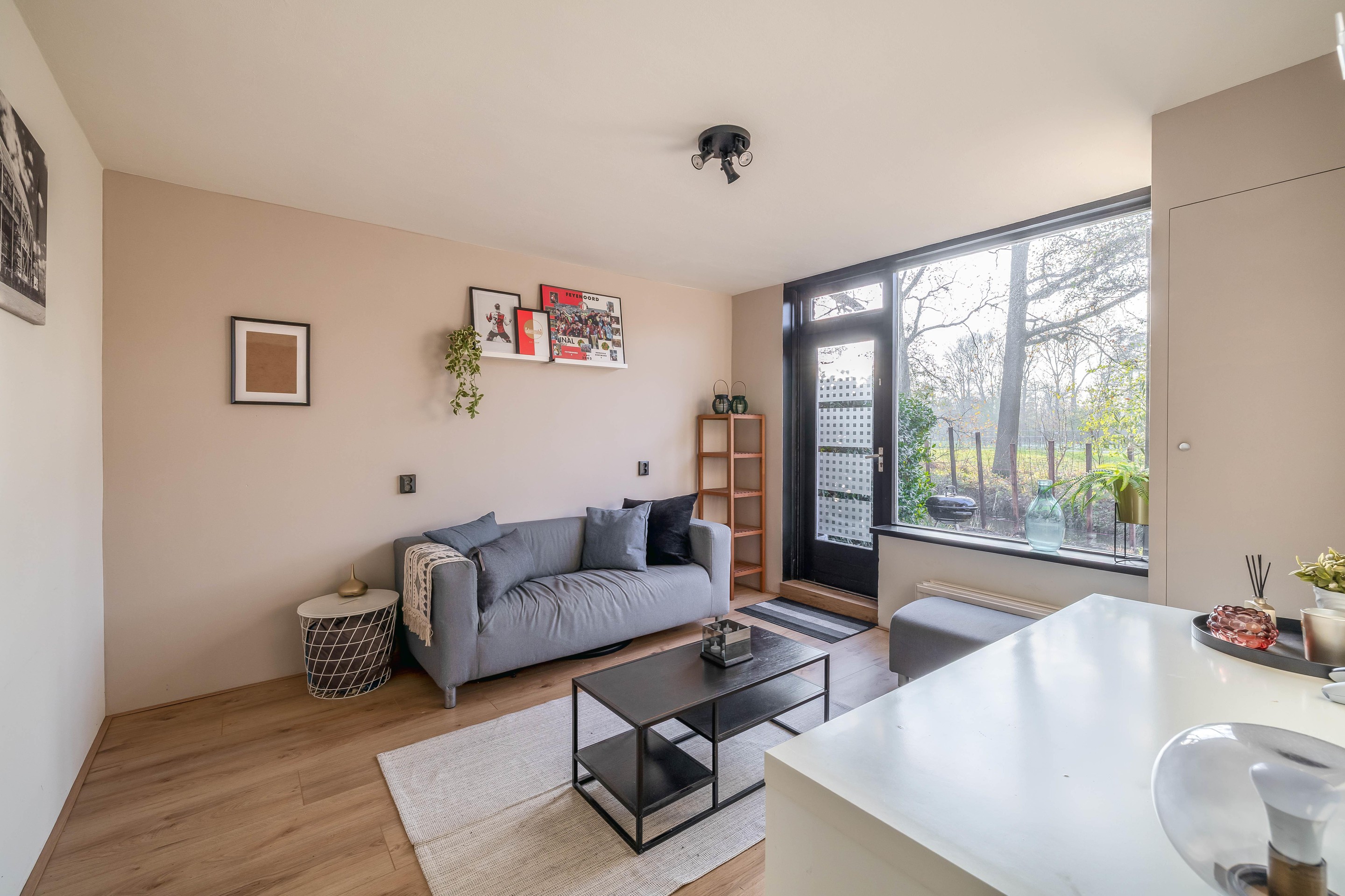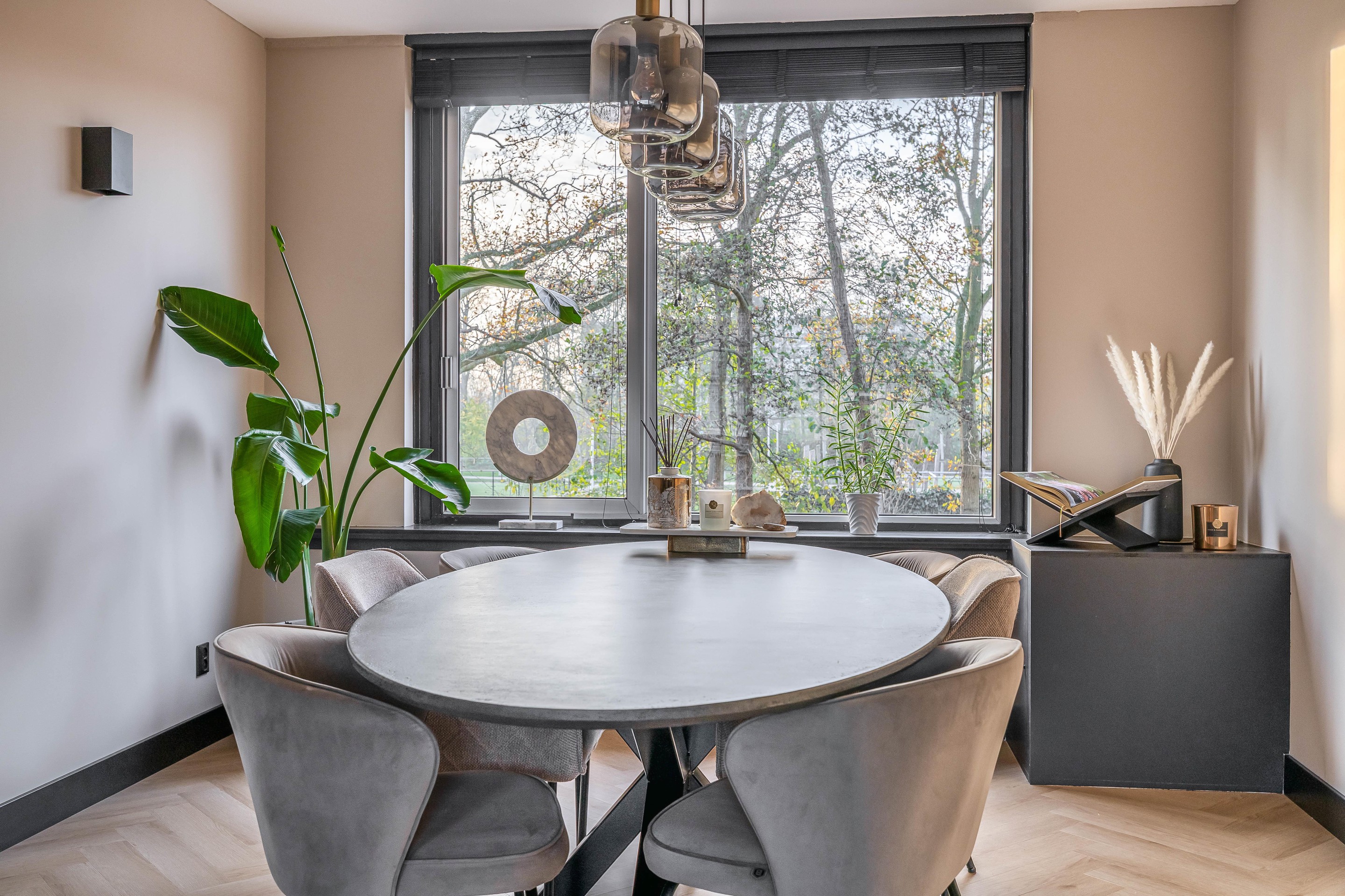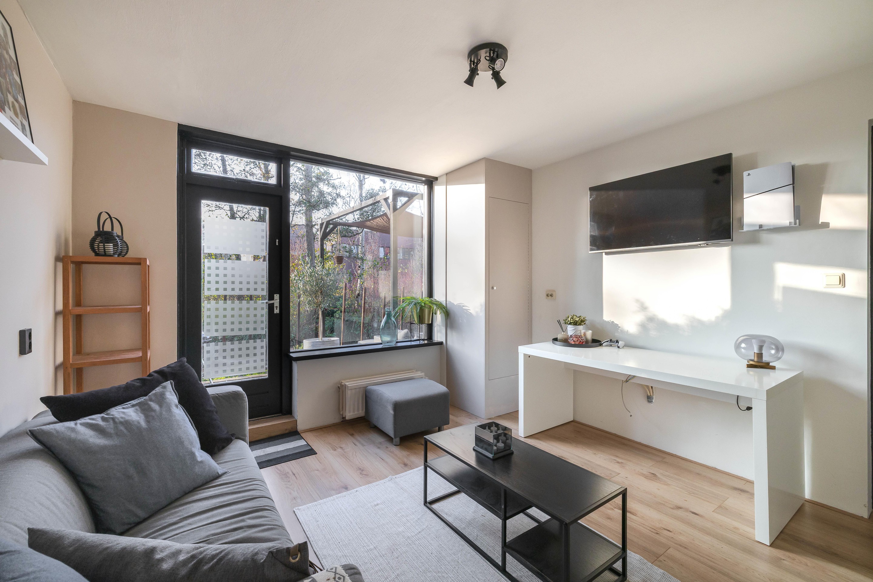 De woonkamer van circa 9 meter diep is licht en sfeervol, voorzien van een glazen deur met zwarte omlijsting en een gezellige houtkachel. De afwerking is hoogwaardig en de wand- en plafondverlichting blijft achter. Ook de zwevende tv-kast blijft aanwezig.
